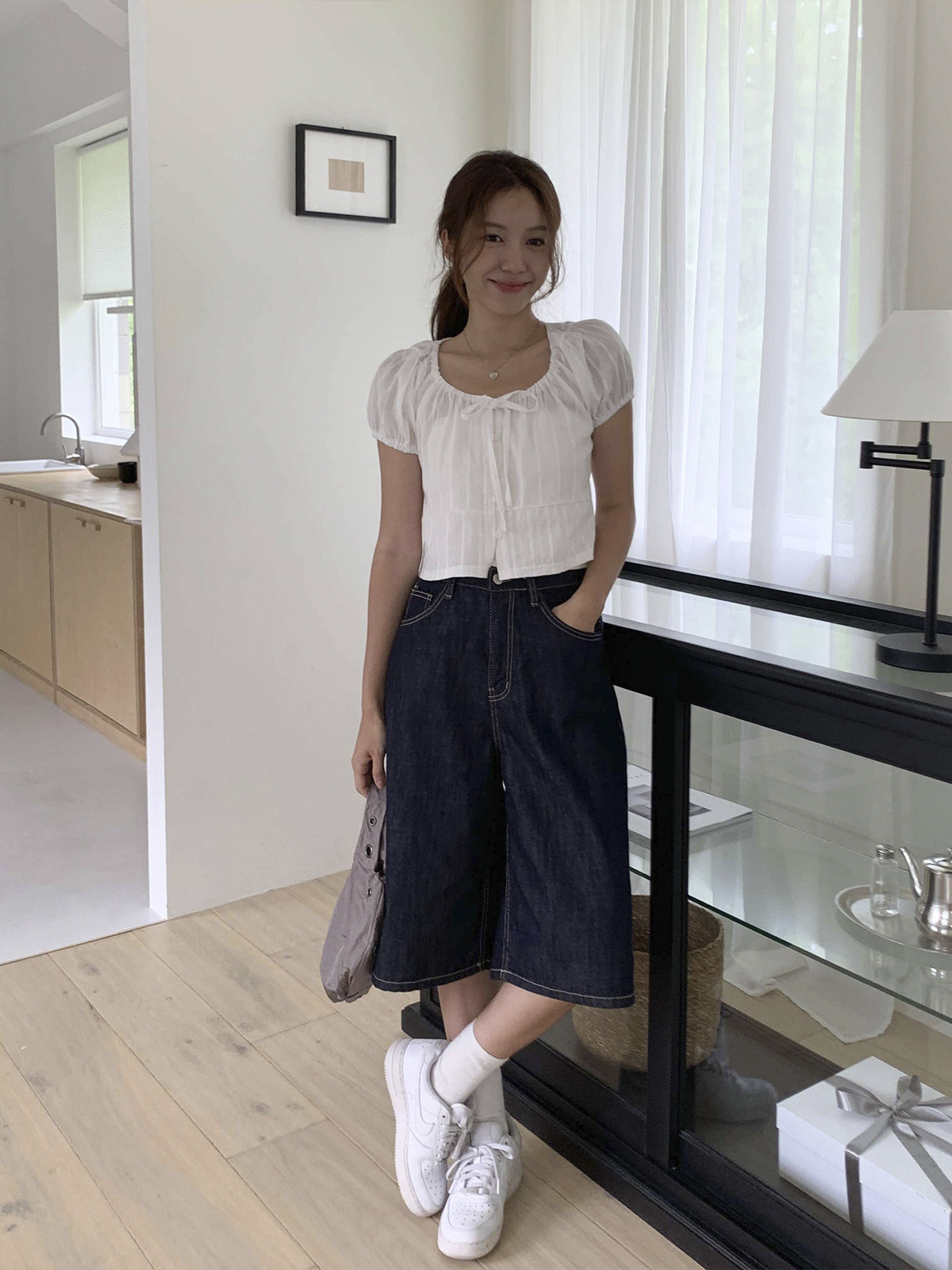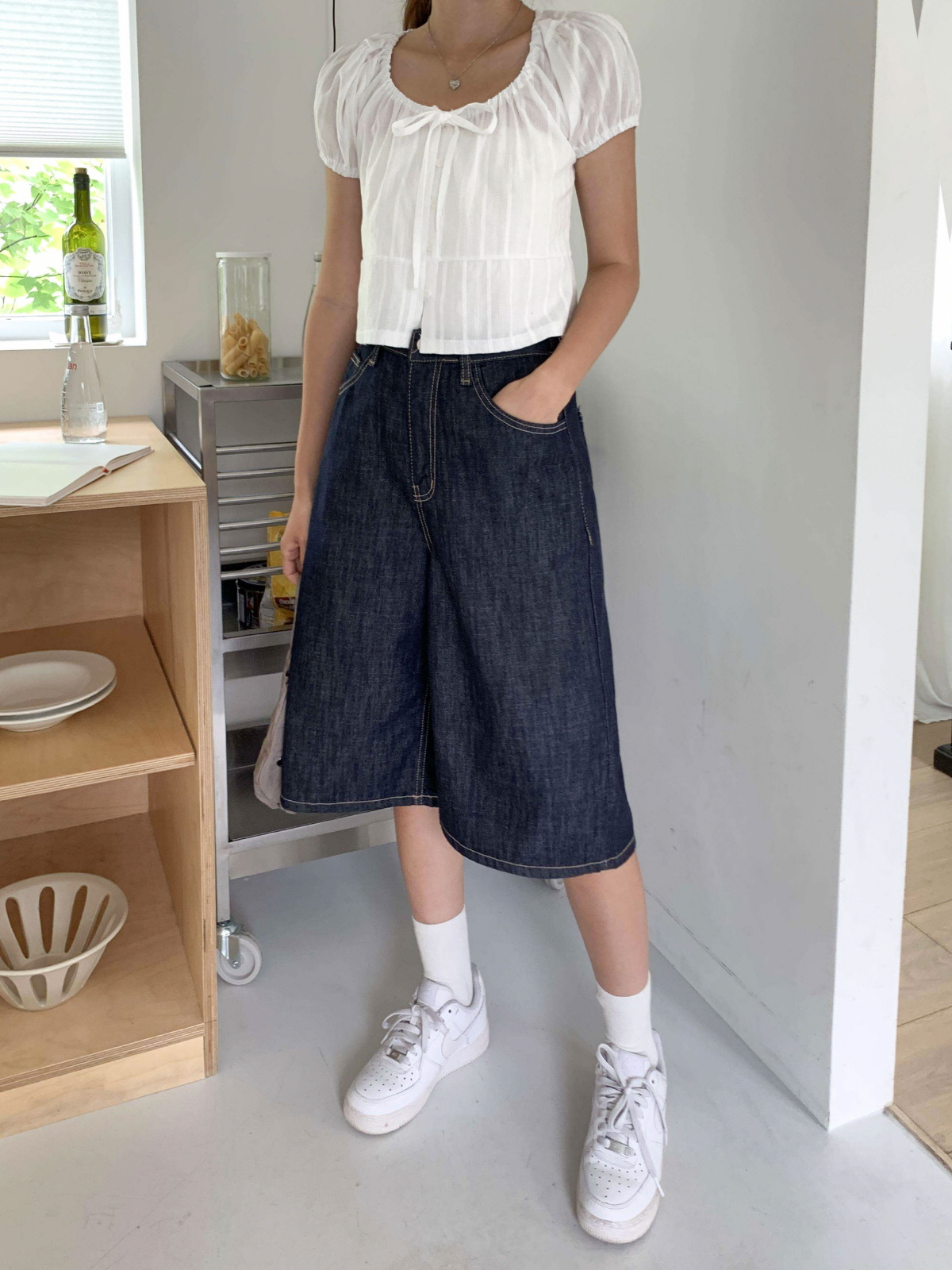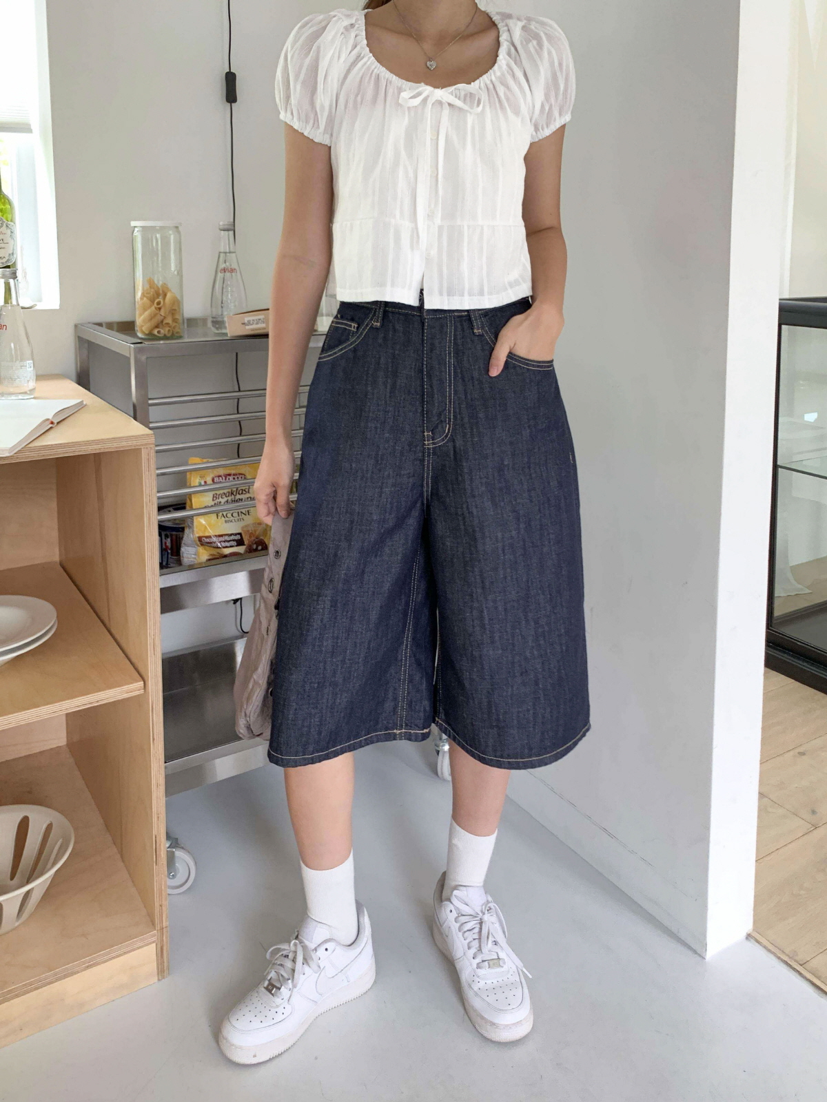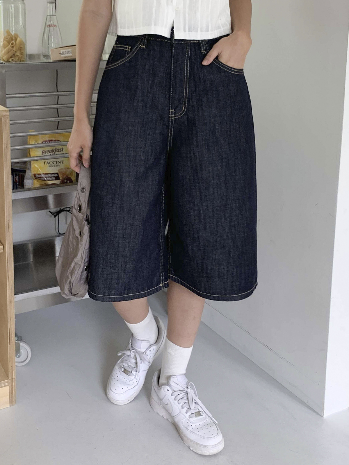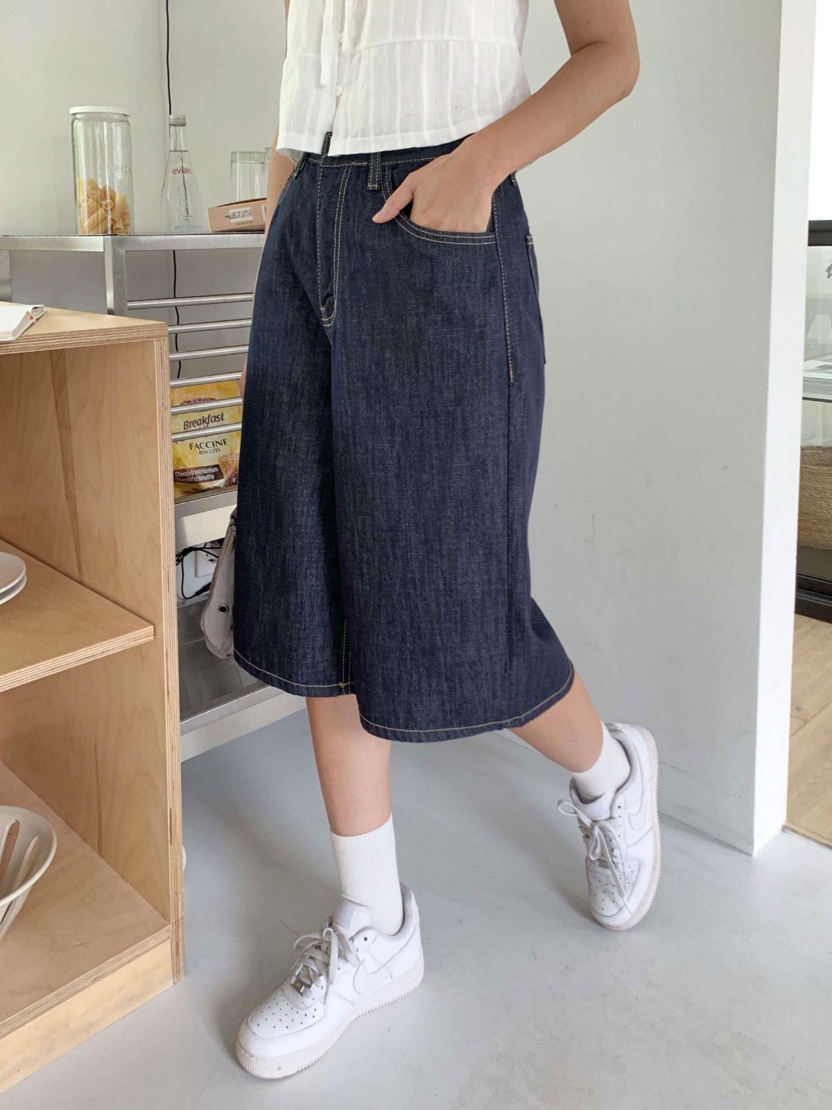 PT15291K57-유진리 스티치 포인트 뒷밴딩 데님 버뮤다 팬츠