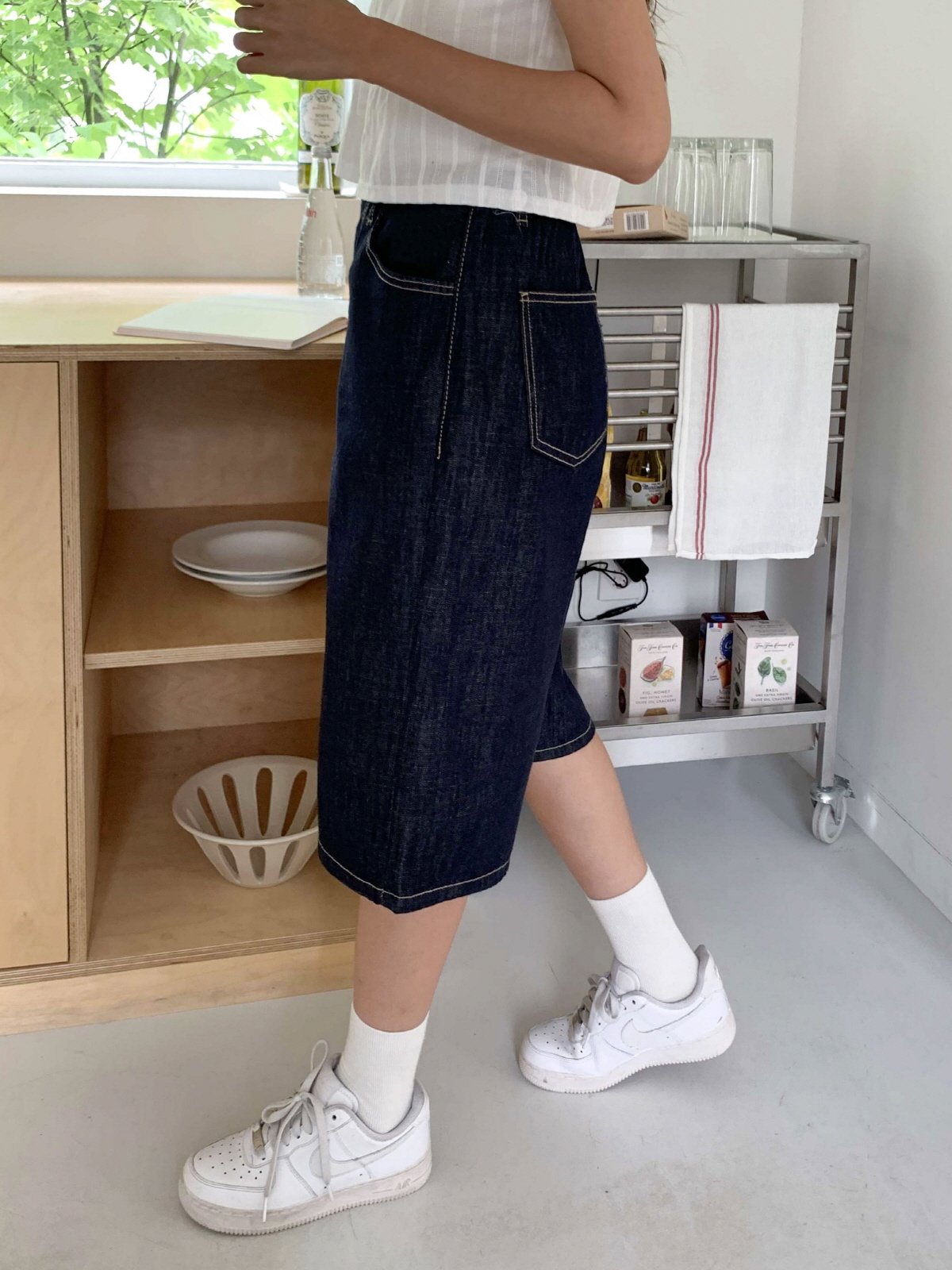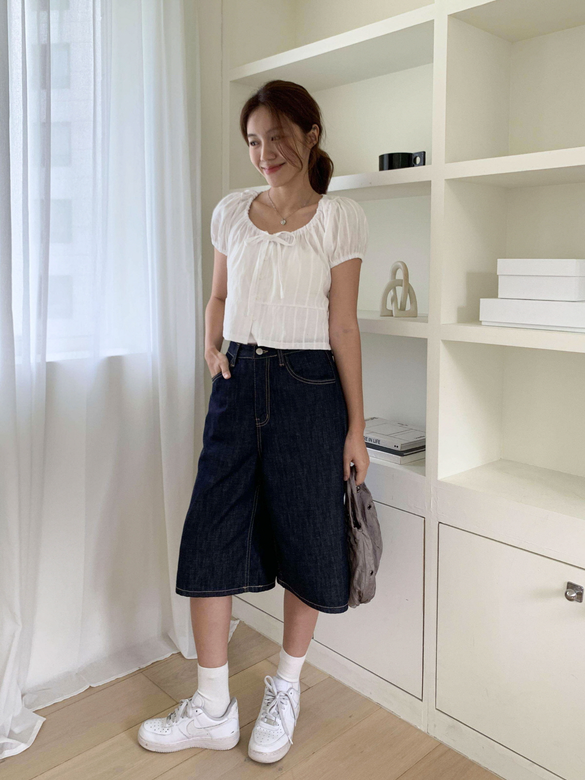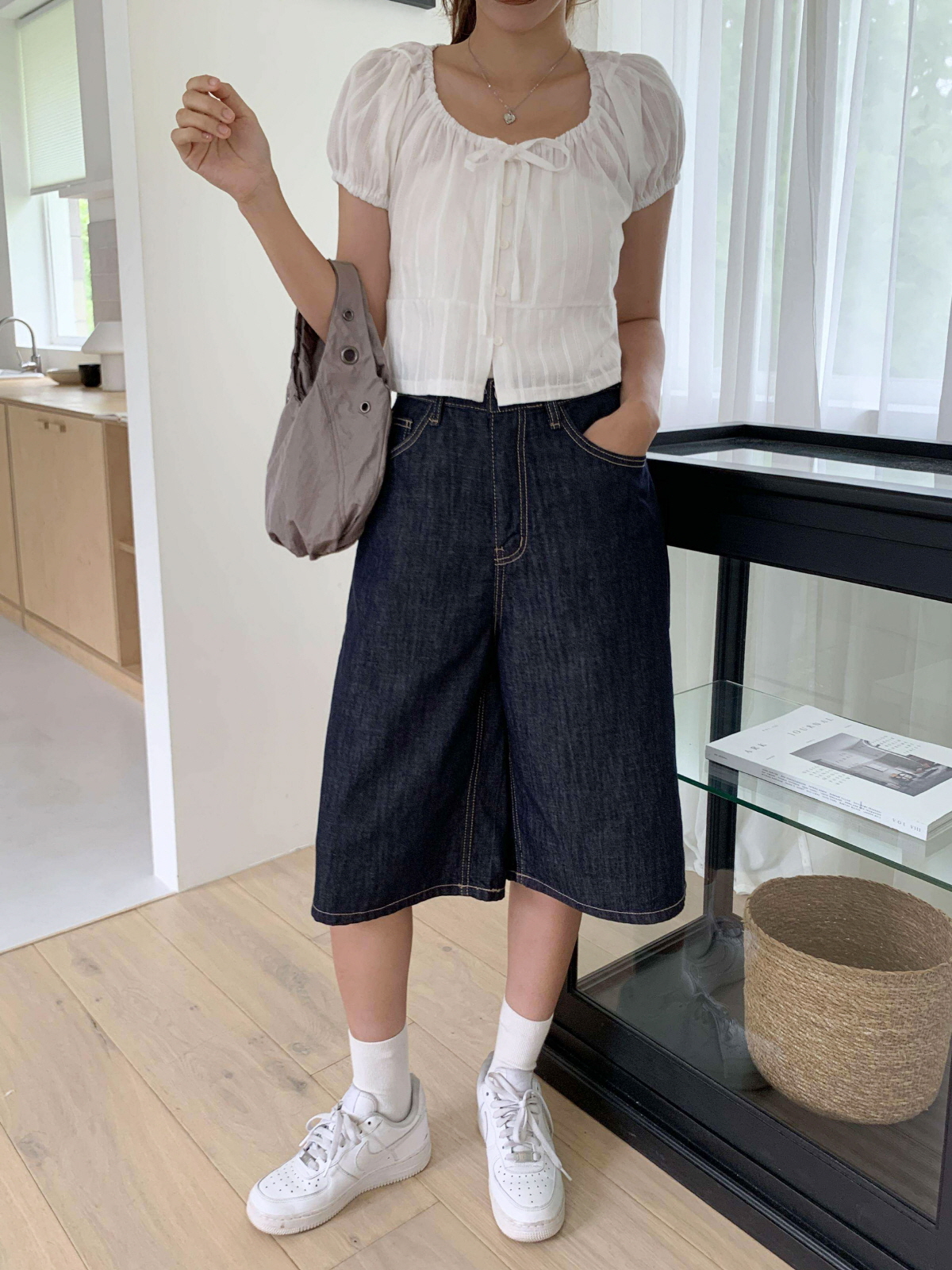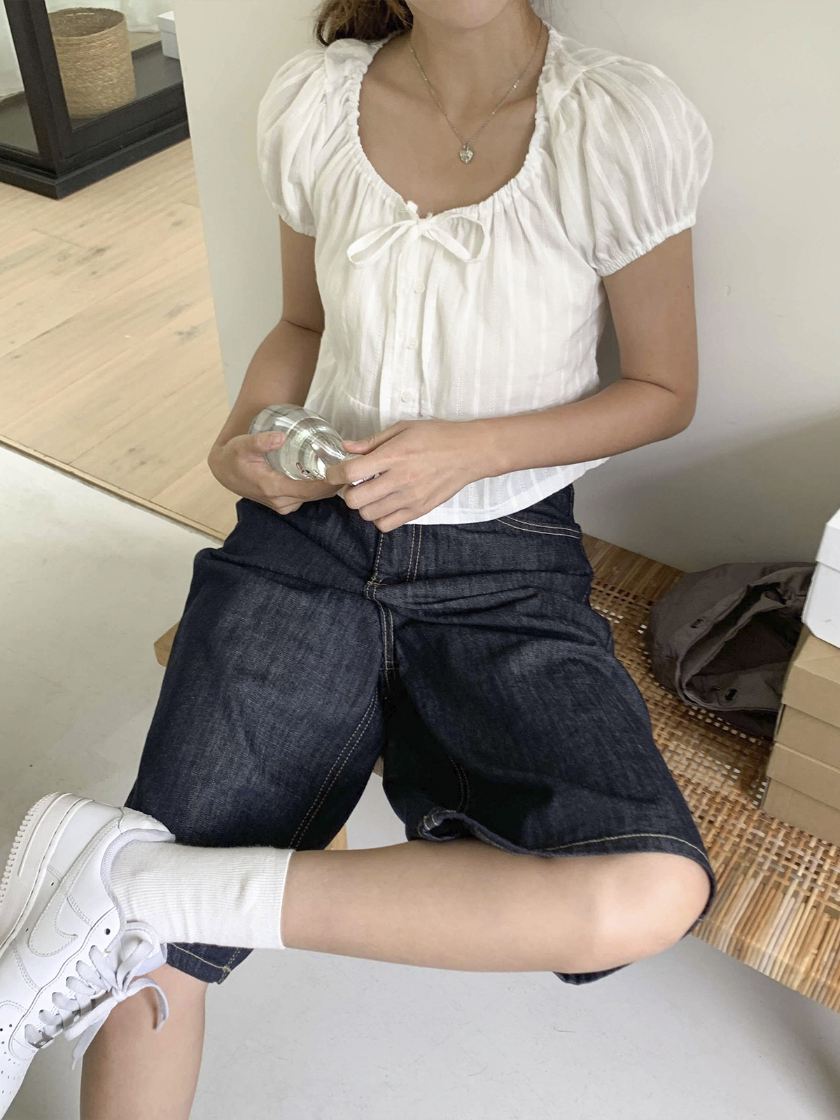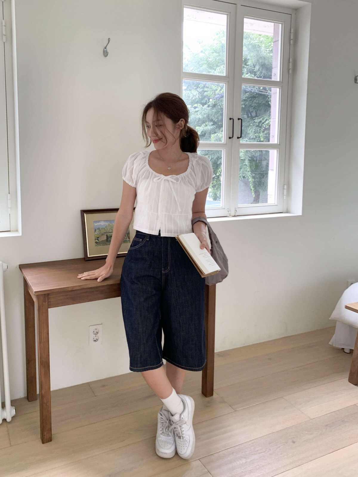 PT15291K57-유진리 스티치 포인트 뒷밴딩 데님 버뮤다 팬츠