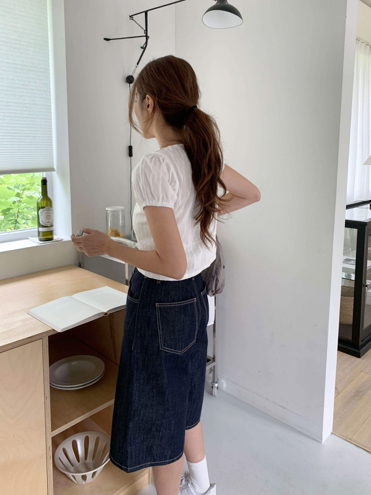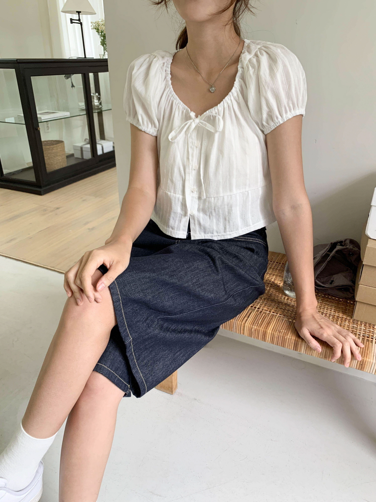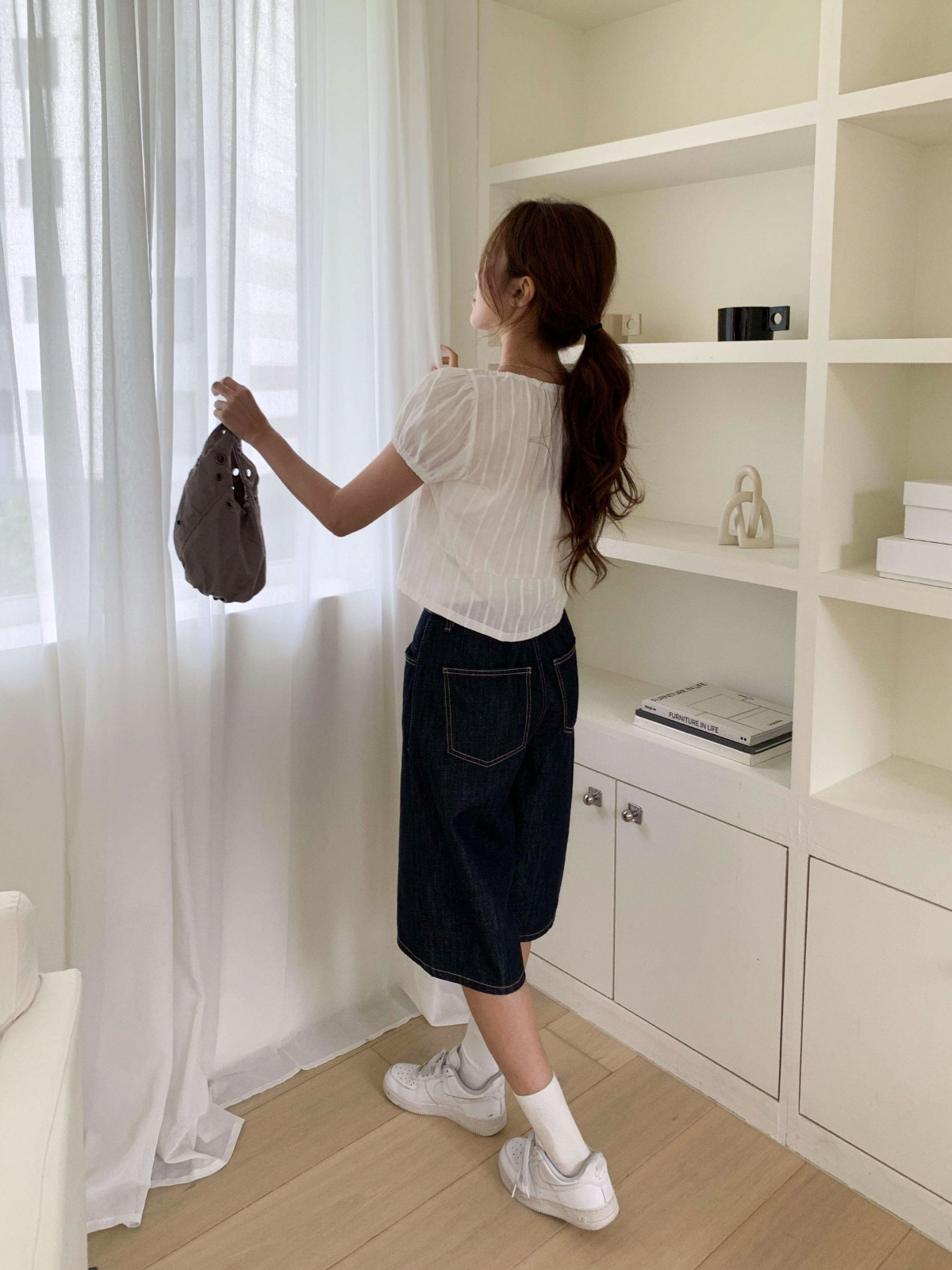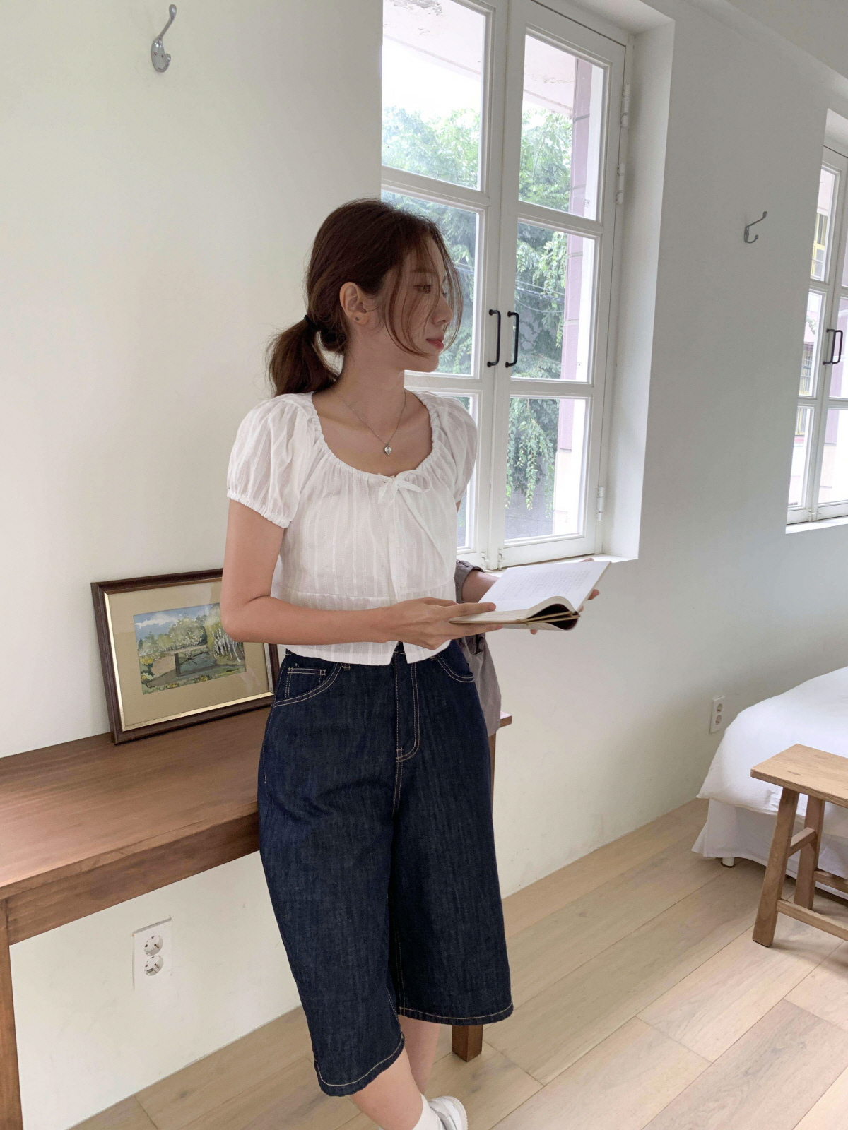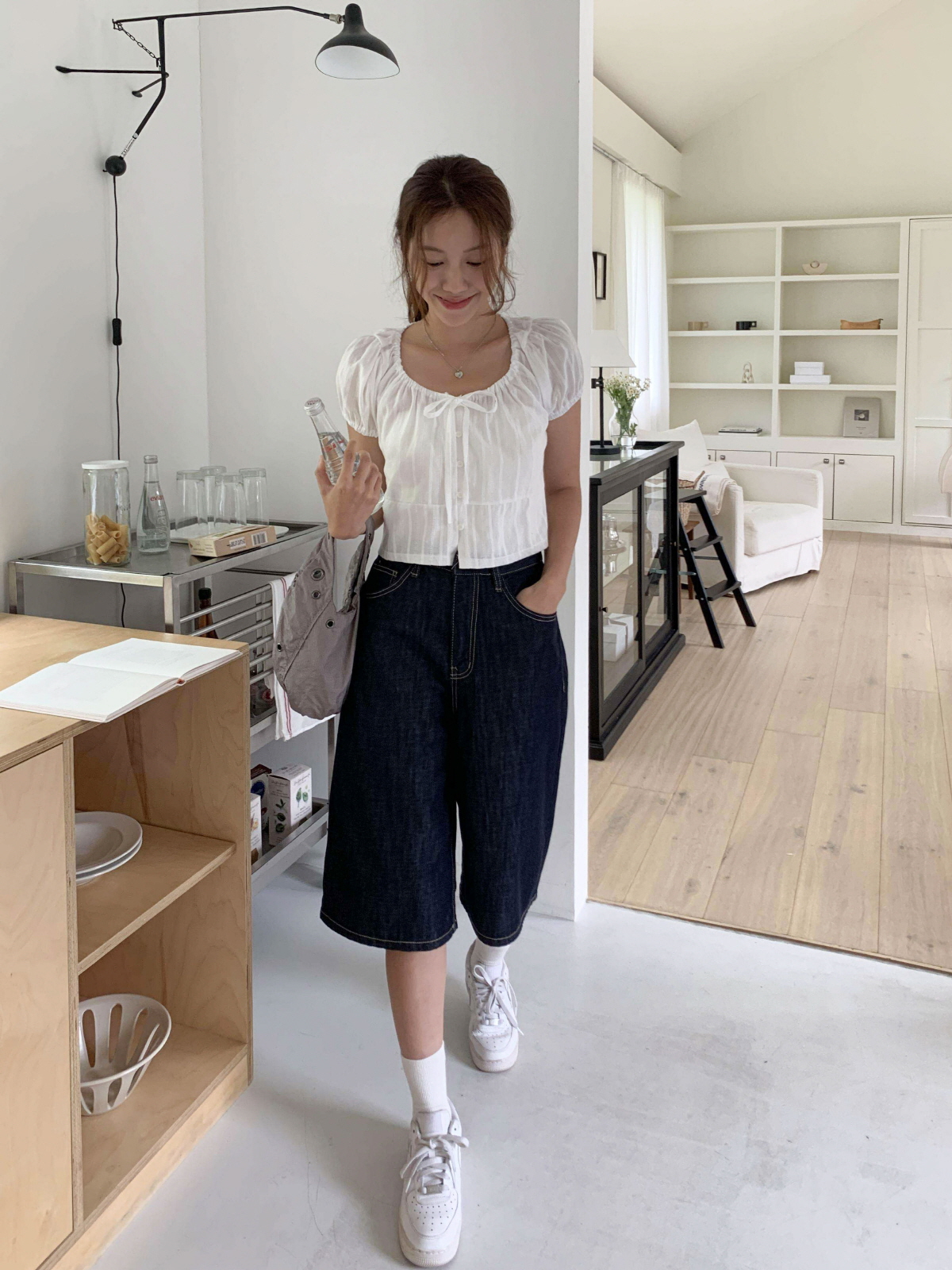 PT15291K57-유진리 스티치 포인트 뒷밴딩 데님 버뮤다 팬츠