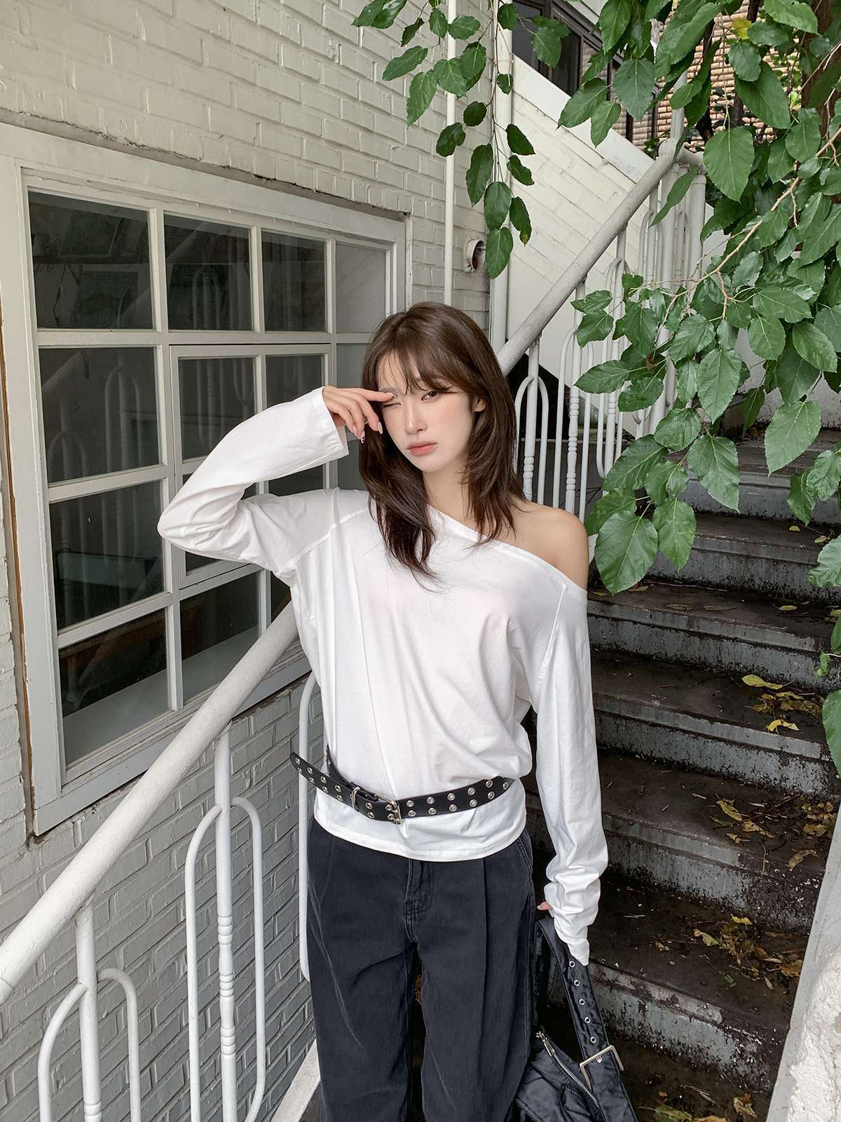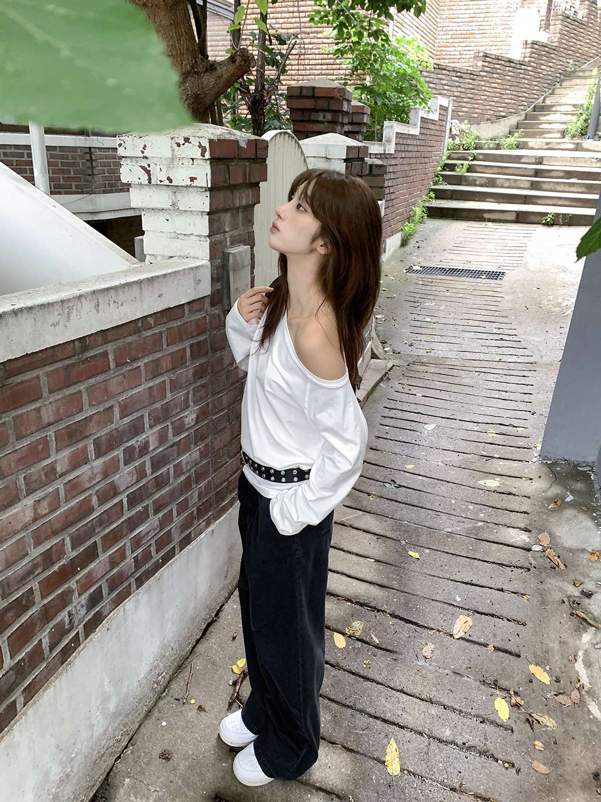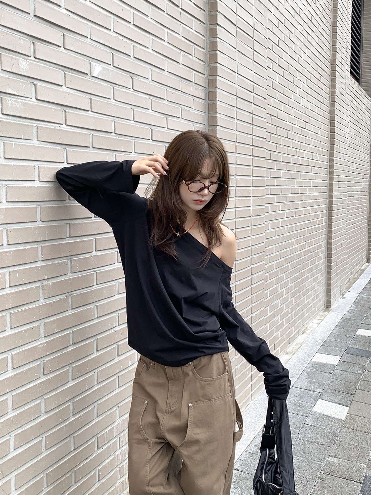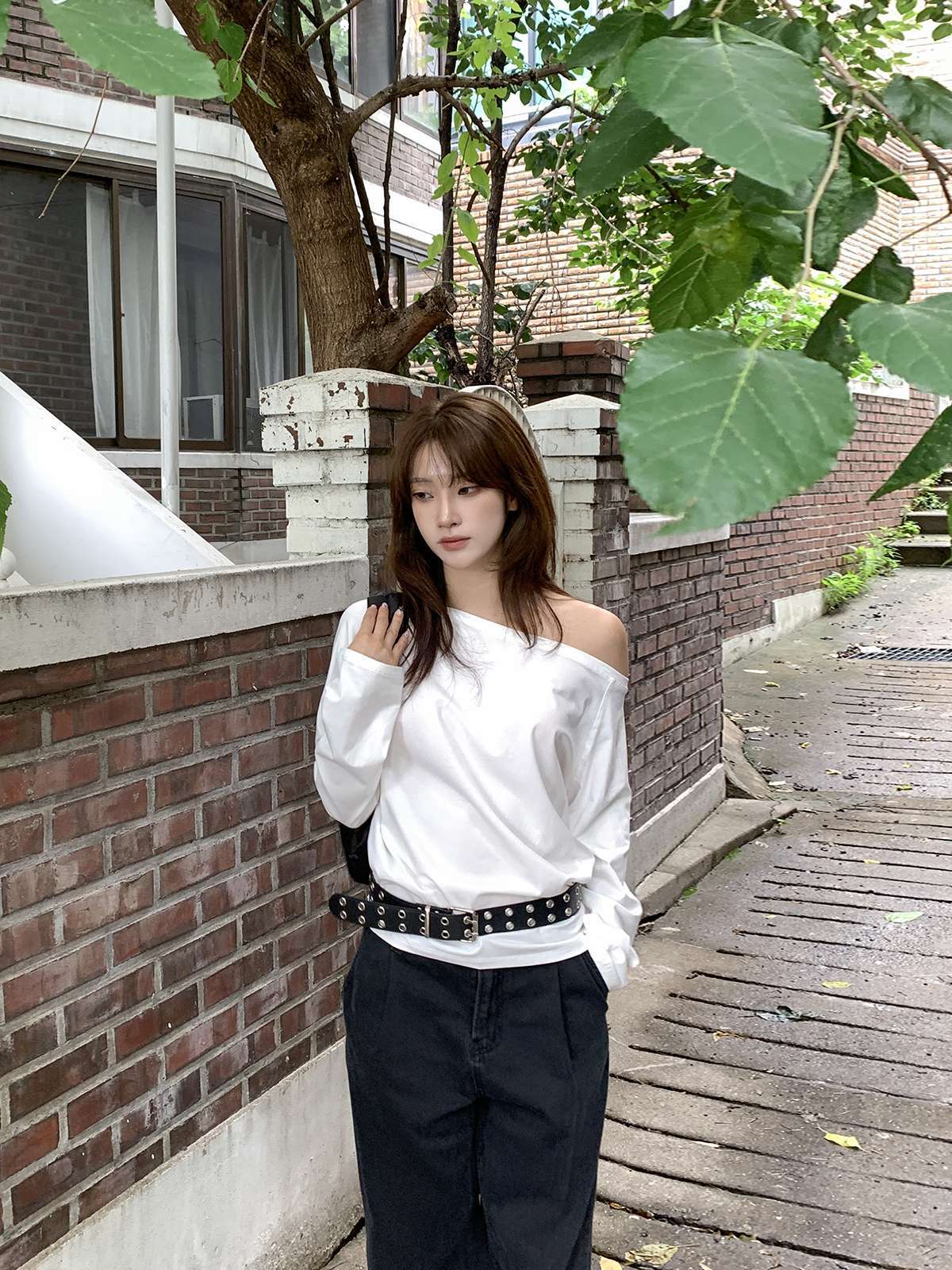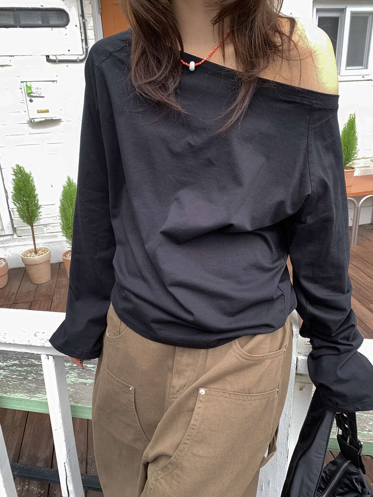 [ T16998C57-이지댄 원 오프숄더 루즈핏 무지 긴팔 티셔츠 ]