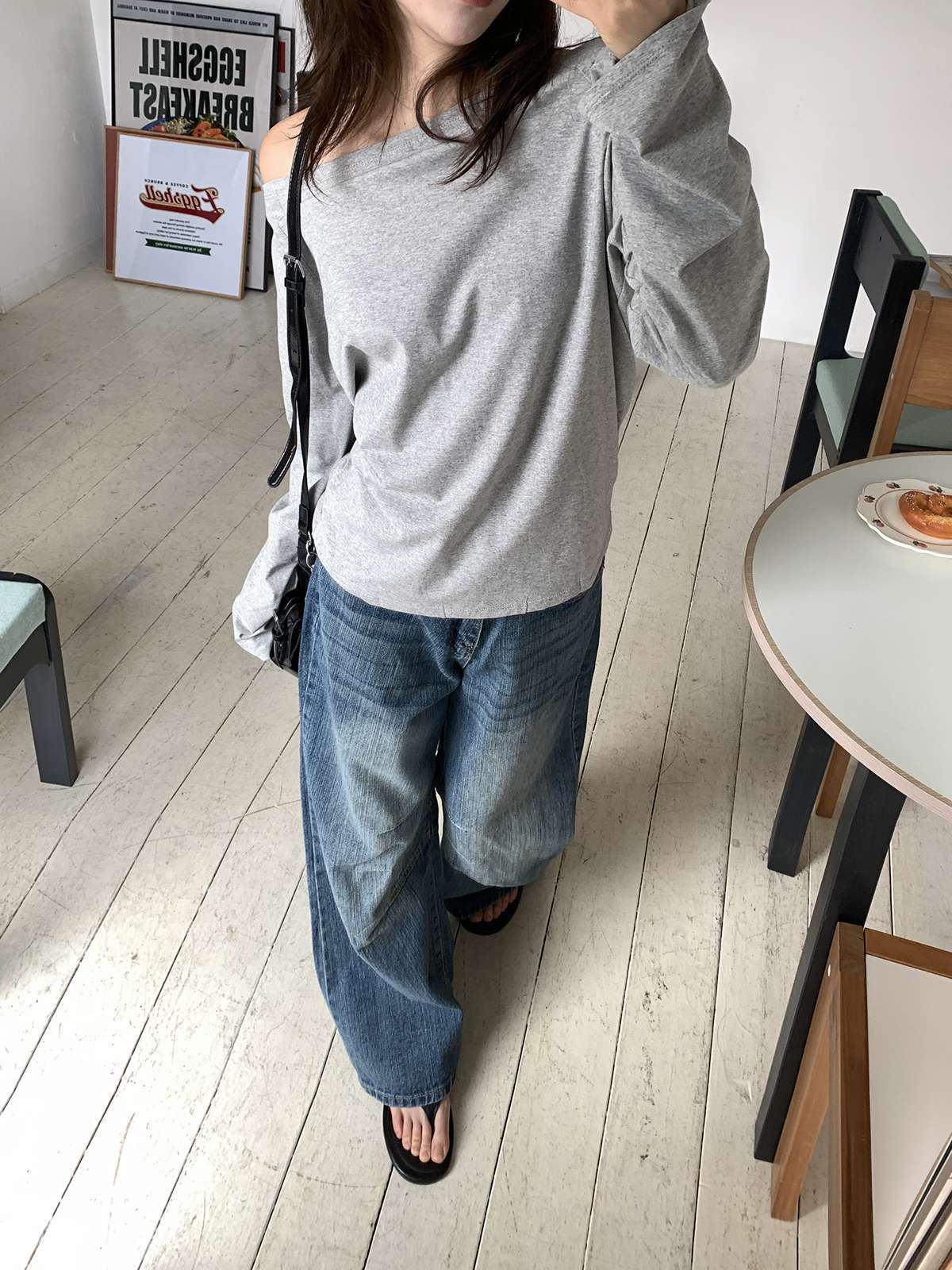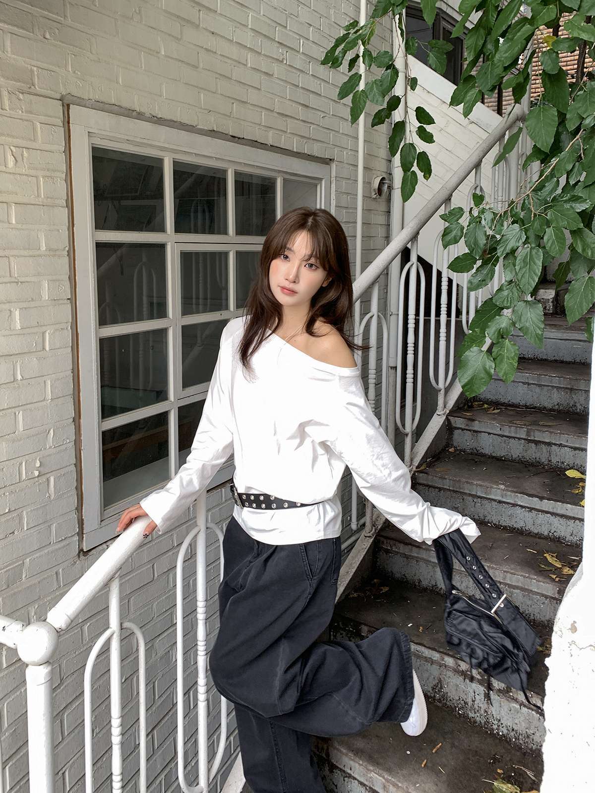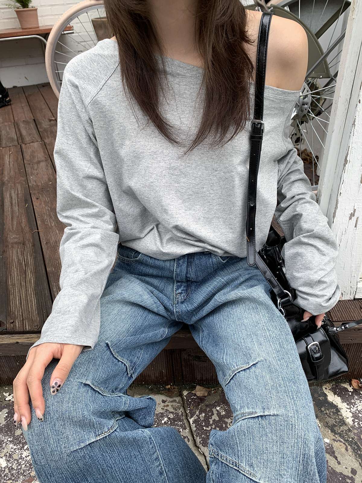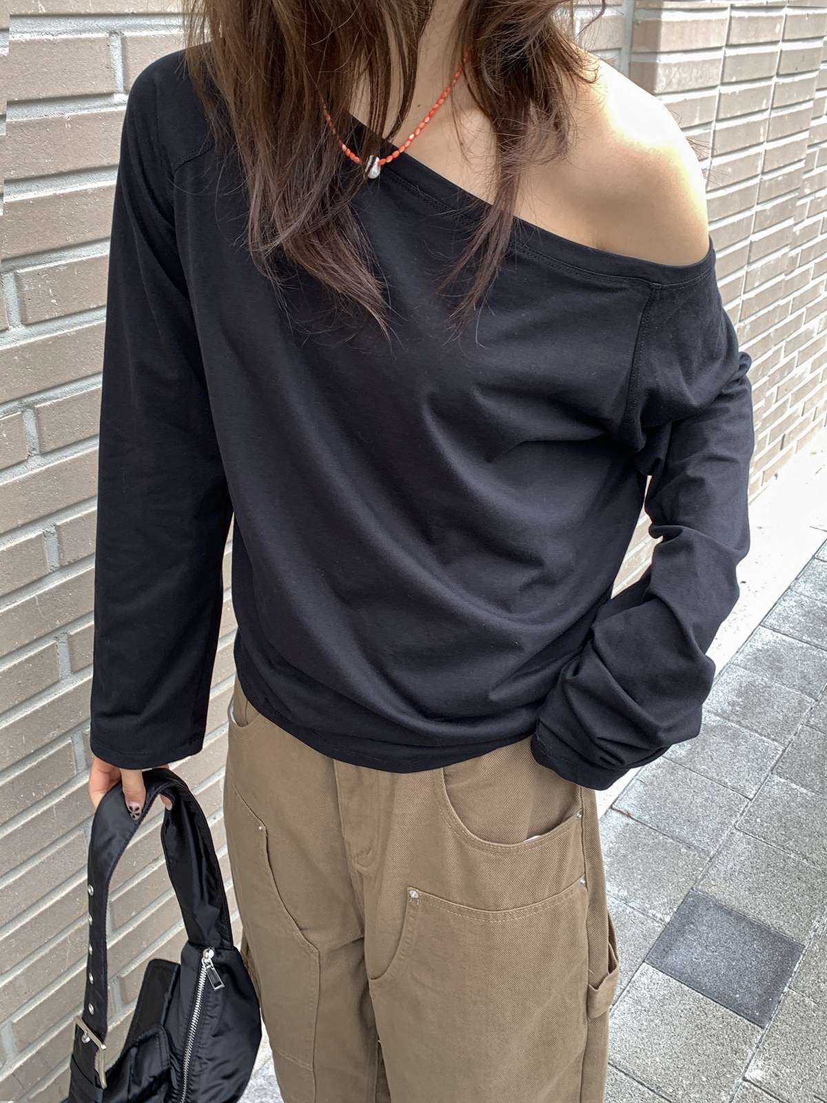 [ T16998C57-이지댄 원 오프숄더 루즈핏 무지 긴팔 티셔츠 ]