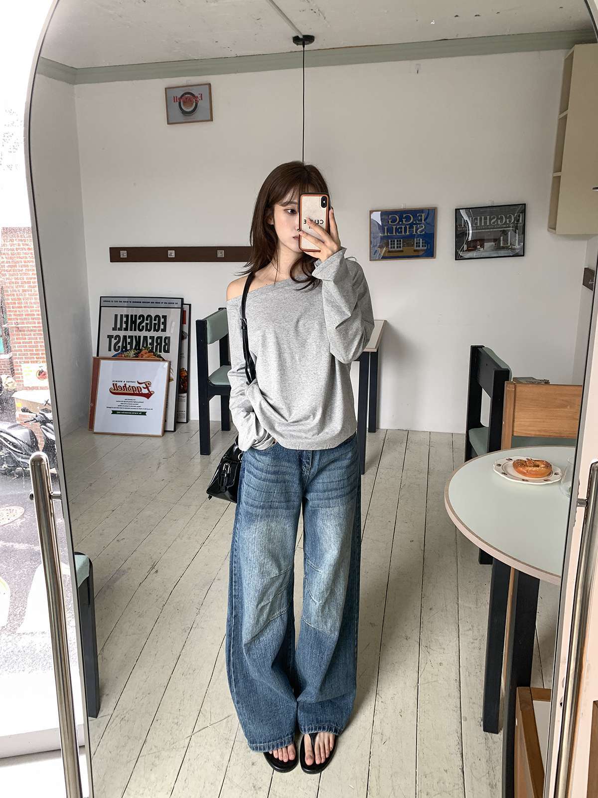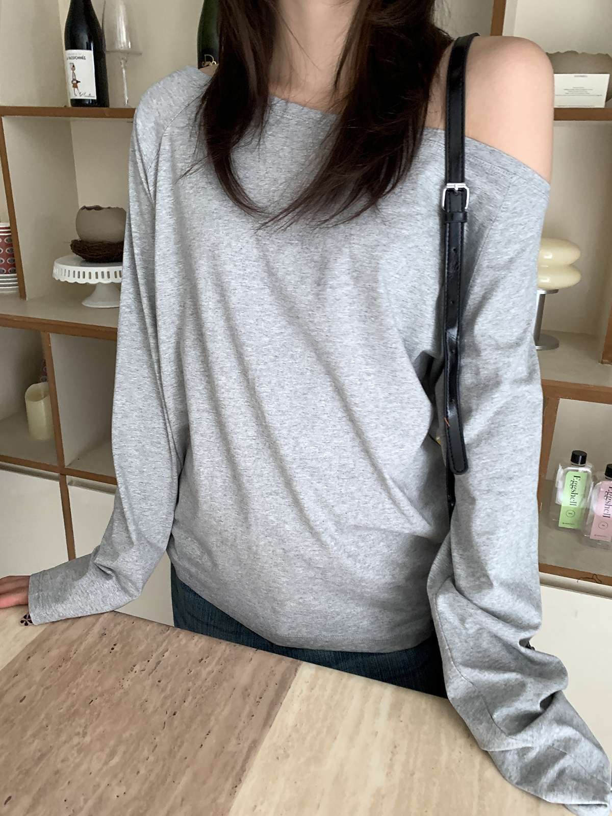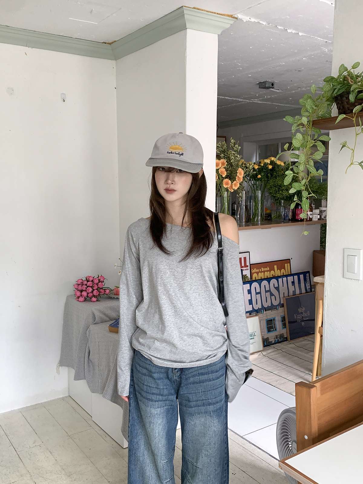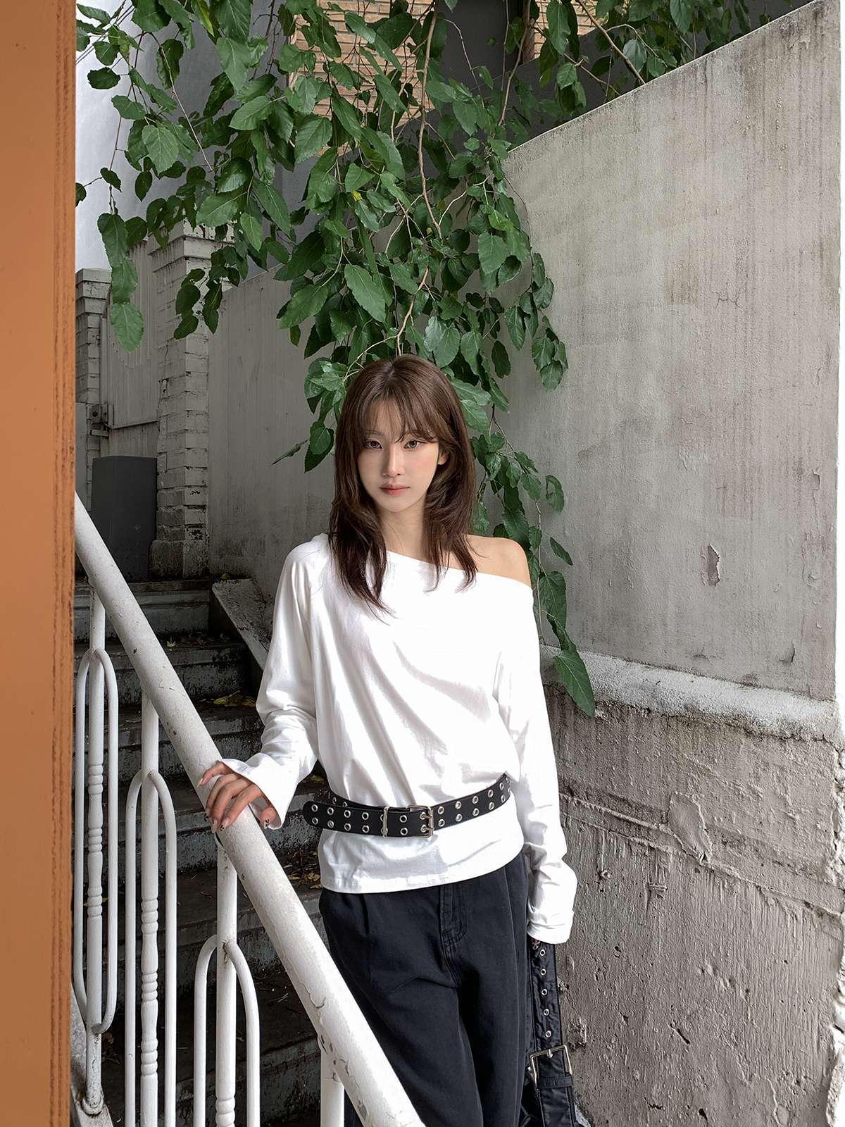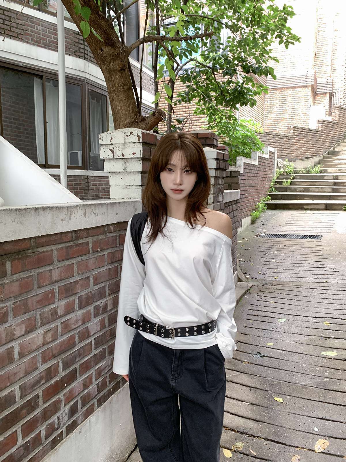 [ T16998C57-이지댄 원 오프숄더 루즈핏 무지 긴팔 티셔츠 ]