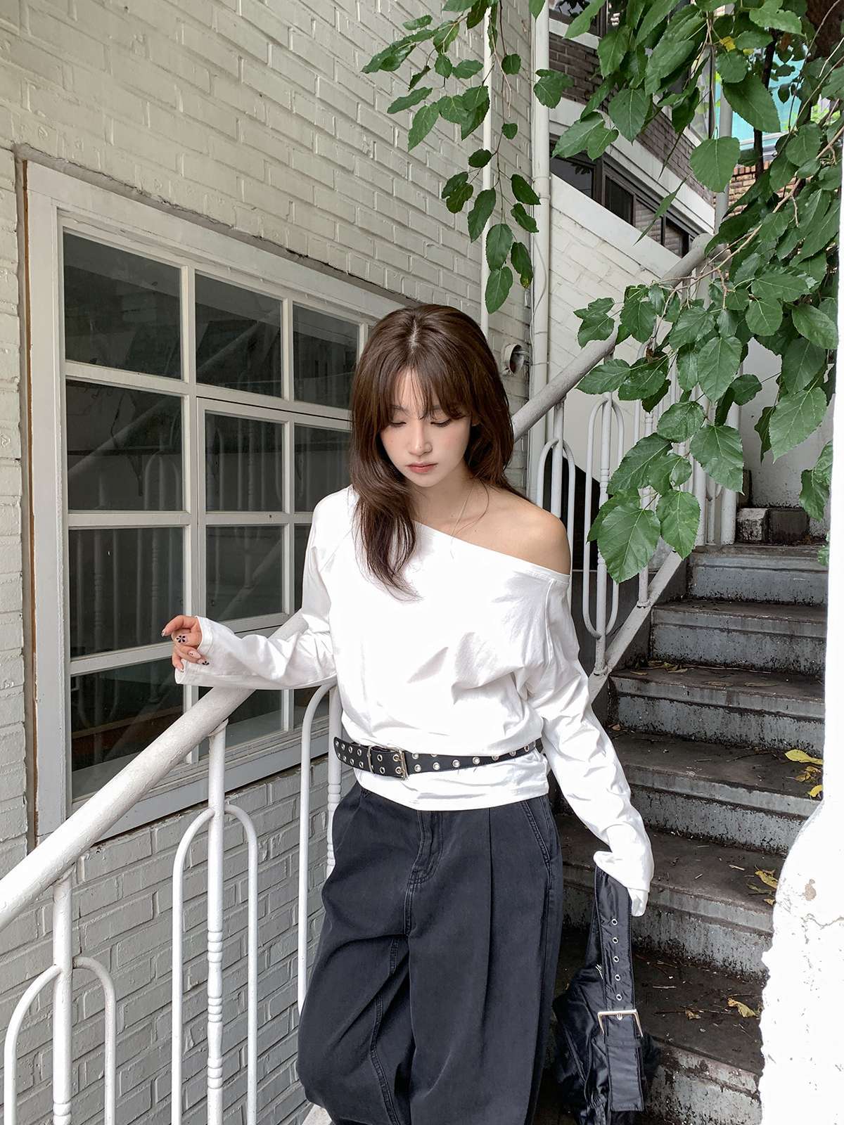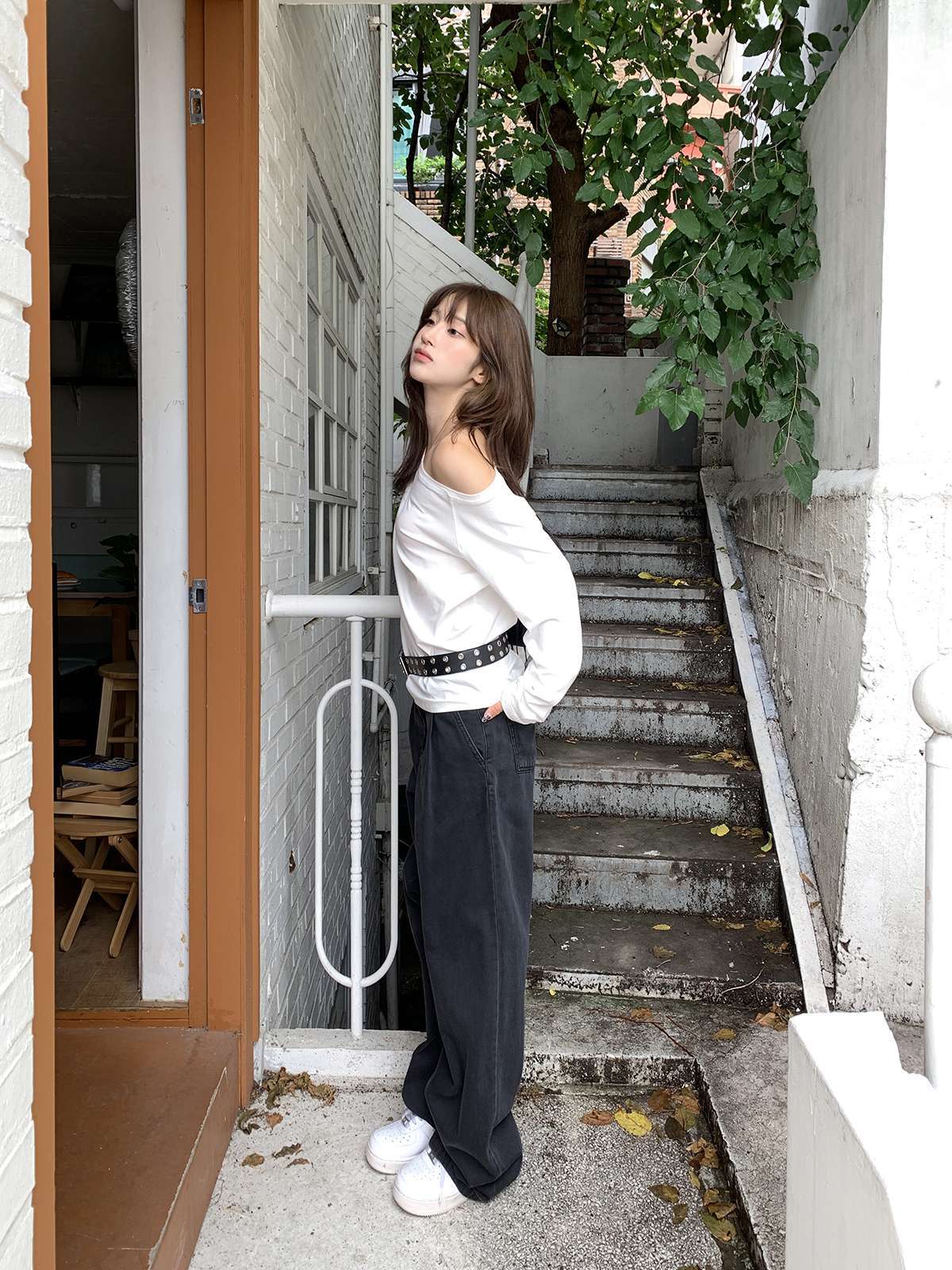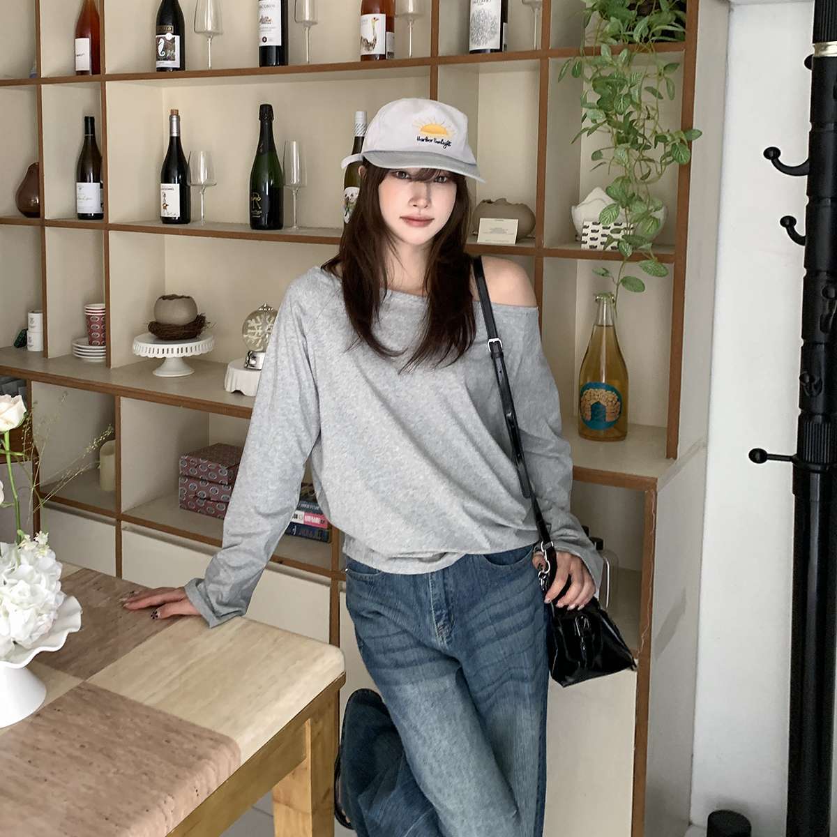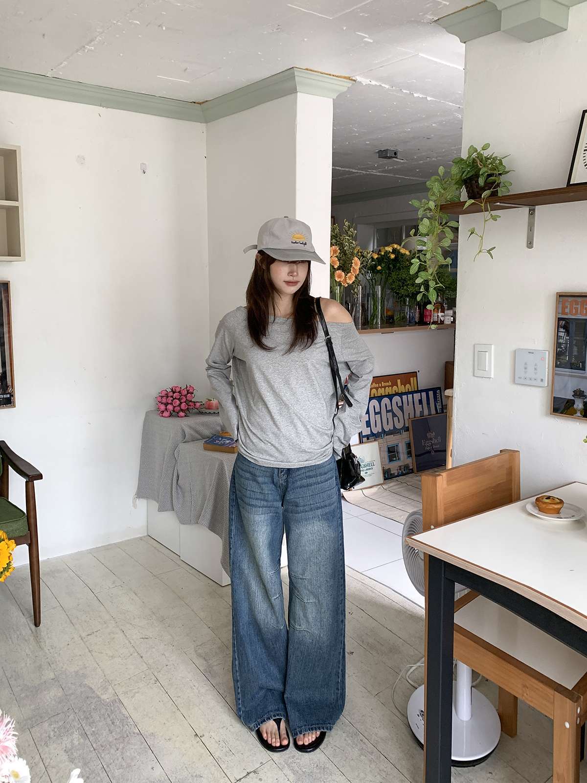 [ T16998C57-이지댄 원 오프숄더 루즈핏 무지 긴팔 티셔츠 ]