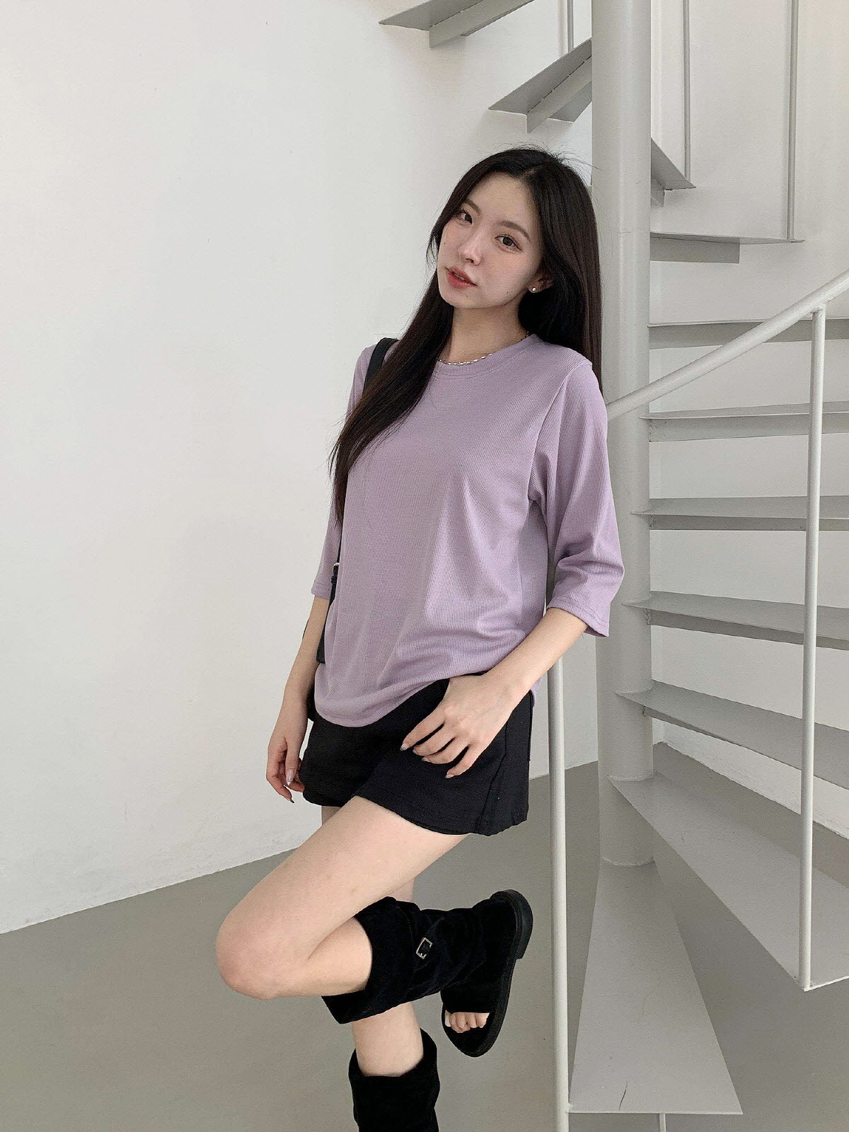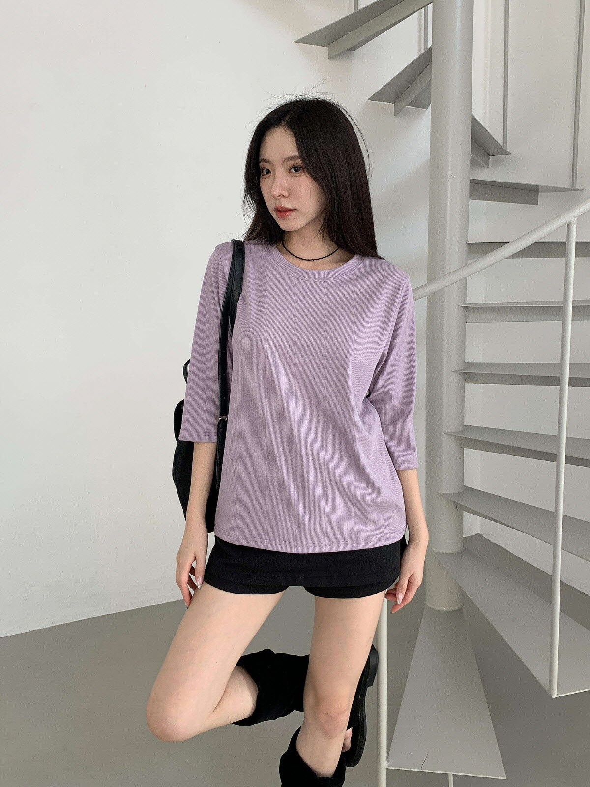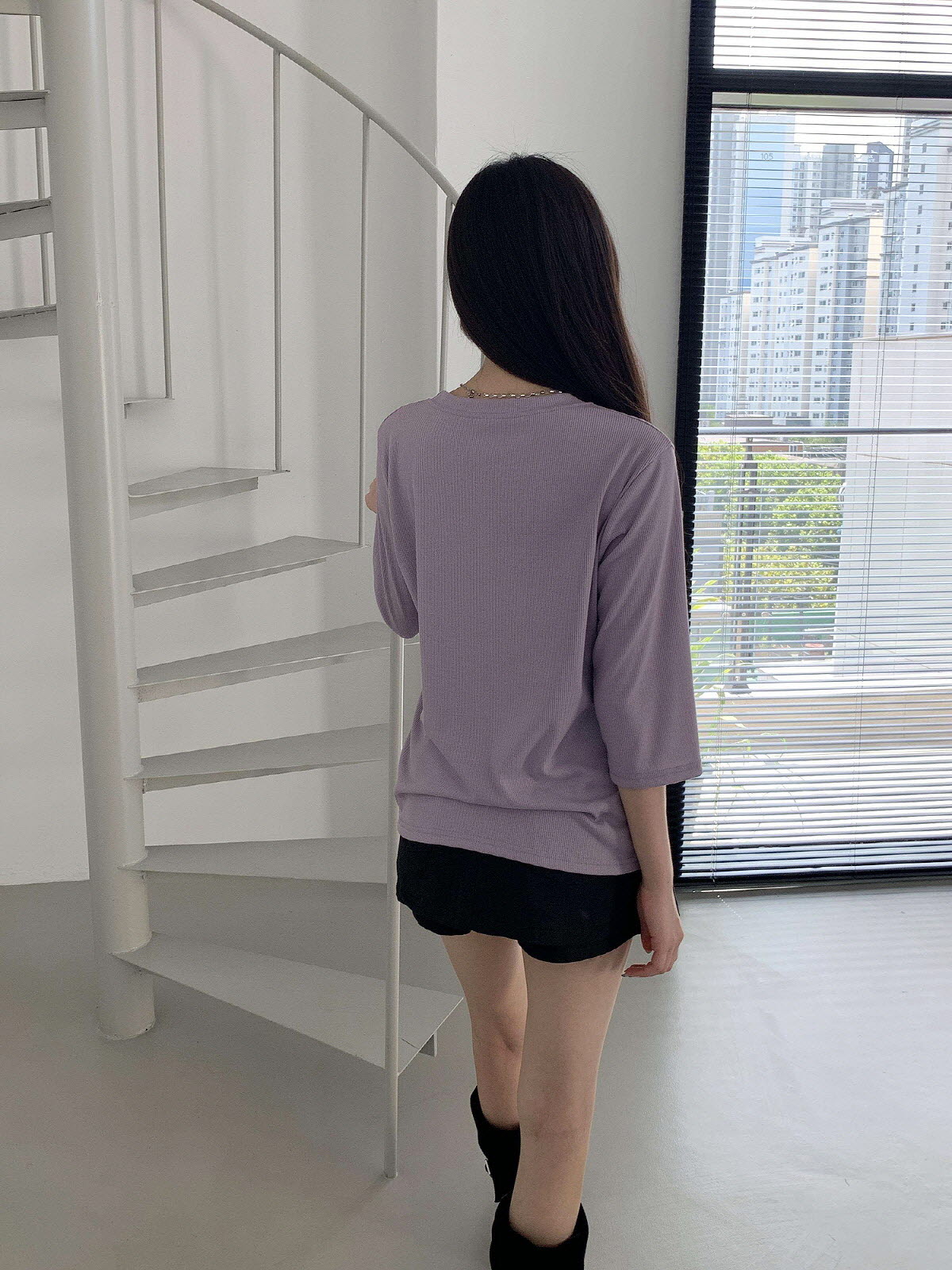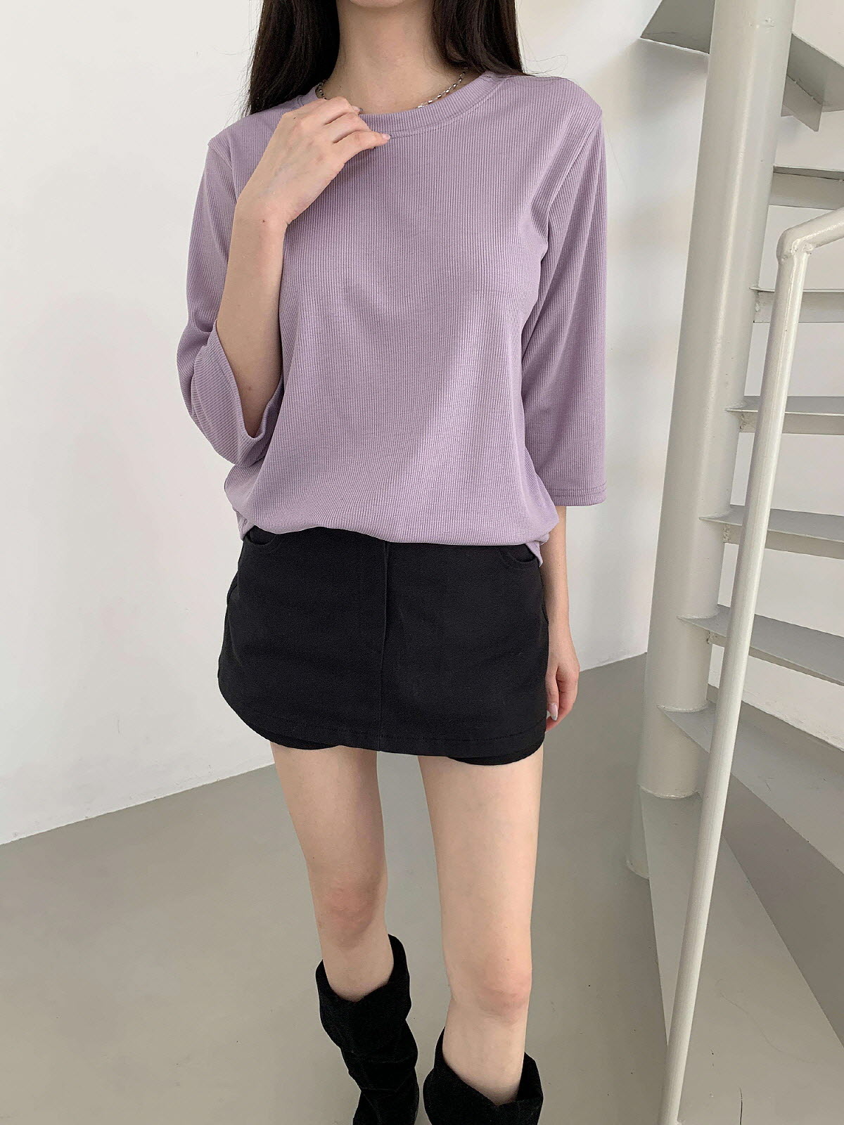 T17031K57-서앤사 스판 골지 루즈핏 8부 티