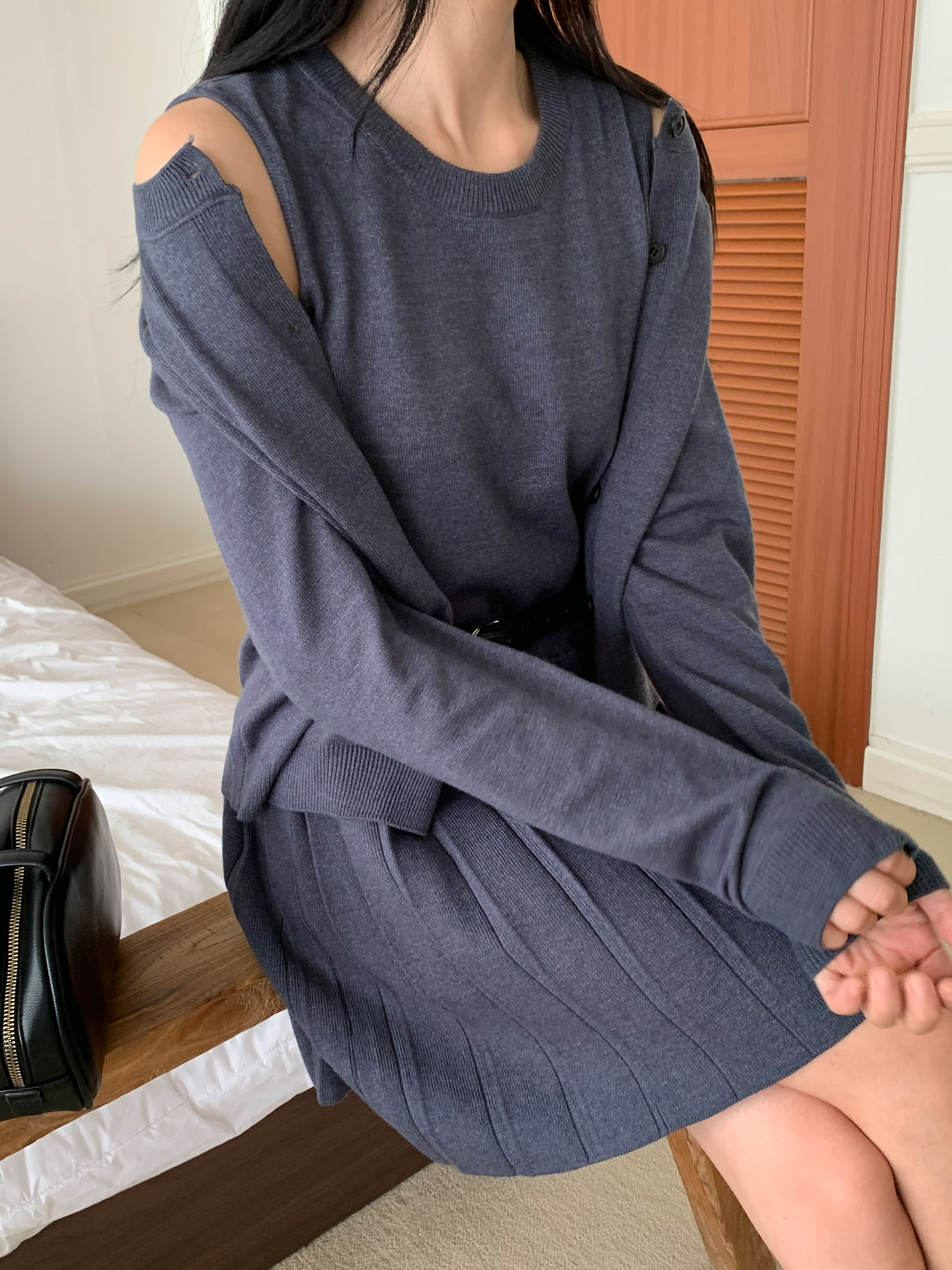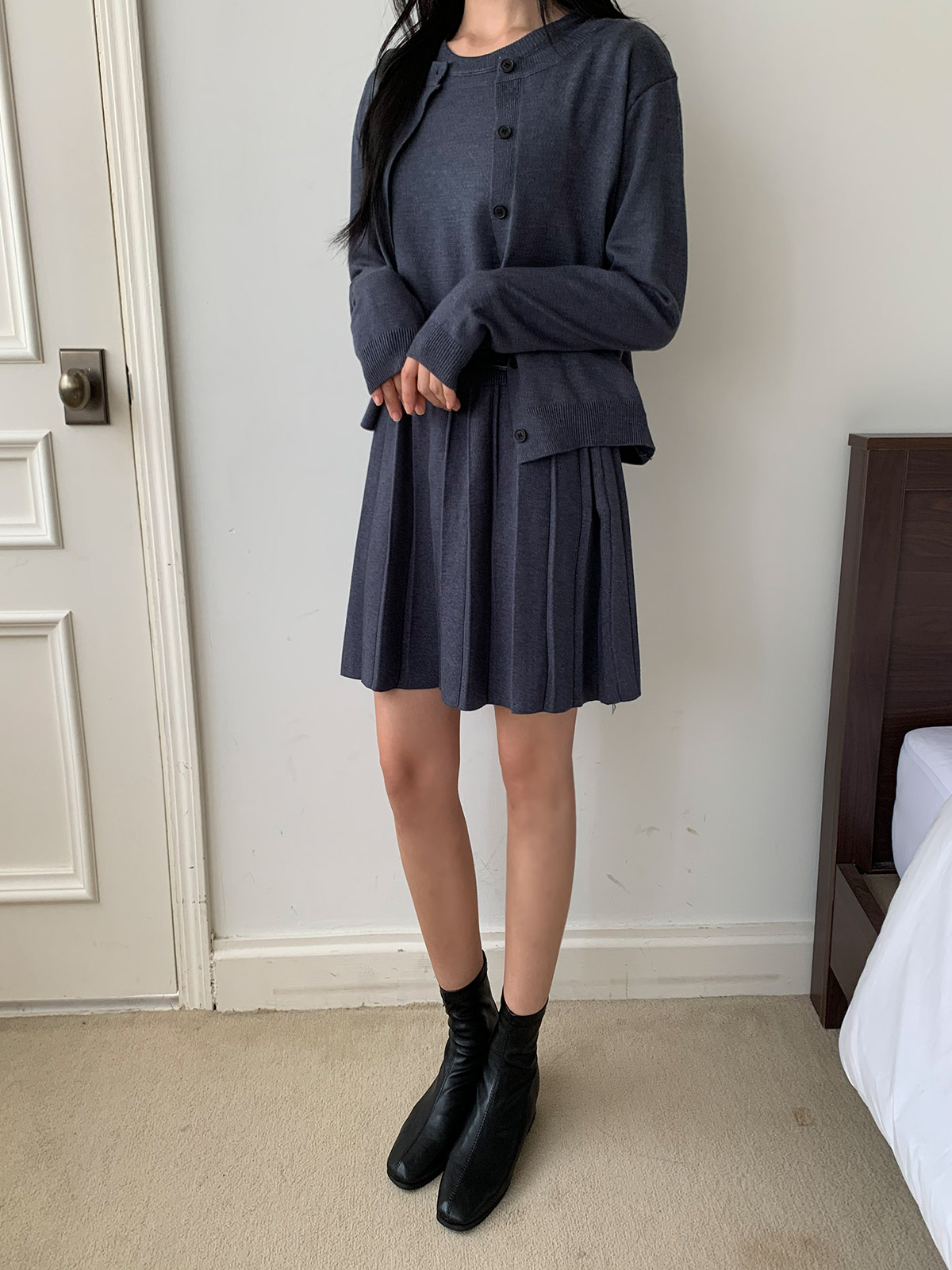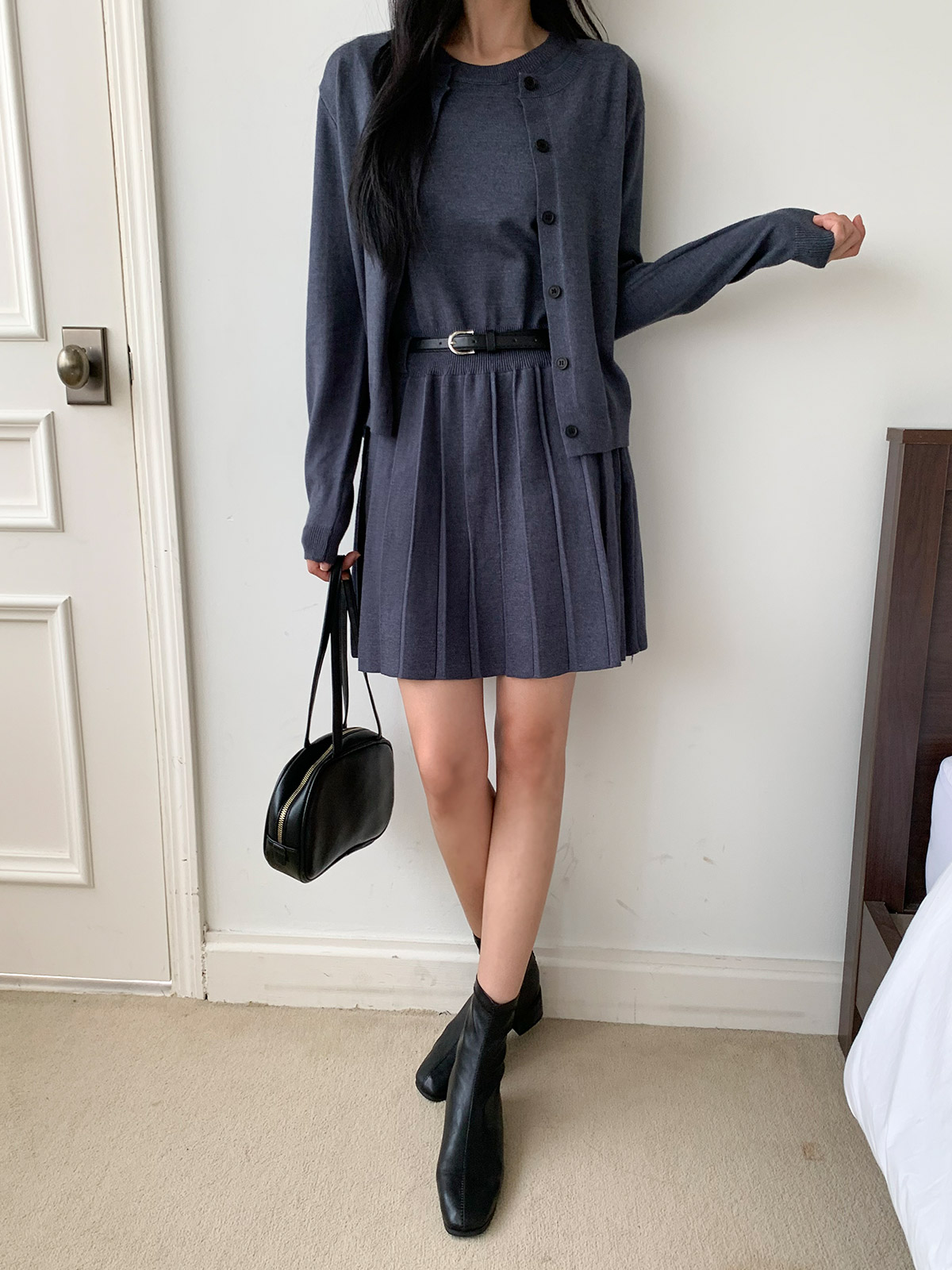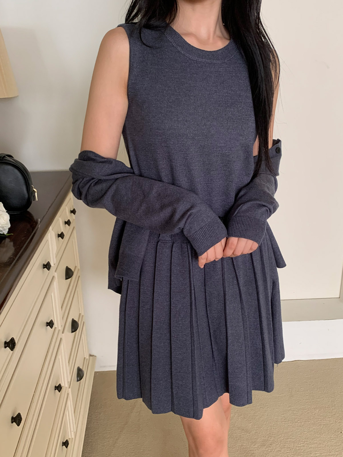 SET3818K58-커리나 니트 가디건 민소매 플리츠 니트 원피스 벨트 세트