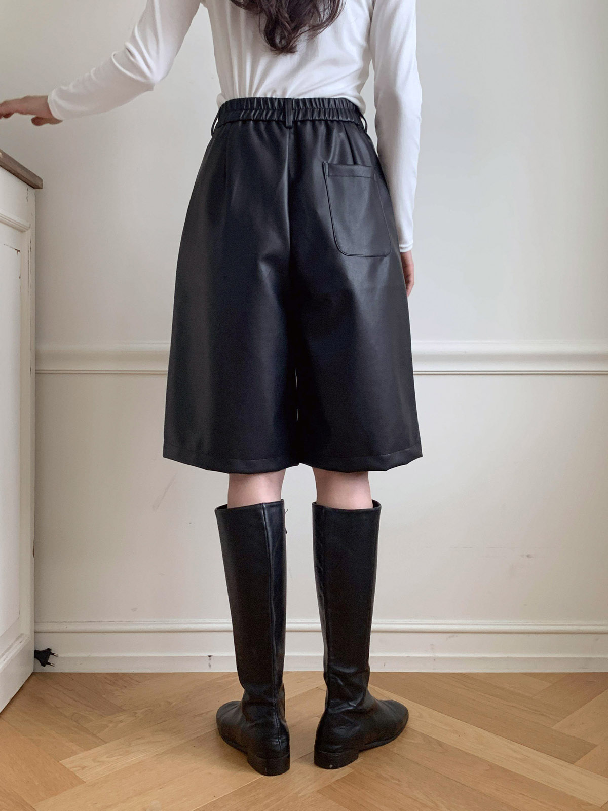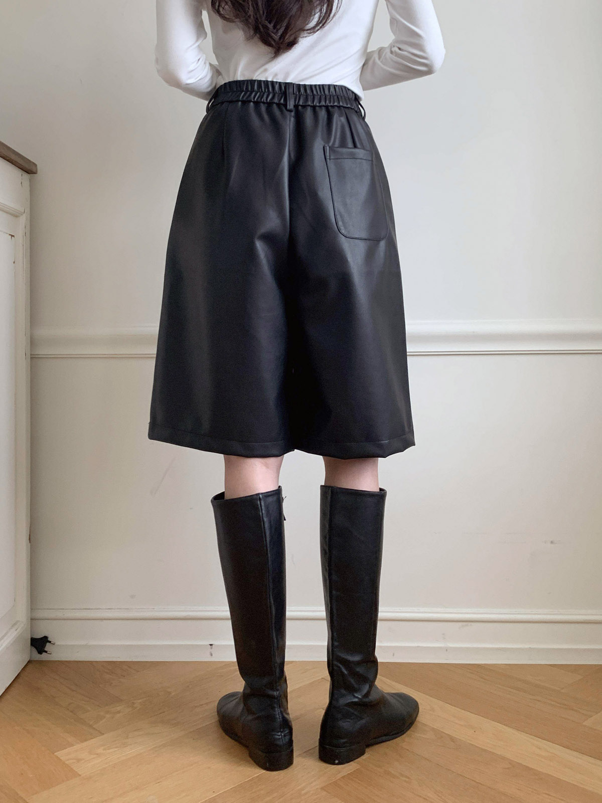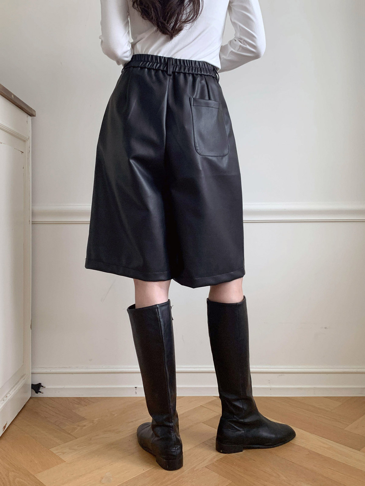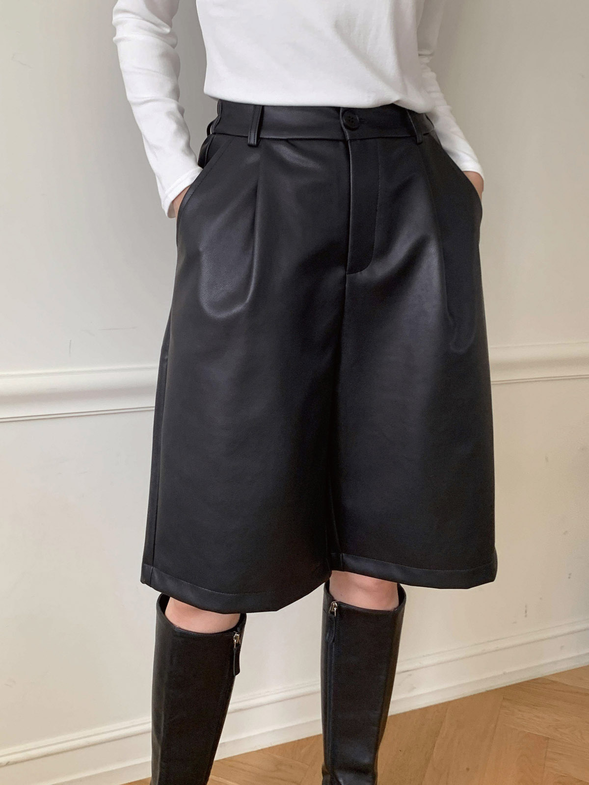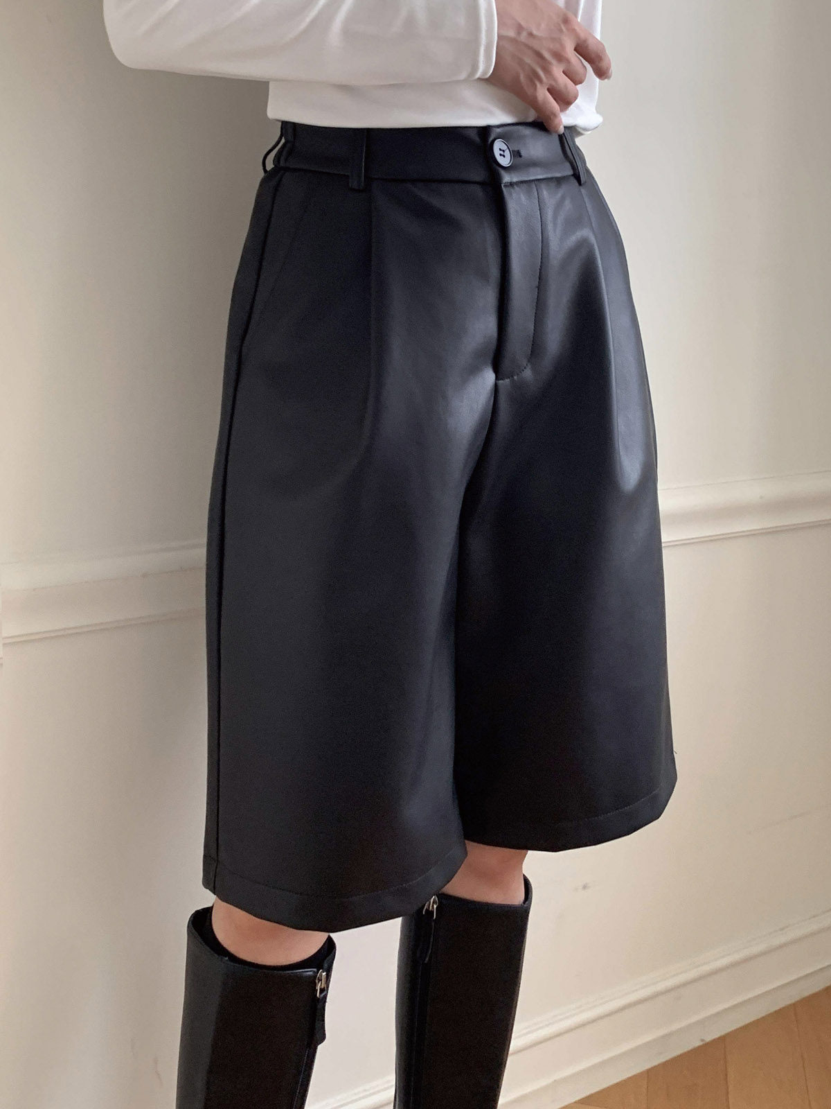 고급스러운 페이크 레더 소재감의 와이드 버뮤다 팬츠