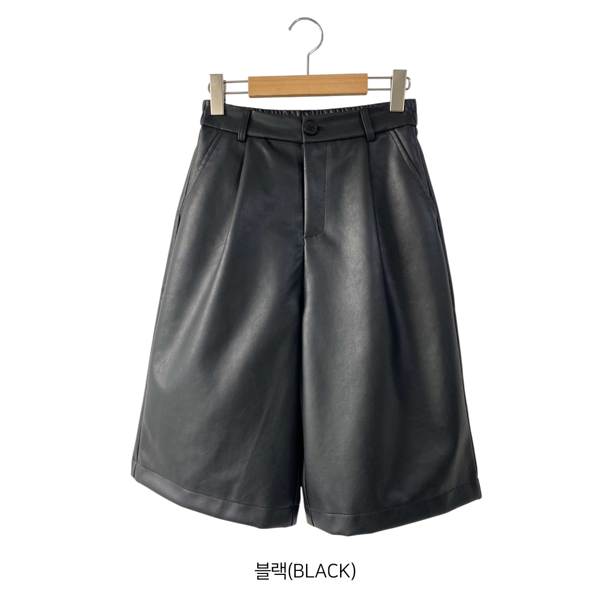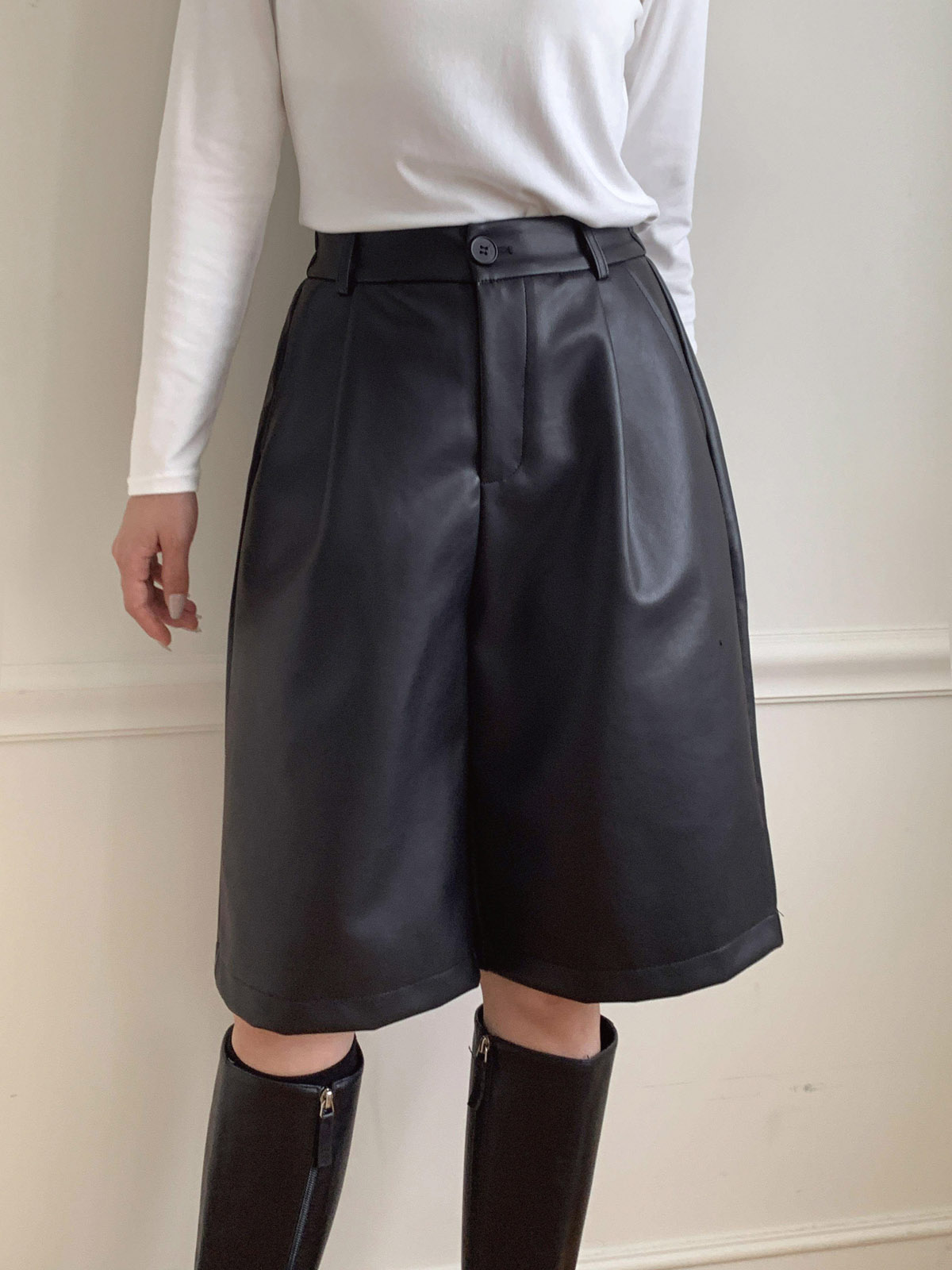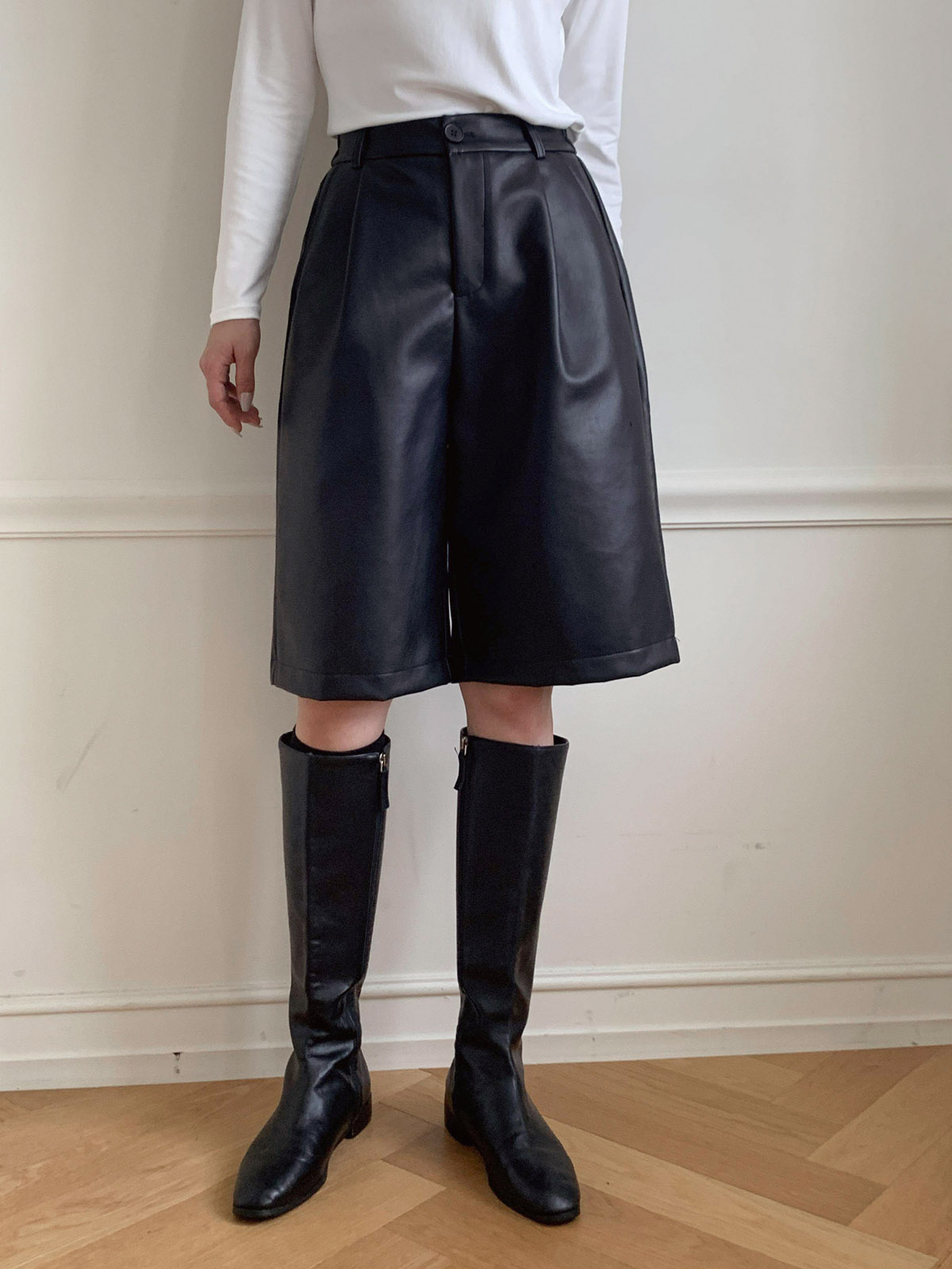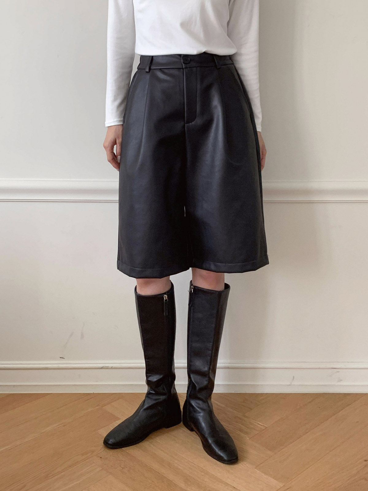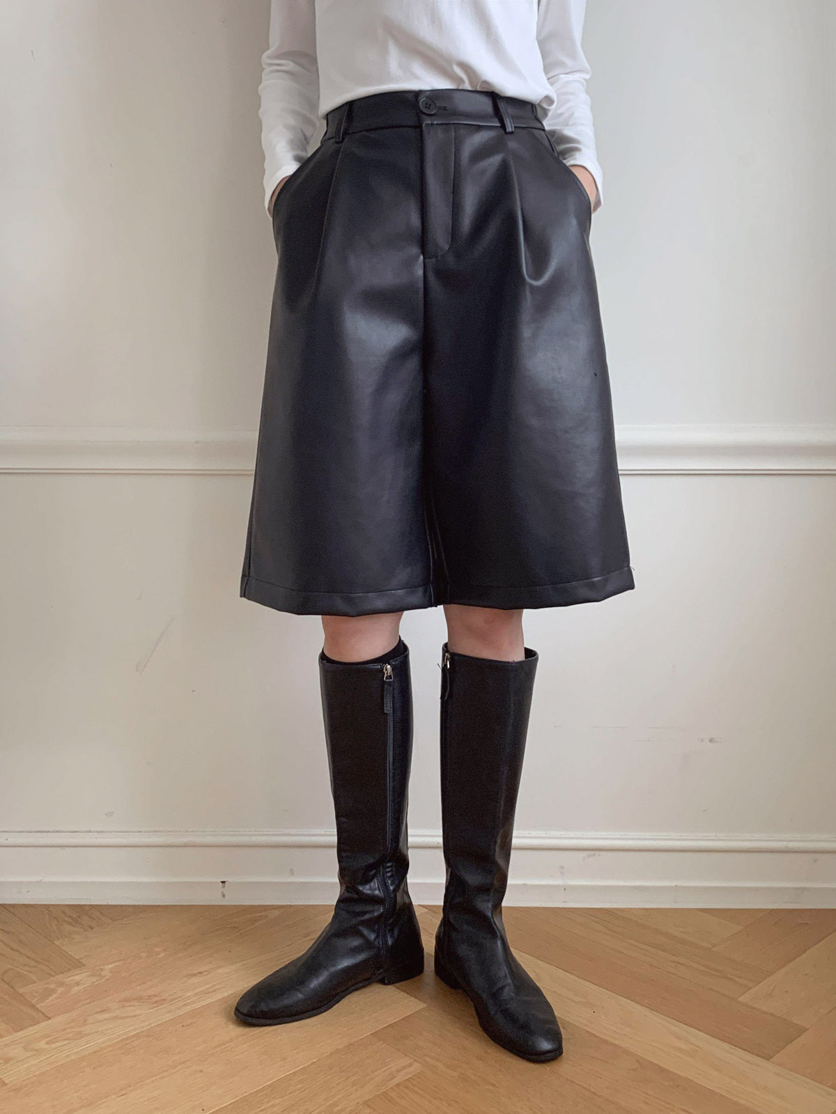 고급스러운 페이크 레더 소재감의 와이드 버뮤다 팬츠