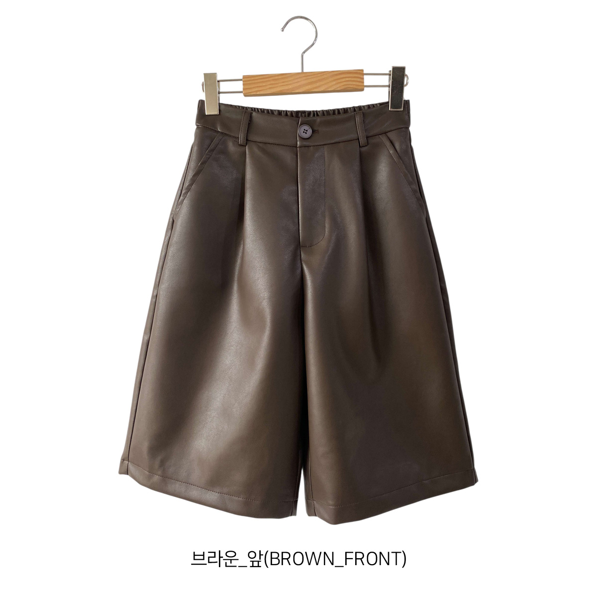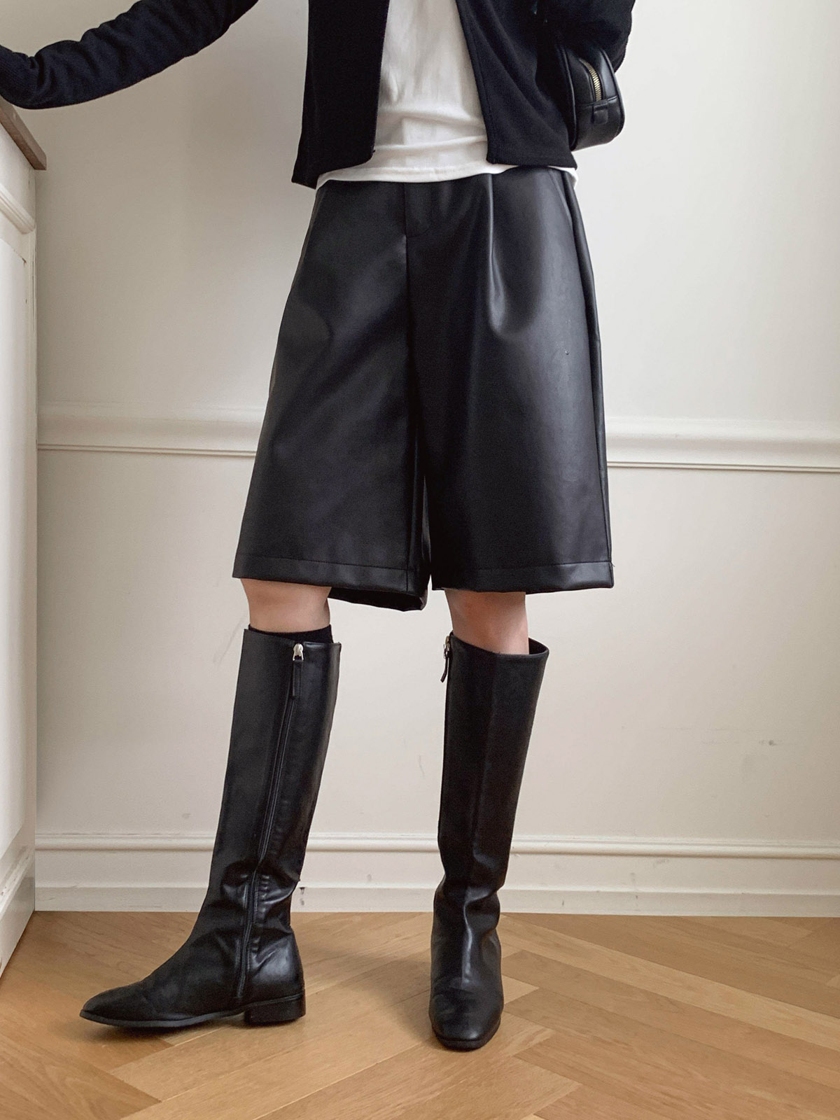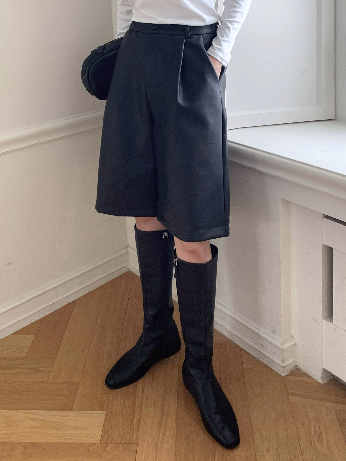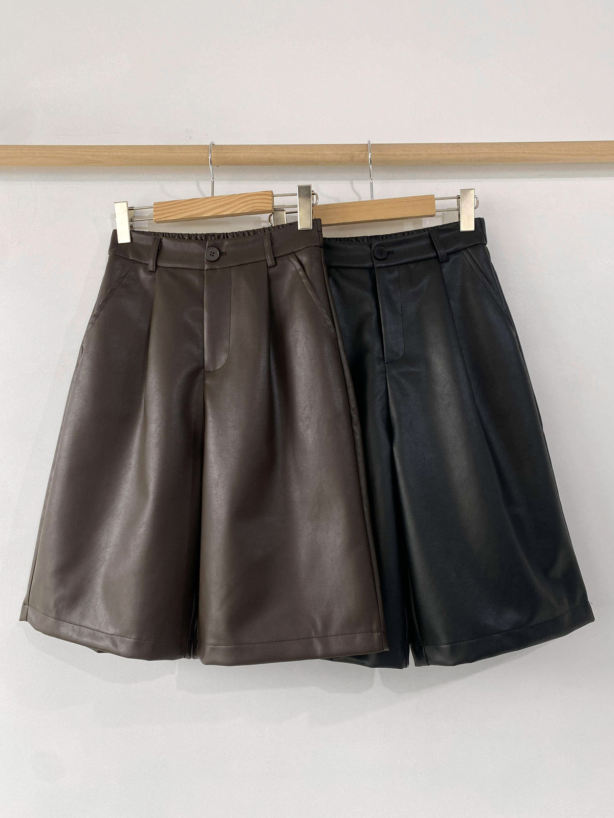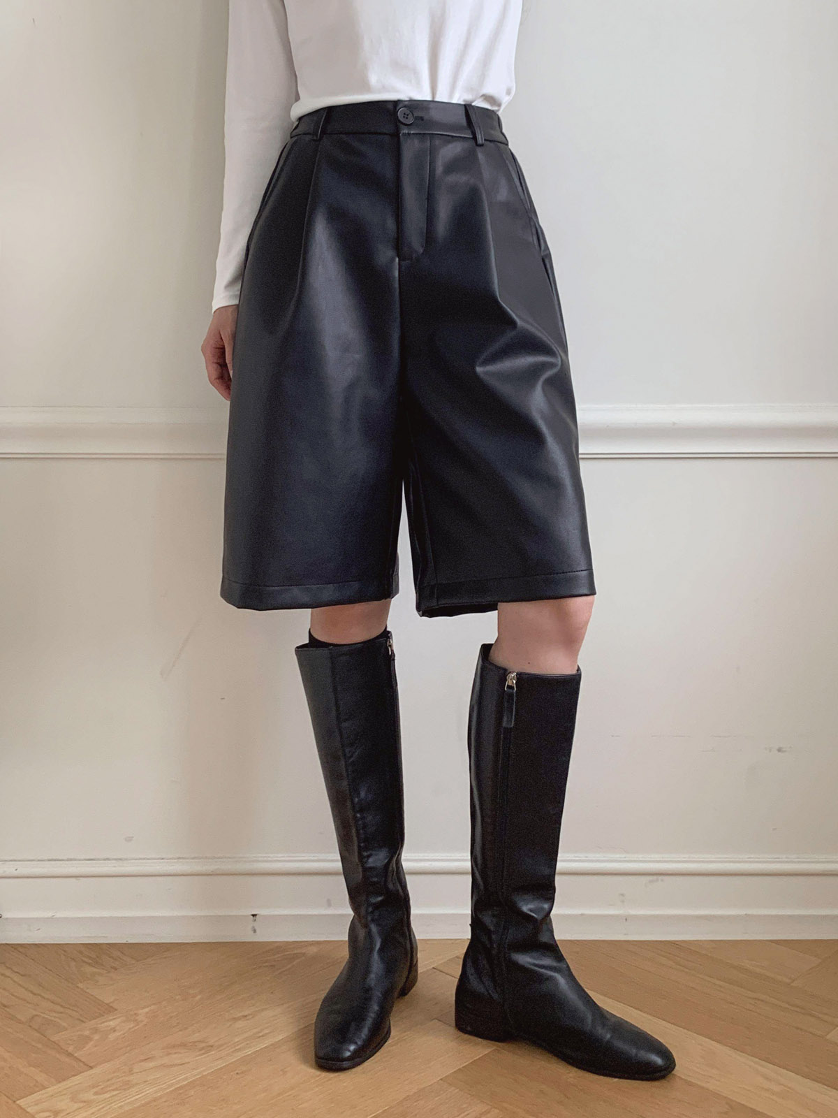 고급스러운 페이크 레더 소재감의 와이드 버뮤다 팬츠