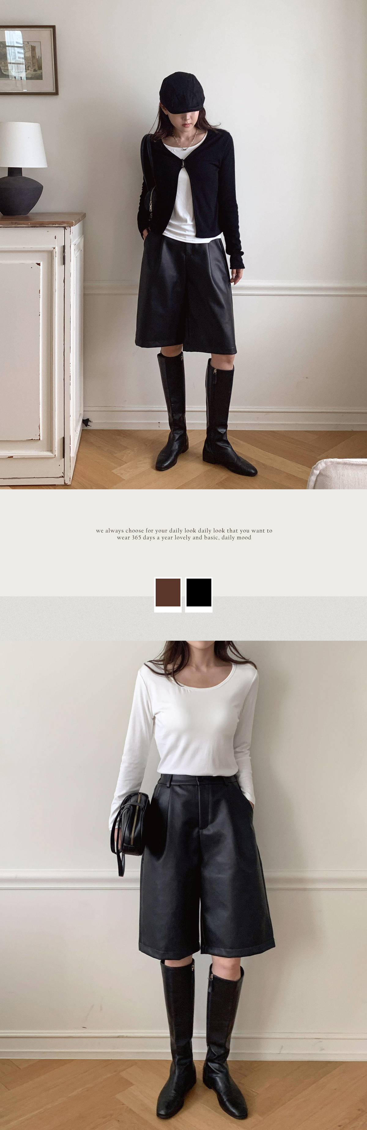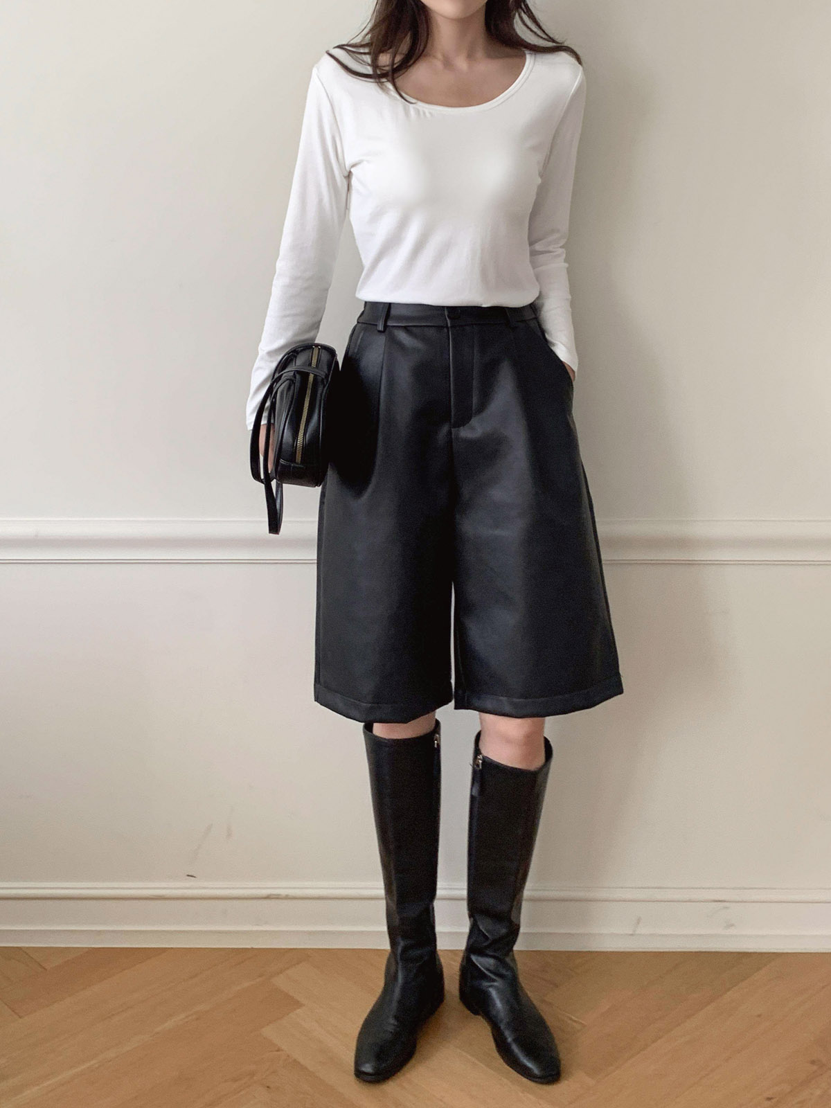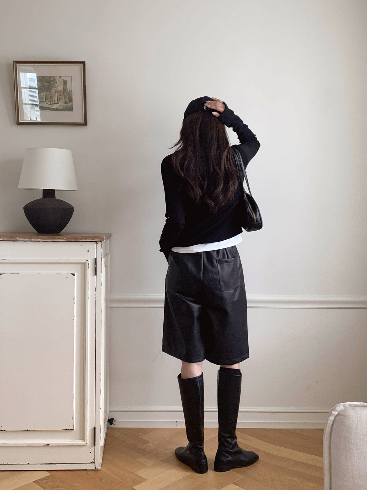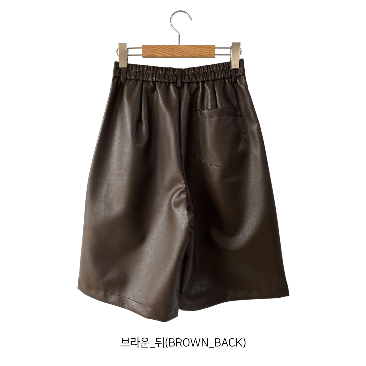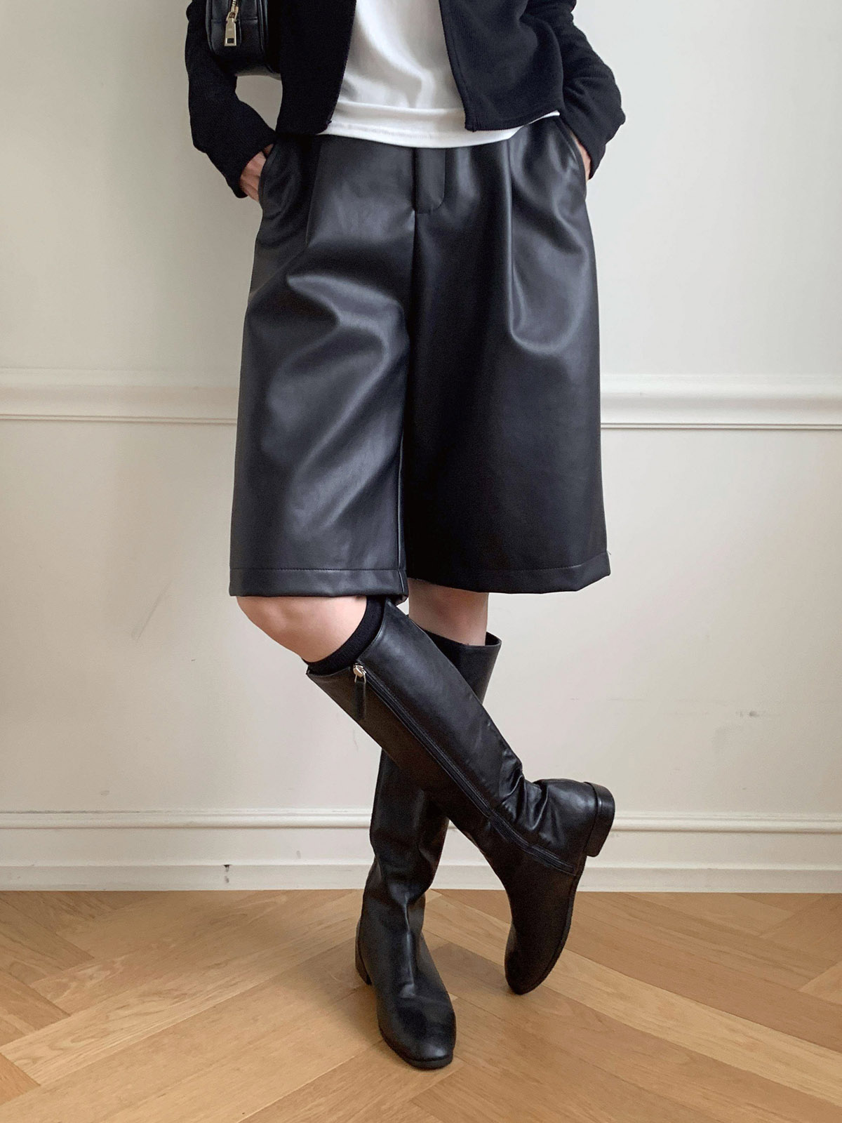 고급스러운 페이크 레더 소재감의 와이드 버뮤다 팬츠
