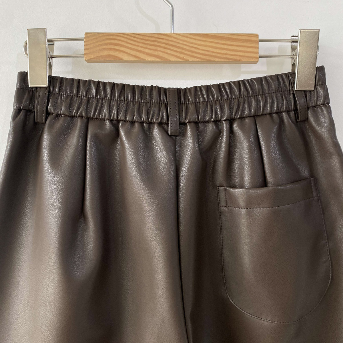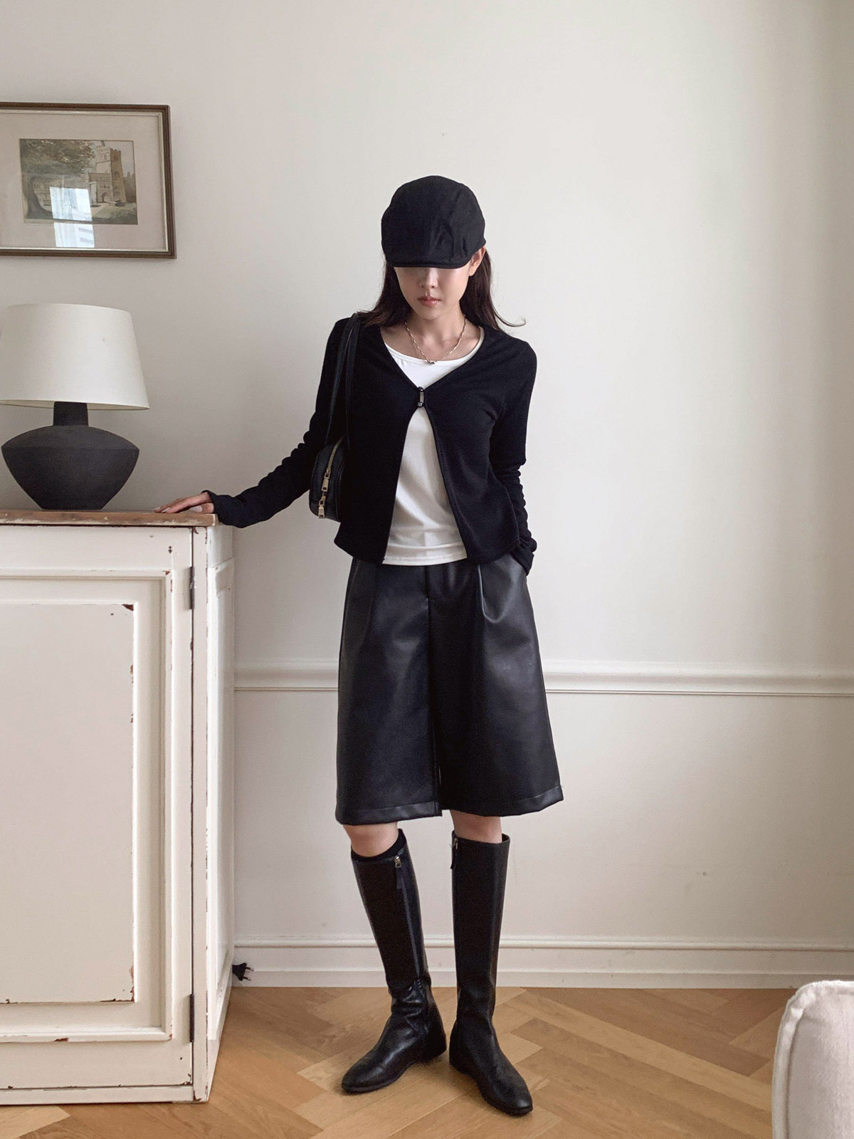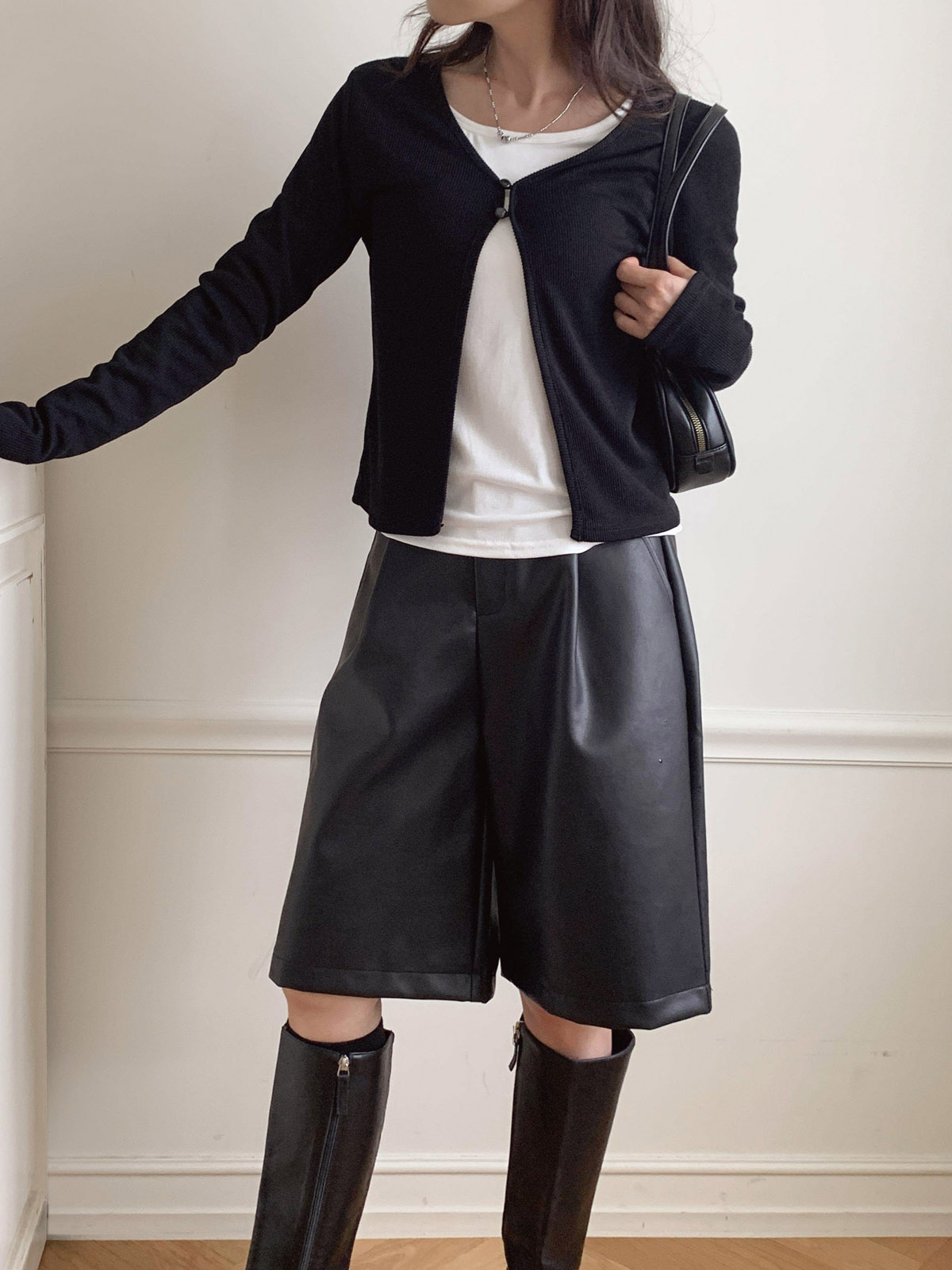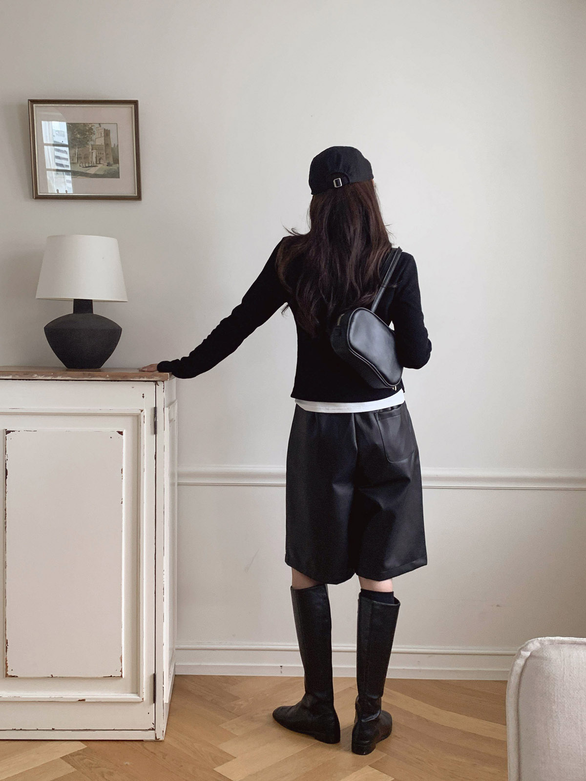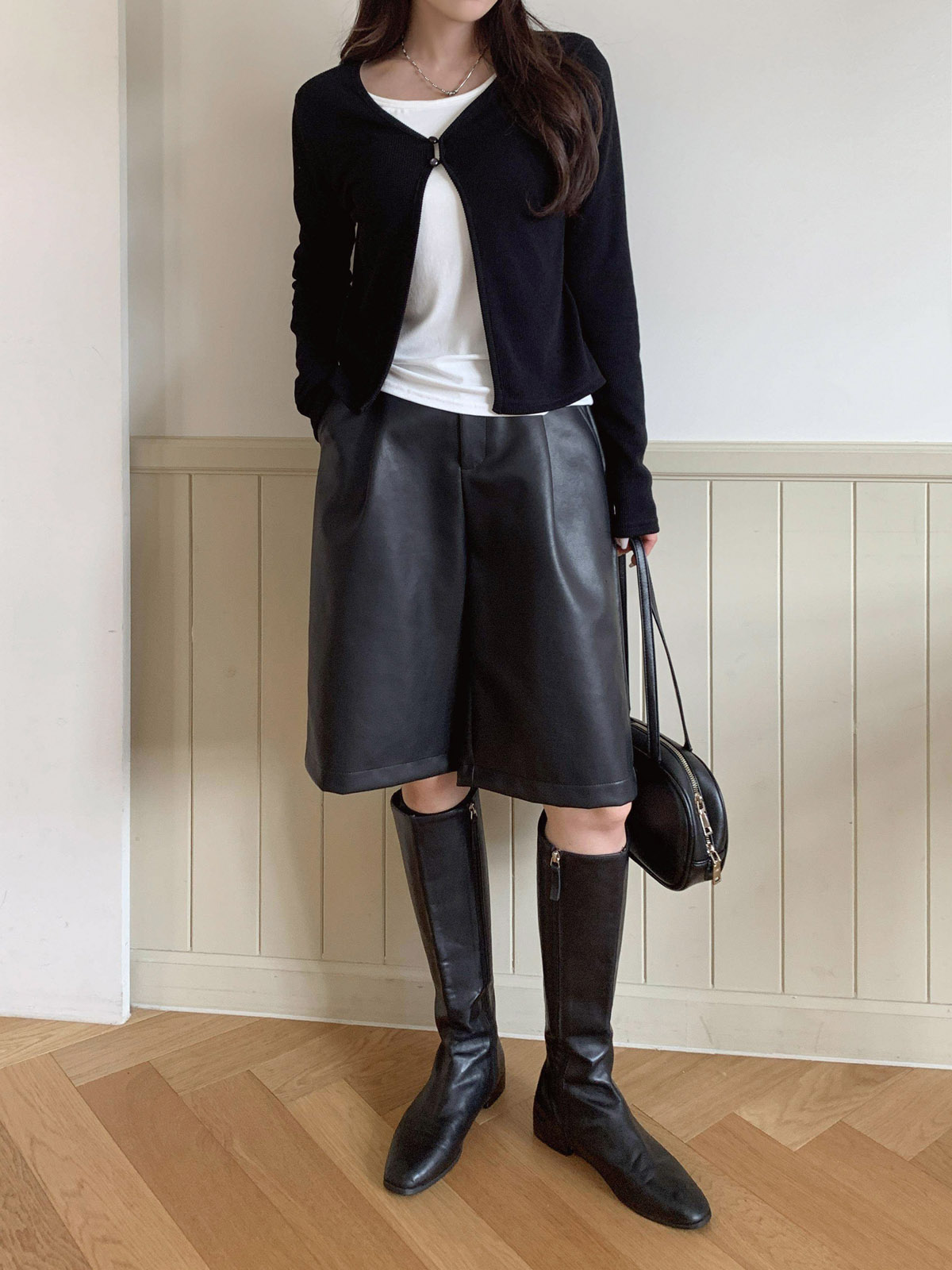 고급스러운 페이크 레더 소재감의 와이드 버뮤다 팬츠