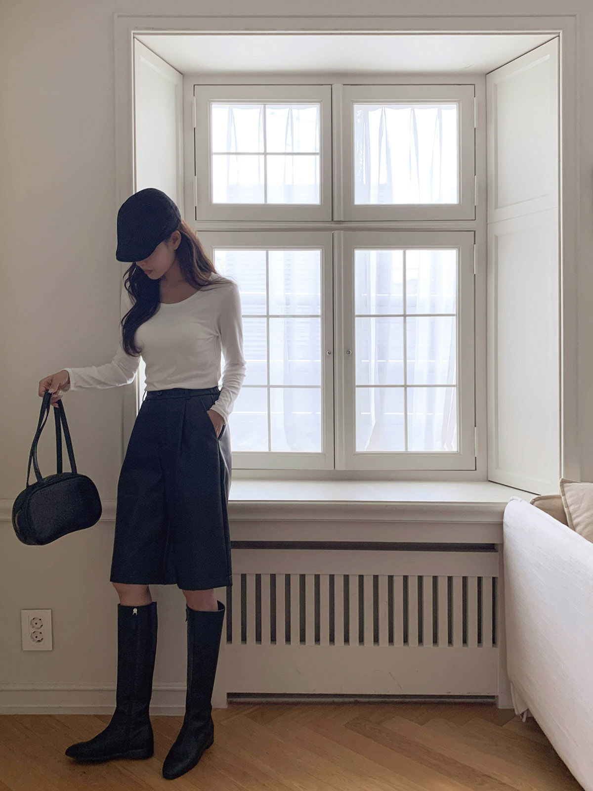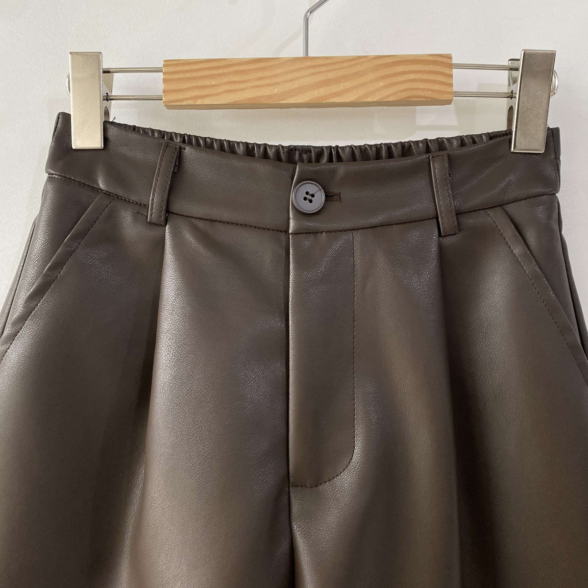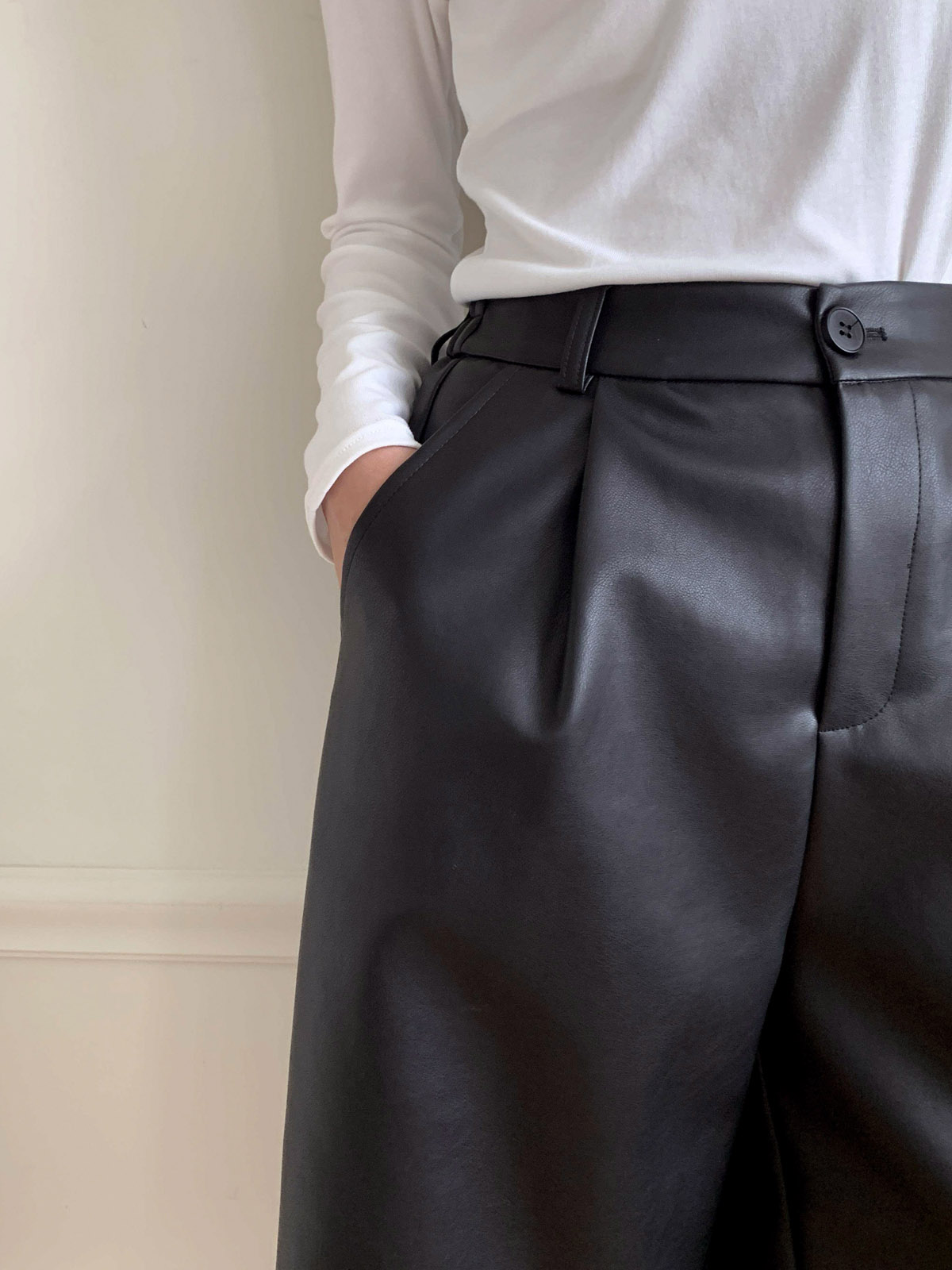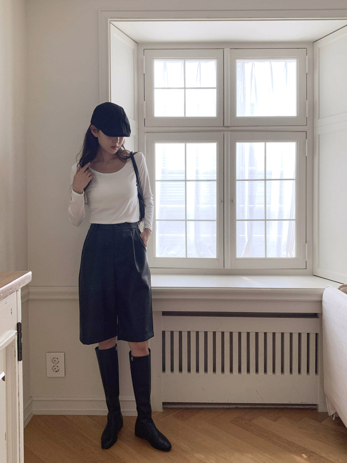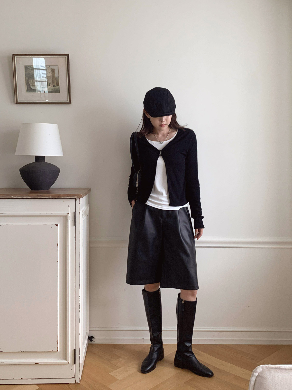 고급스러운 페이크 레더 소재감의 와이드 버뮤다 팬츠