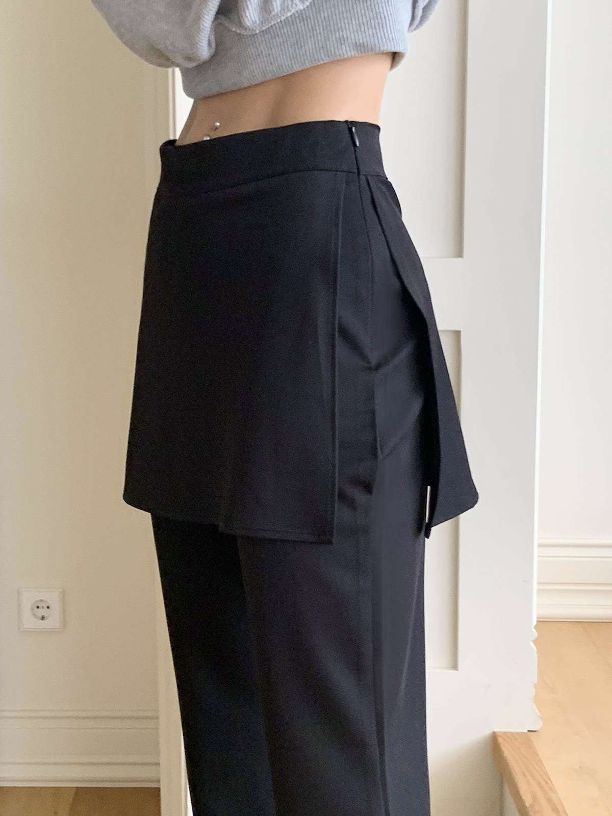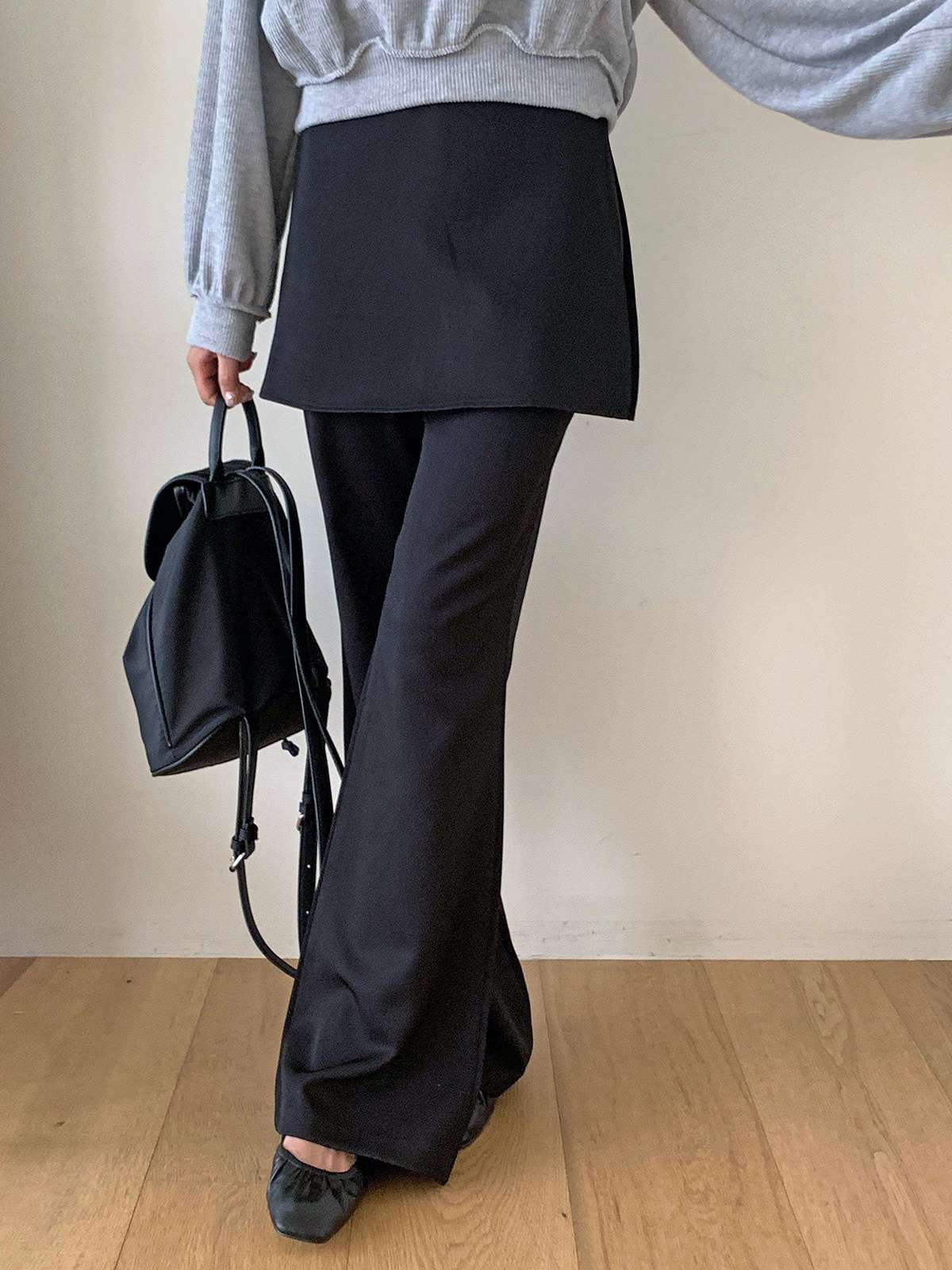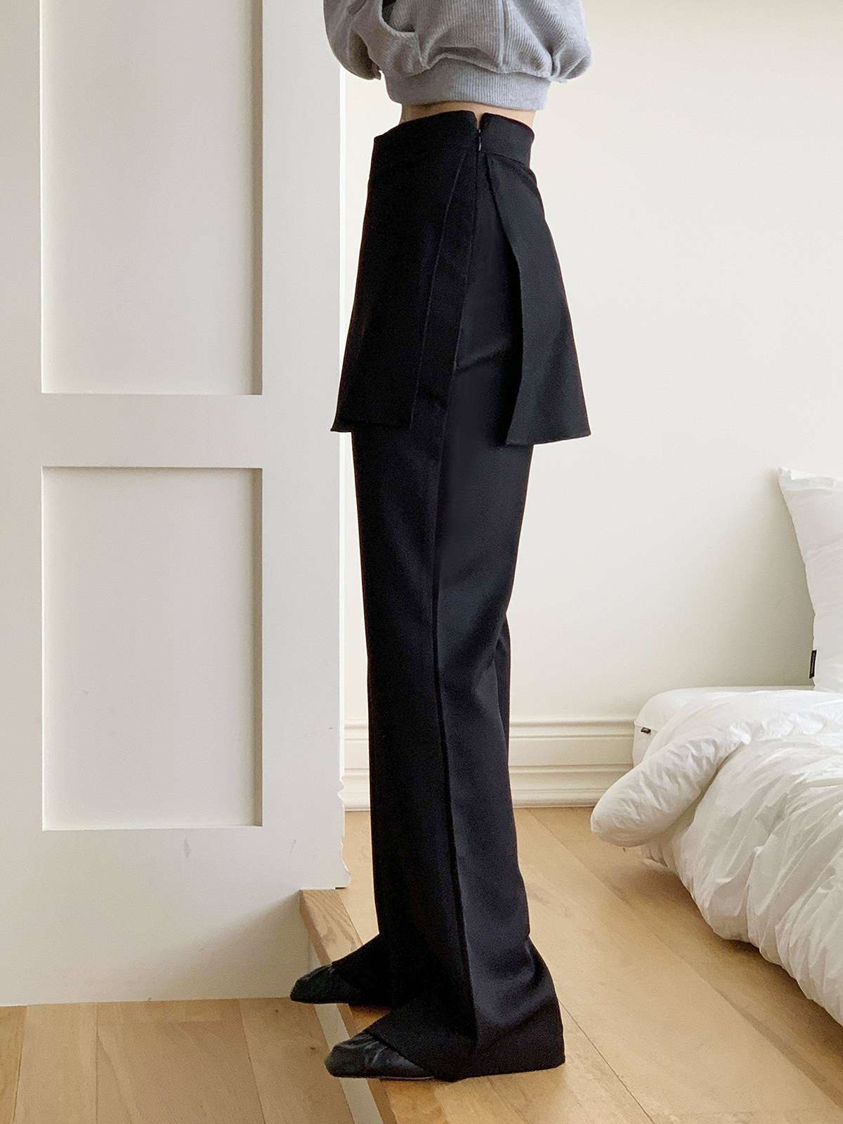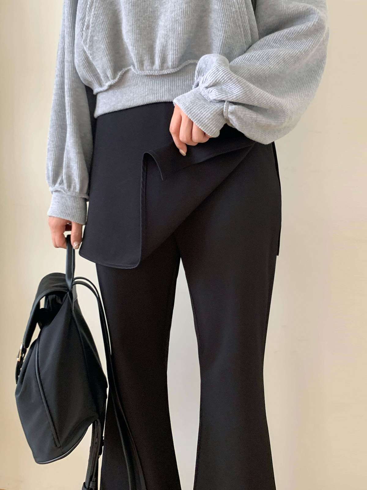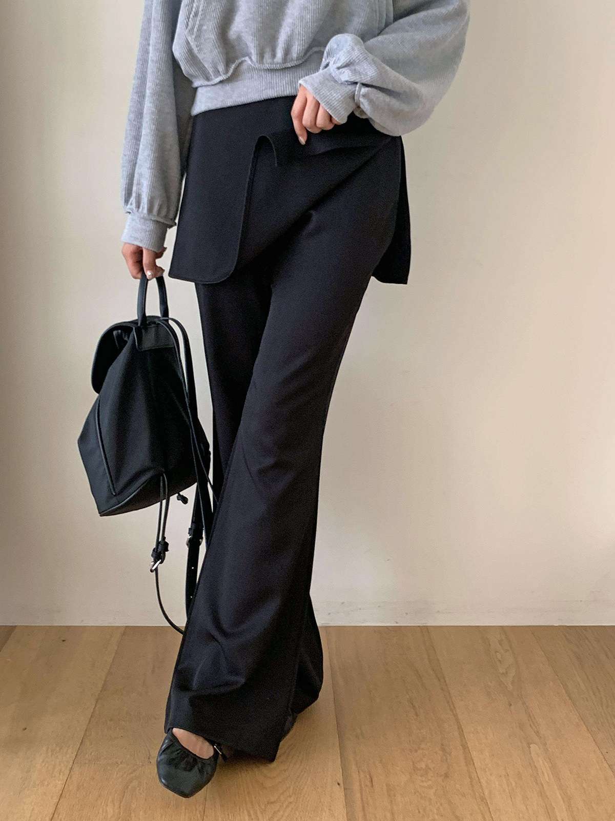 슬랙스와 미니 랩 스커트가 하나로 연결된 유니크한 디자인의 부츠컷 슬랙스