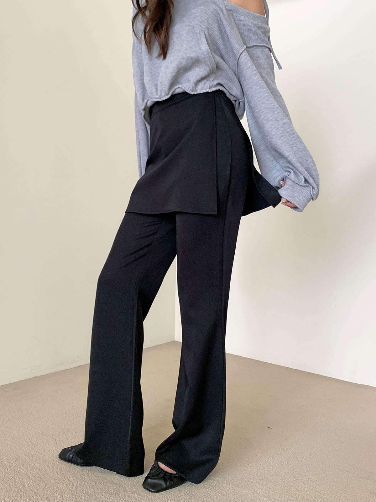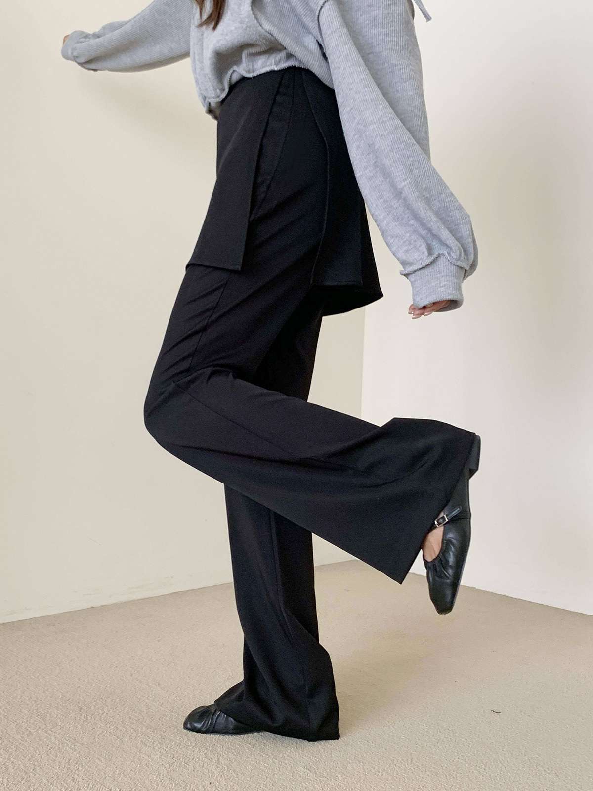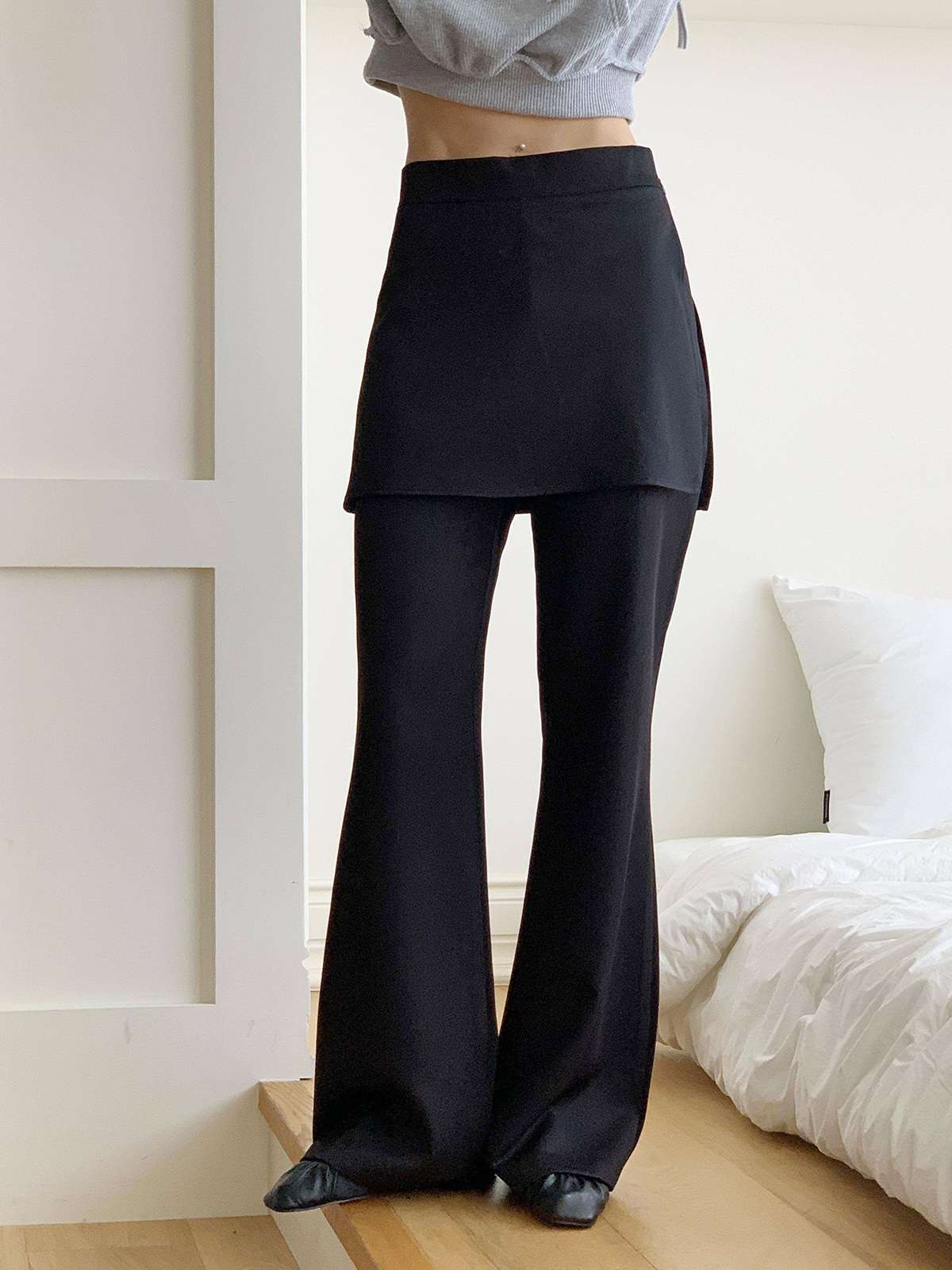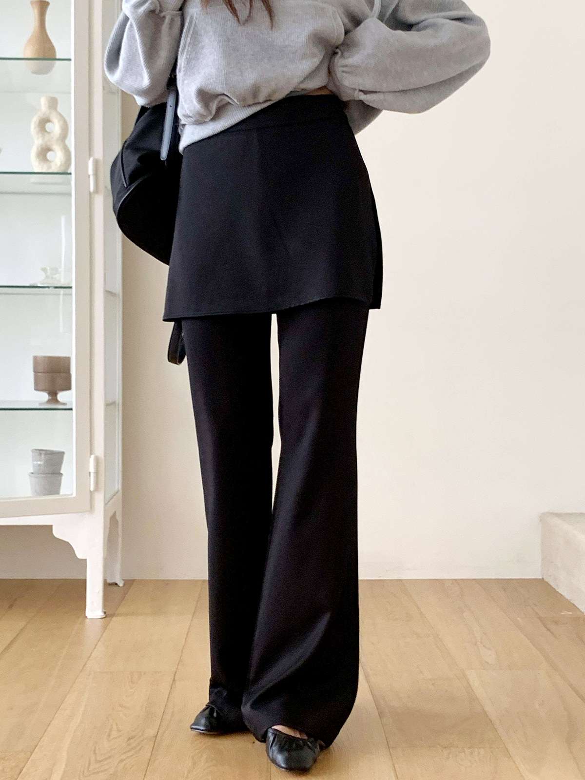 슬랙스와 미니 랩 스커트가 하나로 연결된 유니크한 디자인의 부츠컷 슬랙스