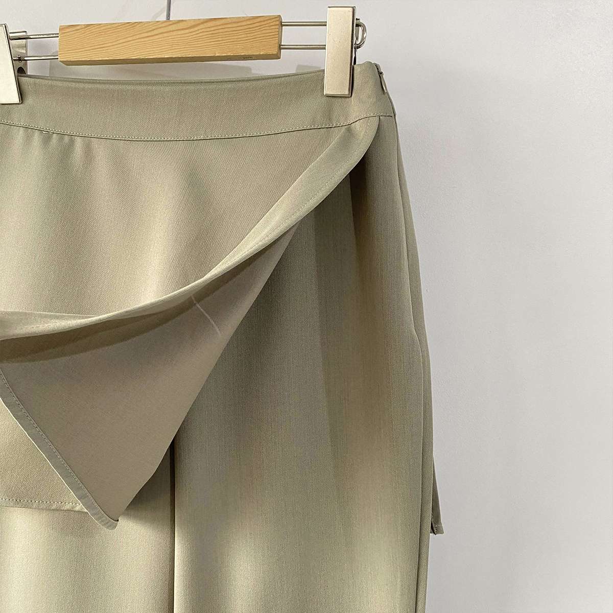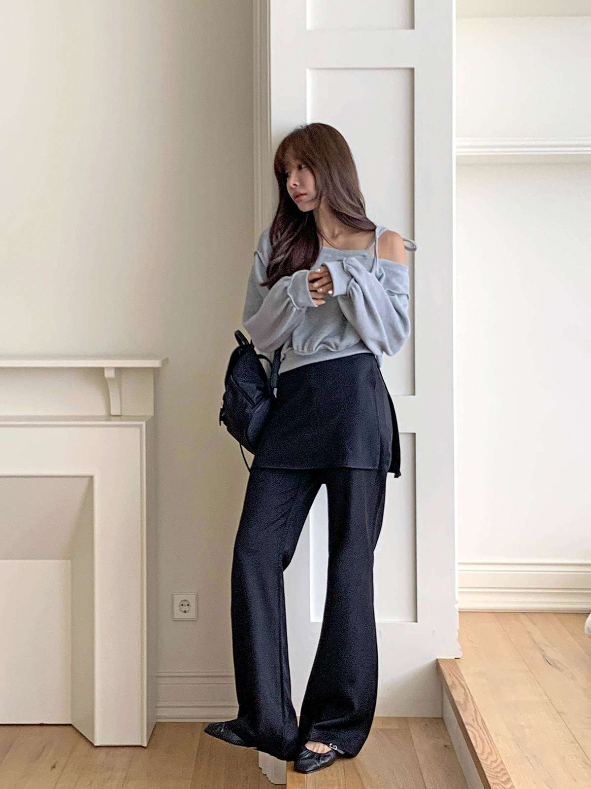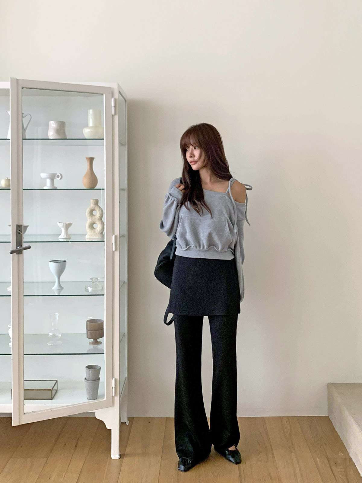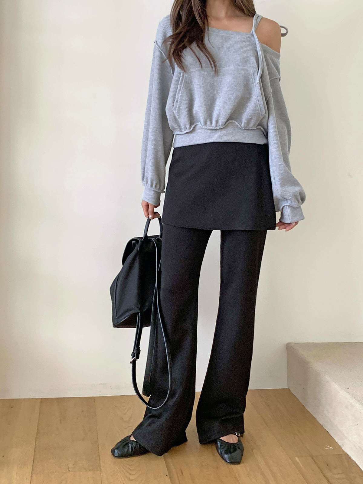 슬랙스와 미니 랩 스커트가 하나로 연결된 유니크한 디자인의 부츠컷 슬랙스