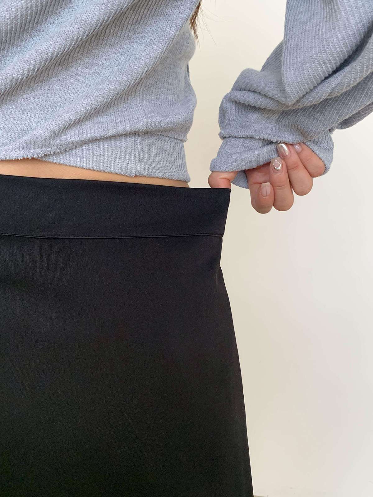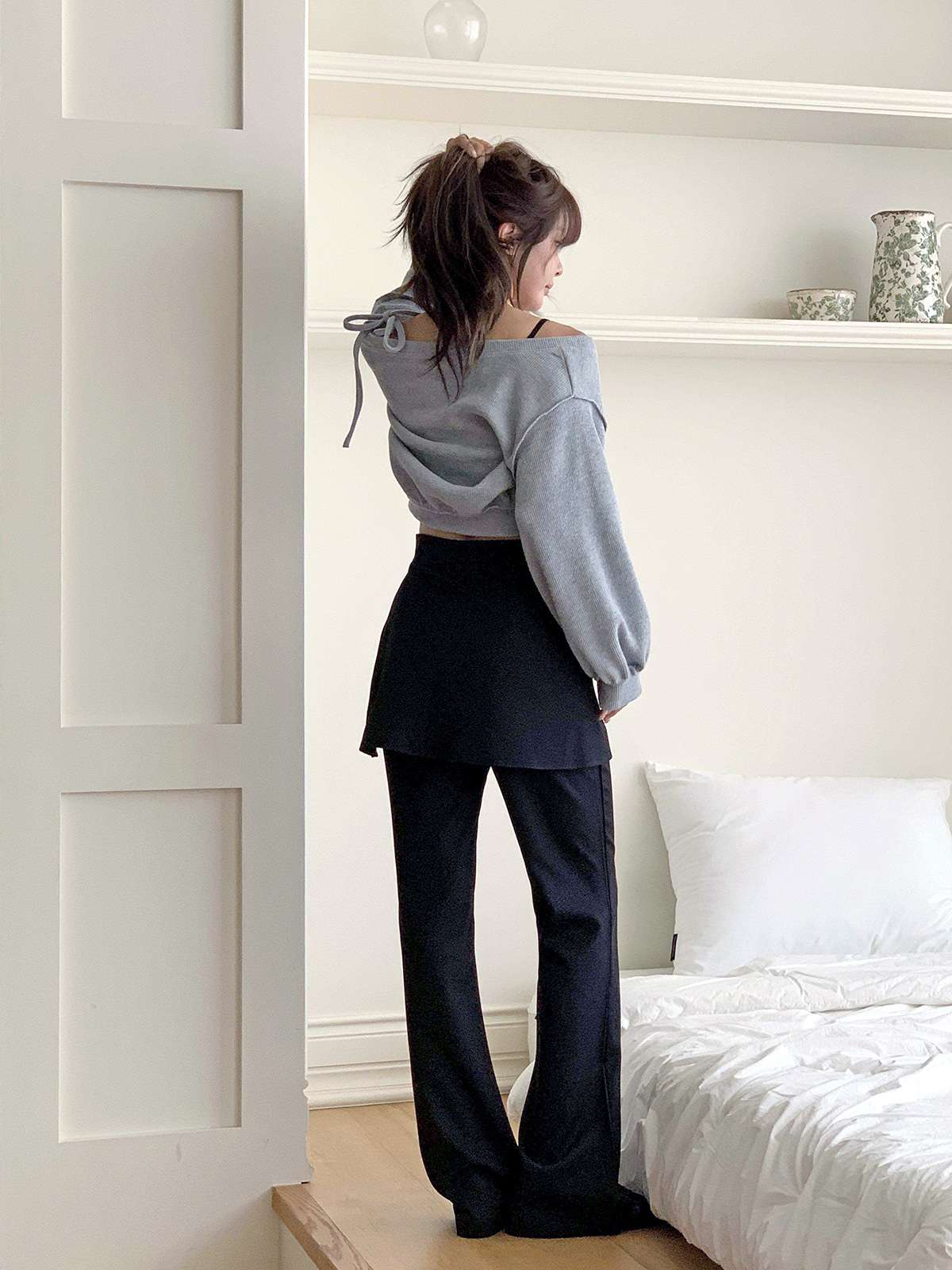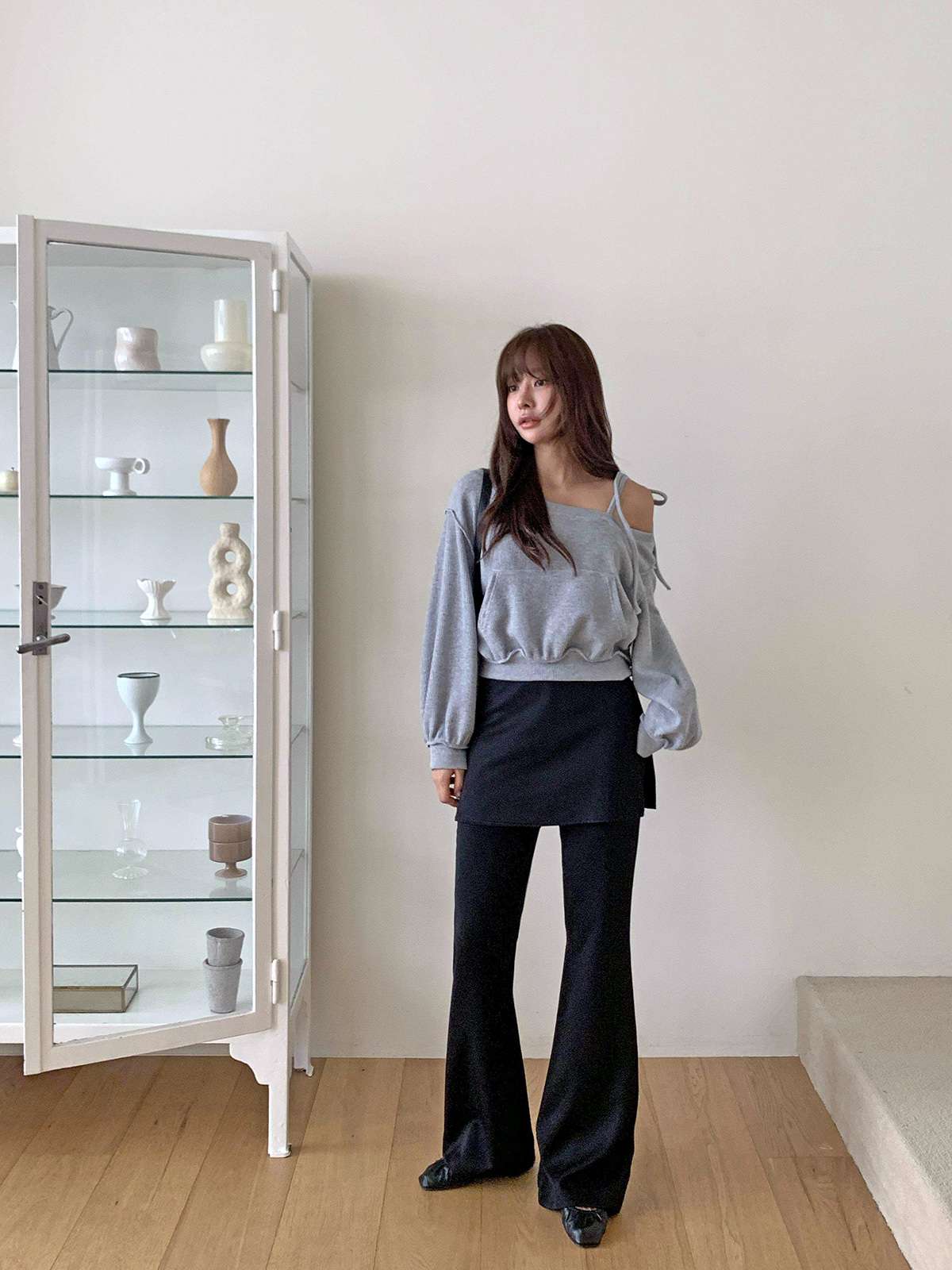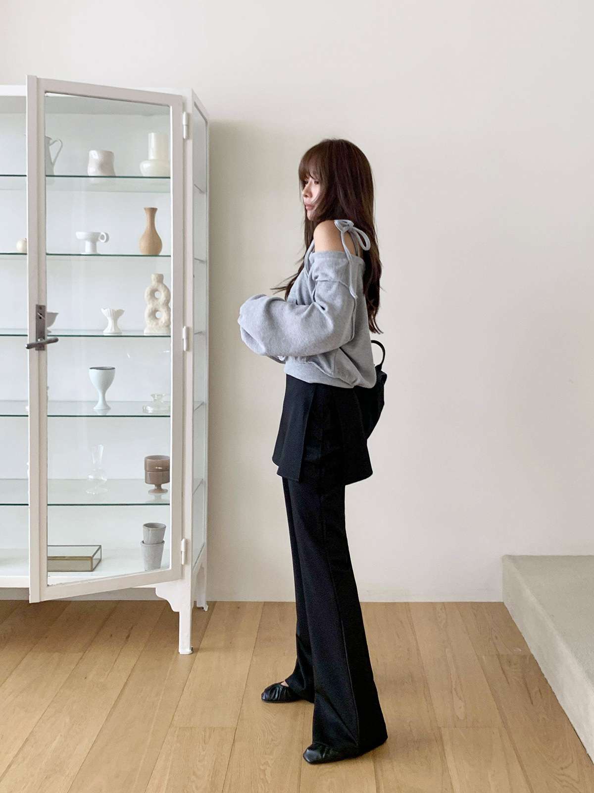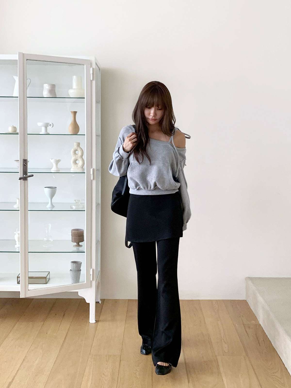 슬랙스와 미니 랩 스커트가 하나로 연결된 유니크한 디자인의 부츠컷 슬랙스