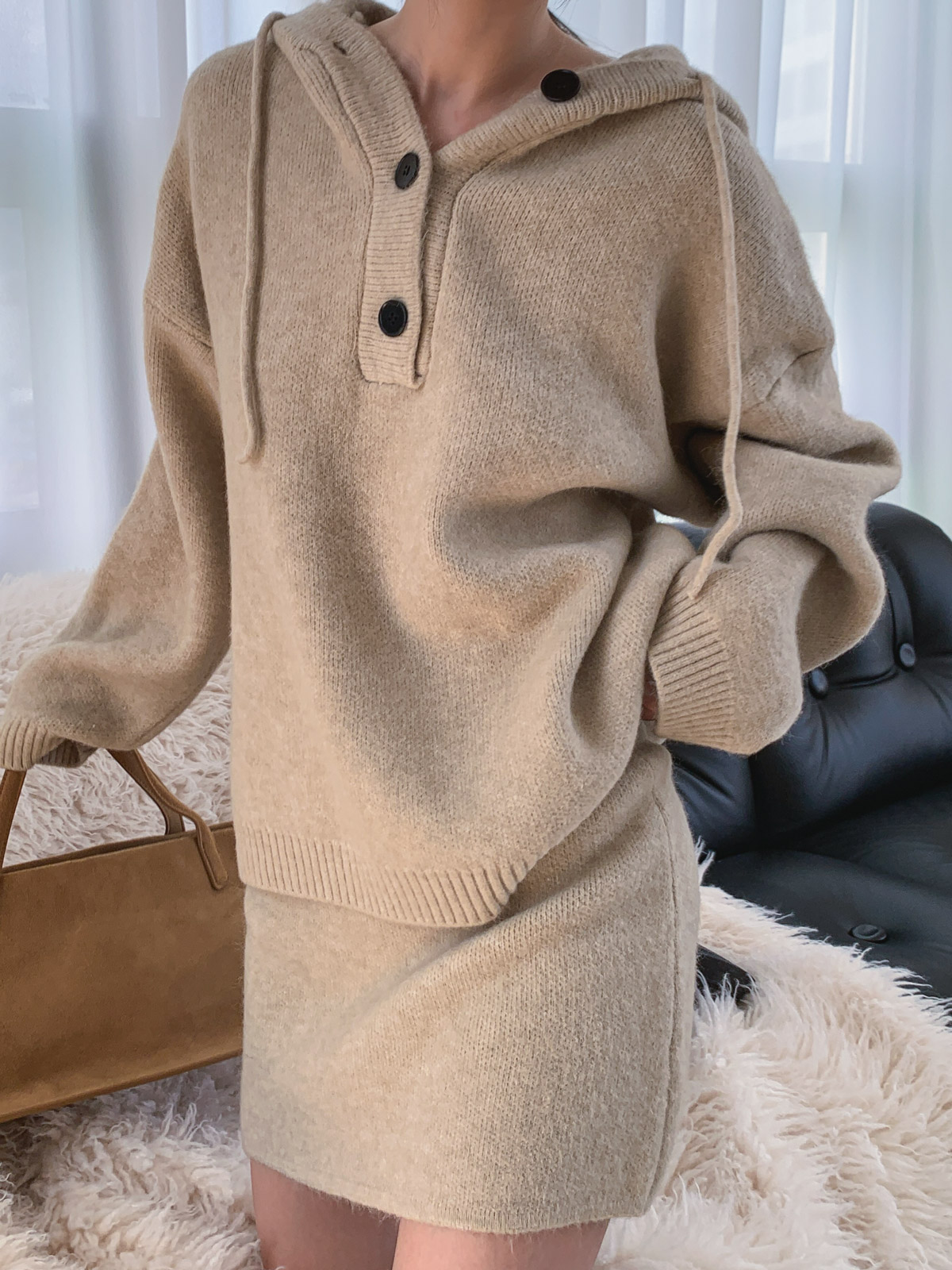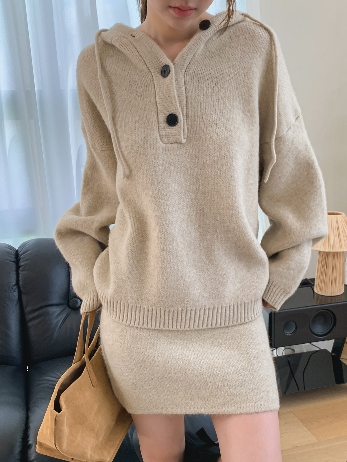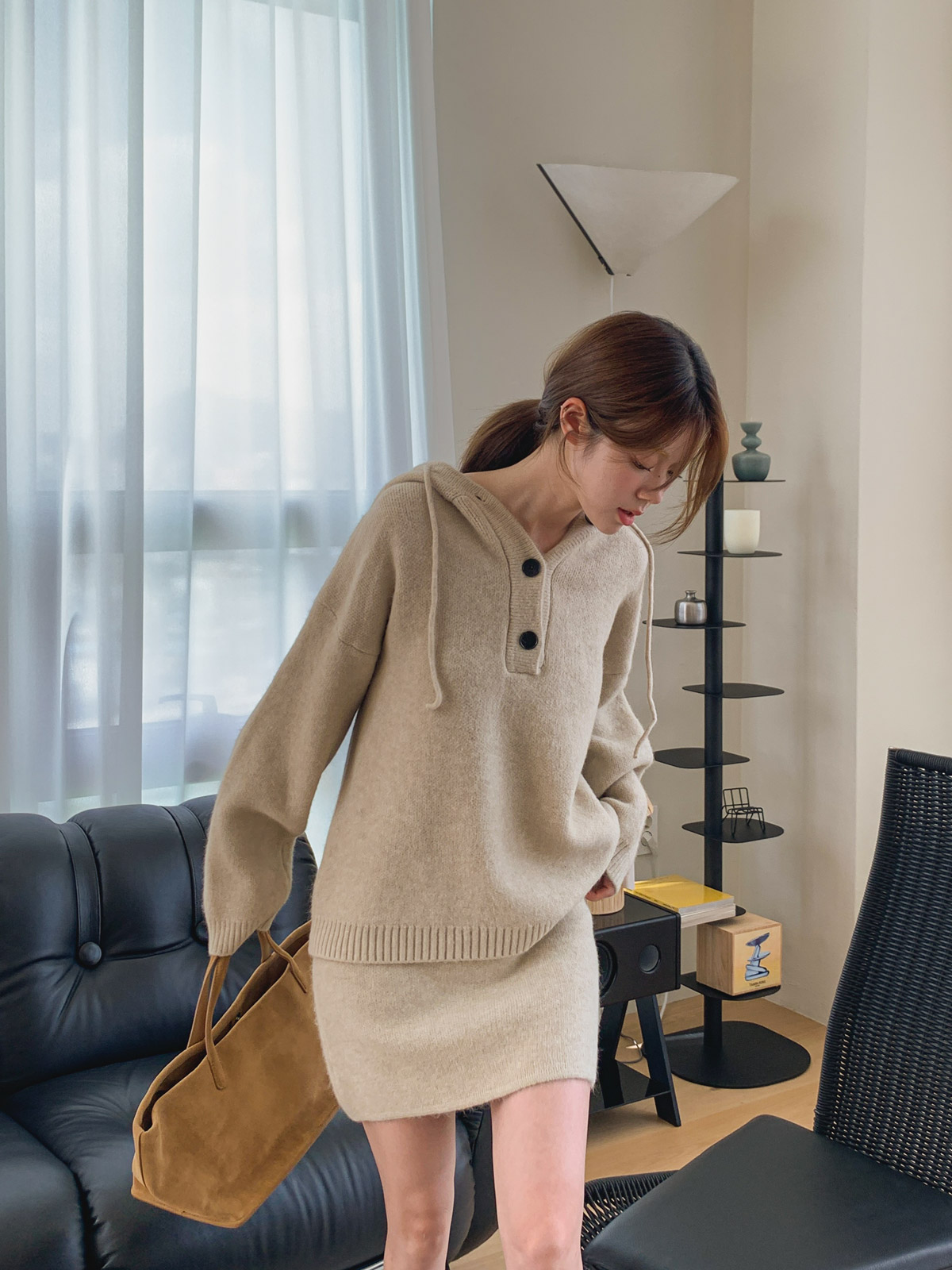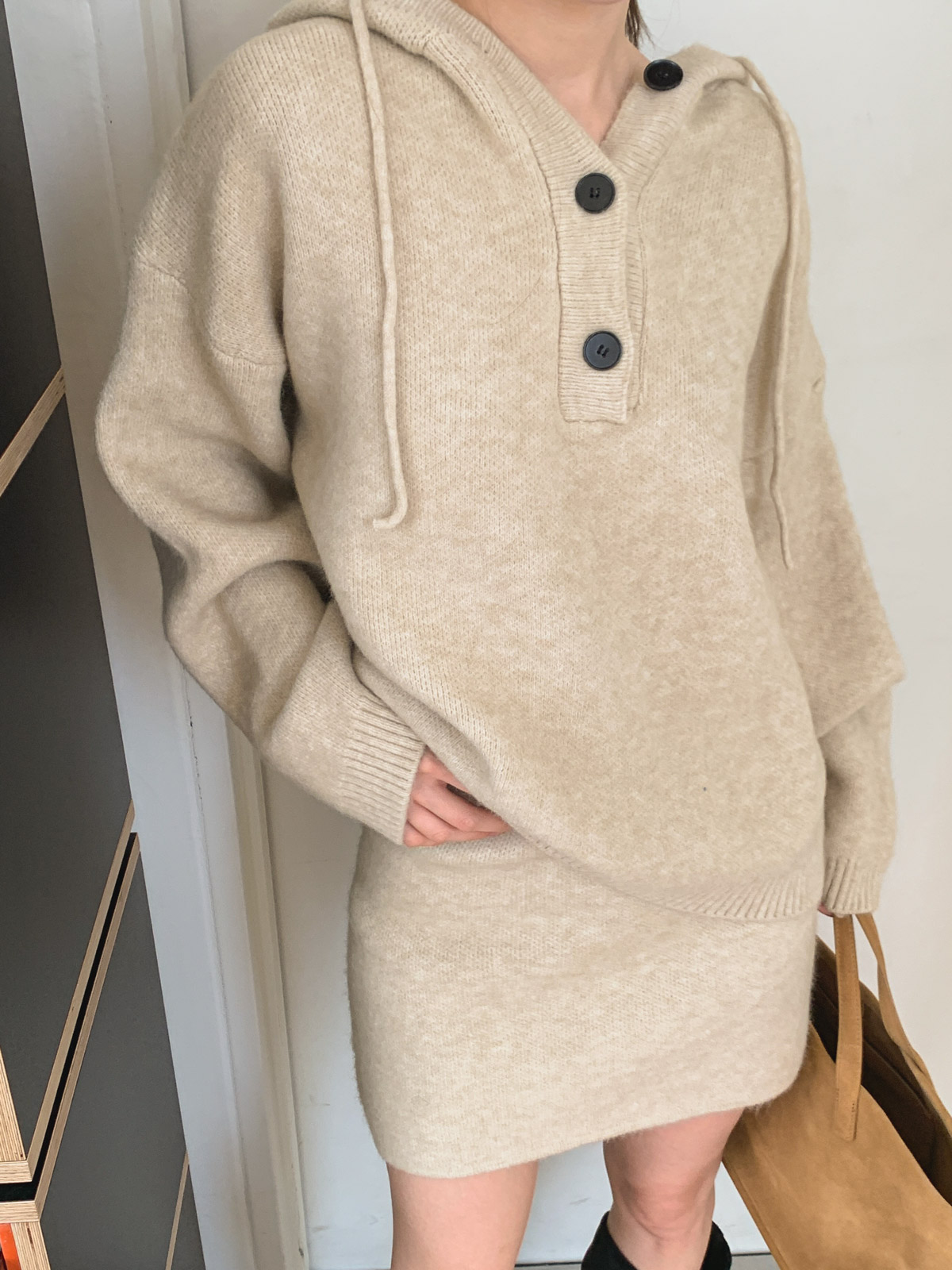SET3826K58-드올라 쓰리 버튼 후드 니트 미니 스커트 세트