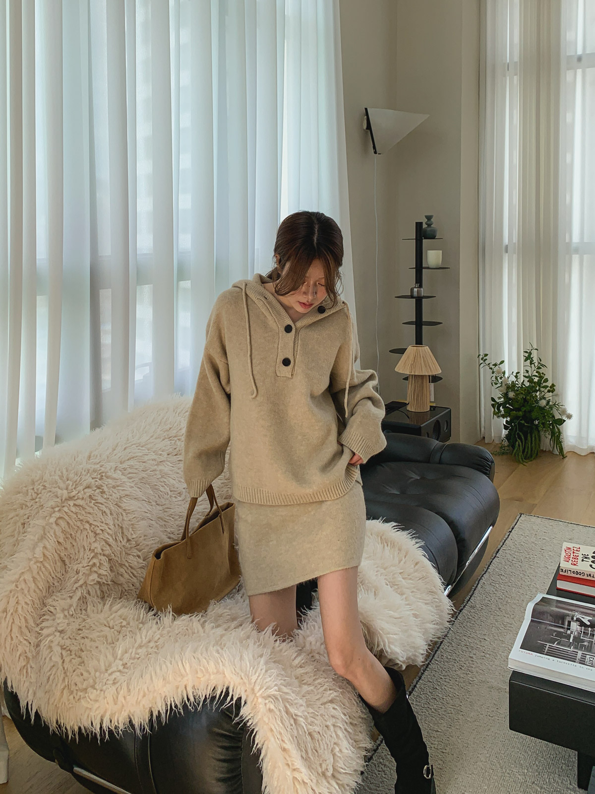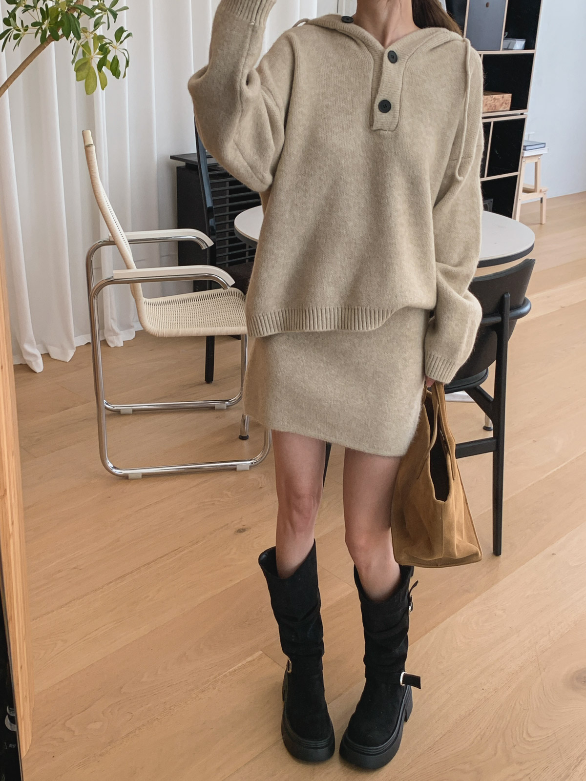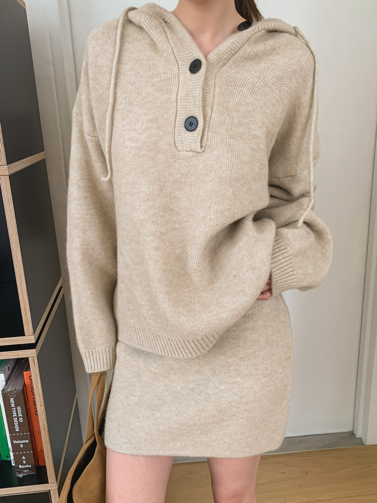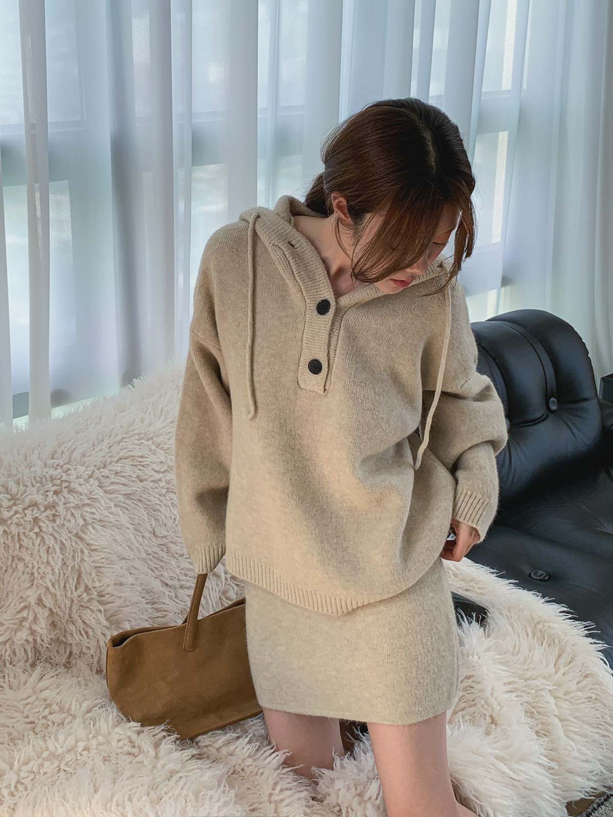 SET3826K58-드올라 쓰리 버튼 후드 니트 미니 스커트 세트