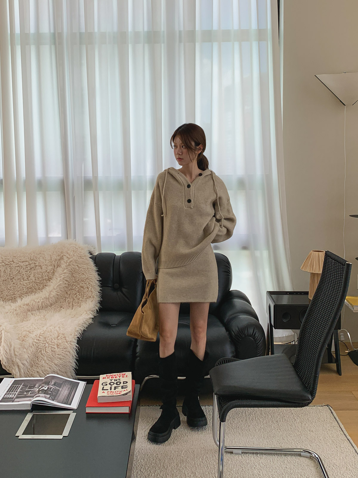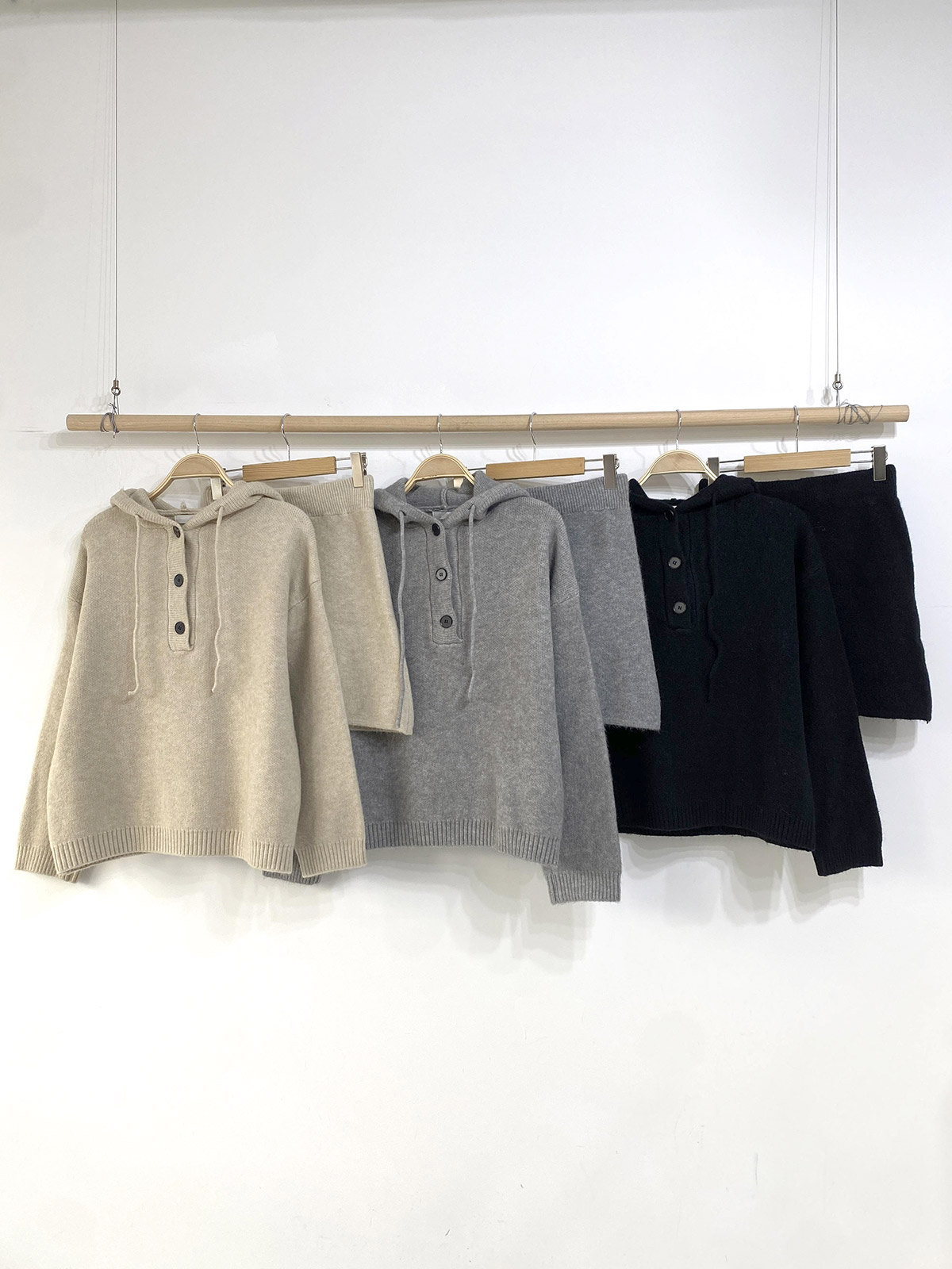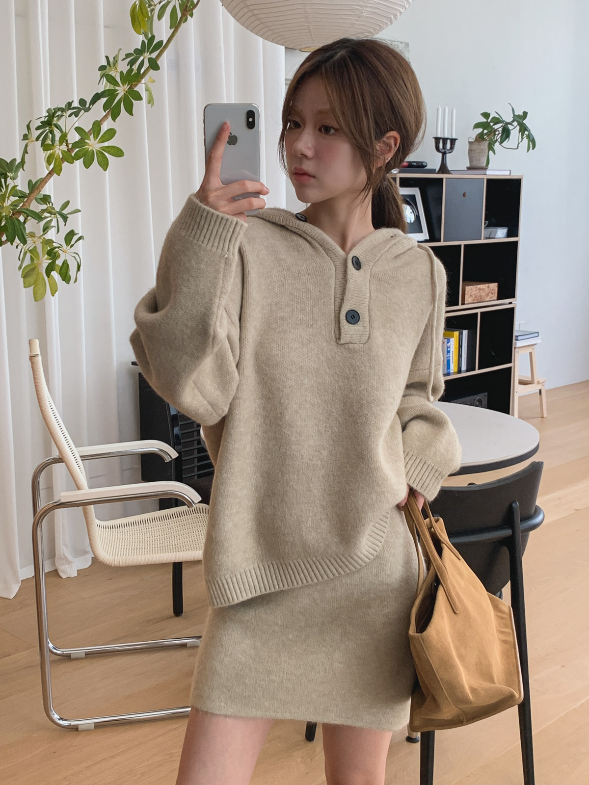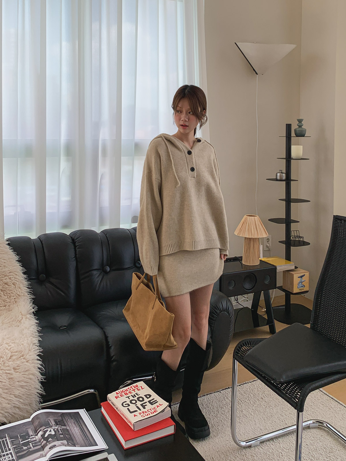 SET3826K58-드올라 쓰리 버튼 후드 니트 미니 스커트 세트