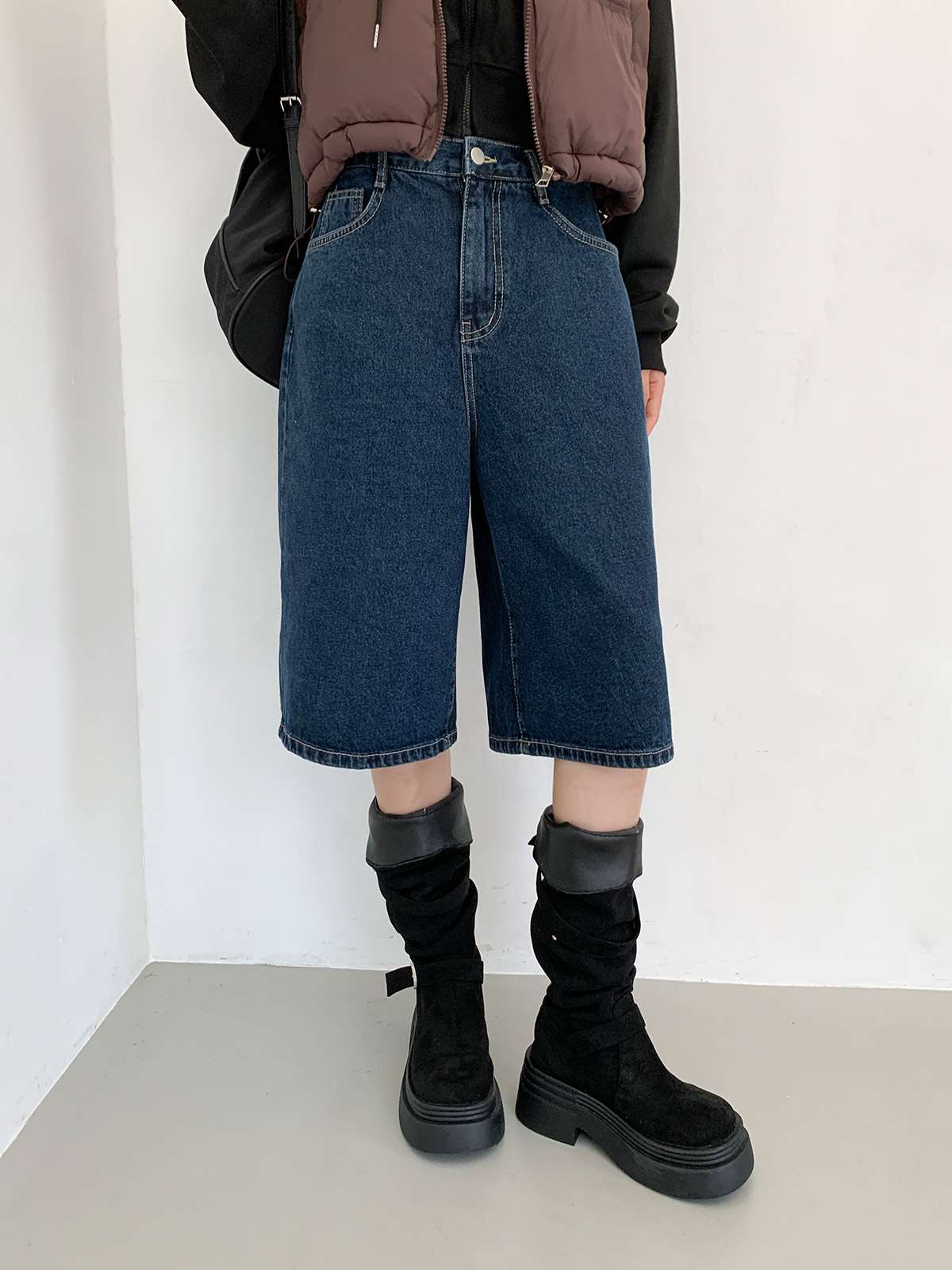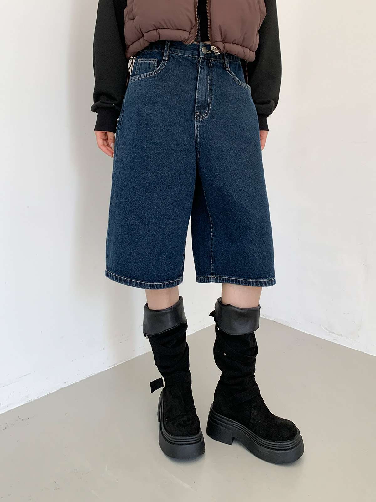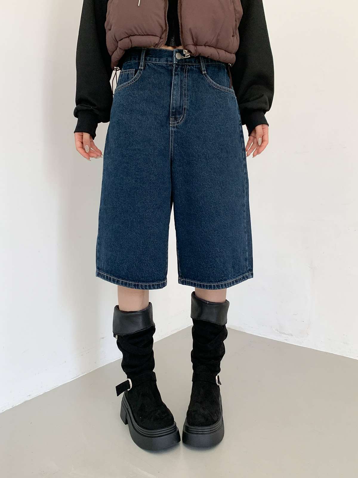 와이드한 통으로 편안하게 착용할 수 있는 빈티지한 무드의 데님 버뮤다 팬츠