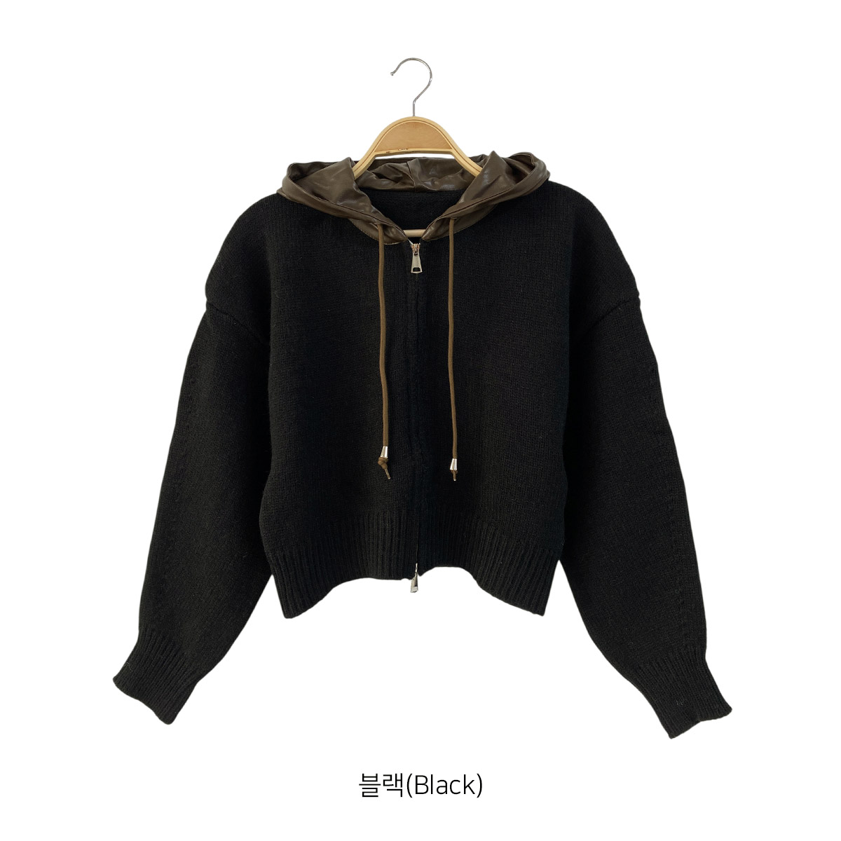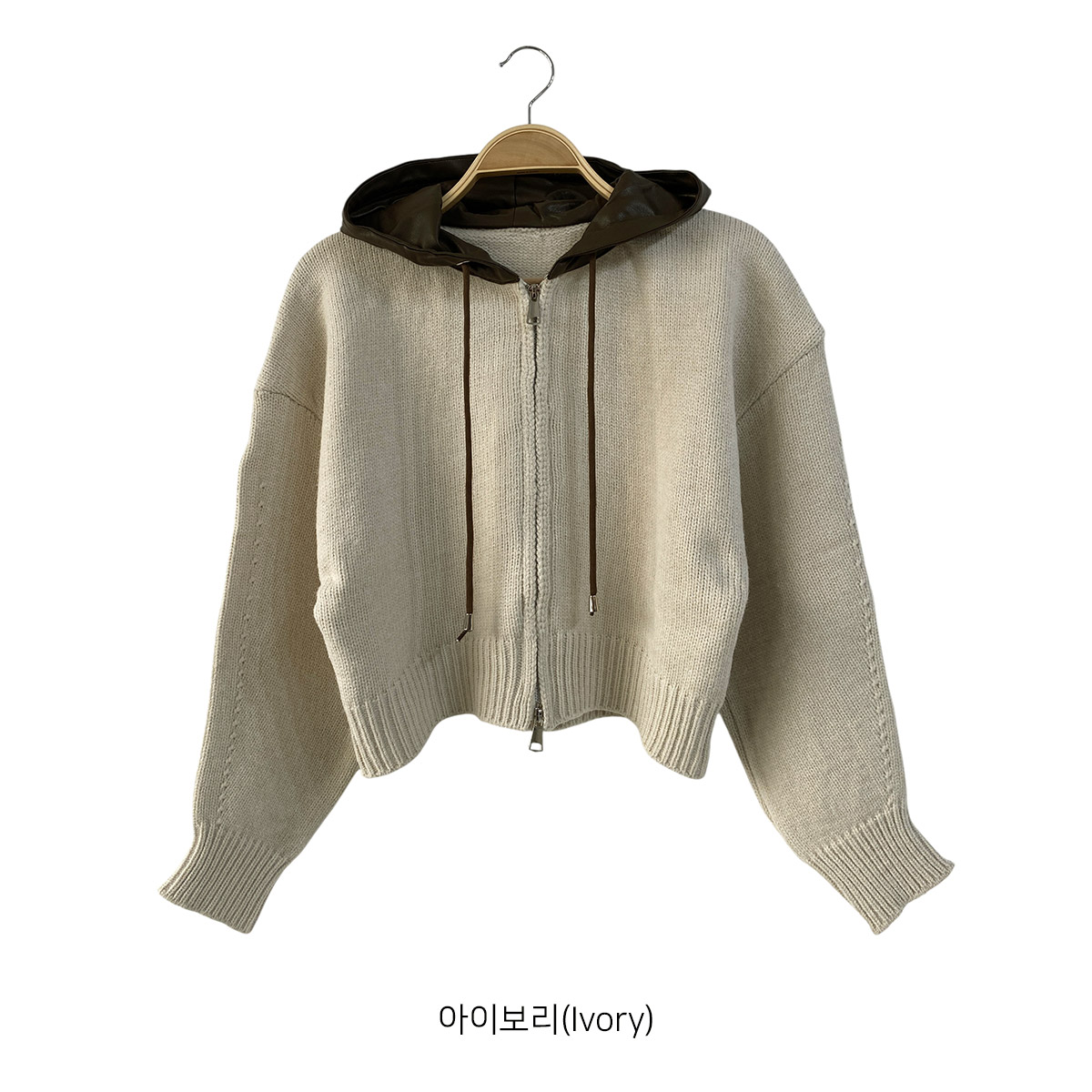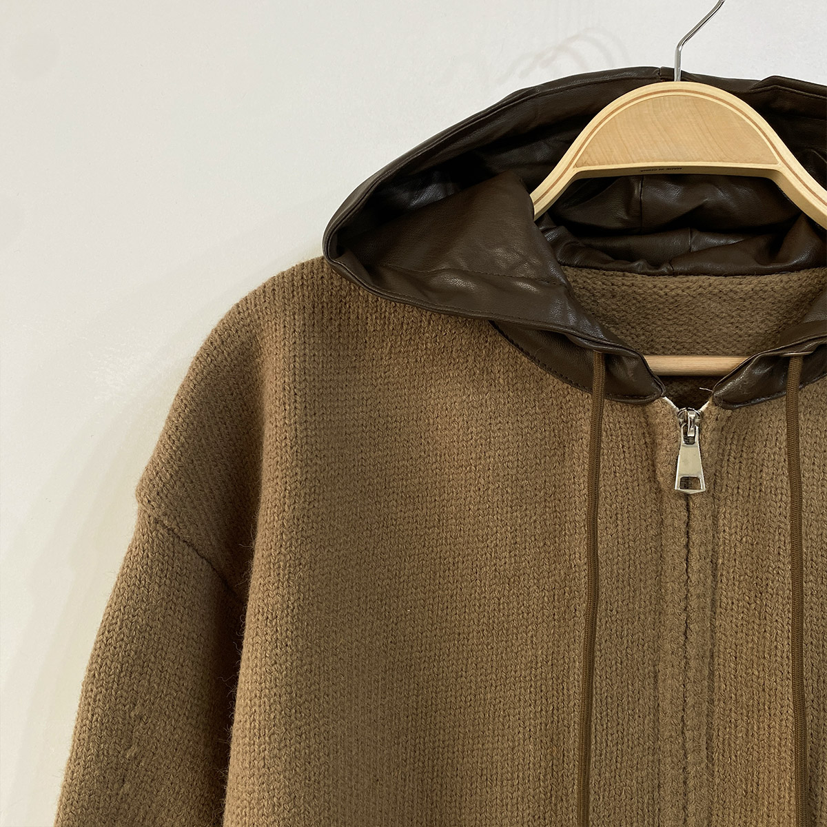 부드러운 니트 소재에 유니크한 레더 배색이 돋보이는 후드 집업