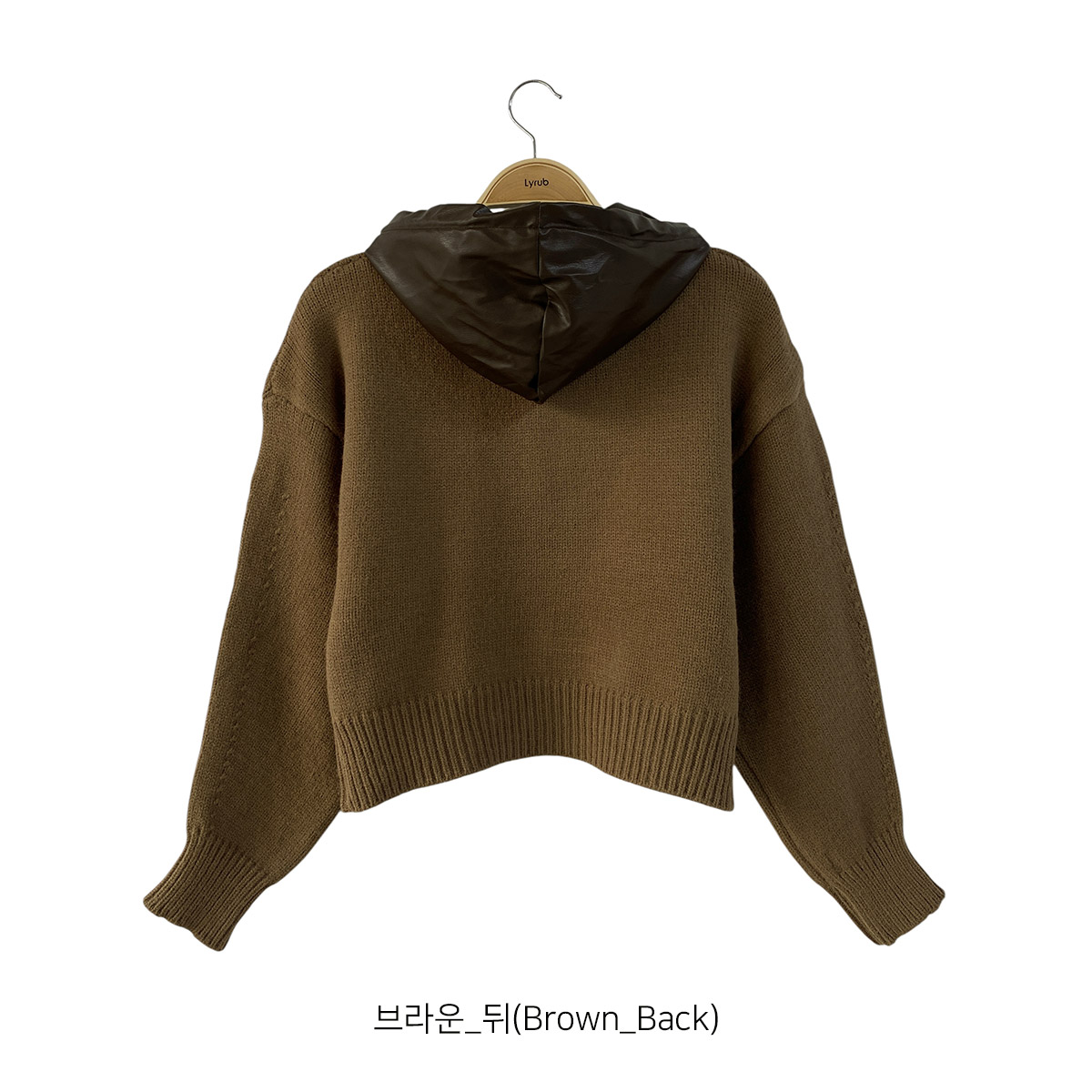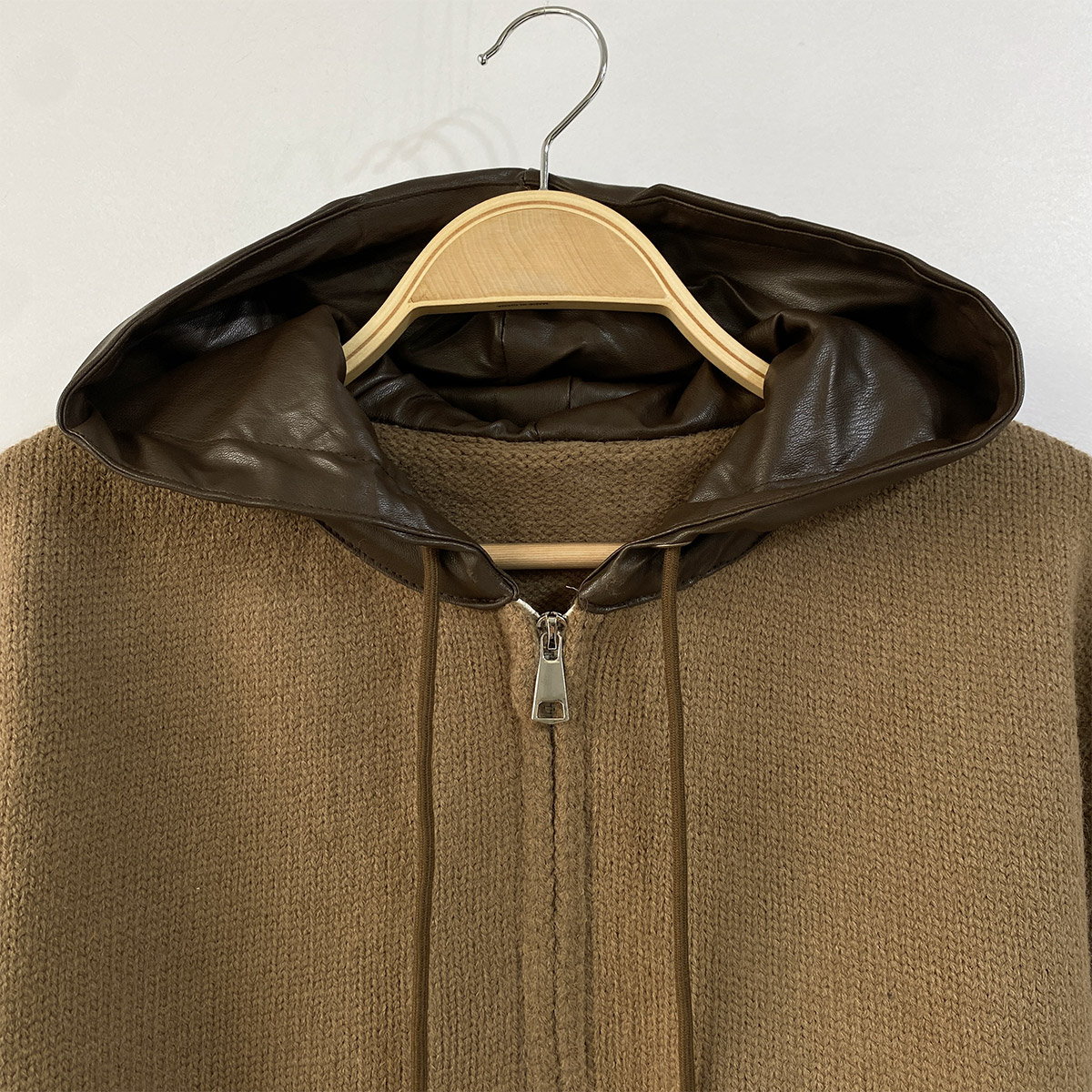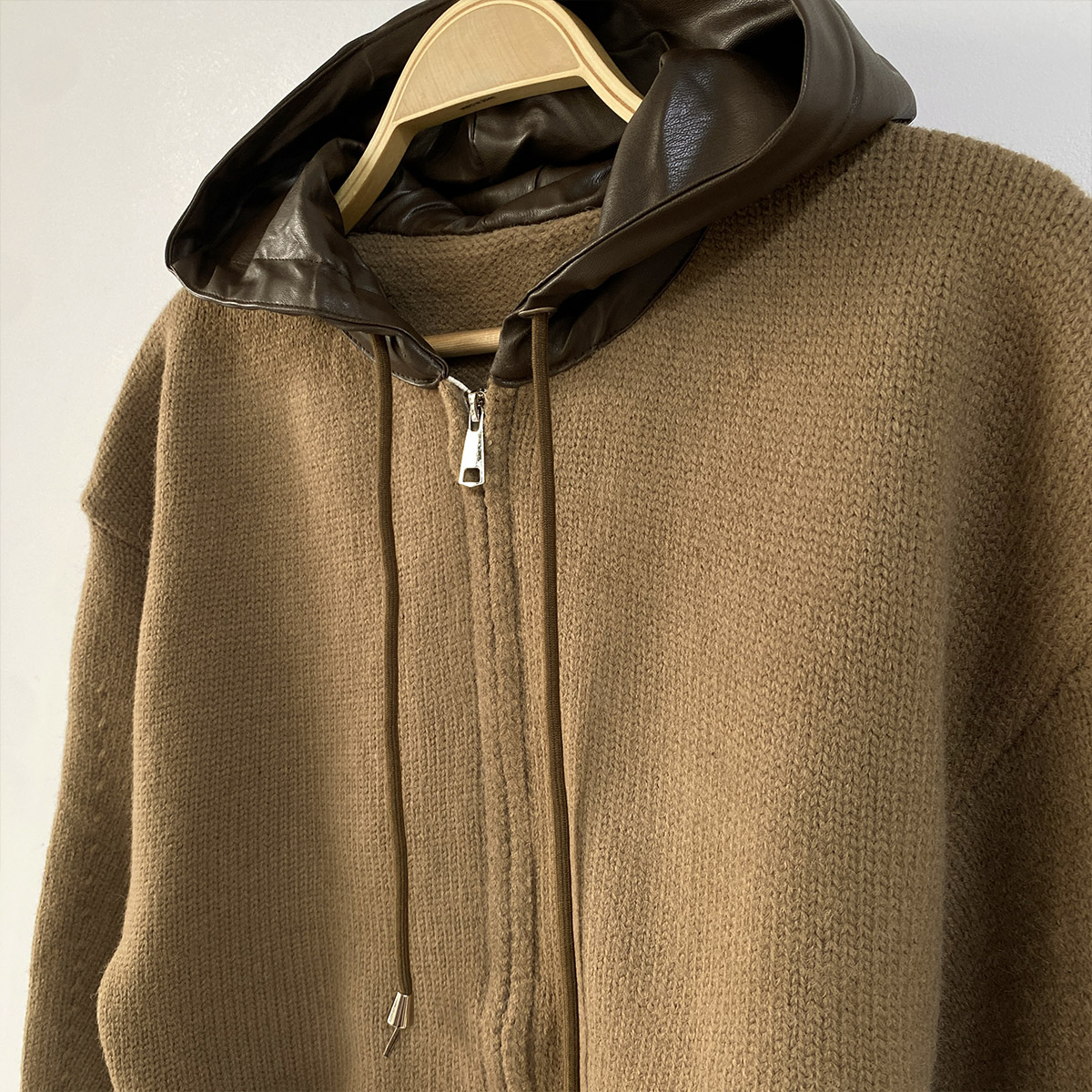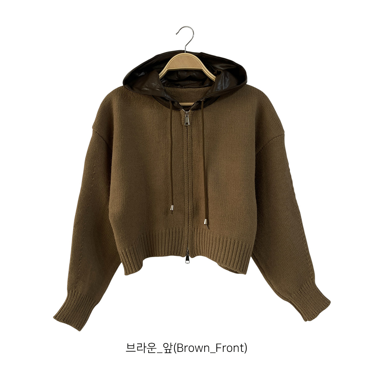 부드러운 니트 소재에 유니크한 레더 배색이 돋보이는 후드 집업