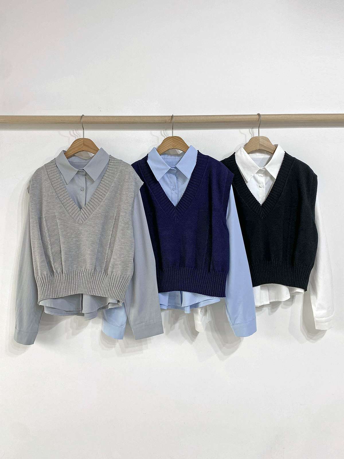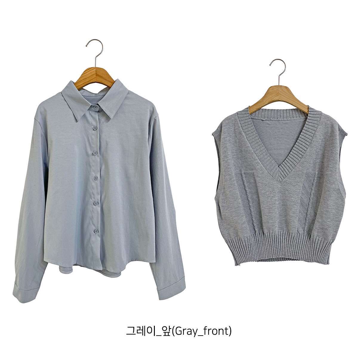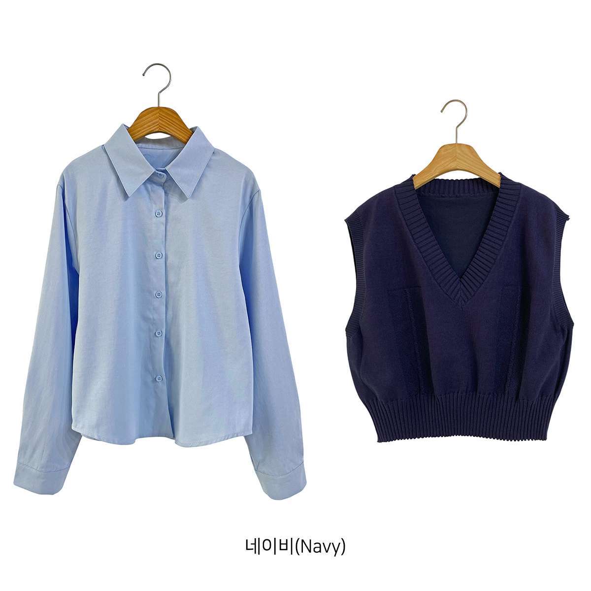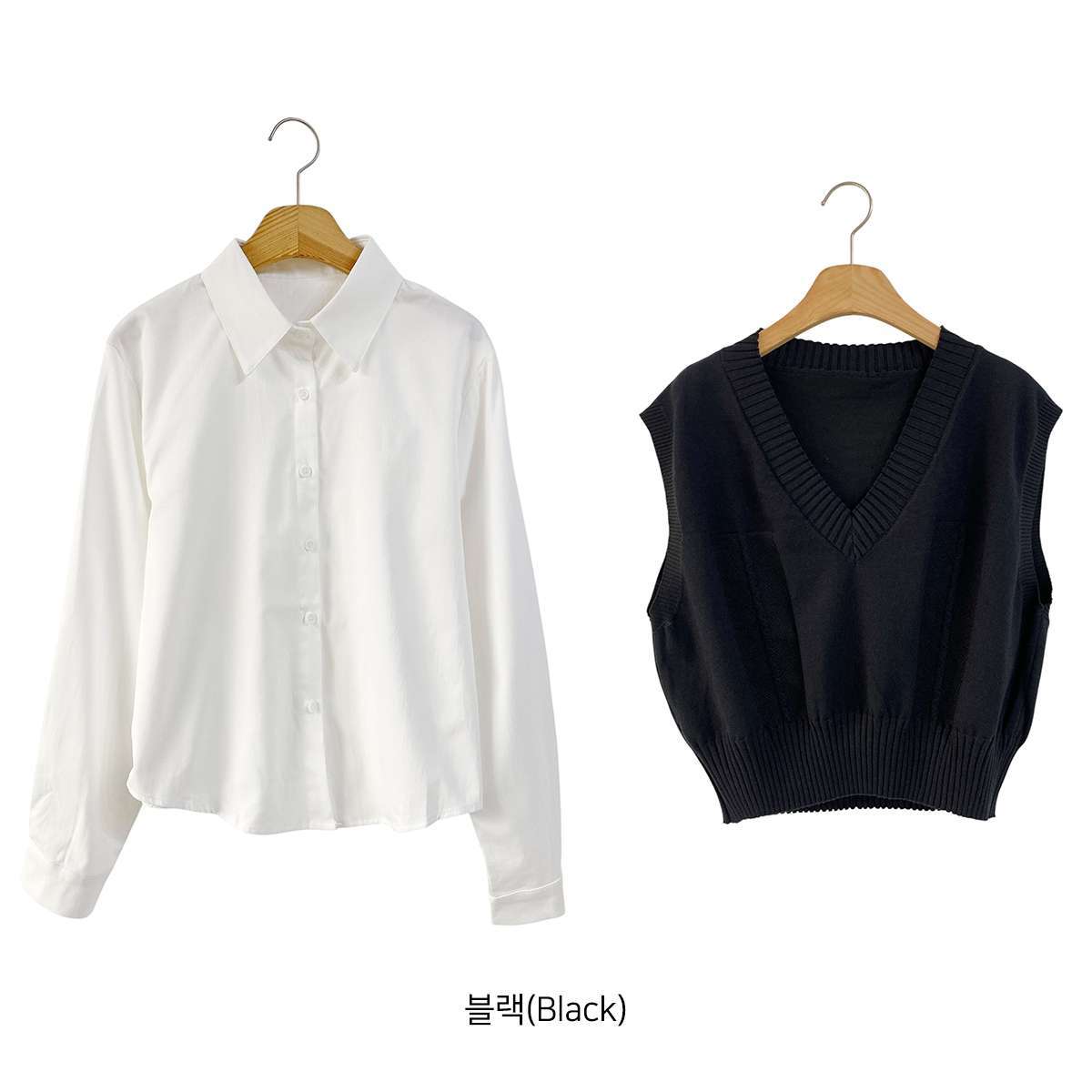 [ SET3829K58-큐에븐 브이넥 크롭 니트 조끼 베이직 셔츠 세트 ]