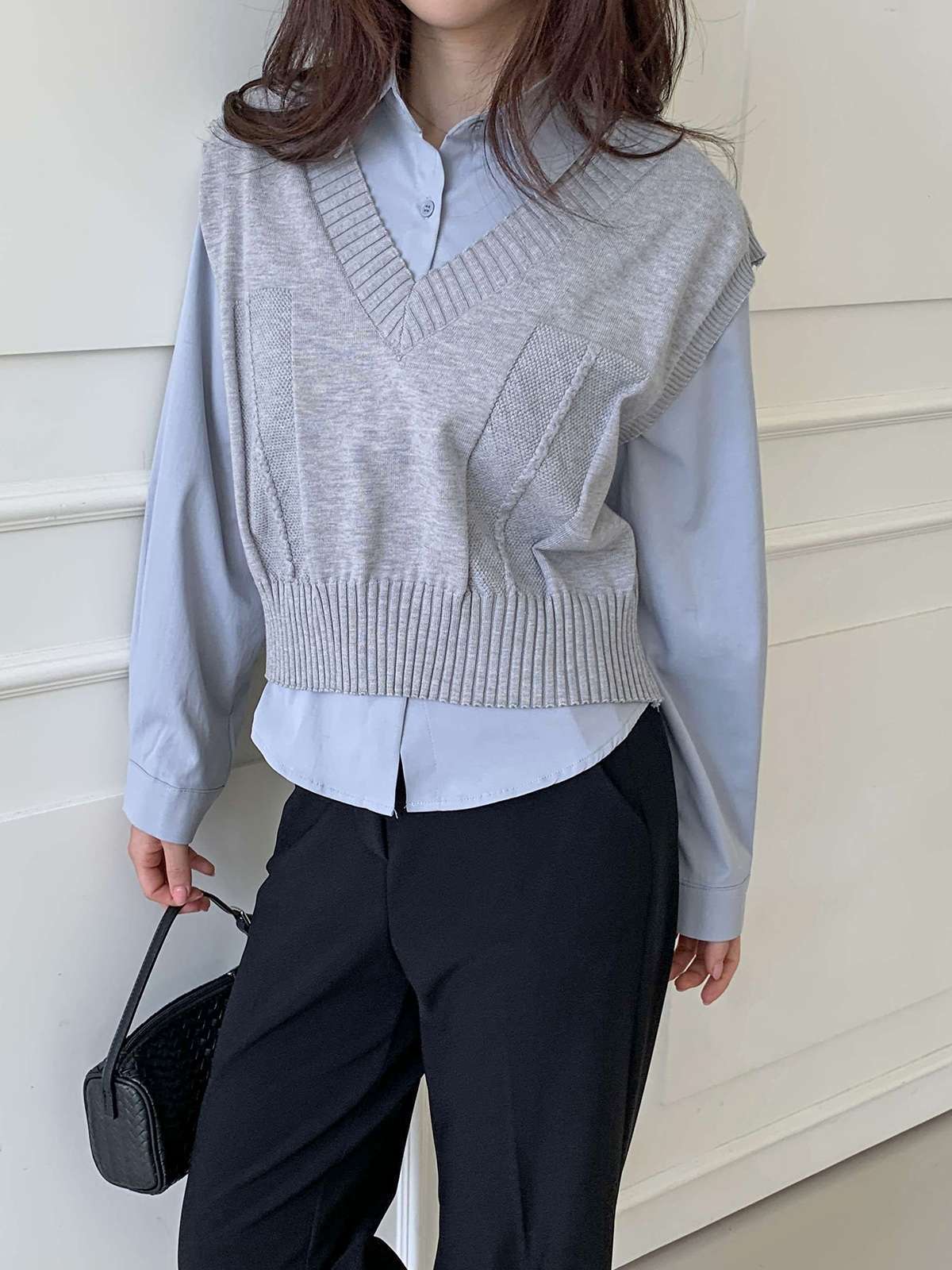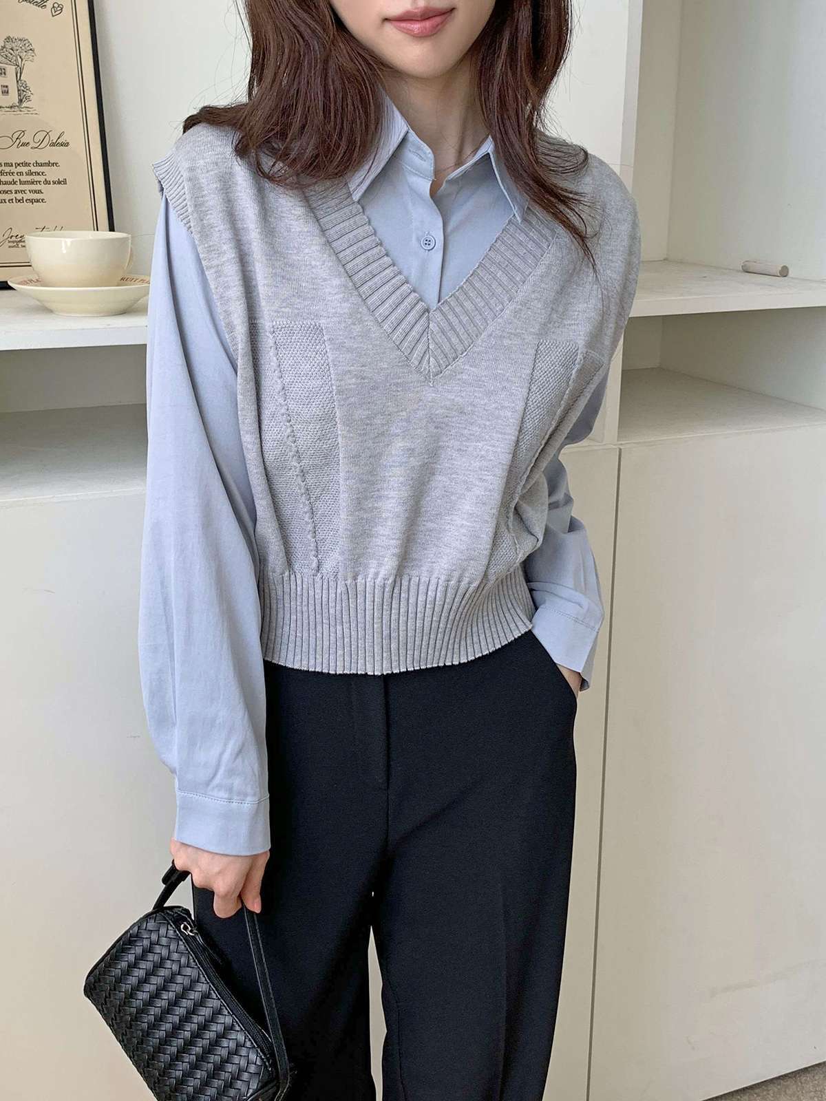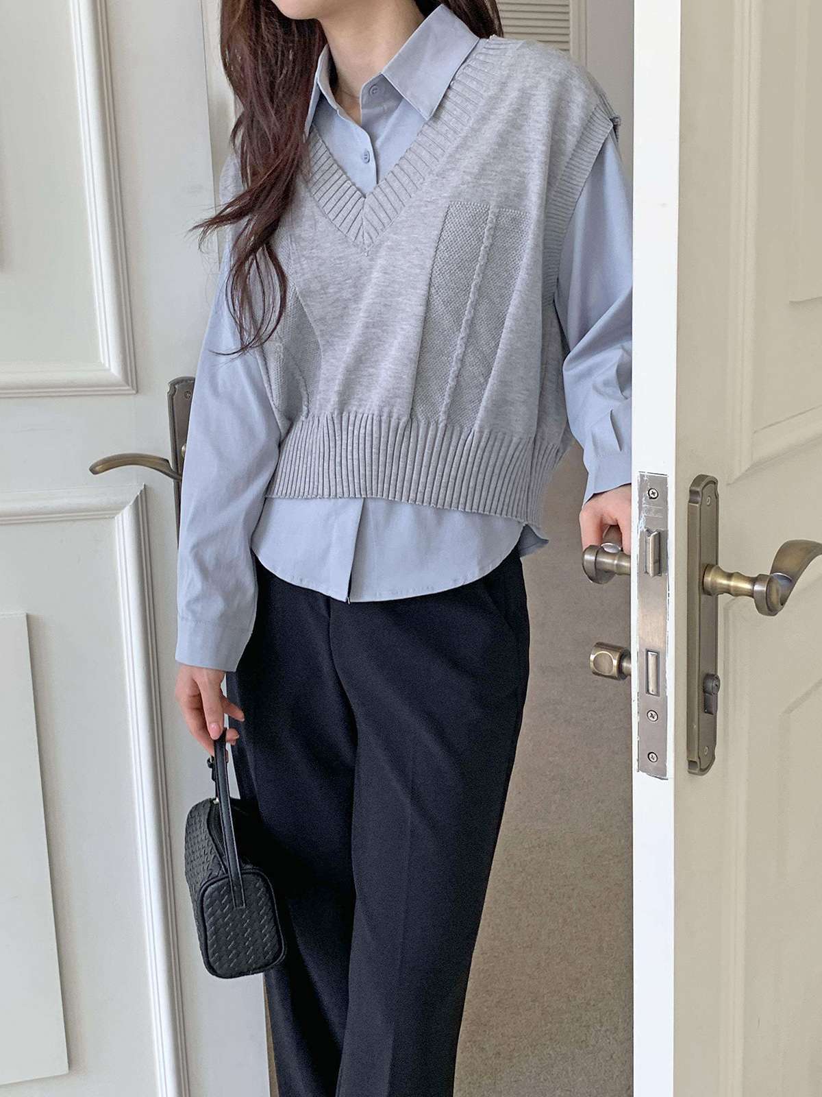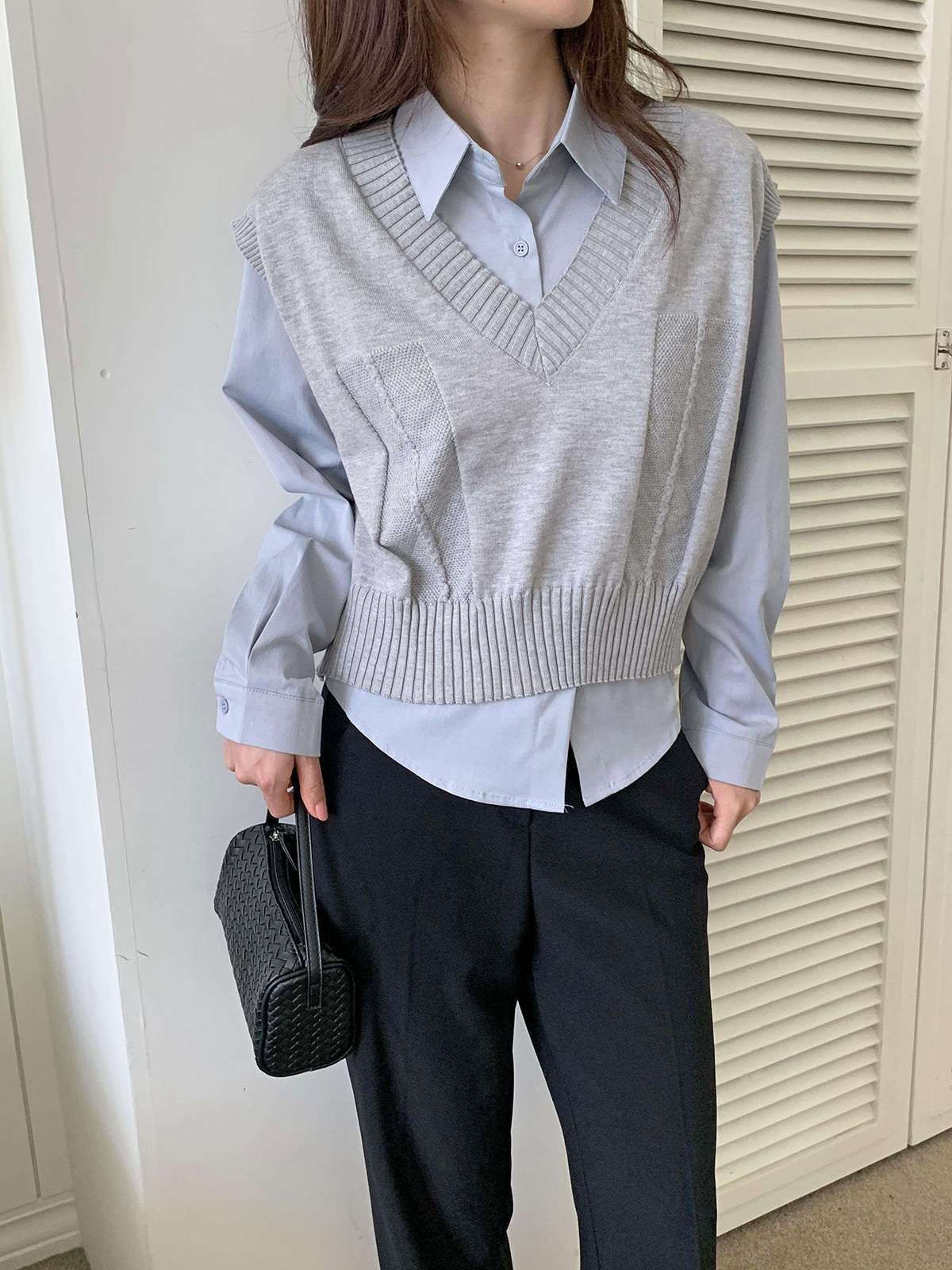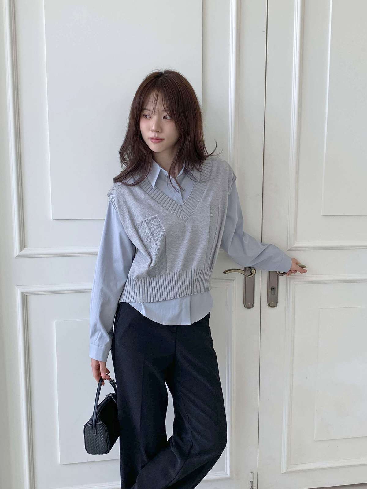 베이직한 셔츠 위에 브이넥 니트 베스트가 레이어드된
