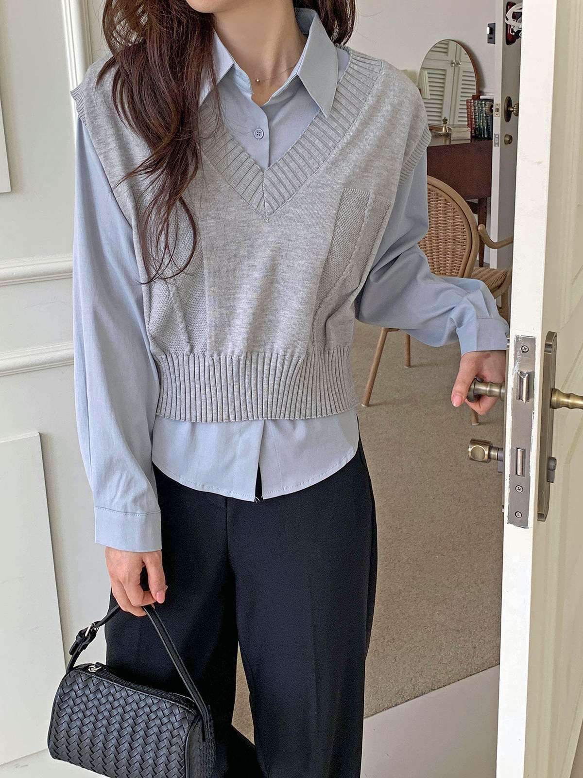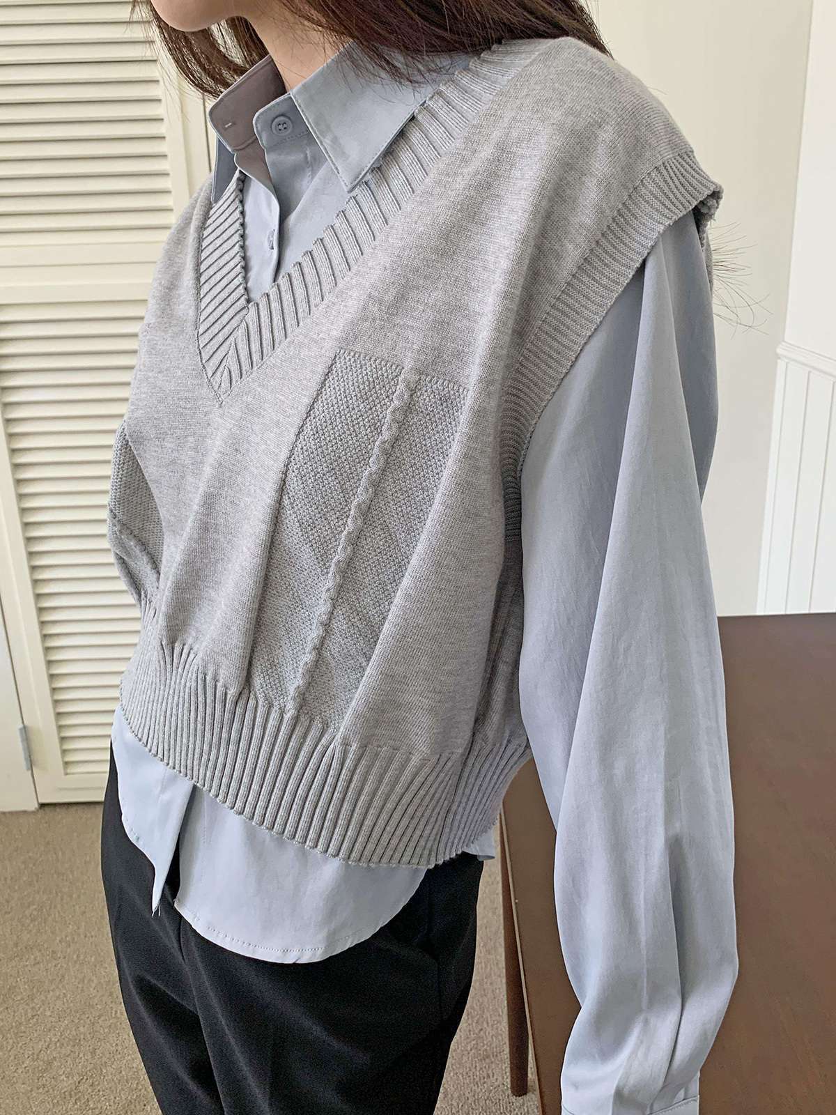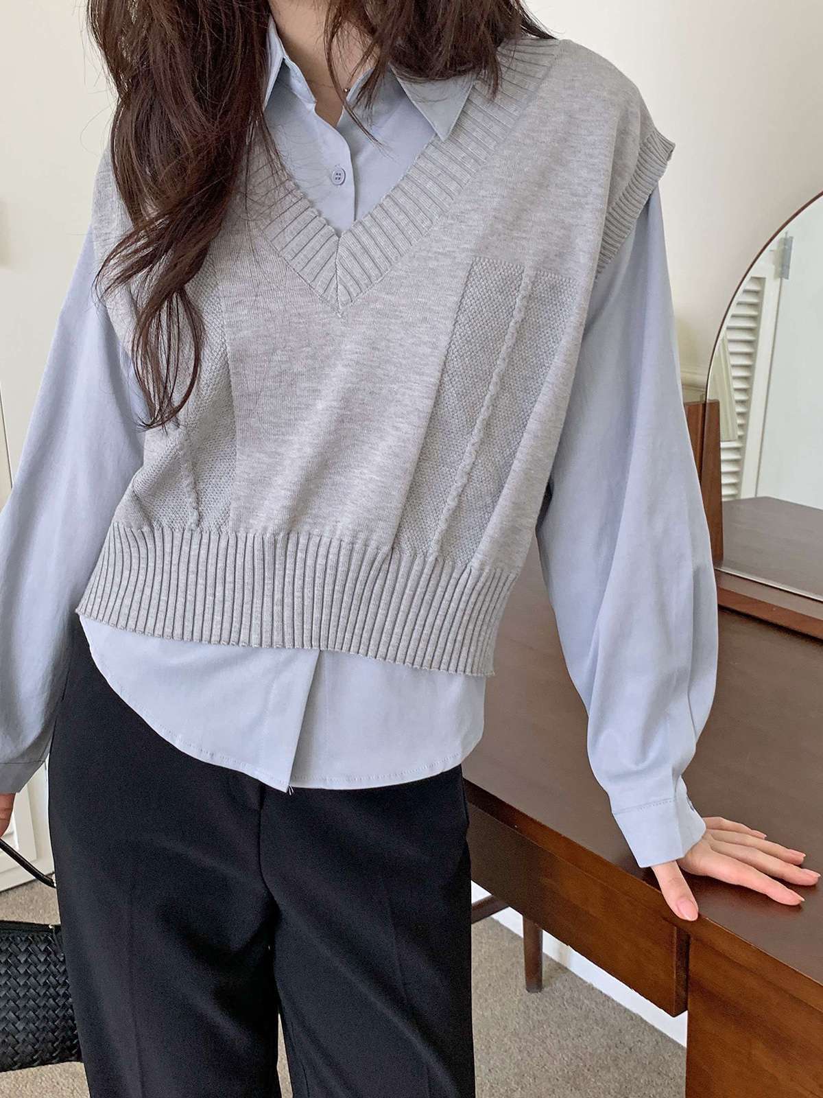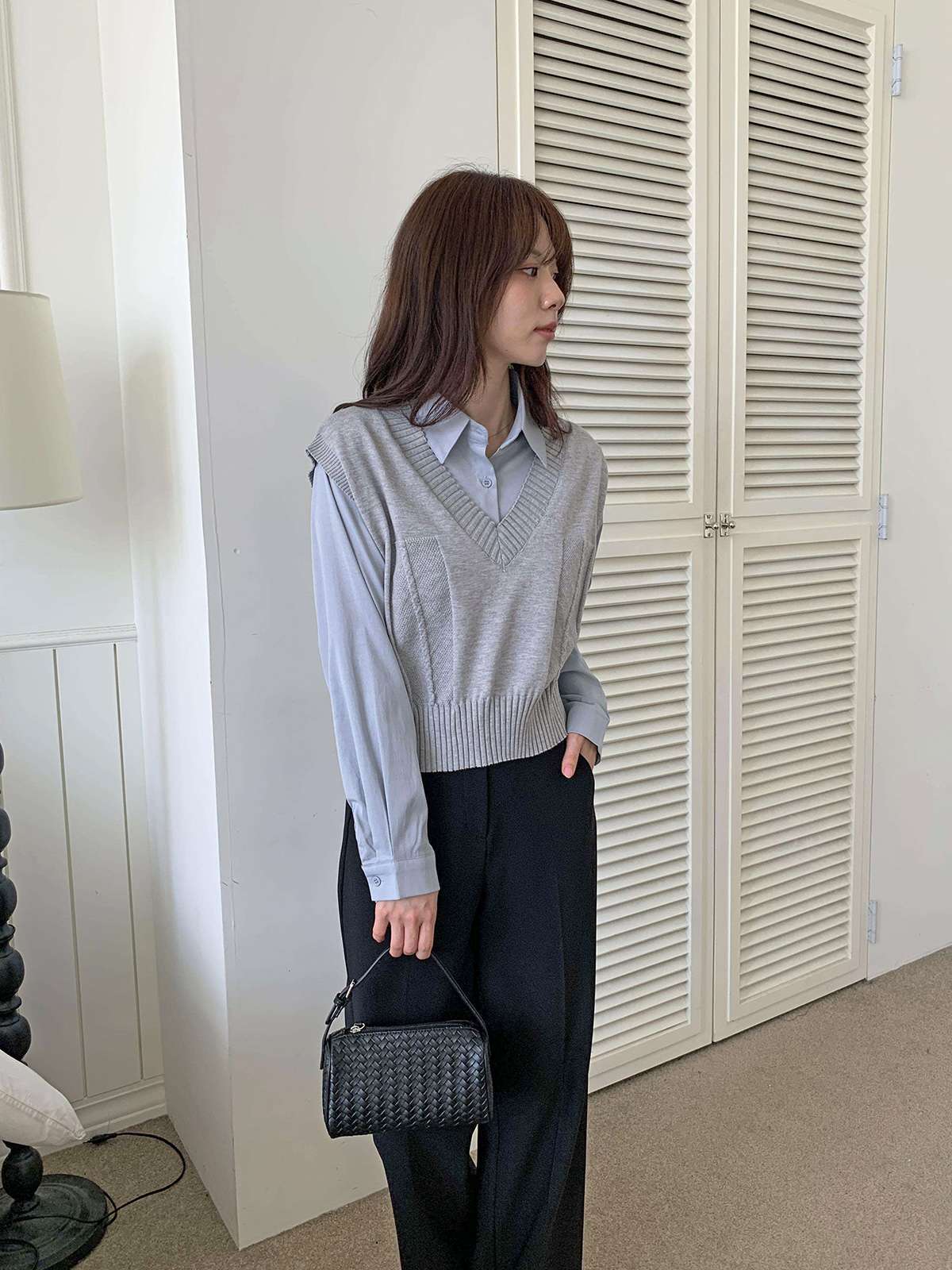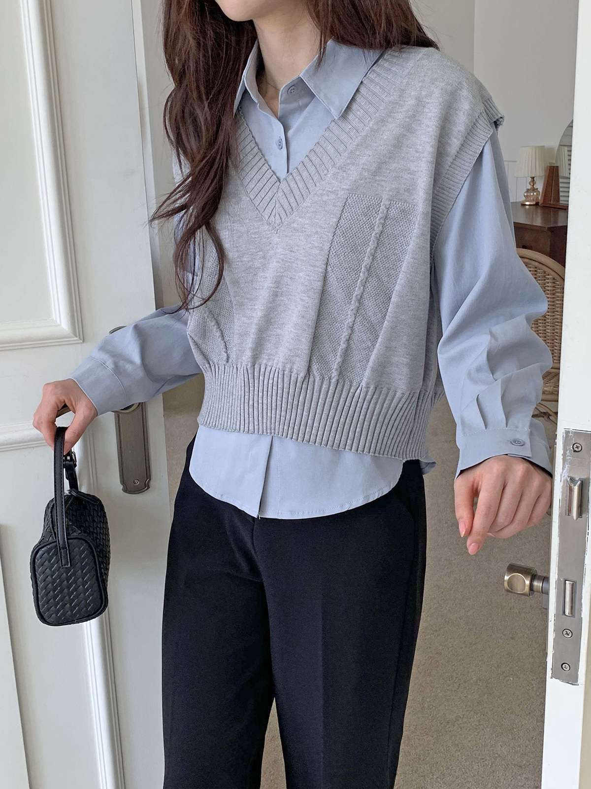 베이직한 셔츠 위에 브이넥 니트 베스트가 레이어드된