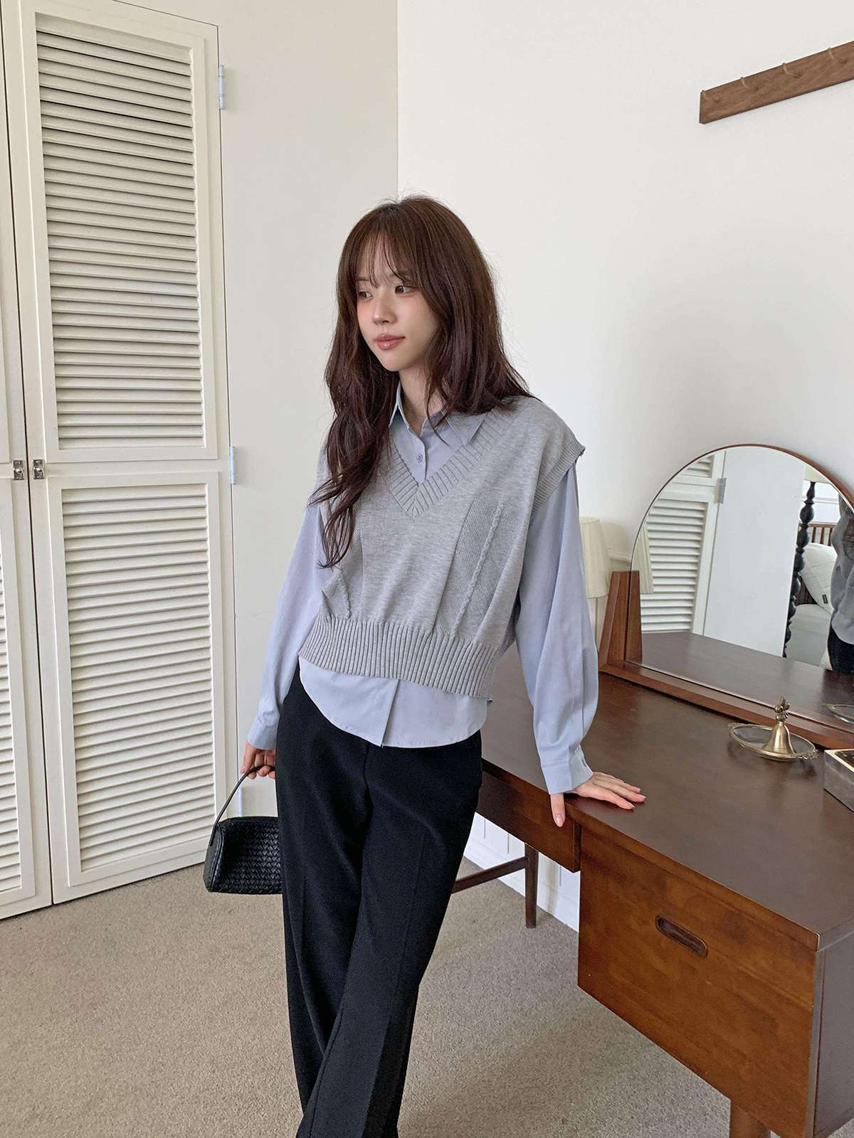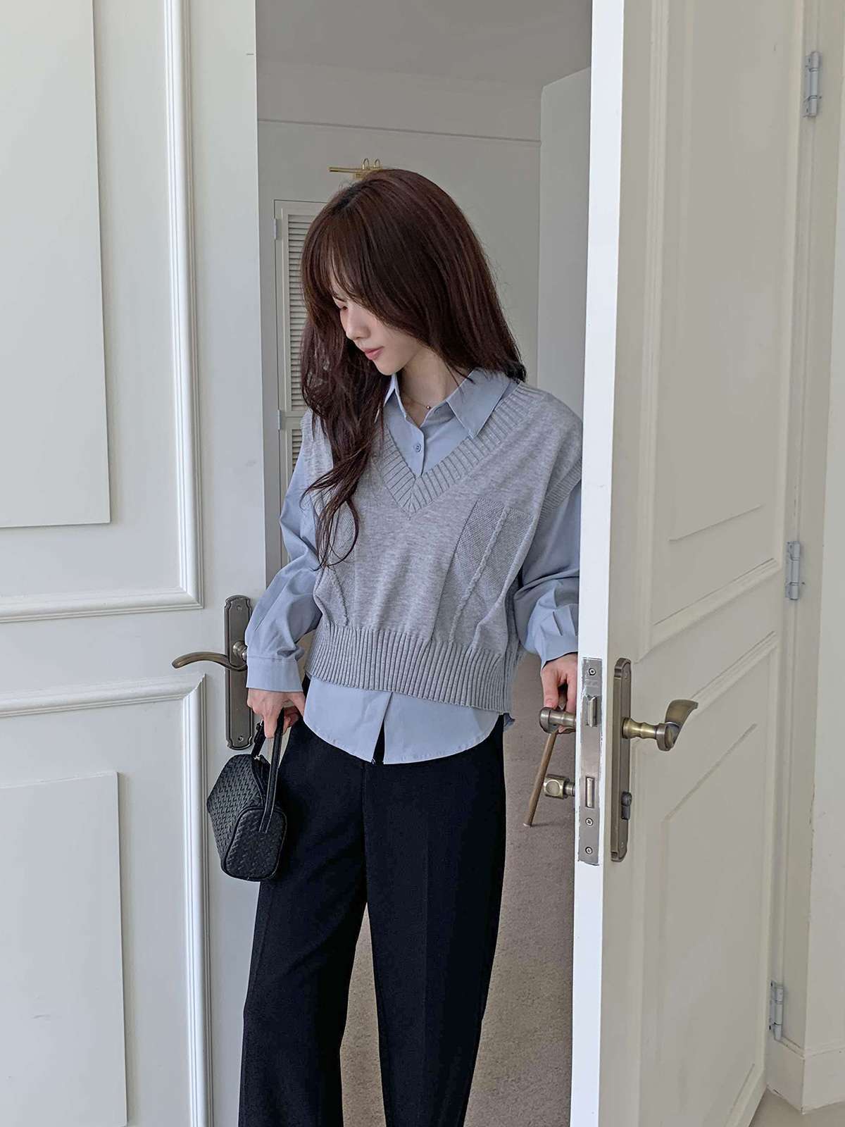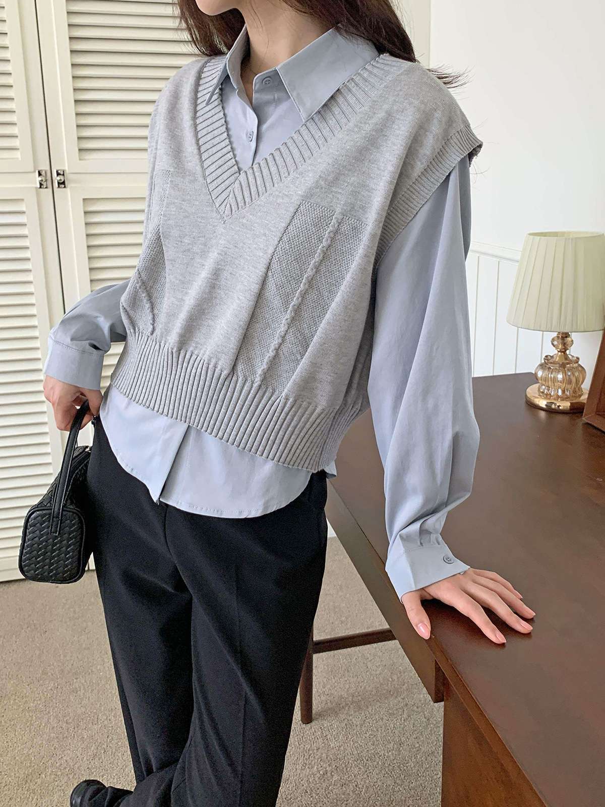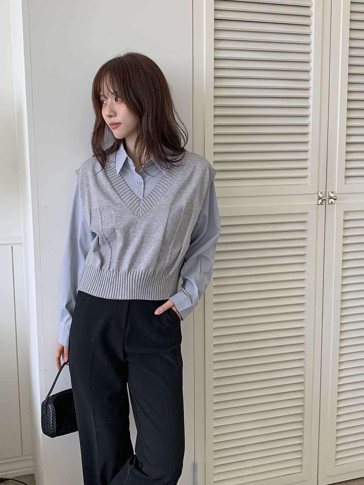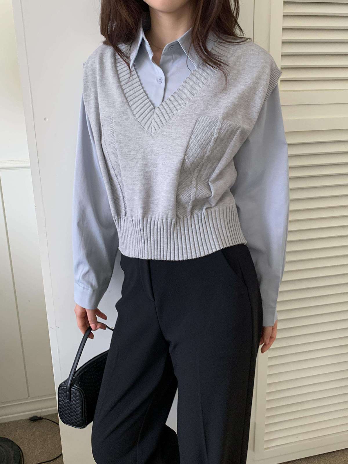 베이직한 셔츠 위에 브이넥 니트 베스트가 레이어드된