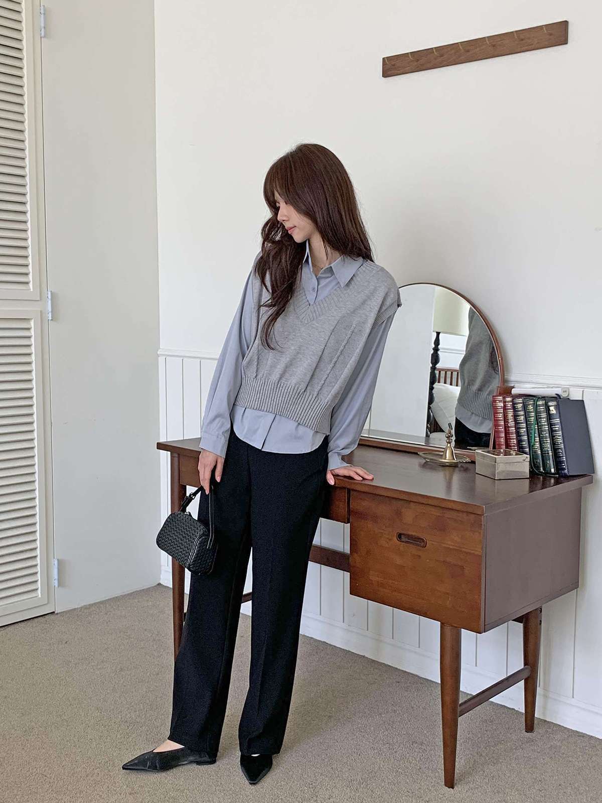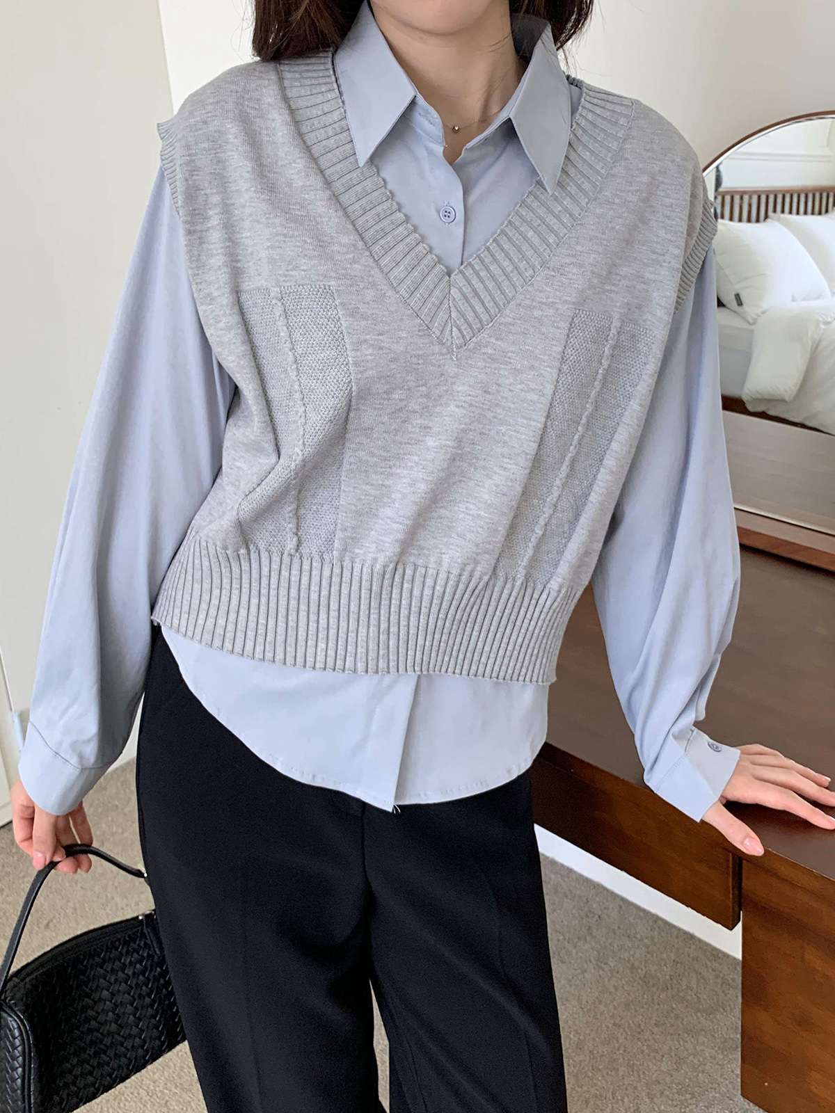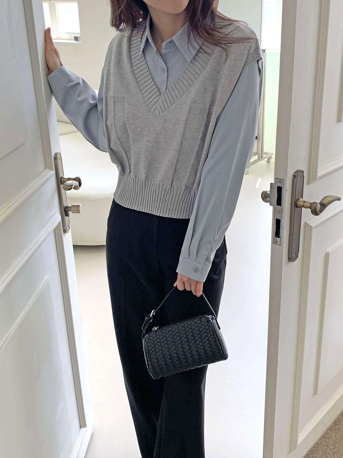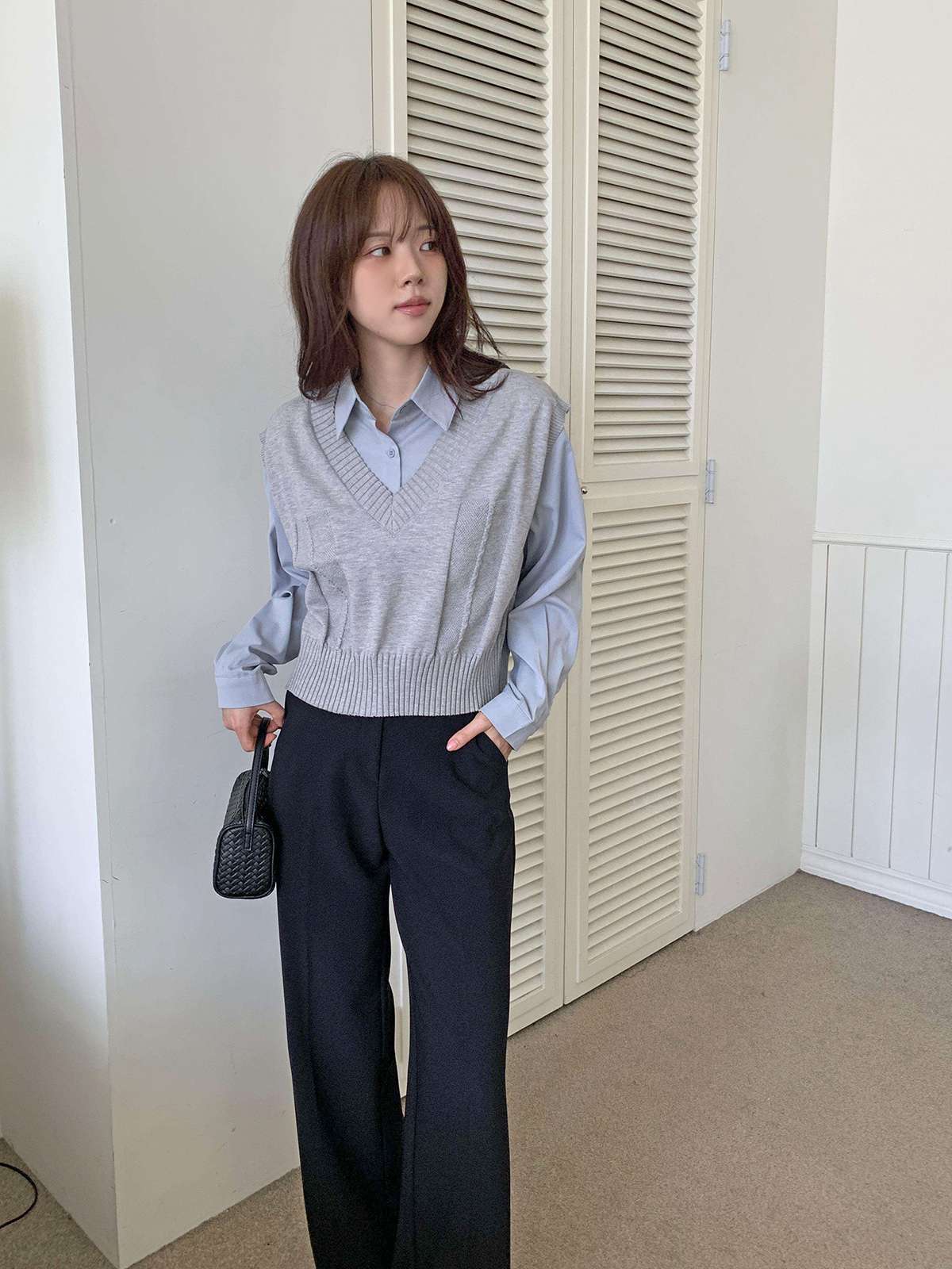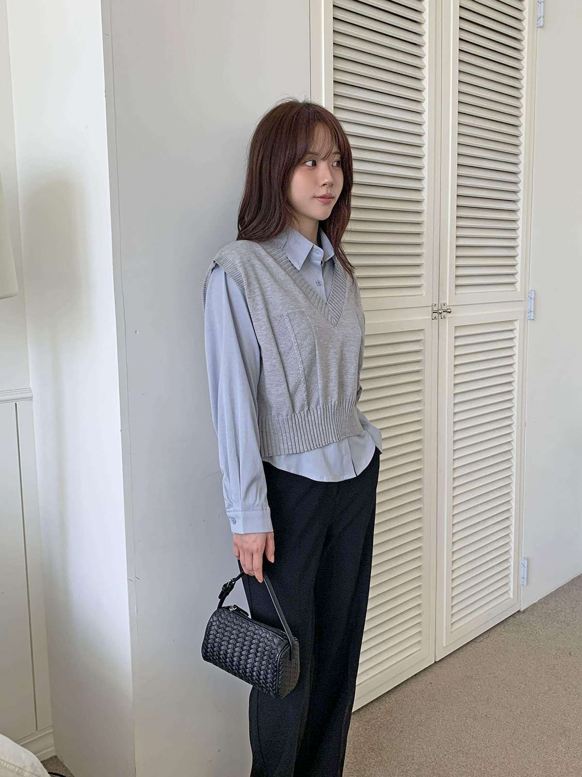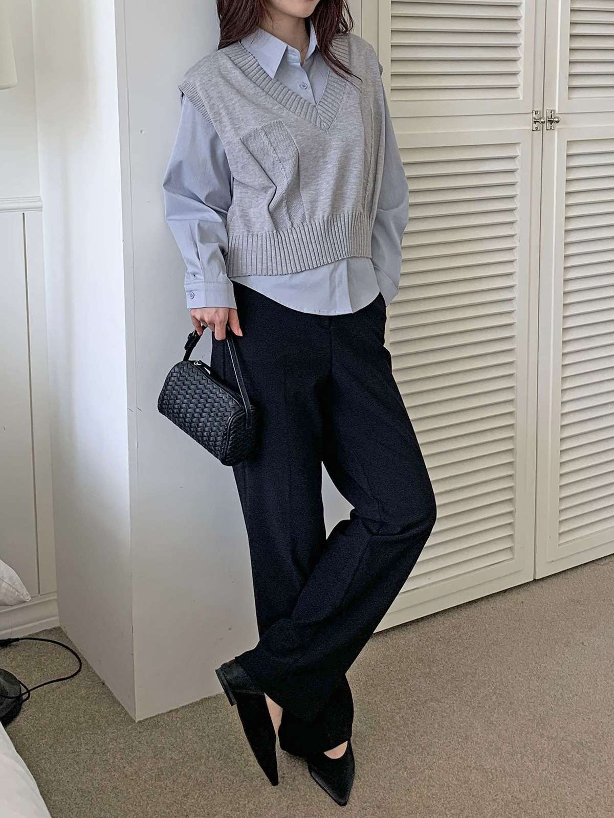 베이직한 셔츠 위에 브이넥 니트 베스트가 레이어드된