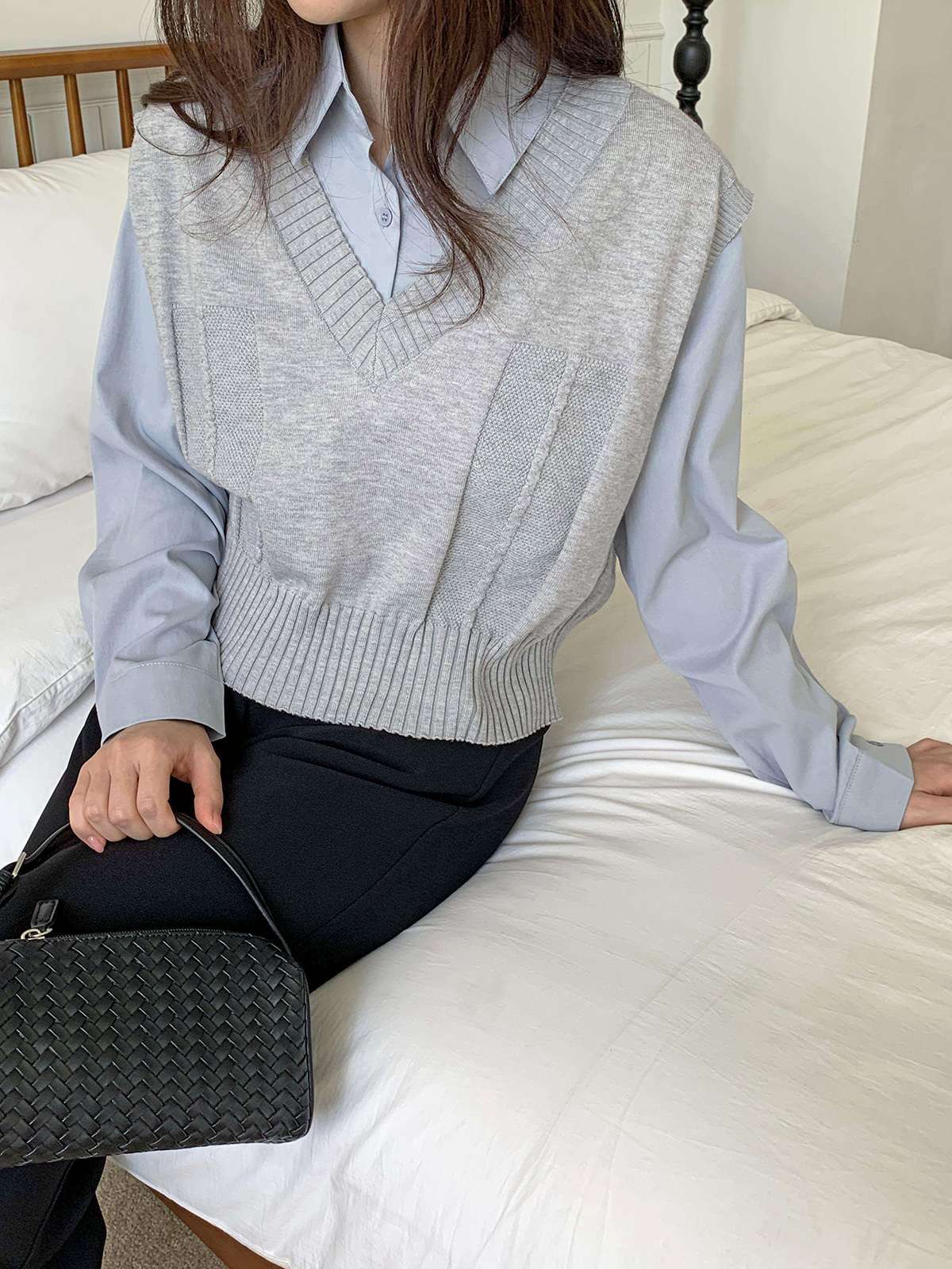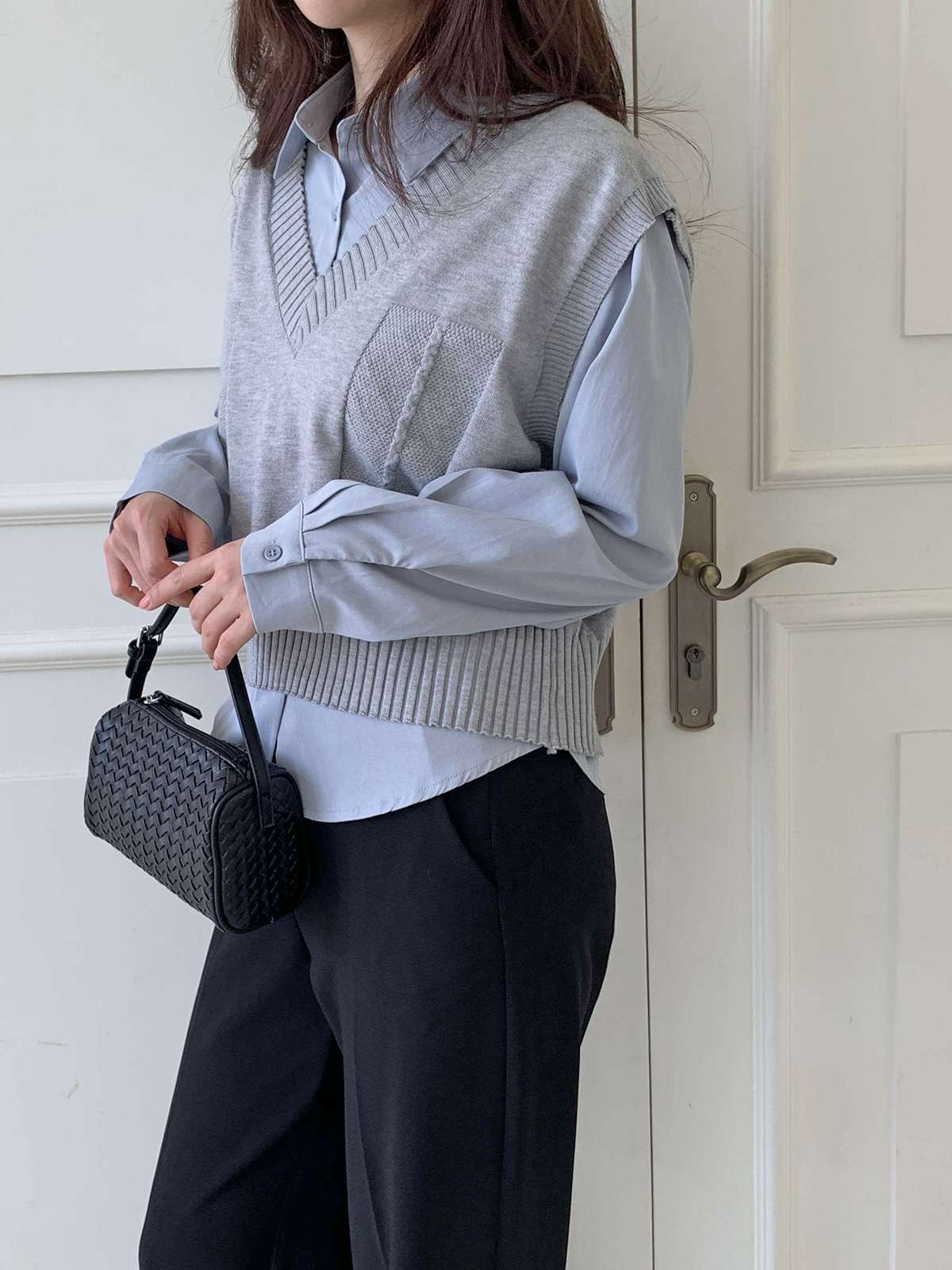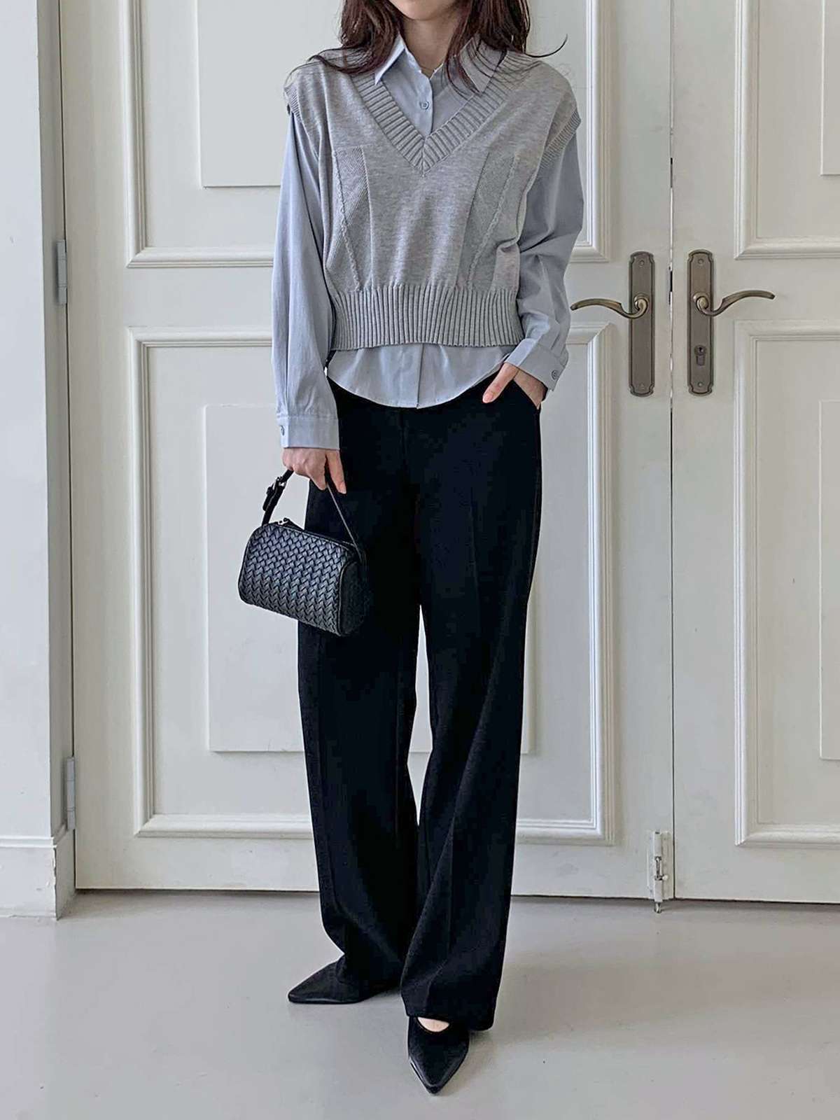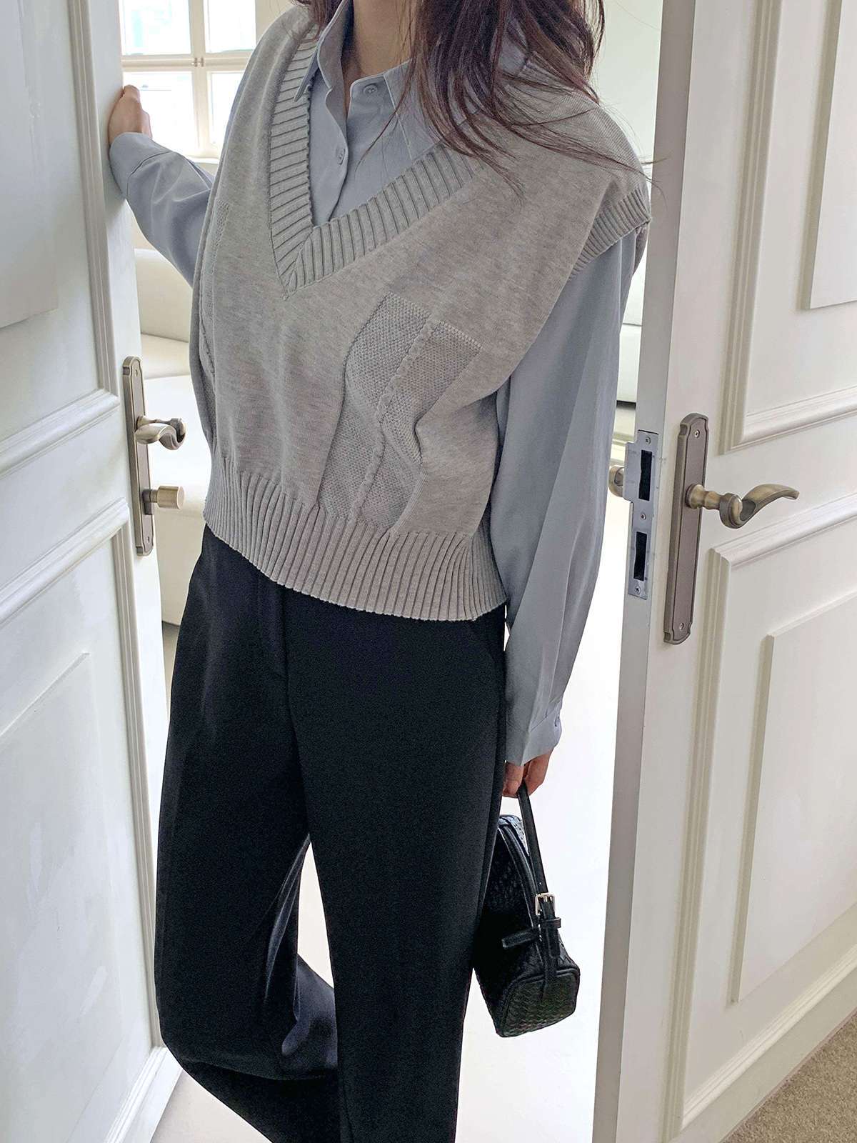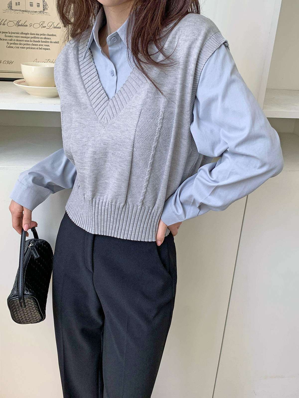 베이직한 셔츠 위에 브이넥 니트 베스트가 레이어드된