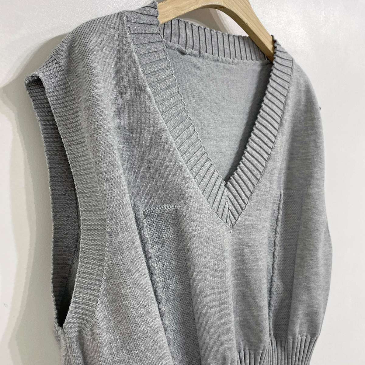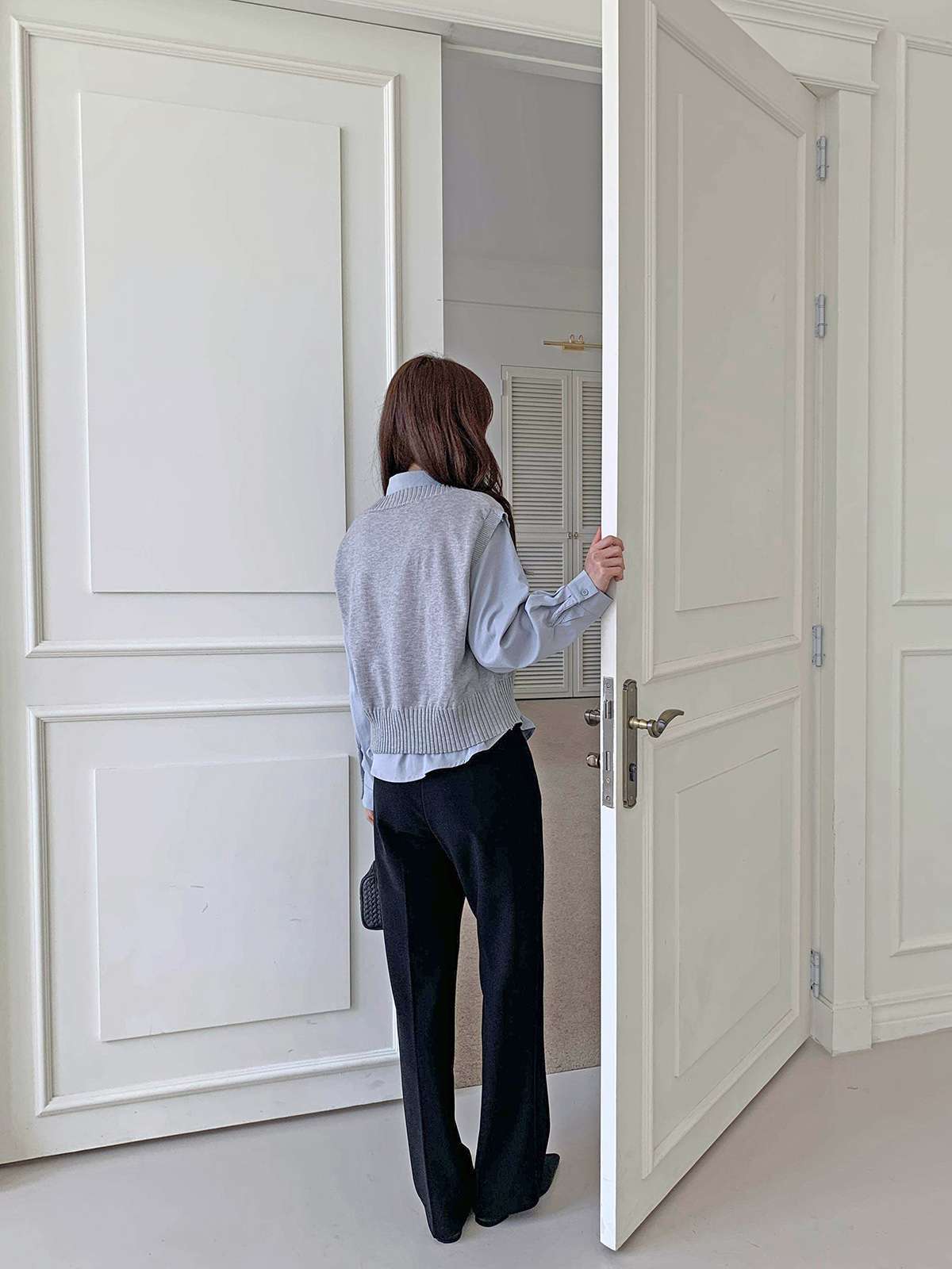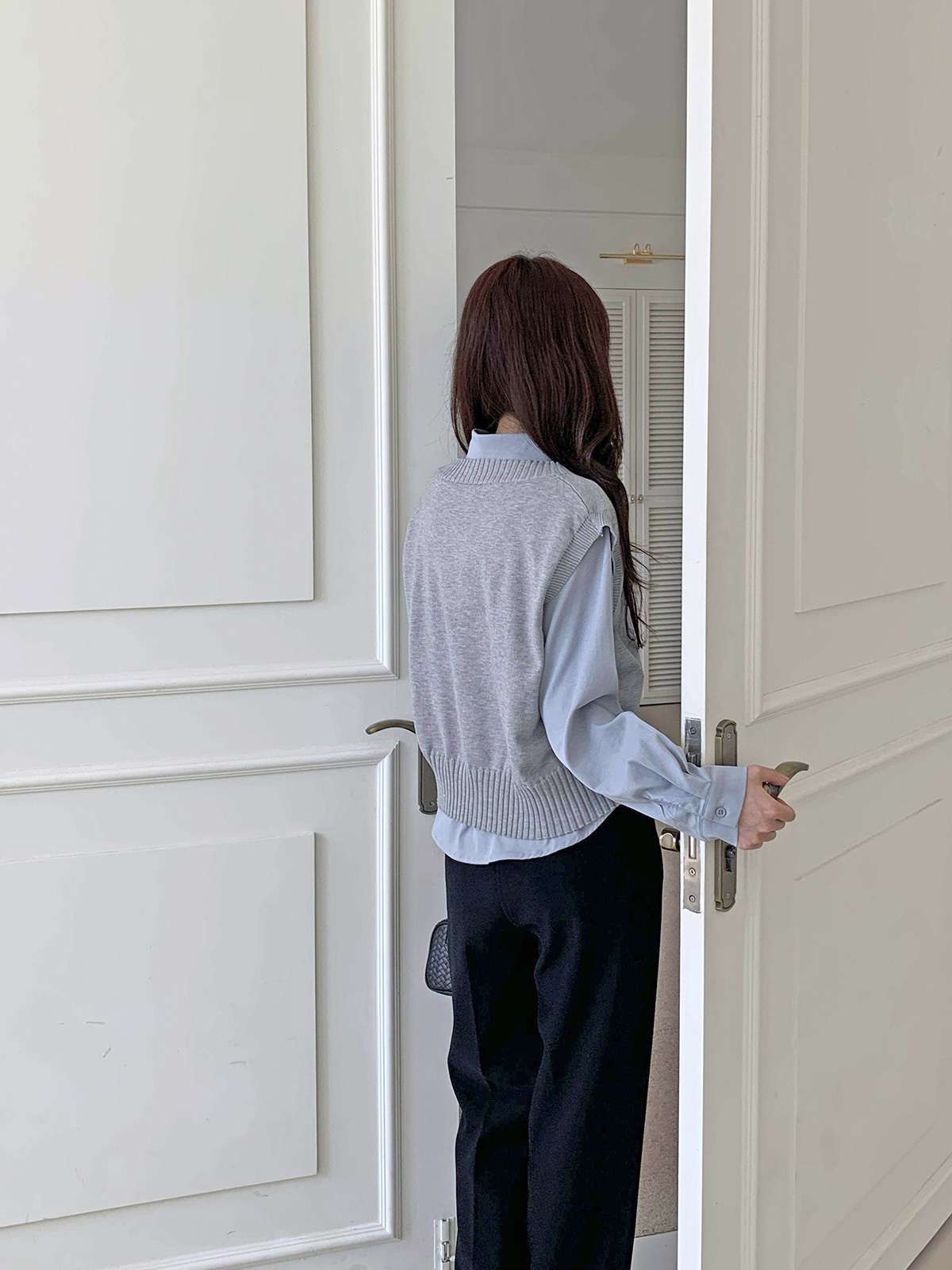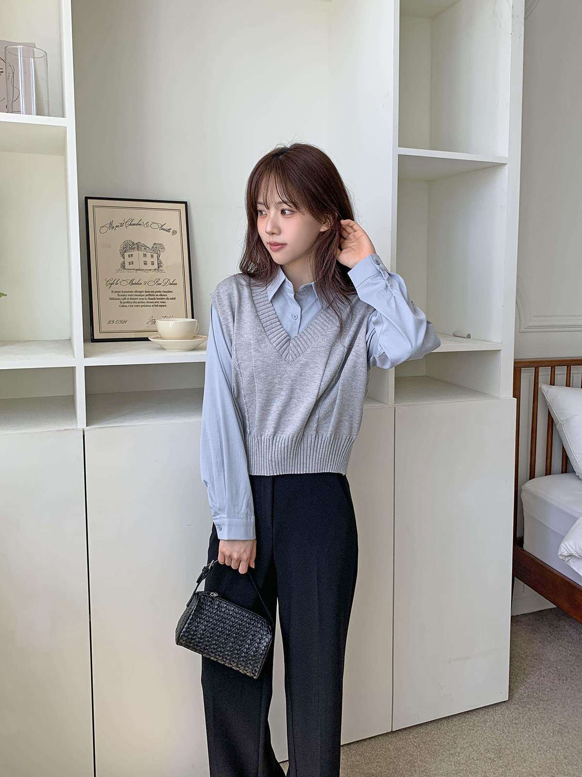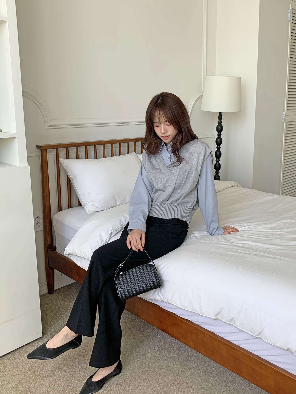 베이직한 셔츠 위에 브이넥 니트 베스트가 레이어드된