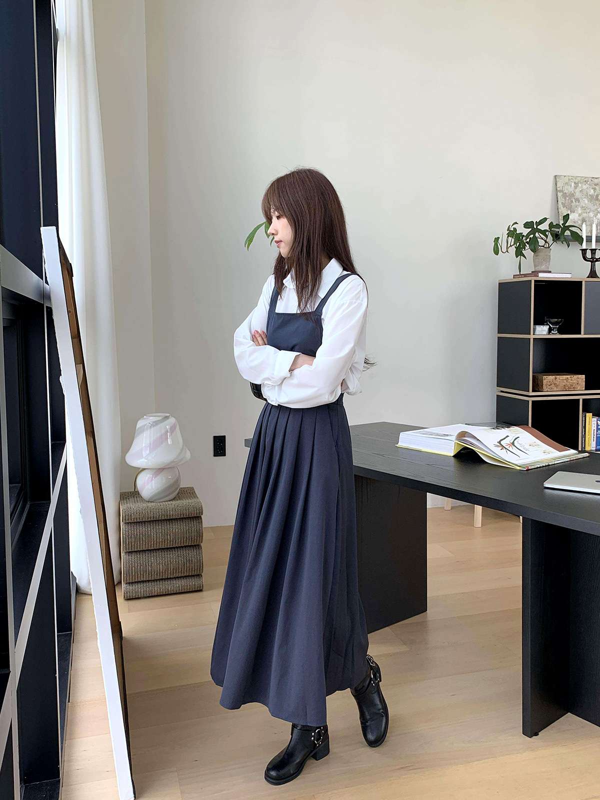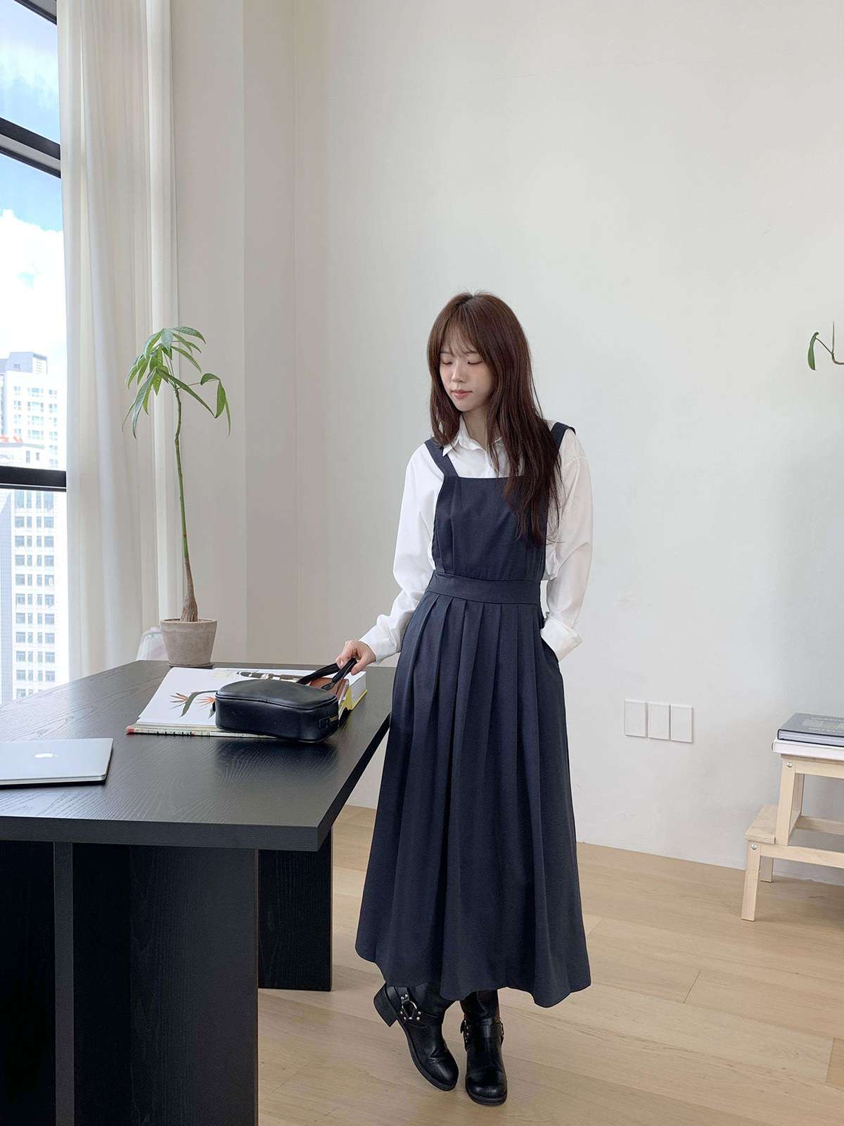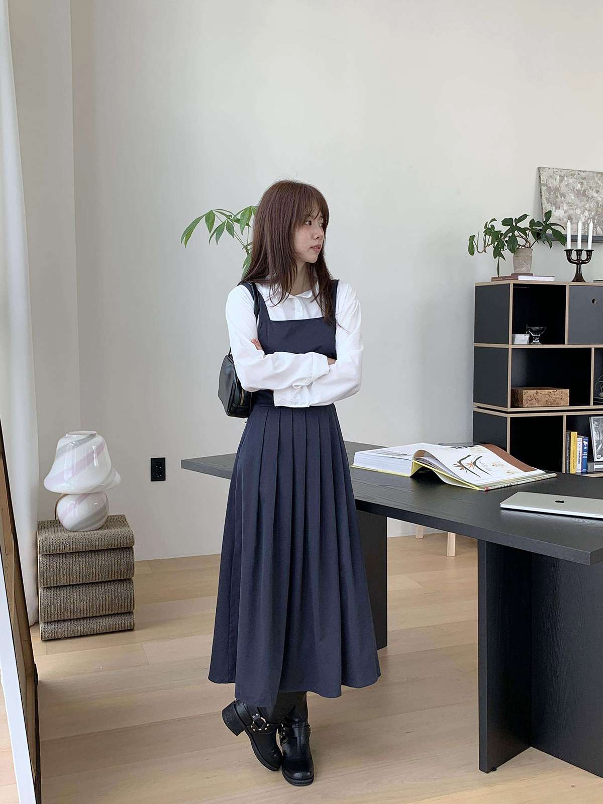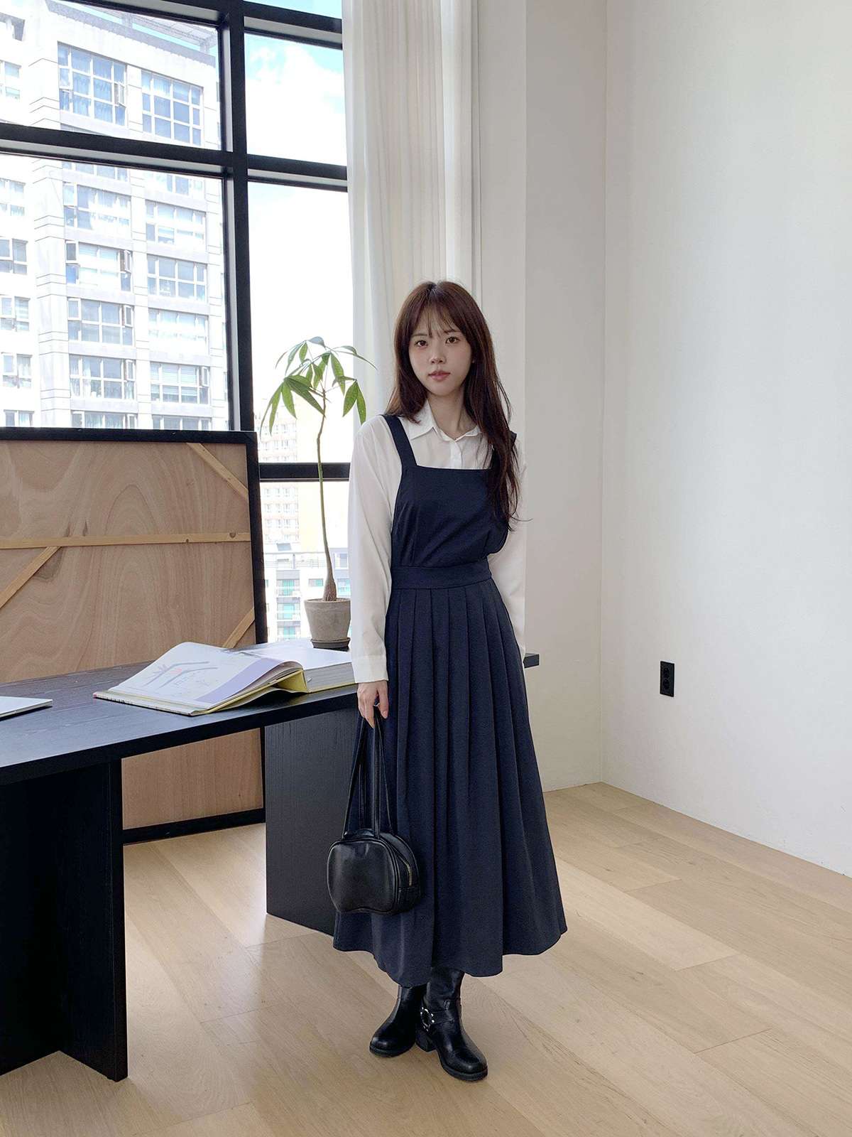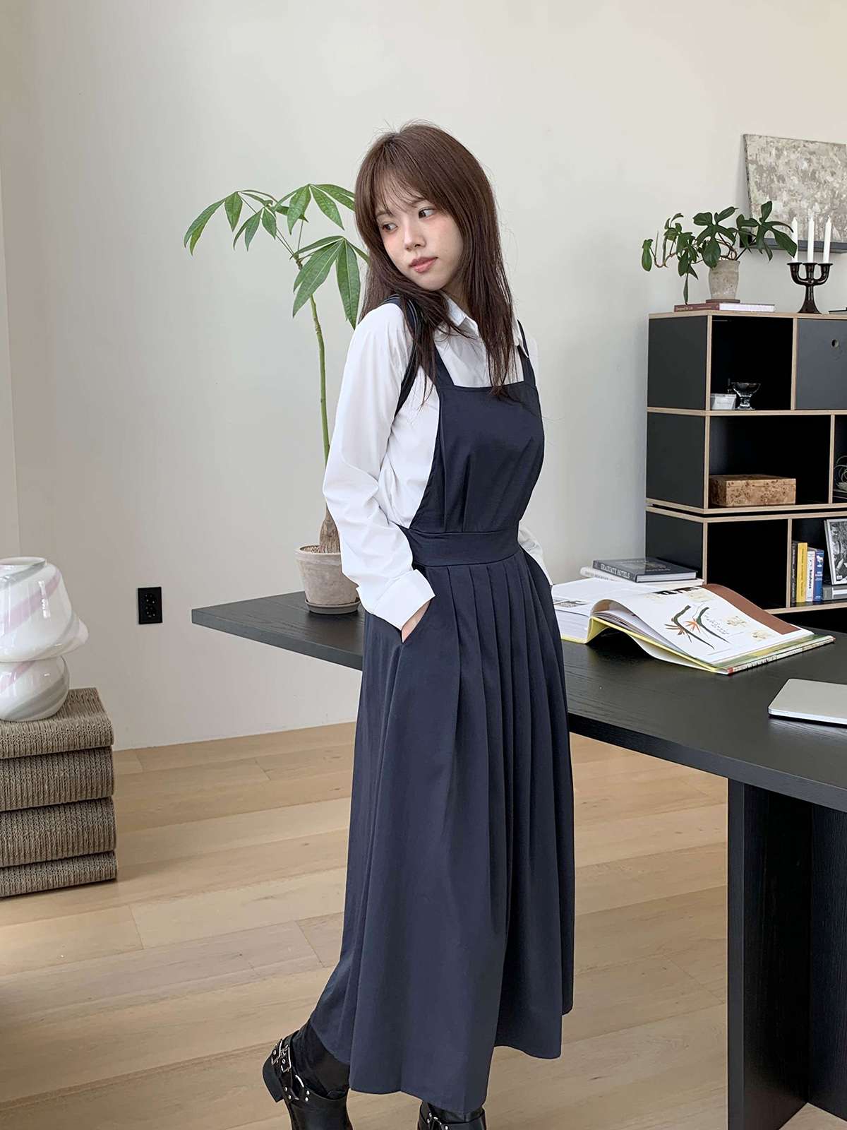 베이직한 화이트 셔츠 위에 뷔스티에 플리츠 롱 원피스가 세트로