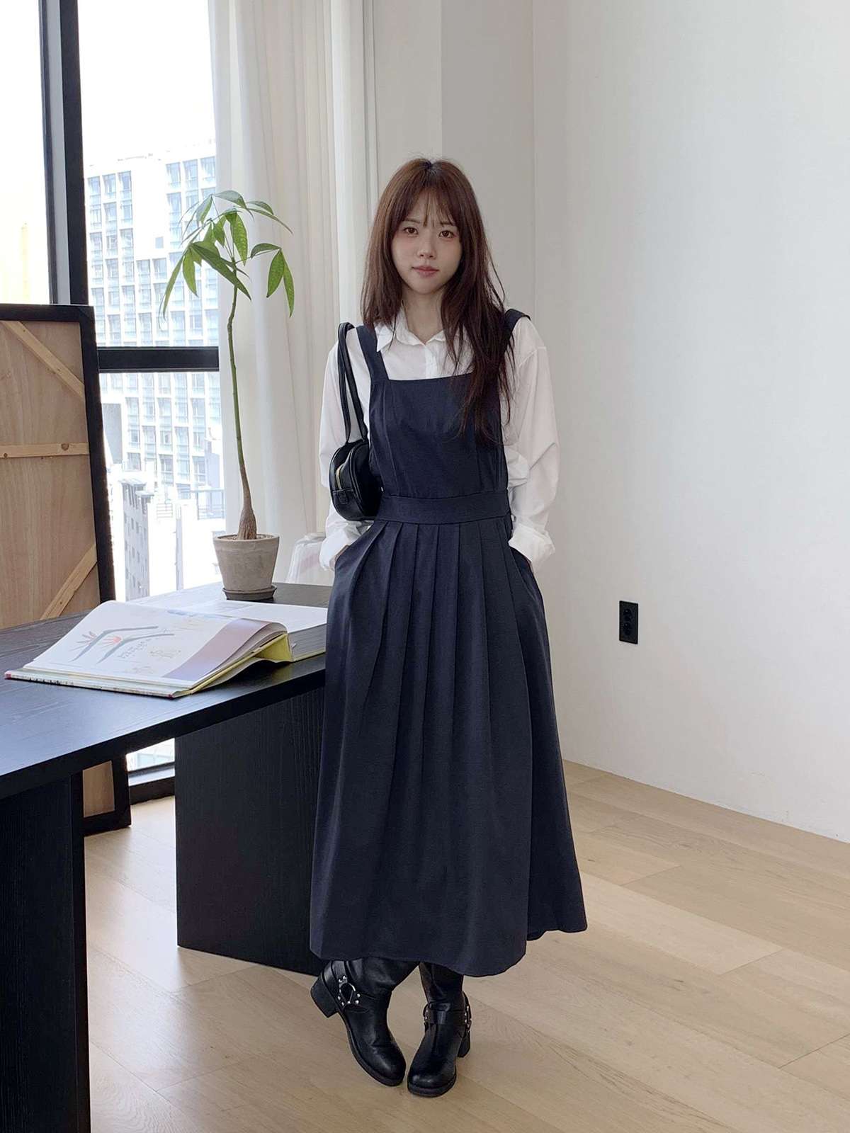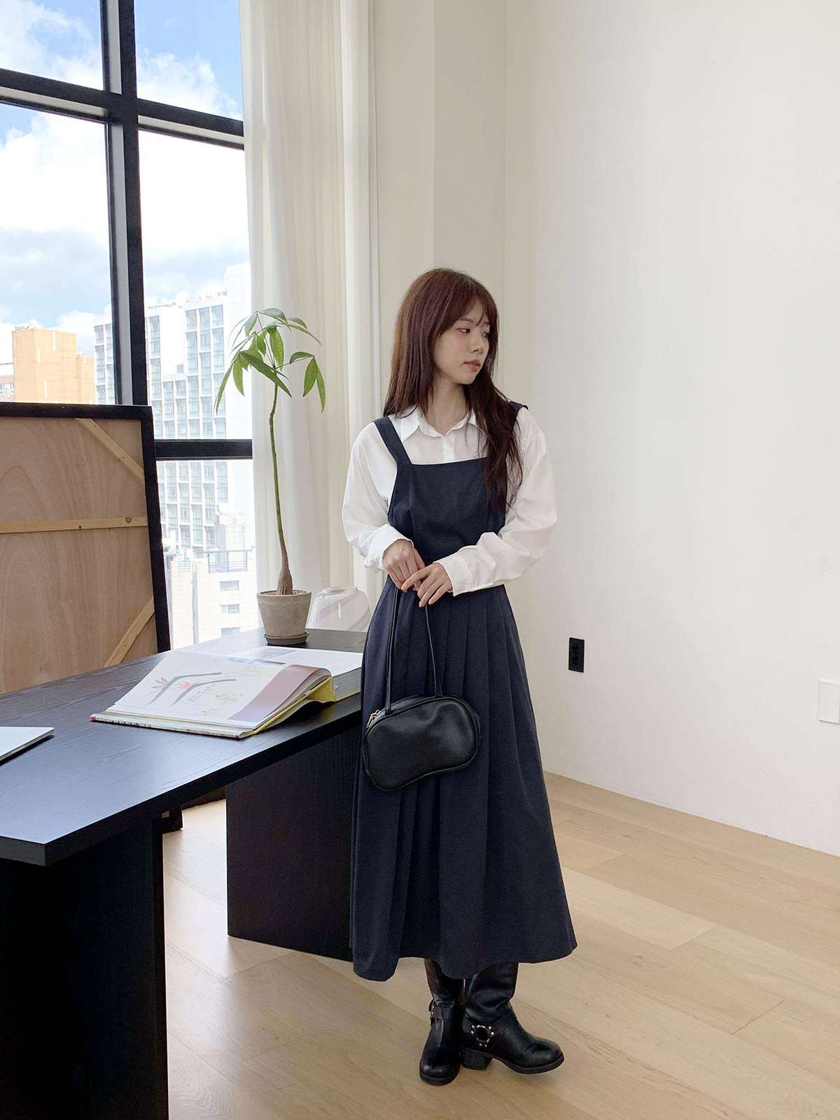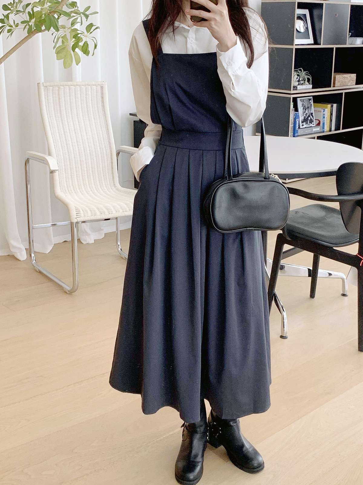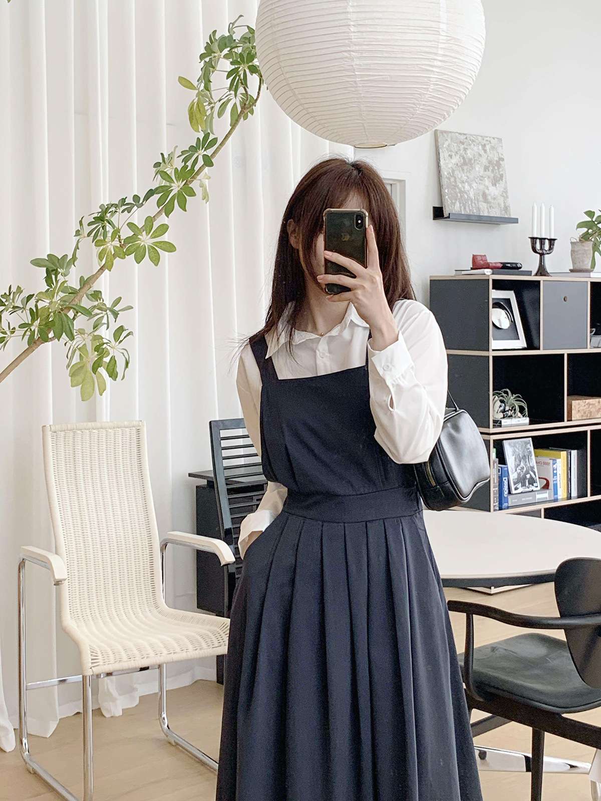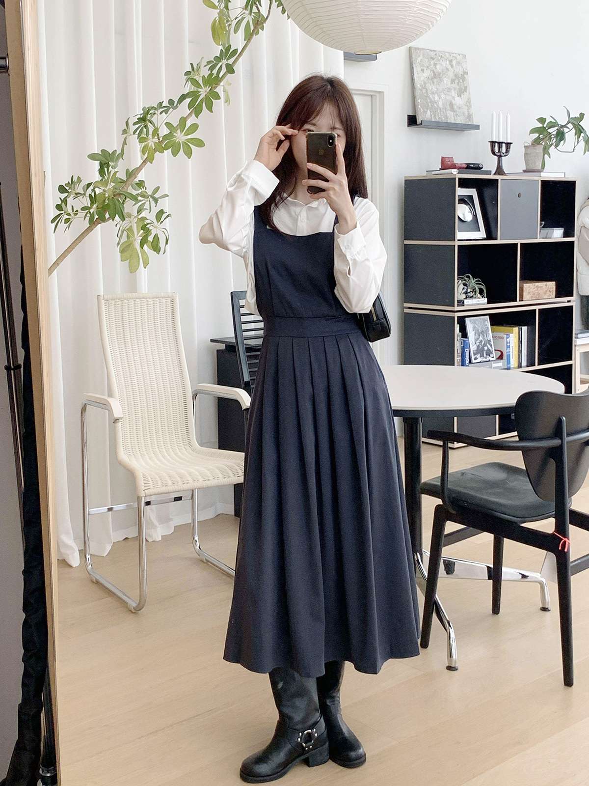 베이직한 화이트 셔츠 위에 뷔스티에 플리츠 롱 원피스가 세트로
