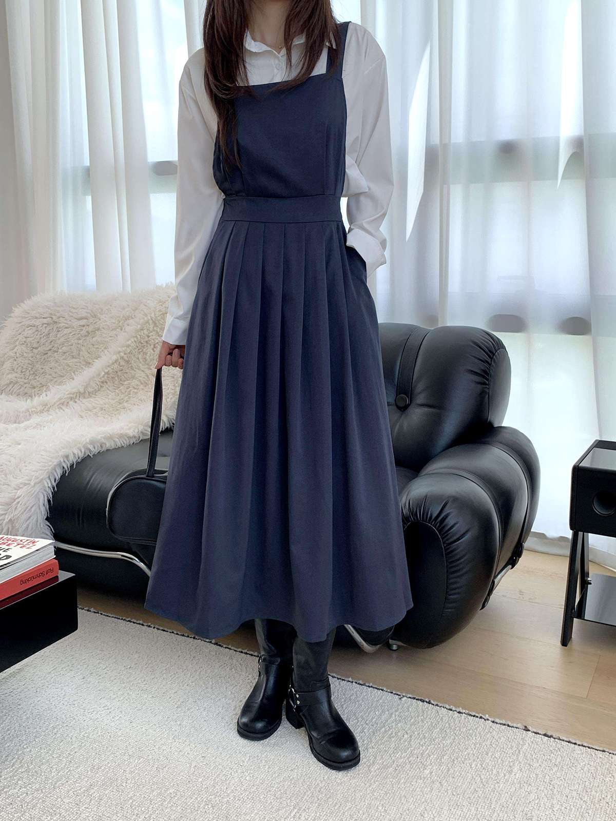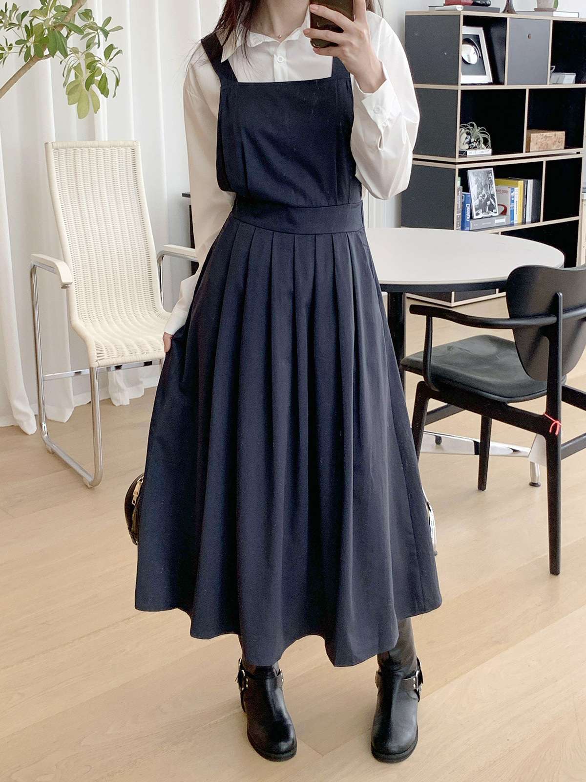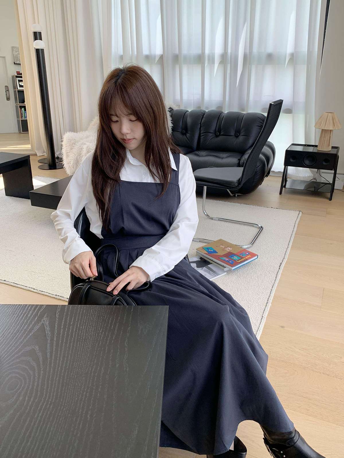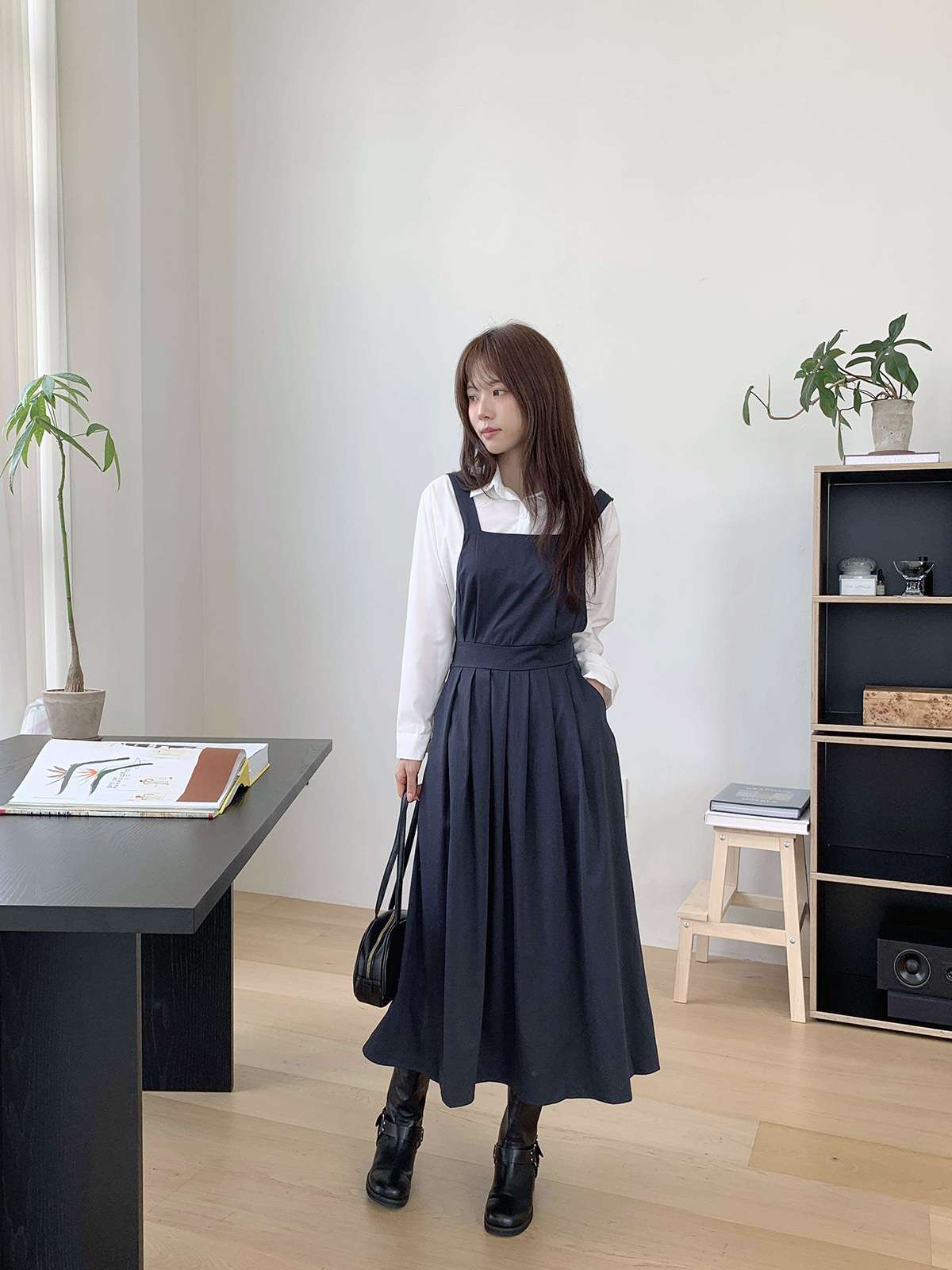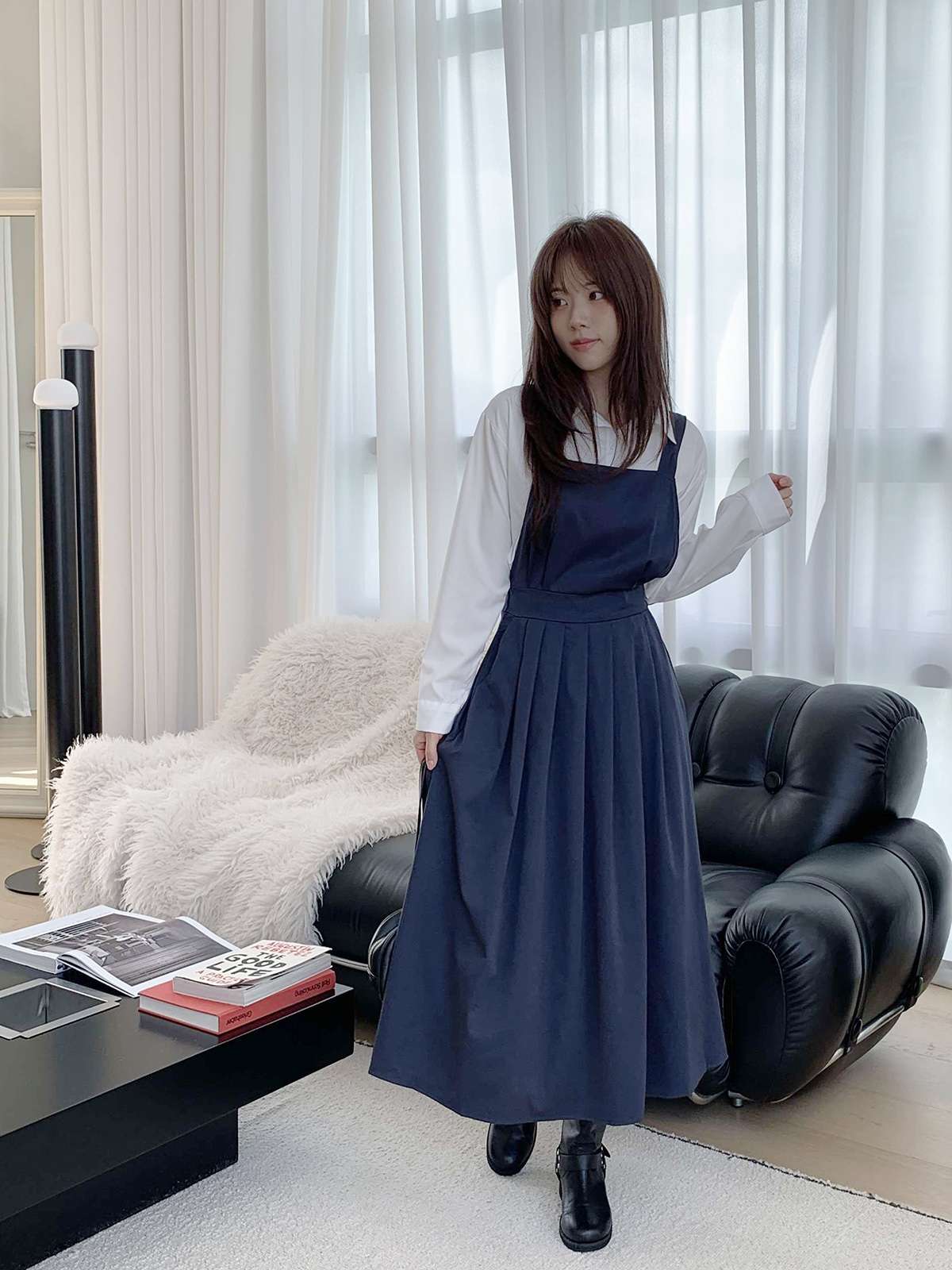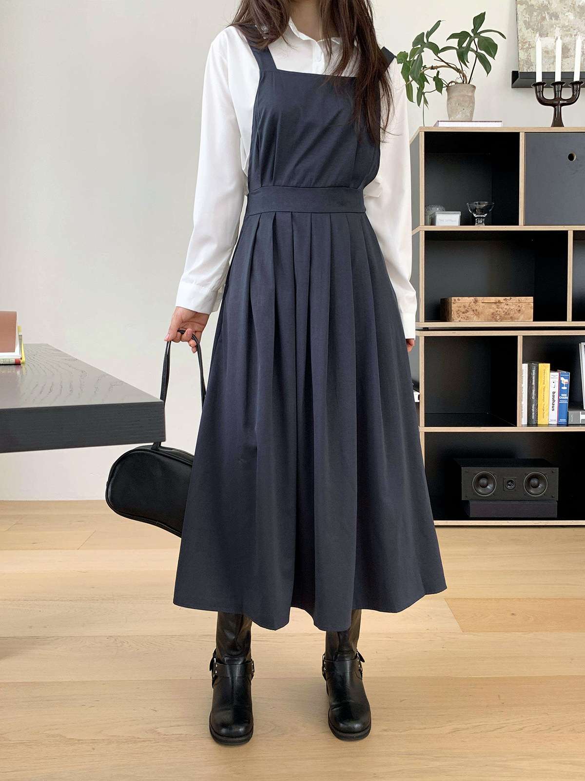 베이직한 화이트 셔츠 위에 뷔스티에 플리츠 롱 원피스가 세트로