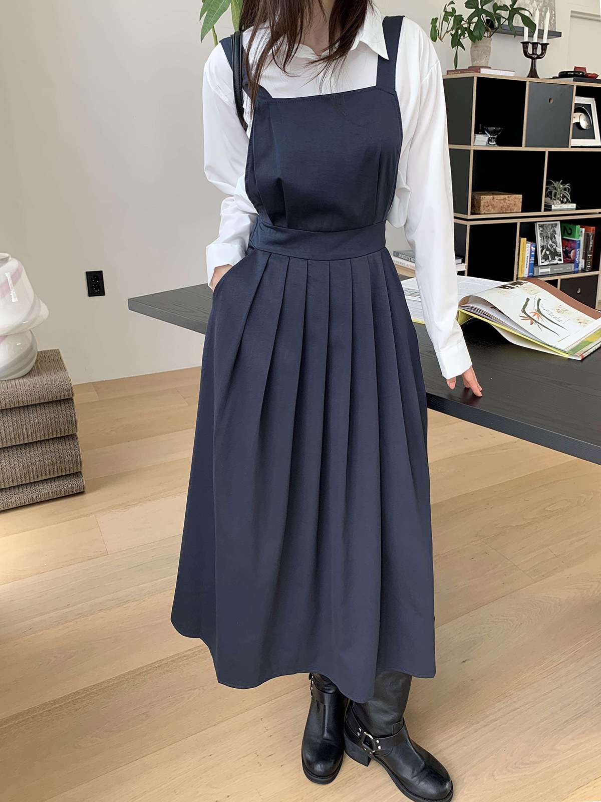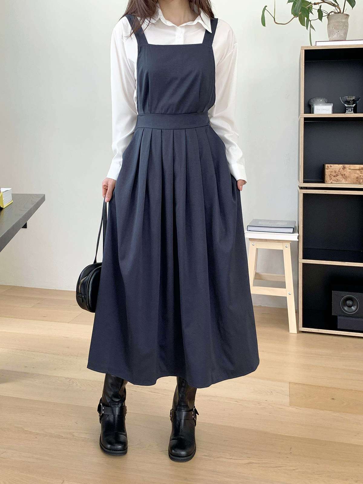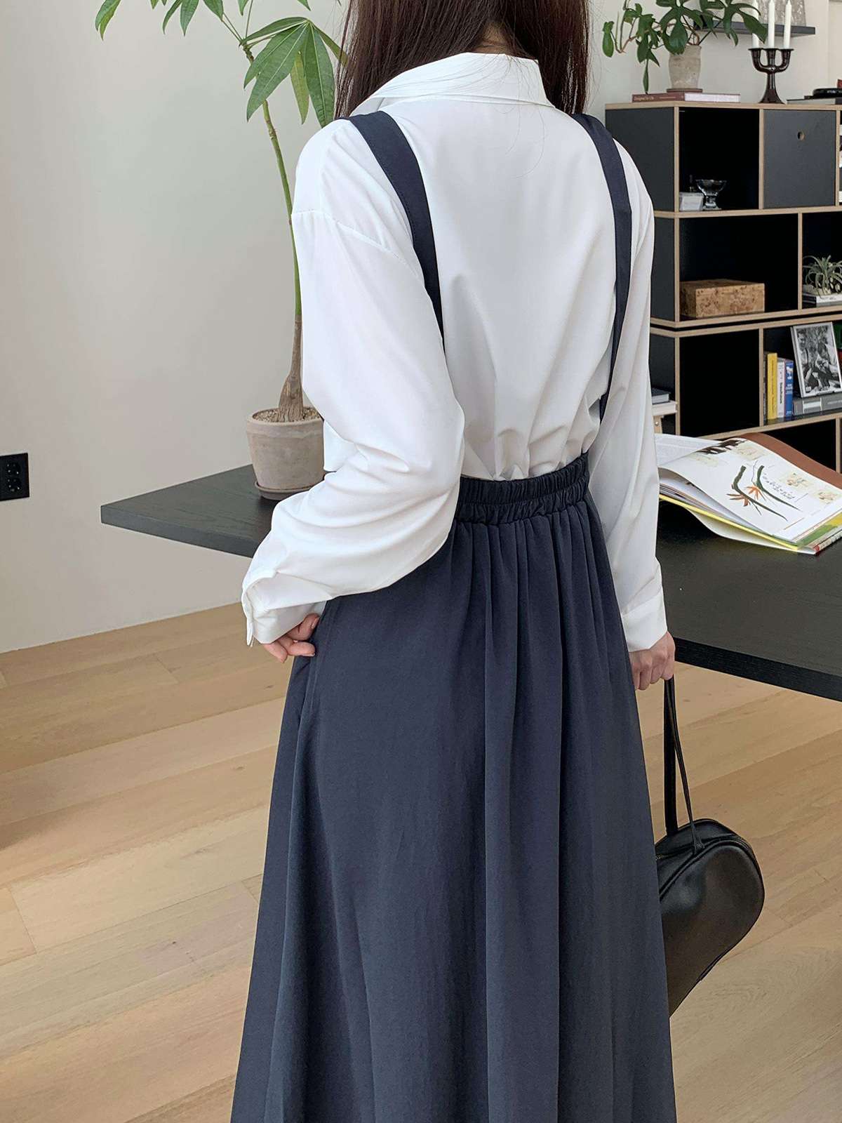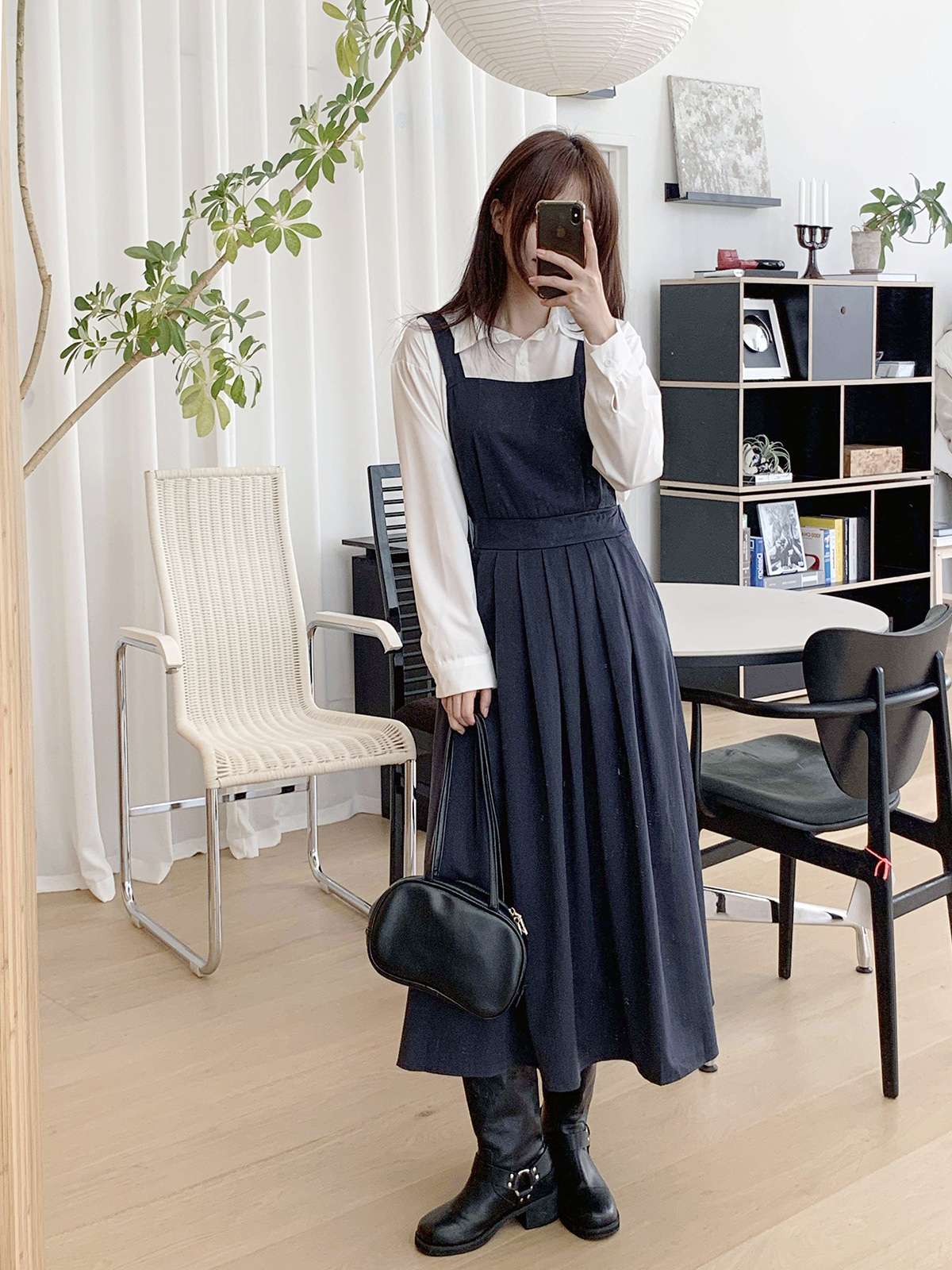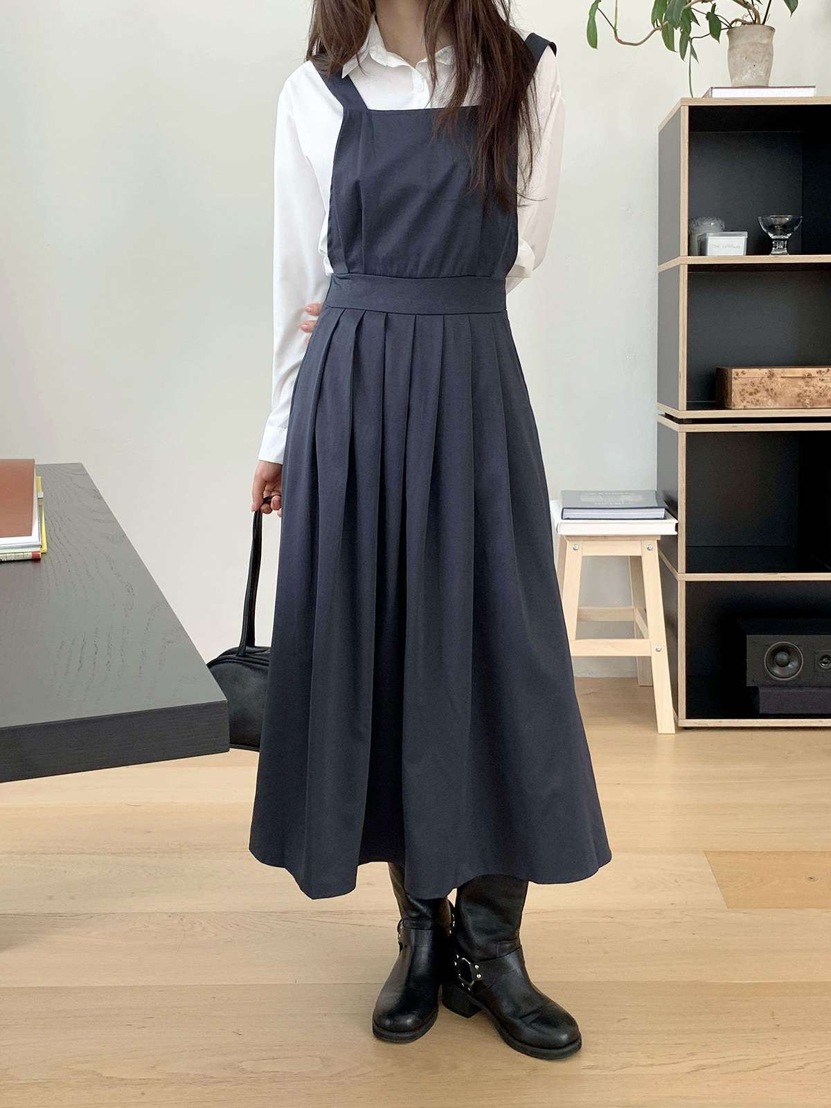 베이직한 화이트 셔츠 위에 뷔스티에 플리츠 롱 원피스가 세트로