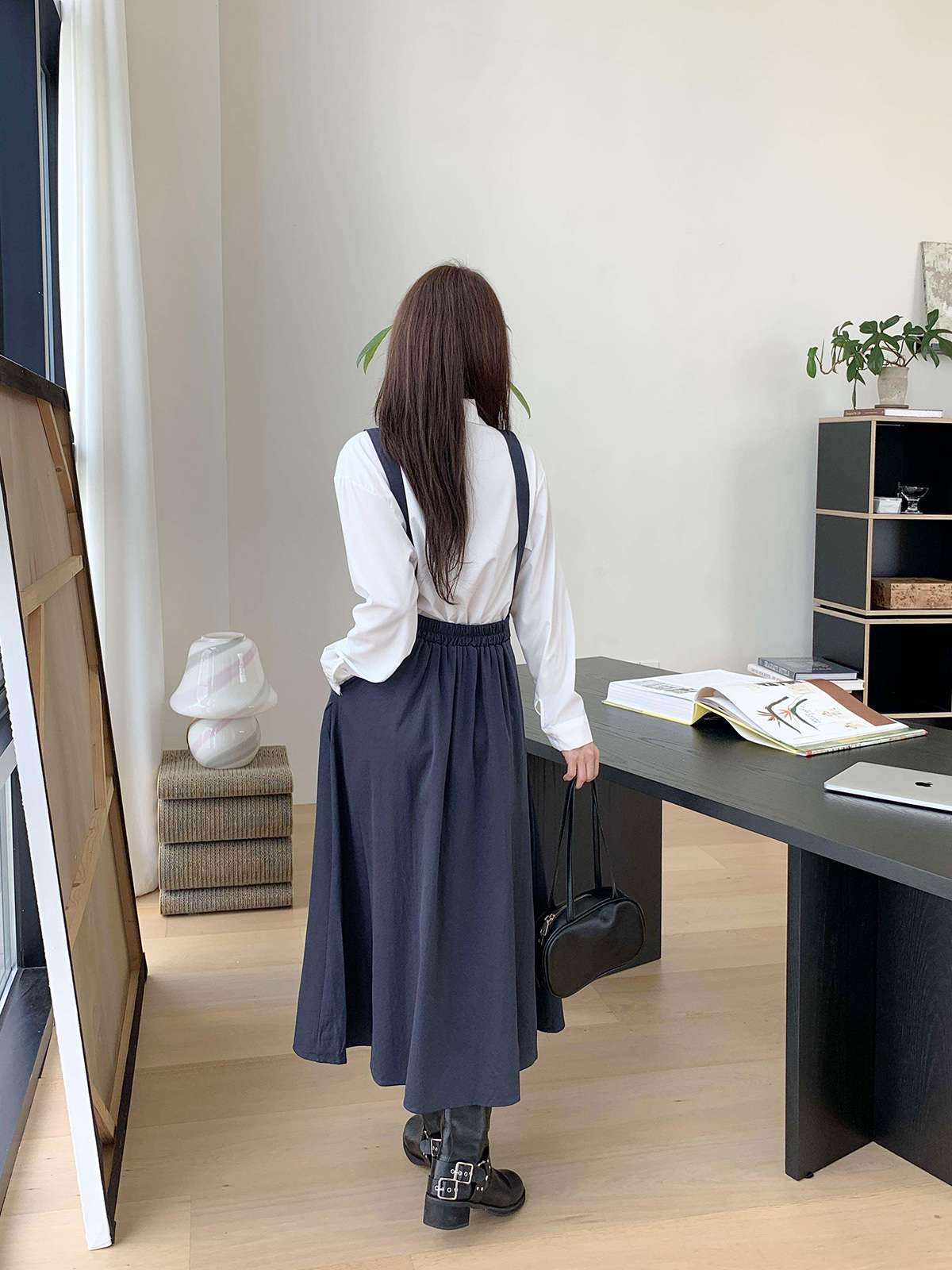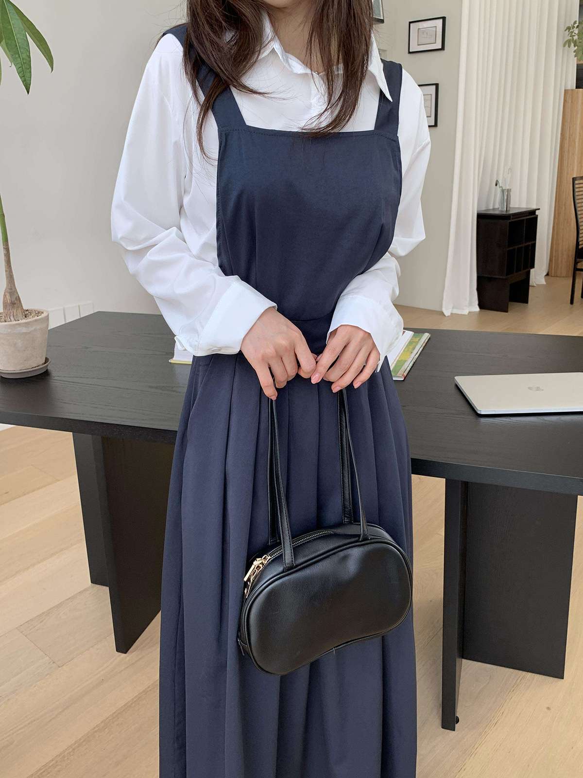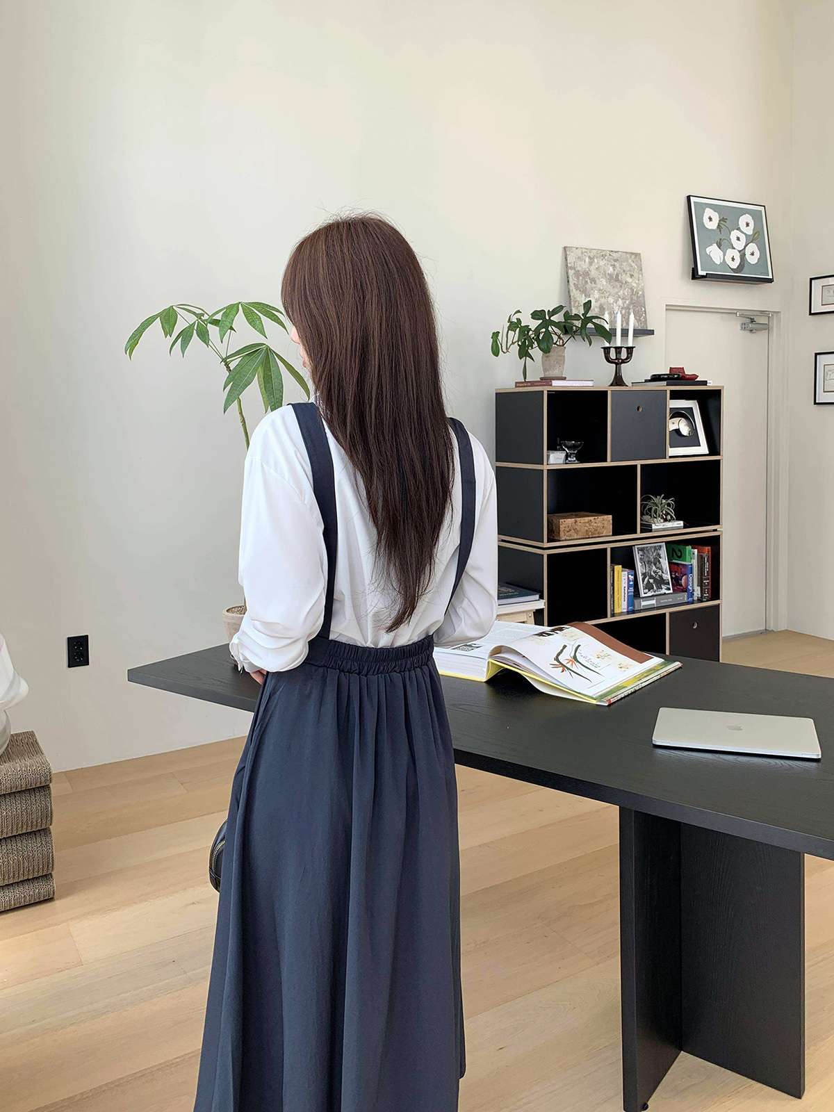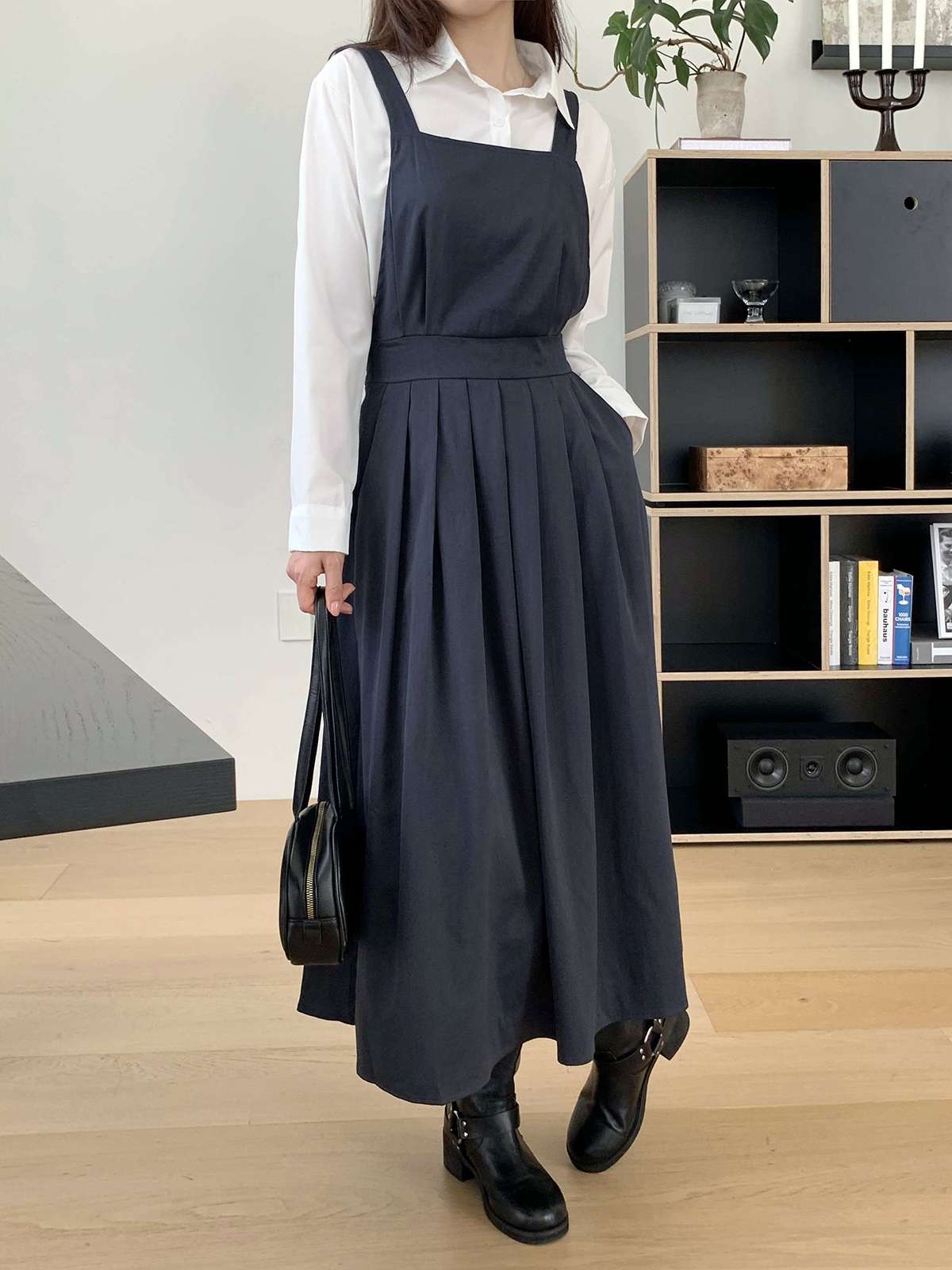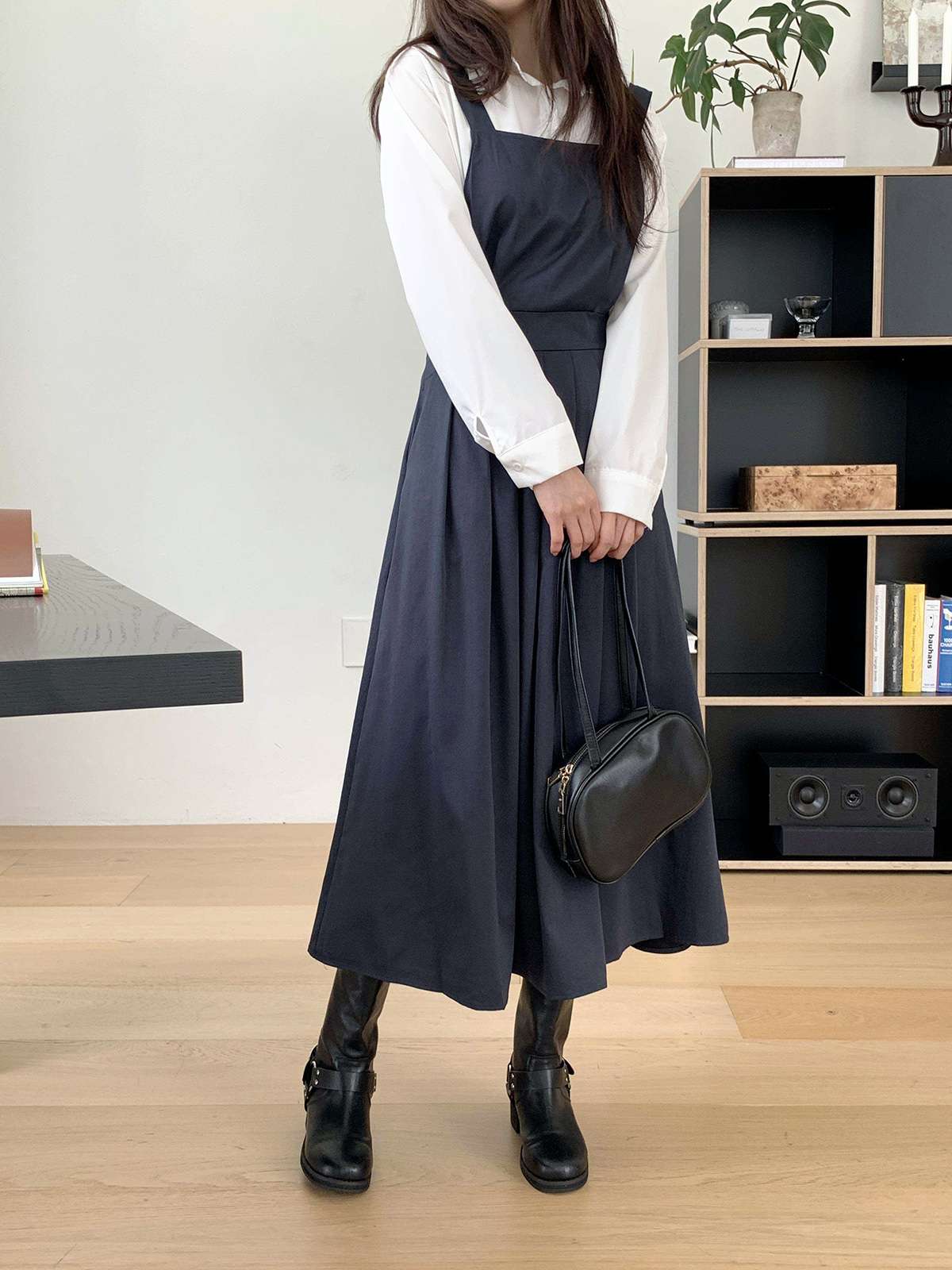 베이직한 화이트 셔츠 위에 뷔스티에 플리츠 롱 원피스가 세트로