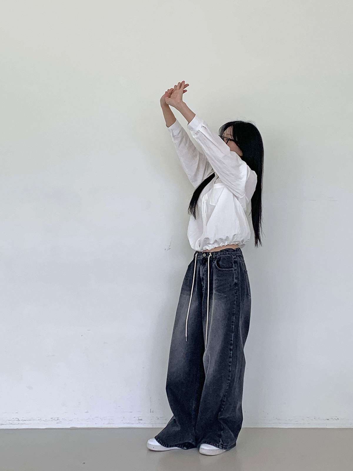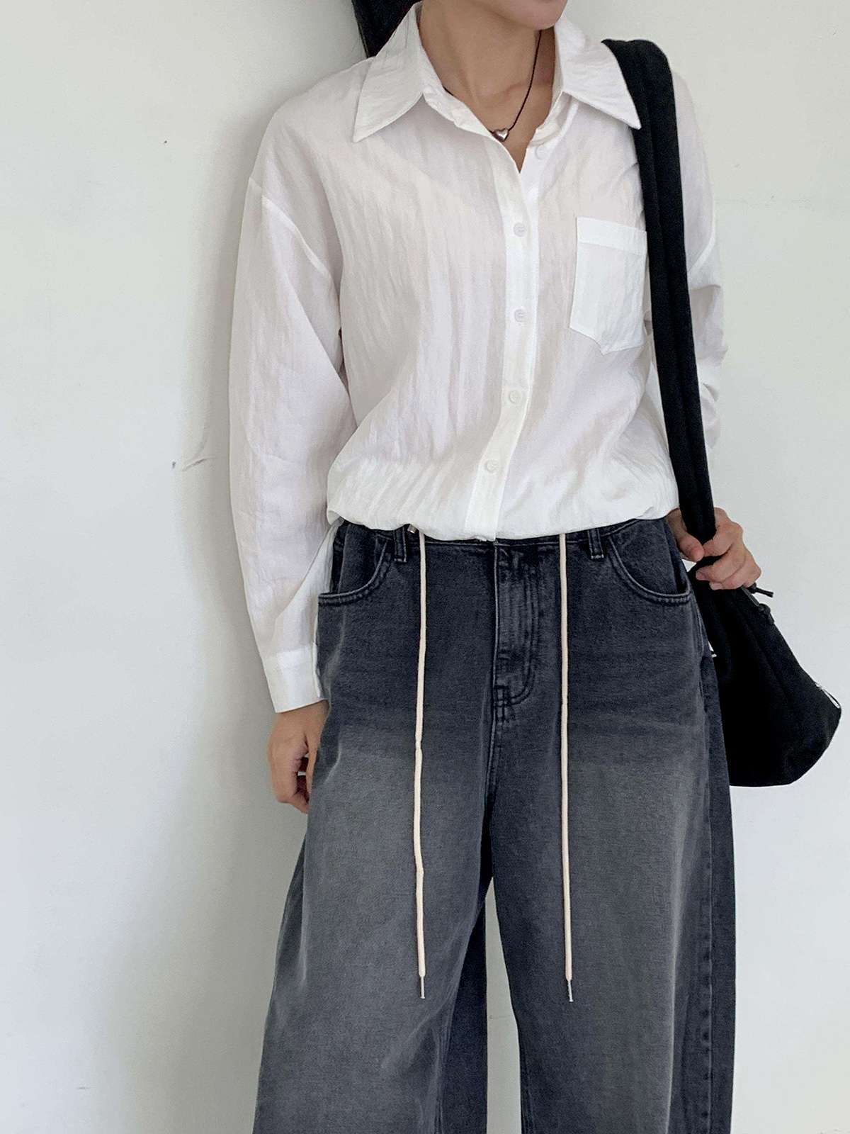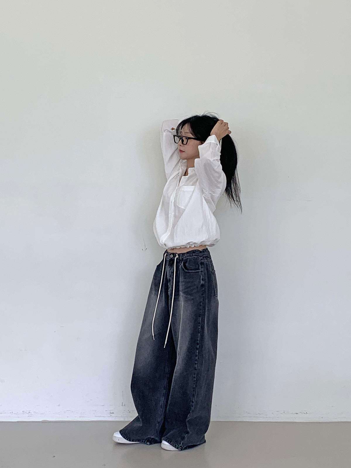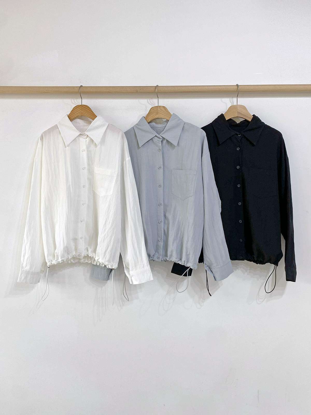 [ NB3305K58-도븐루 밑단 스트링 세미 크롭 루즈핏 셔츠 ]