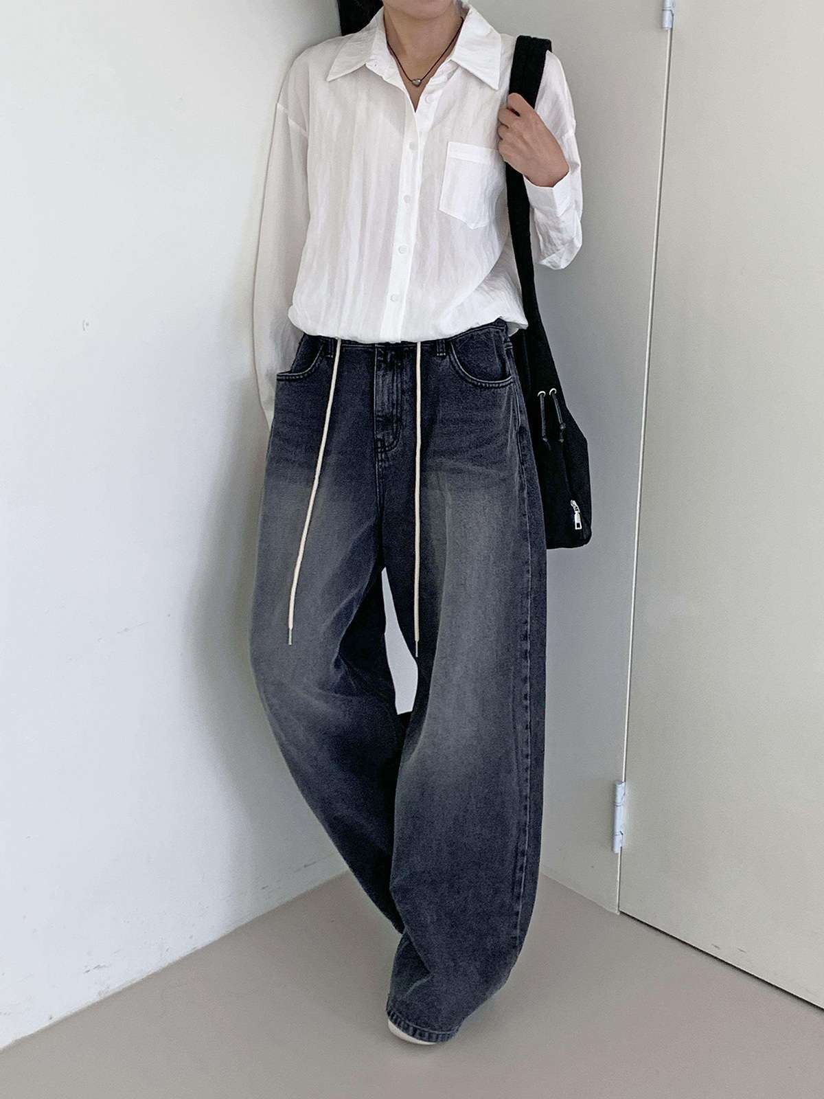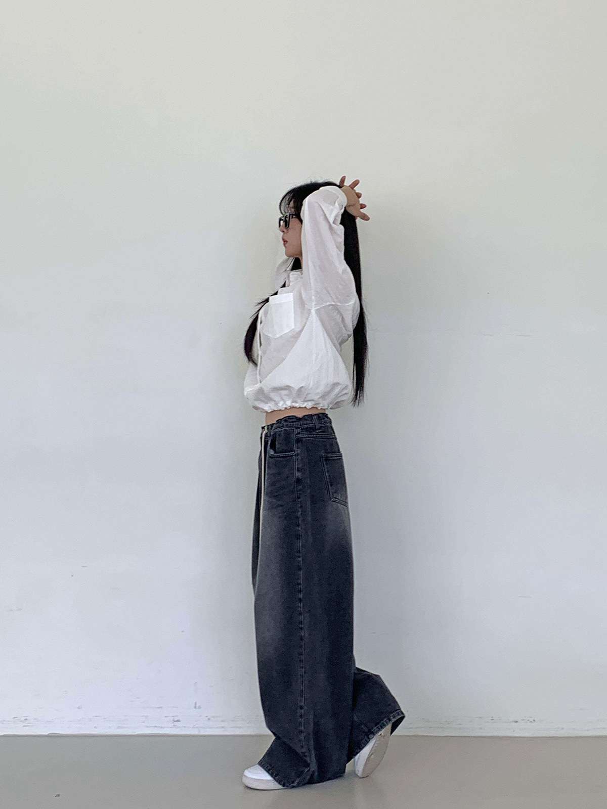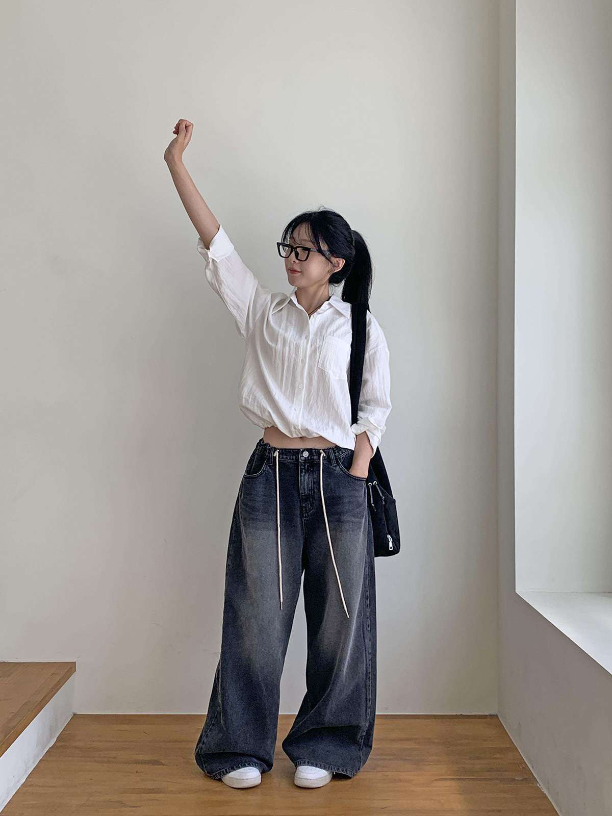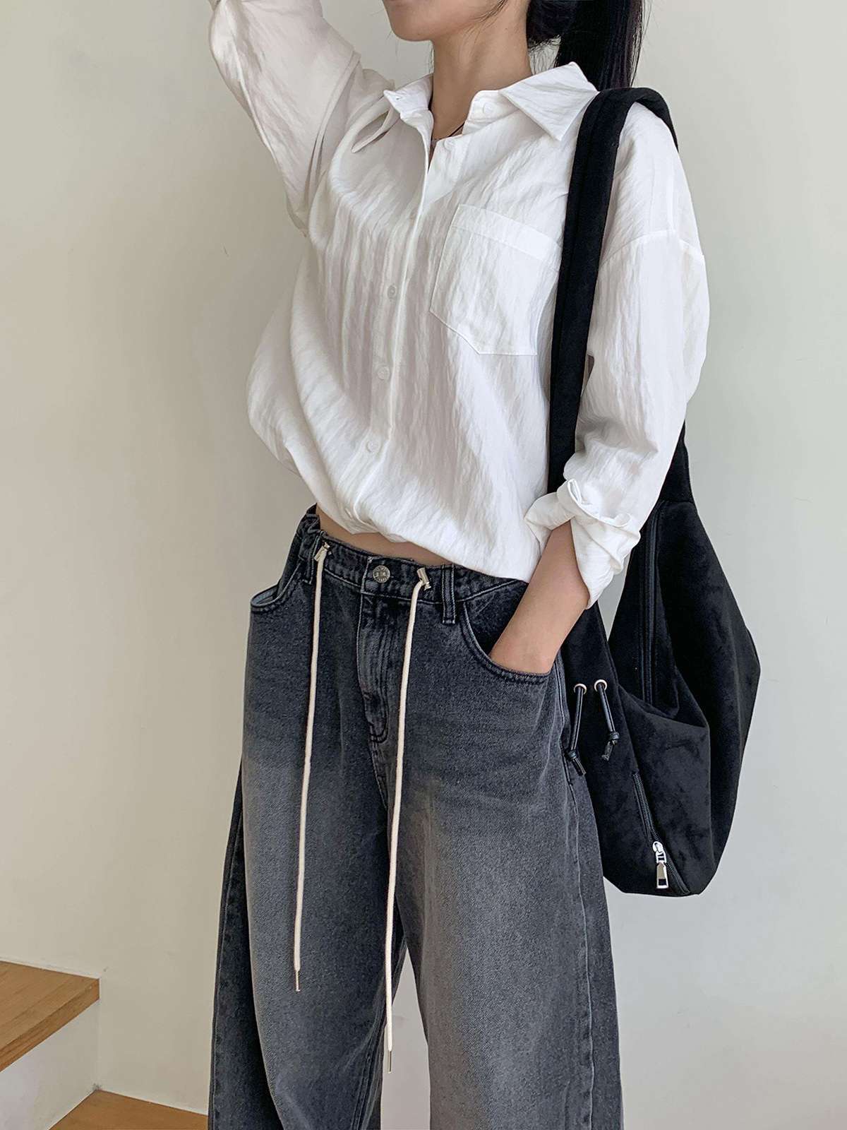 [ NB3305K58-도븐루 밑단 스트링 세미 크롭 루즈핏 셔츠 ]