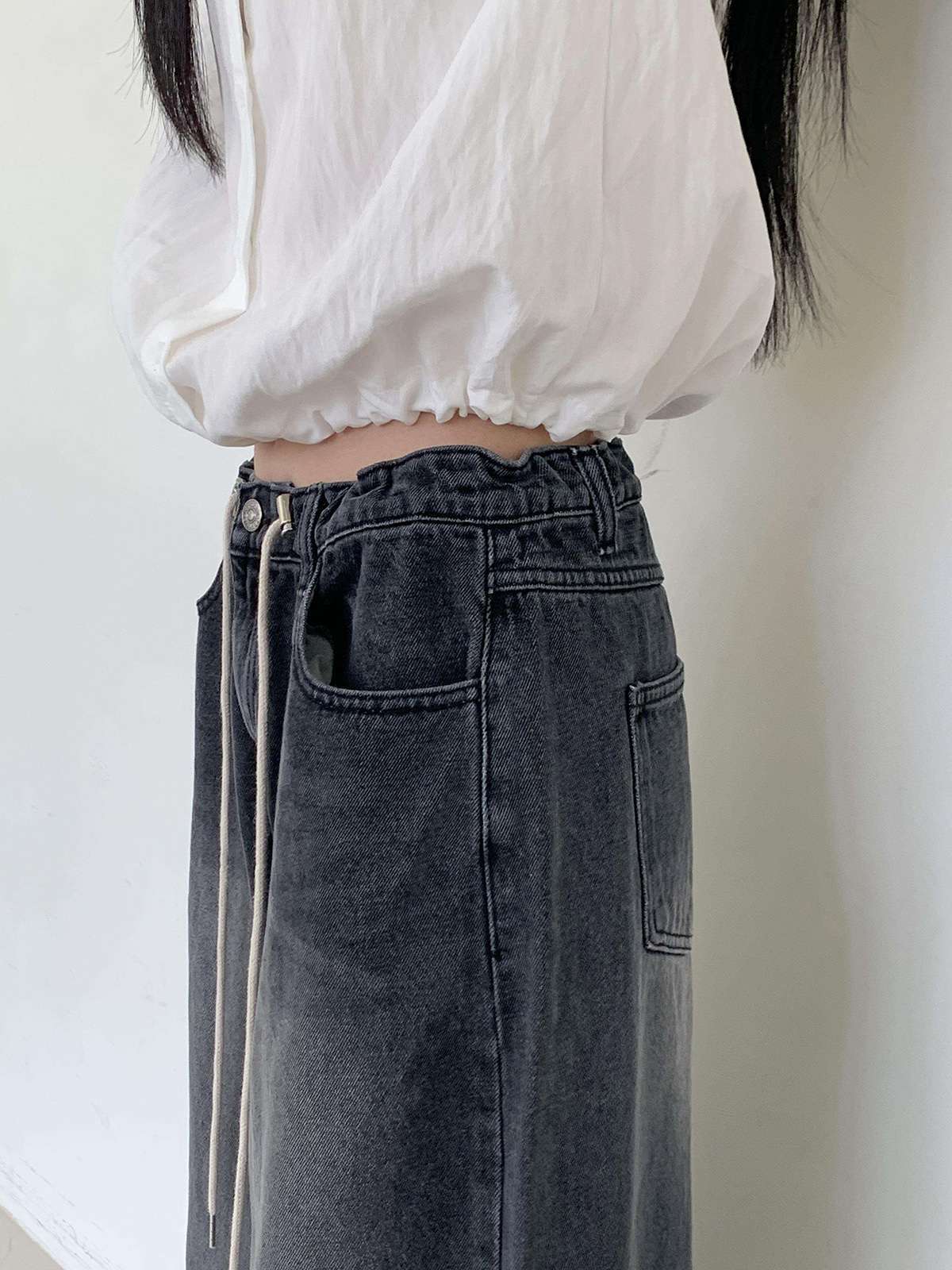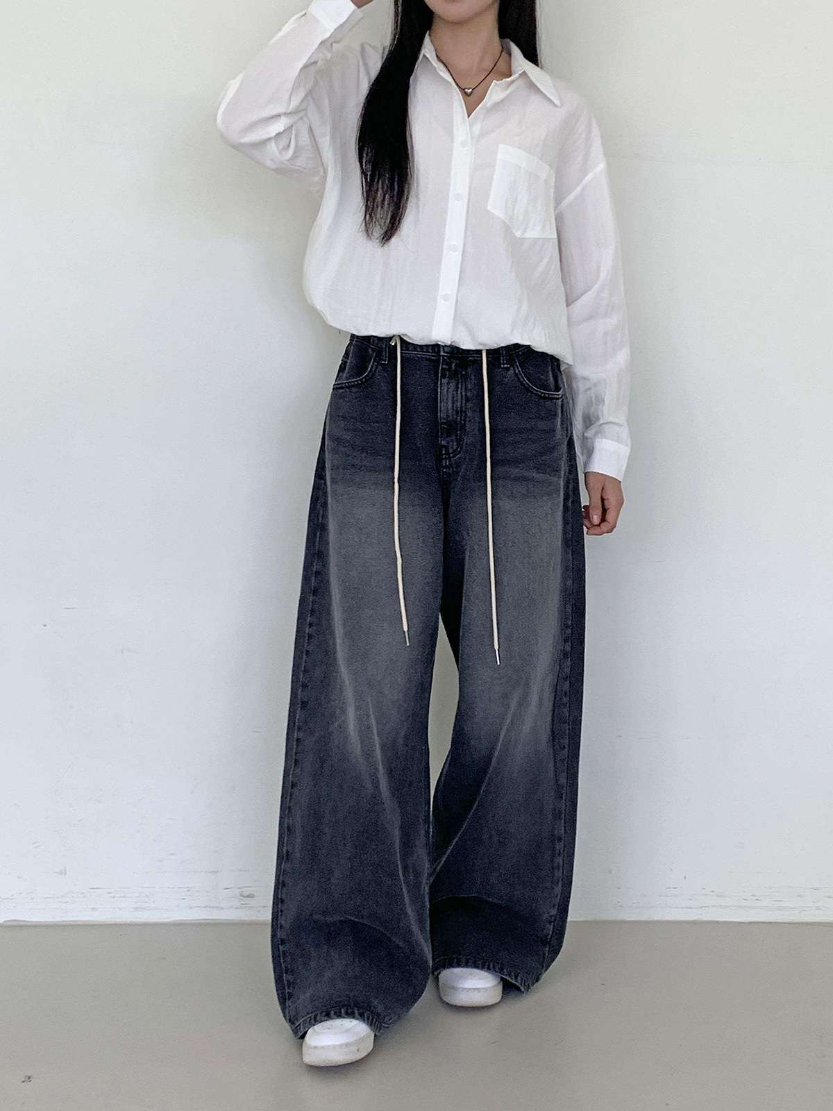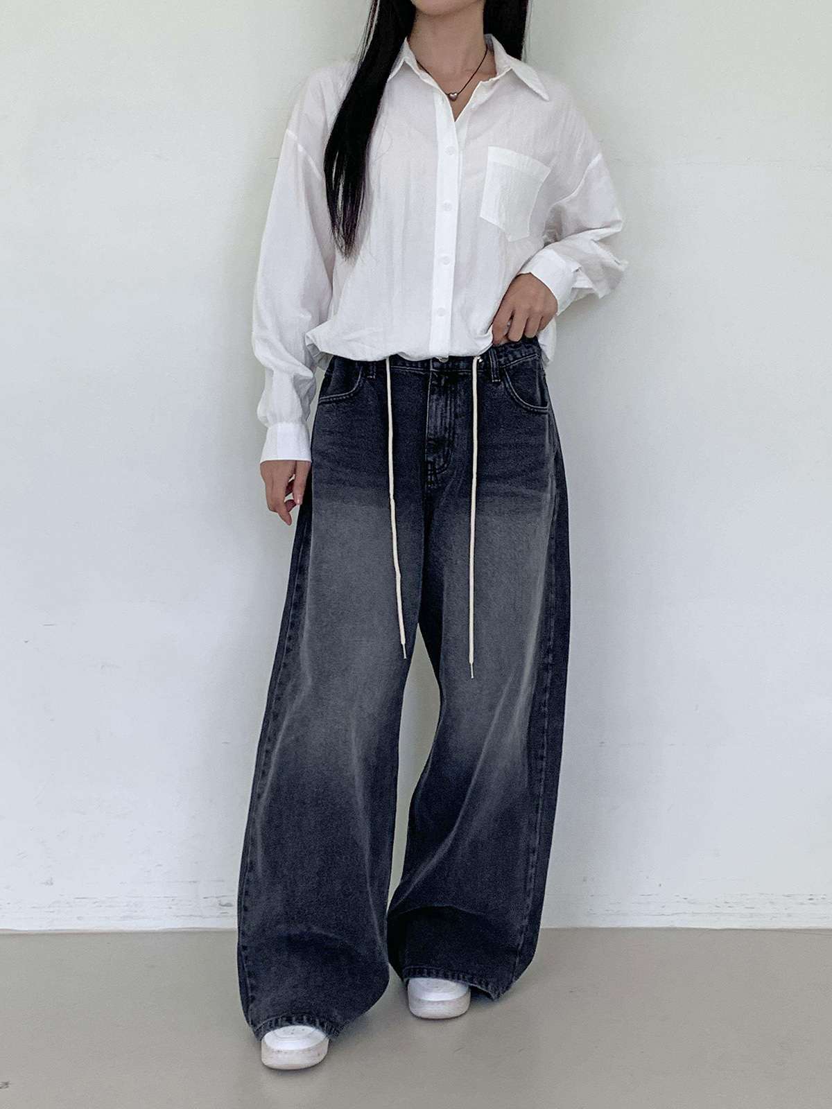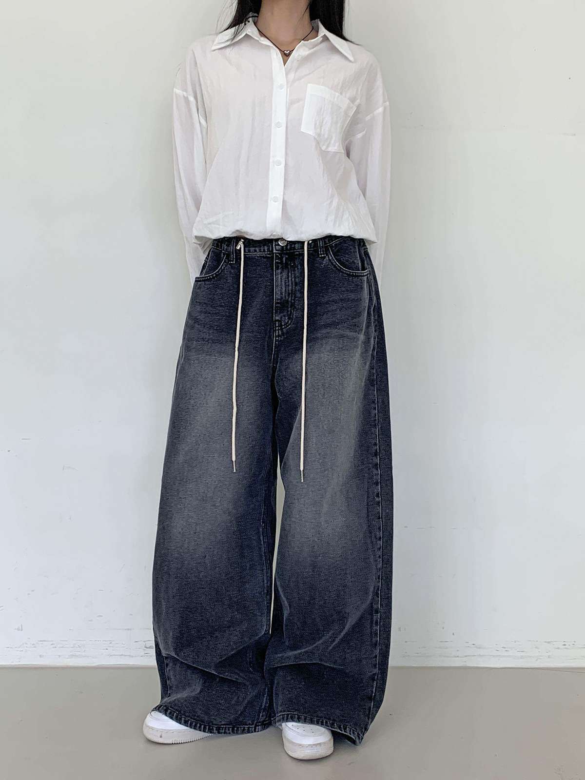 NB3305K58-도븐루 밑단 스트링 세미 크롭 루즈핏 셔츠