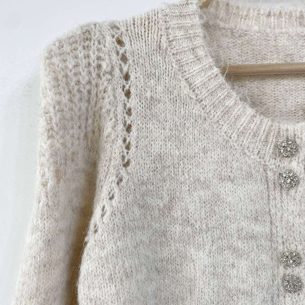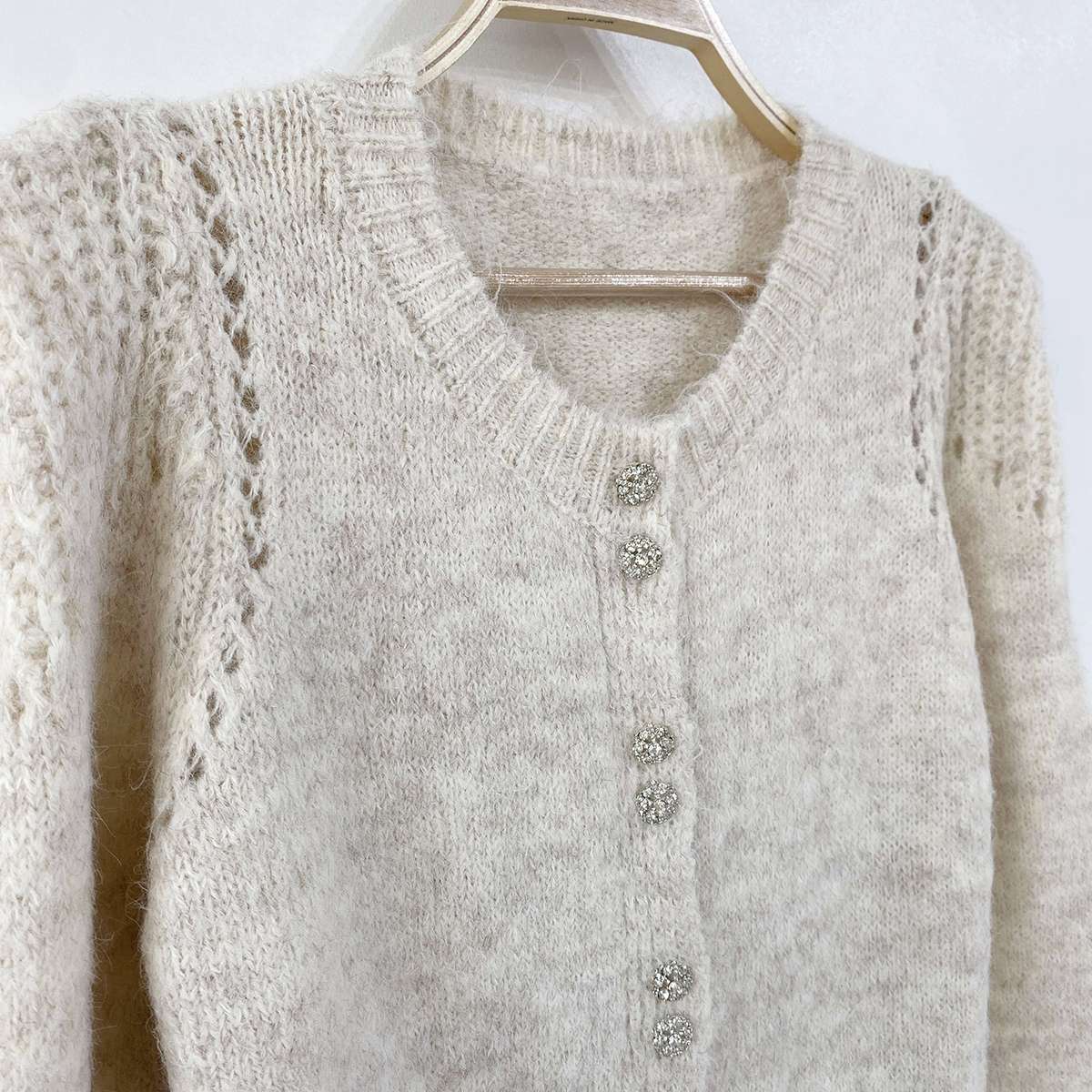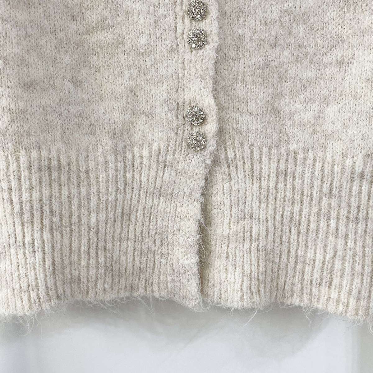 부드럽고 도톰하게 짜여진 소재의 큐빅 투버튼으로 포인트를 준 니트 가디건