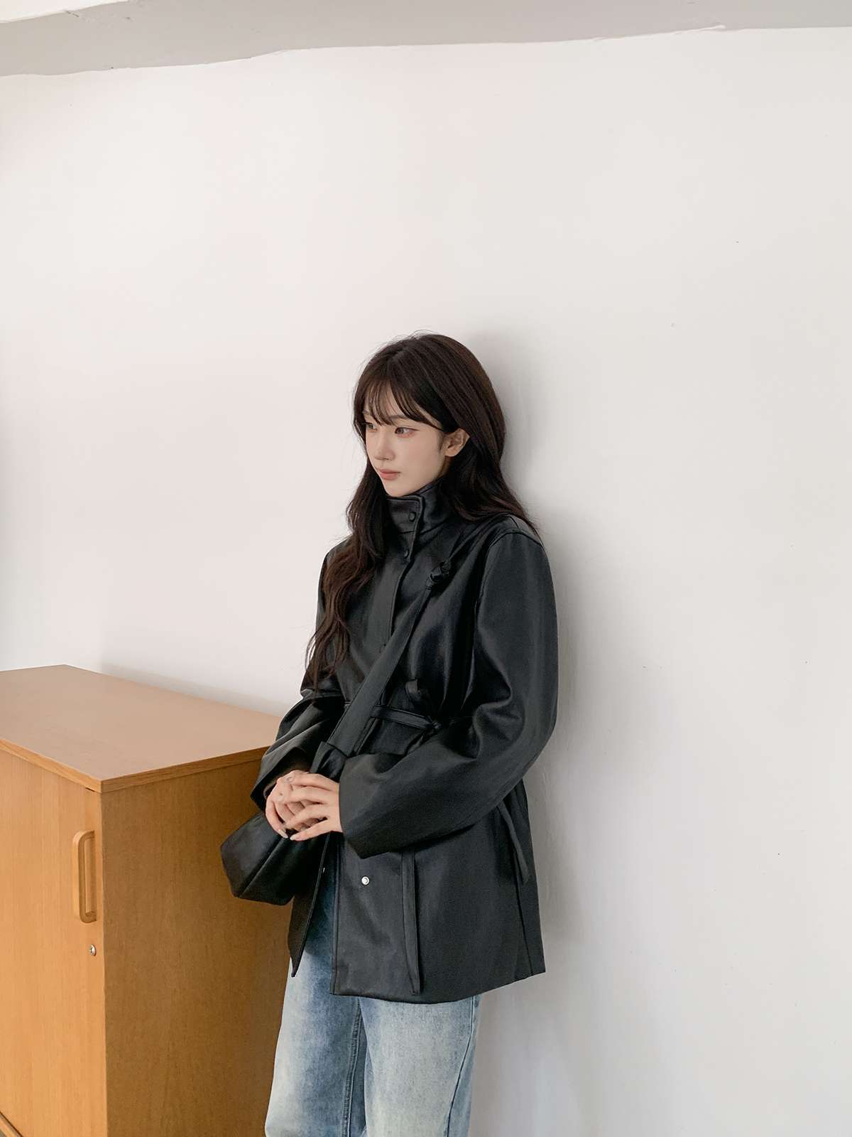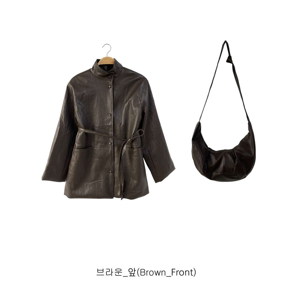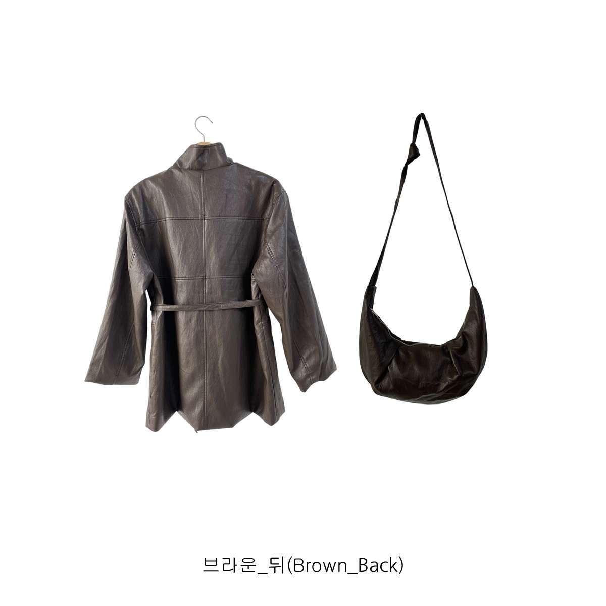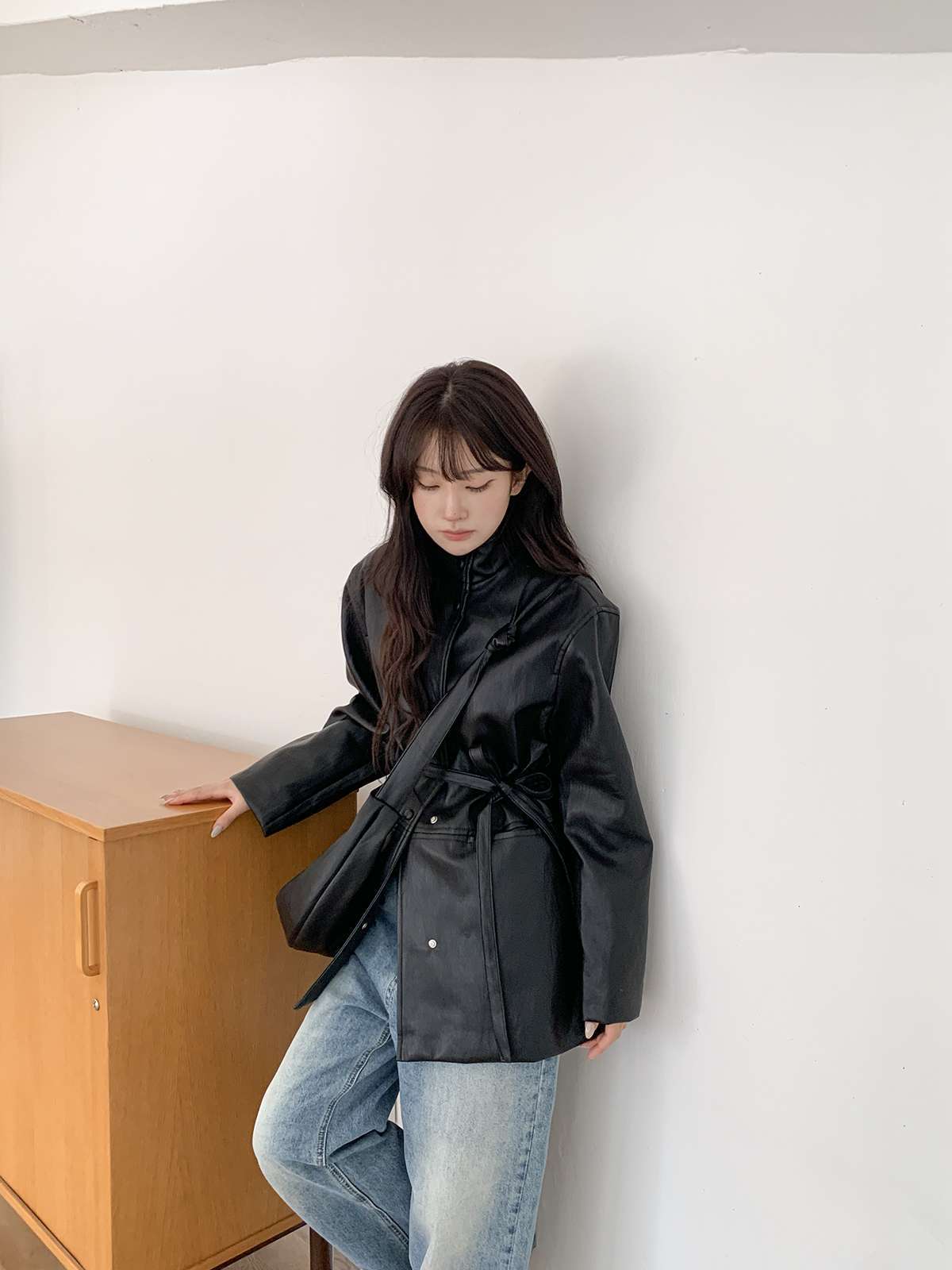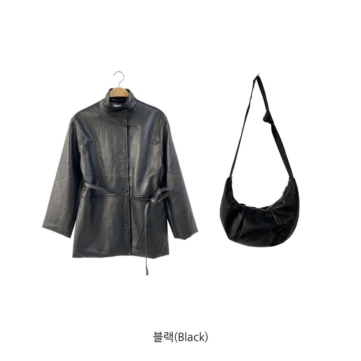 [ JK6045K59-더모드 하이넥 루즈핏 레더 자켓 크로스백 벨트 세트 ]