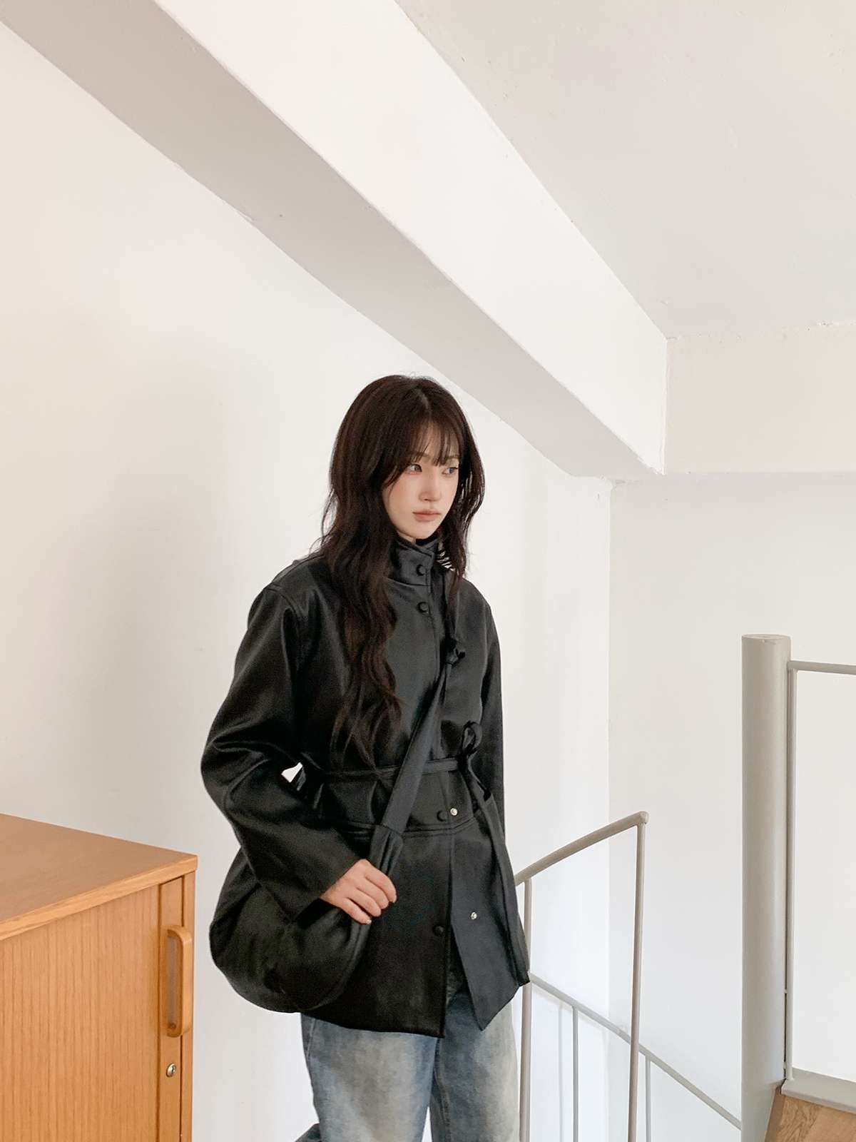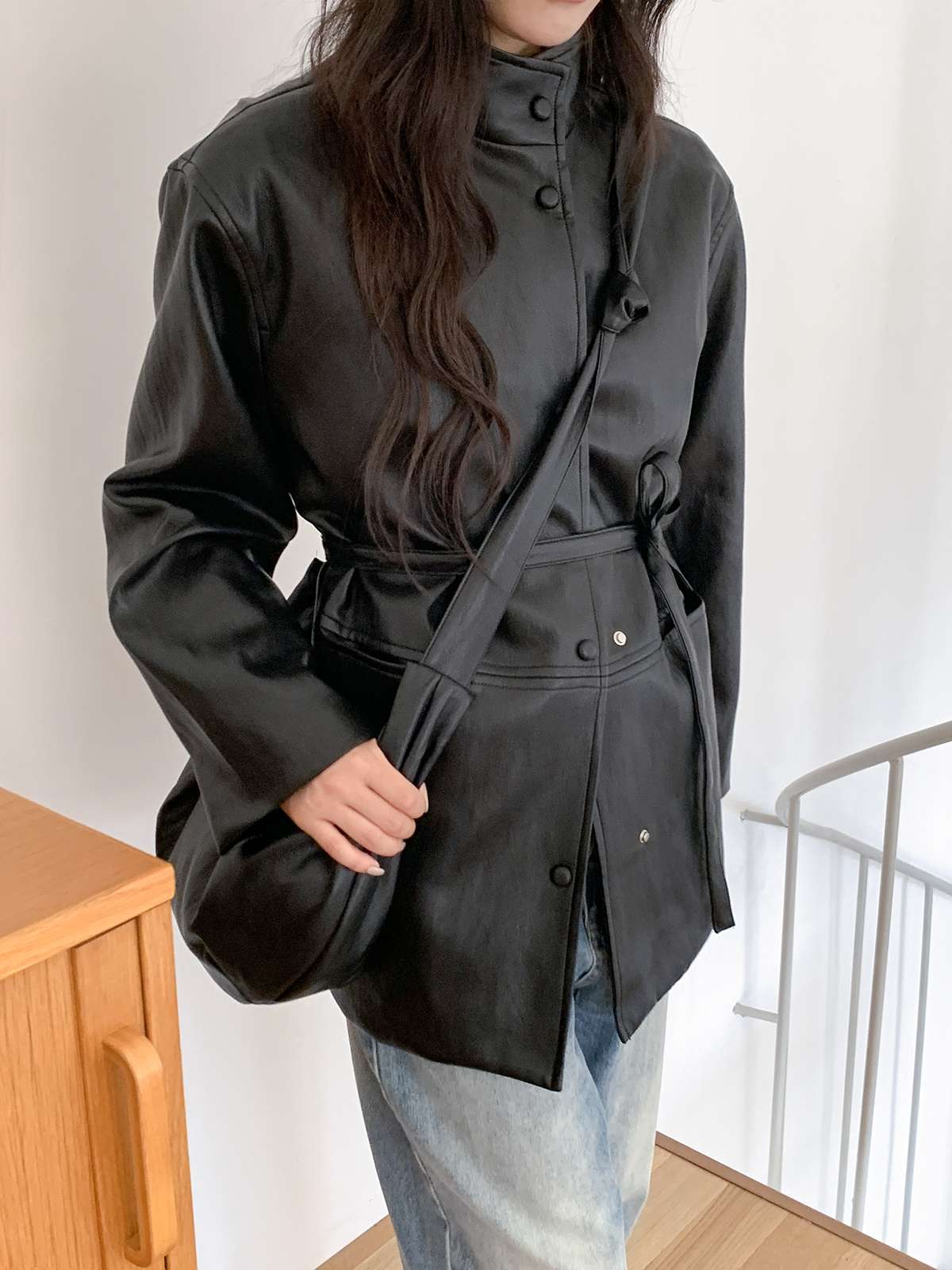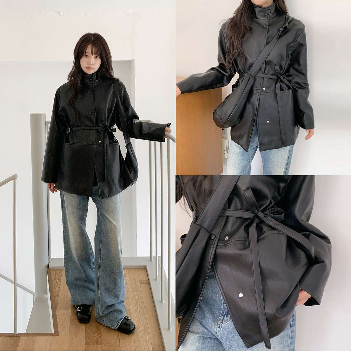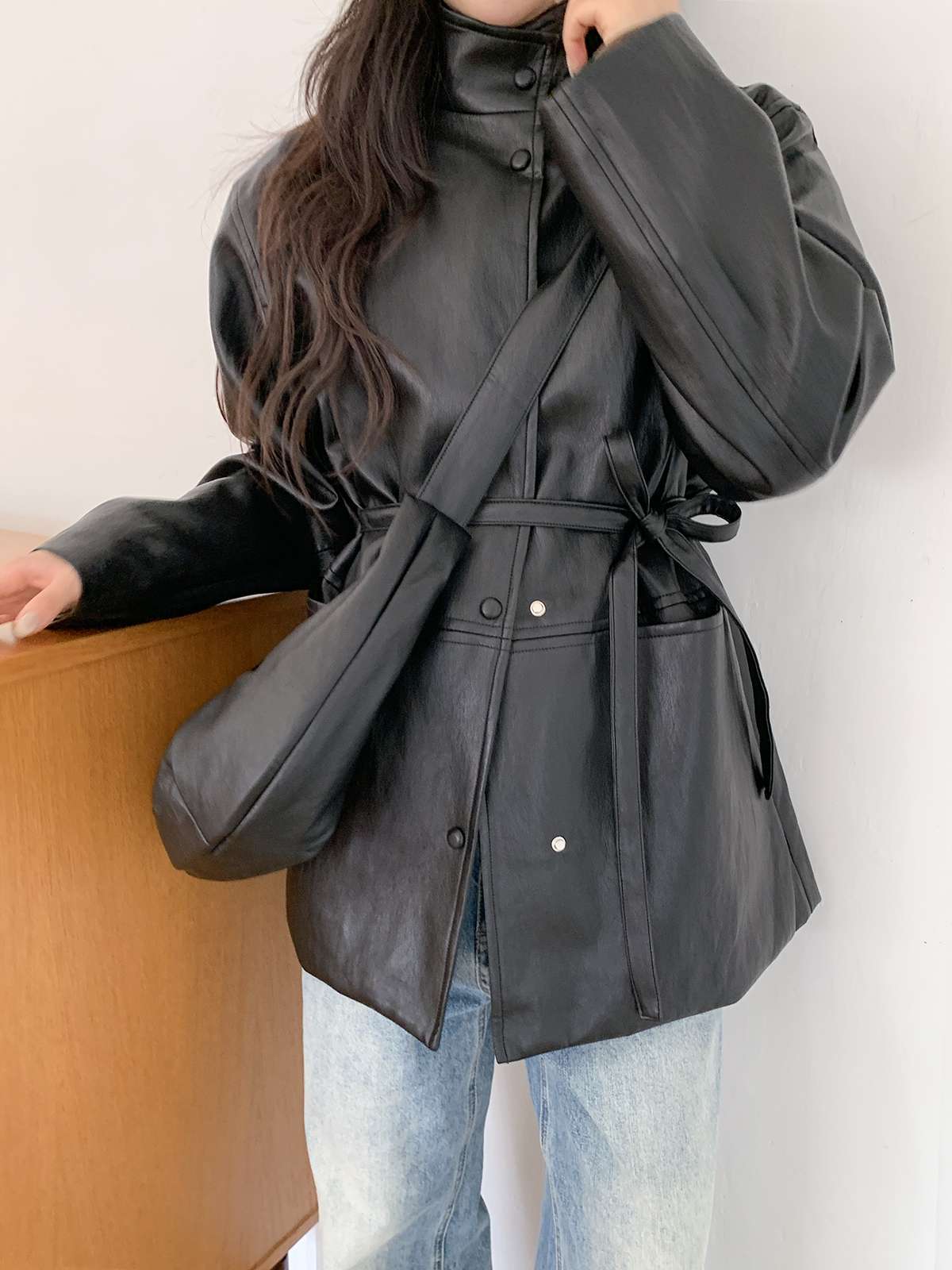 [ JK6045K59-더모드 하이넥 루즈핏 레더 자켓 크로스백 벨트 세트 ]