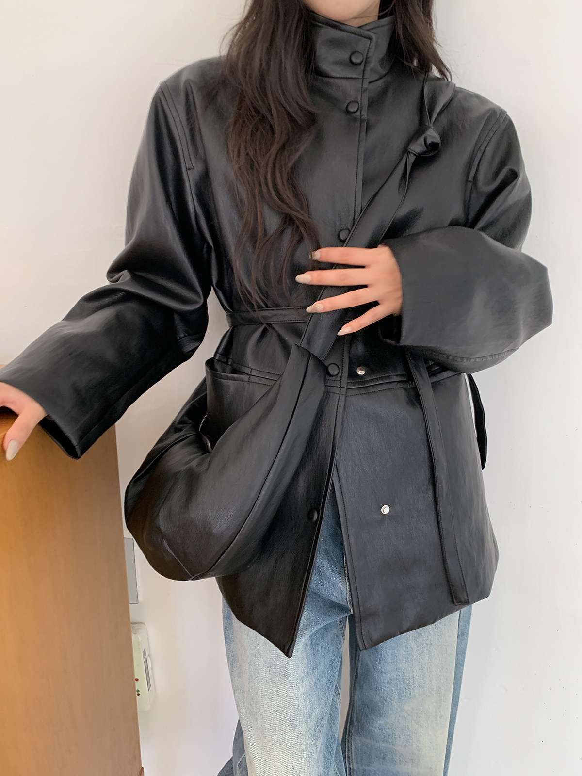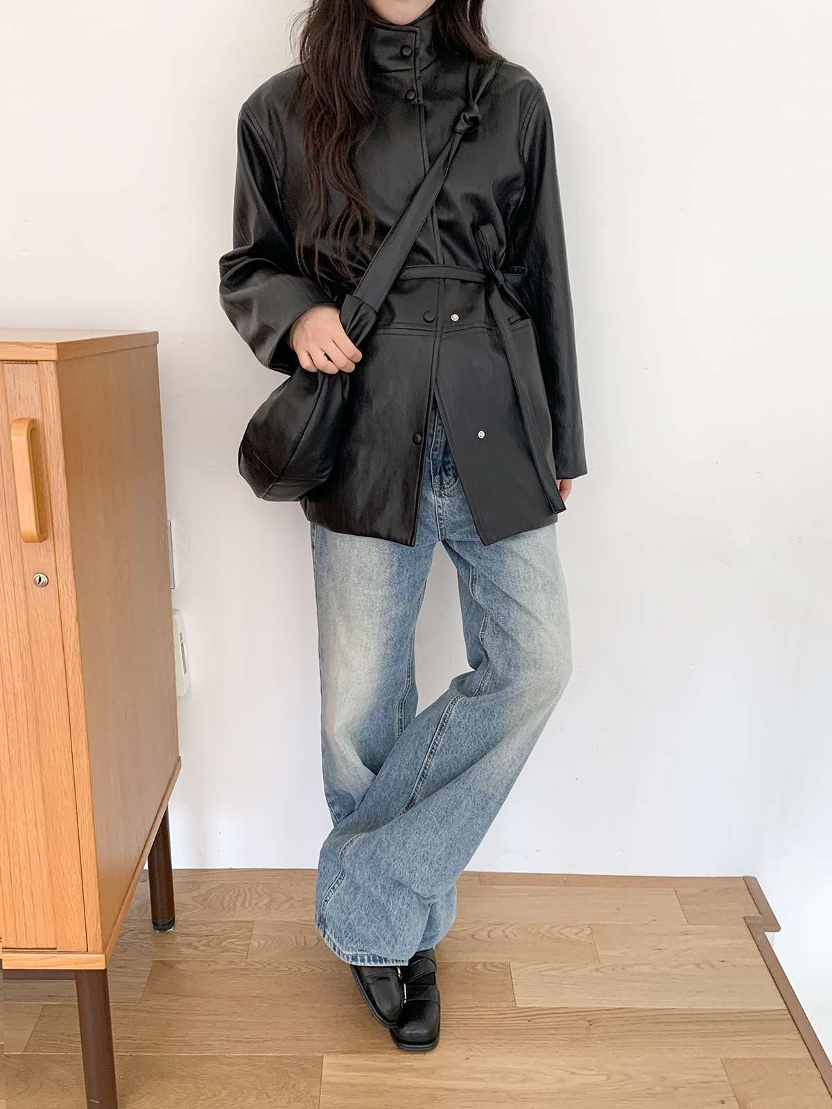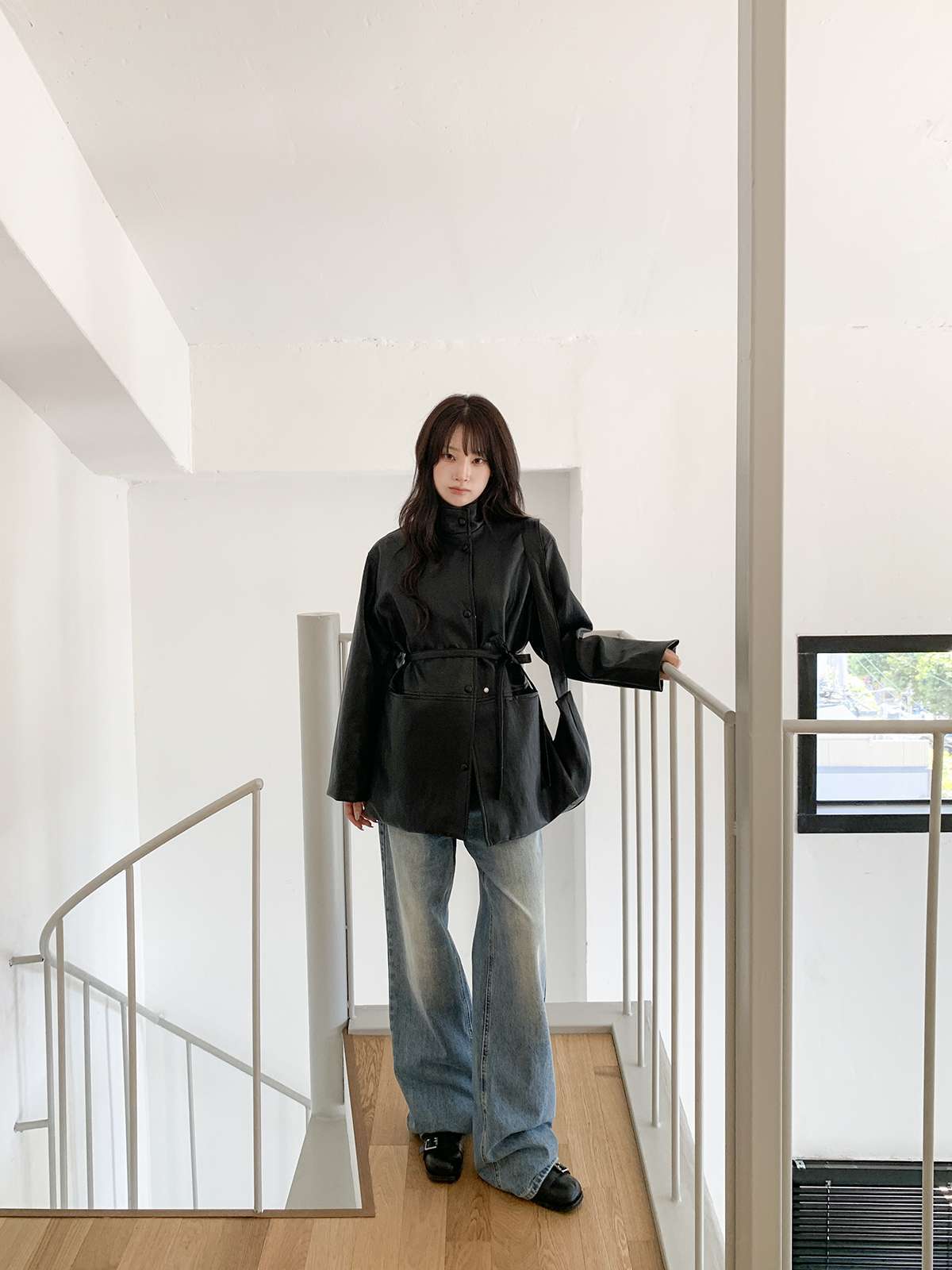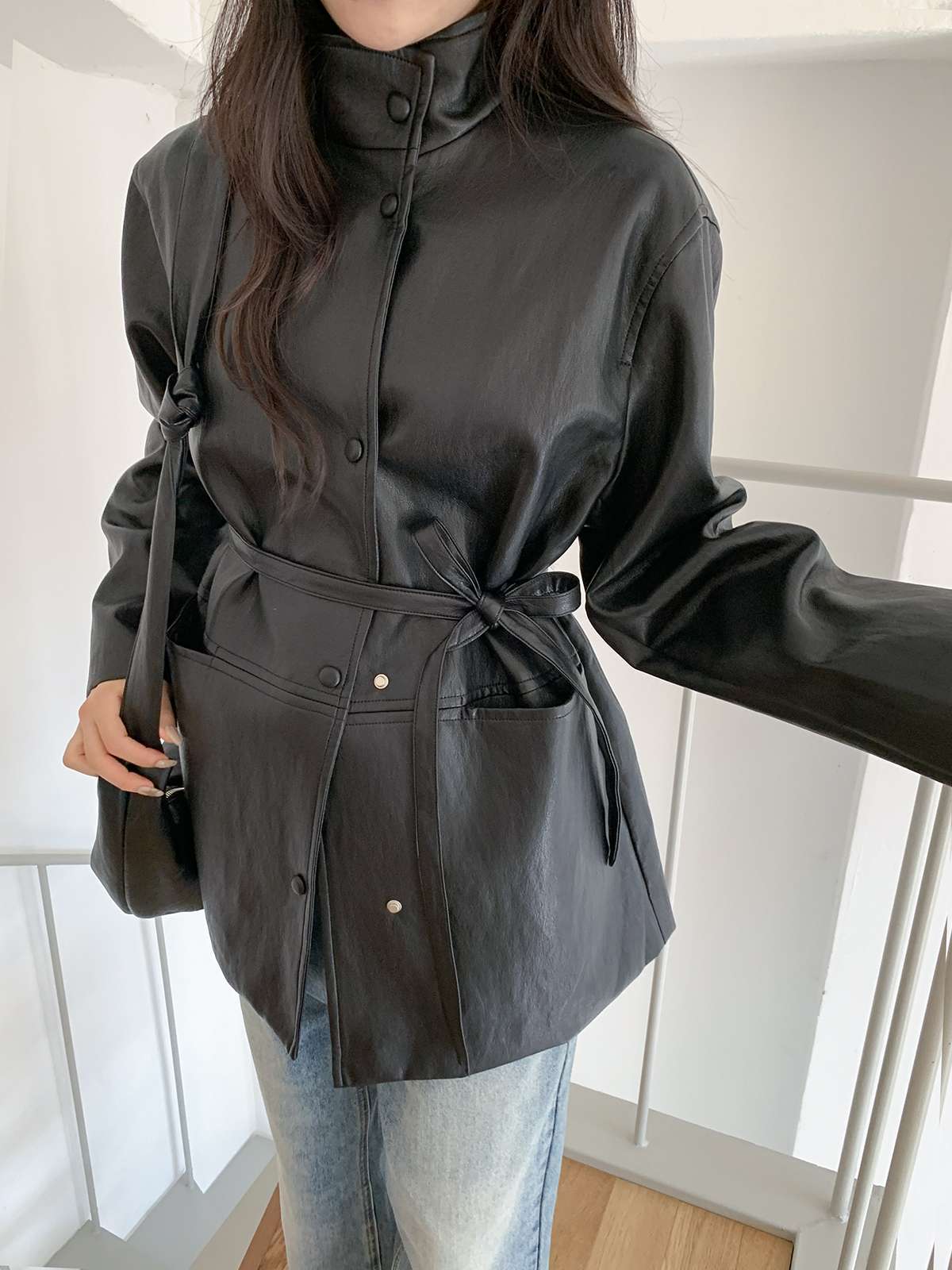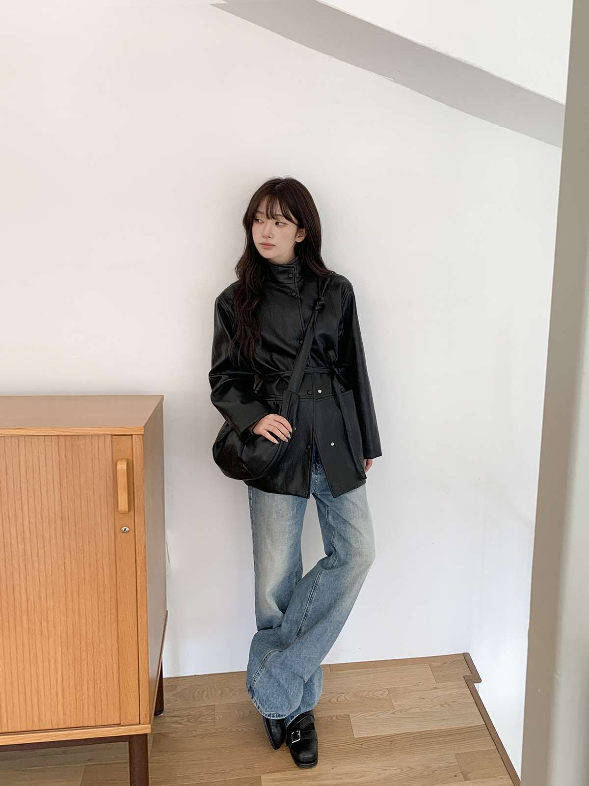 [ JK6045K59-더모드 하이넥 루즈핏 레더 자켓 크로스백 벨트 세트 ]