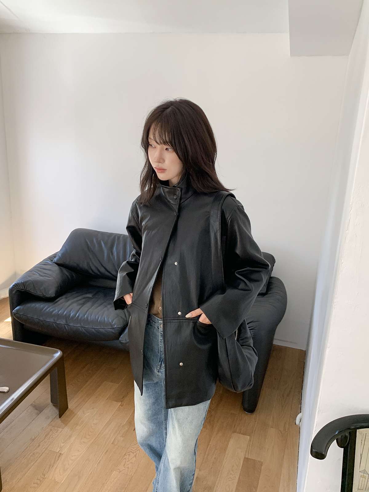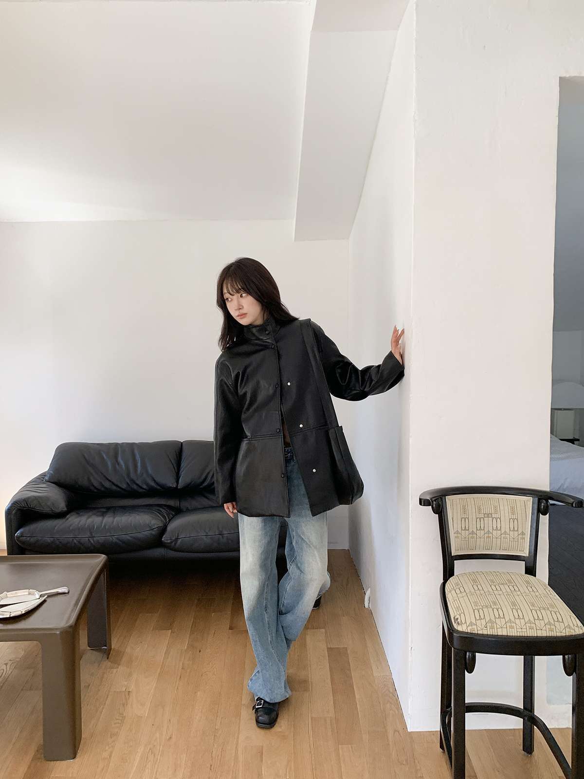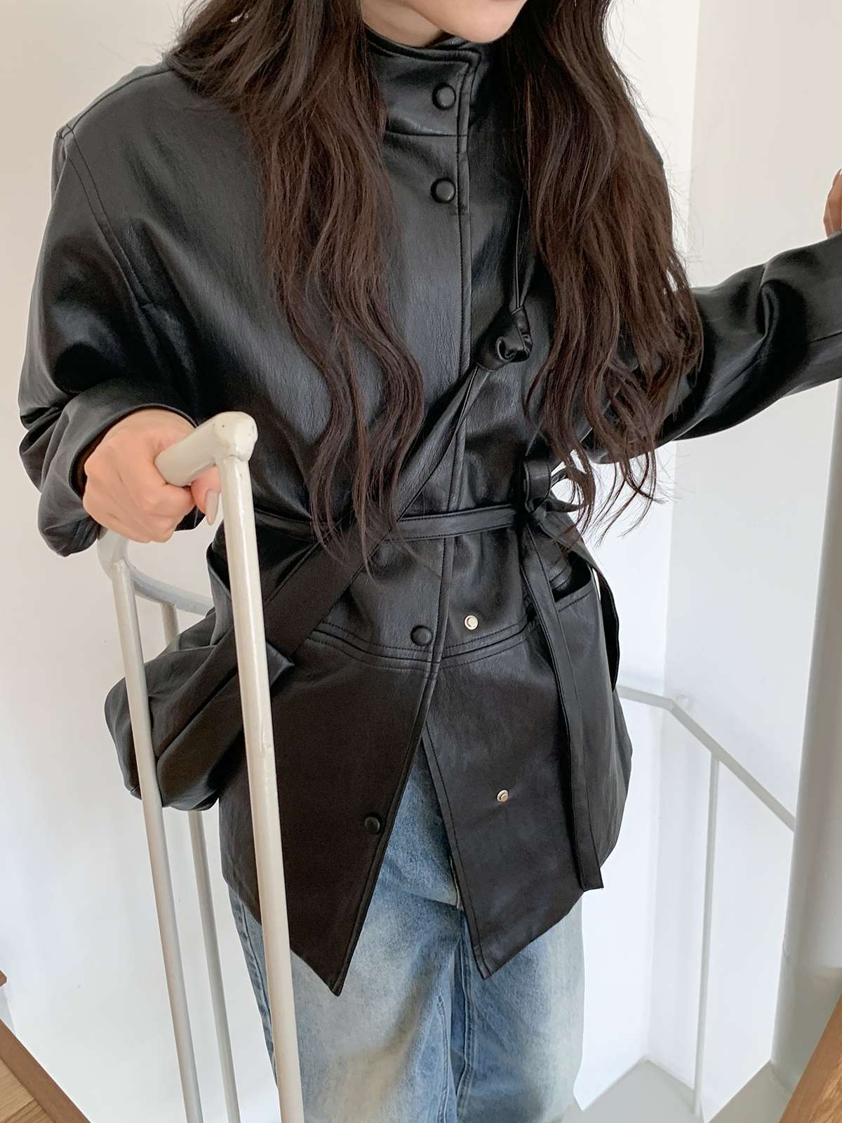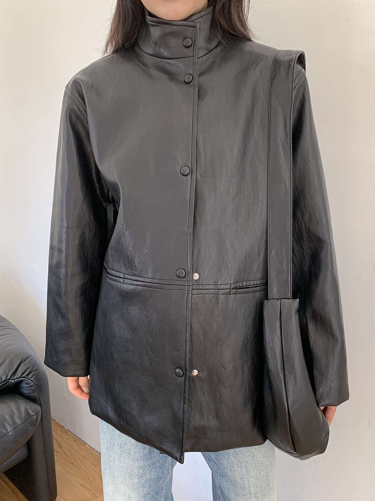 [ JK6045K59-더모드 하이넥 루즈핏 레더 자켓 크로스백 벨트 세트 ]