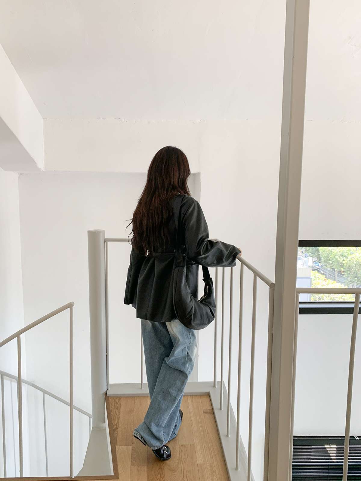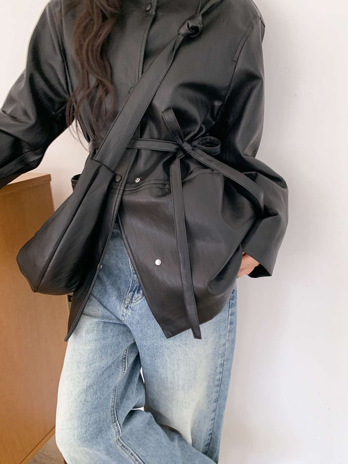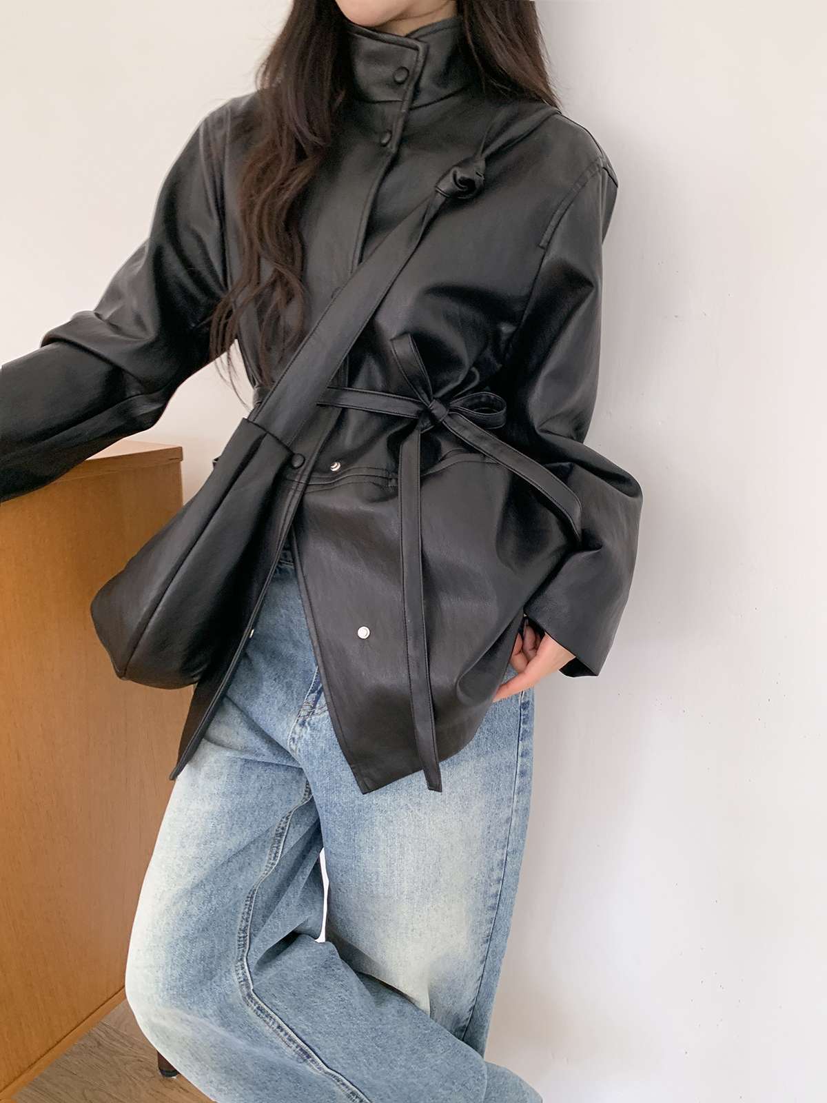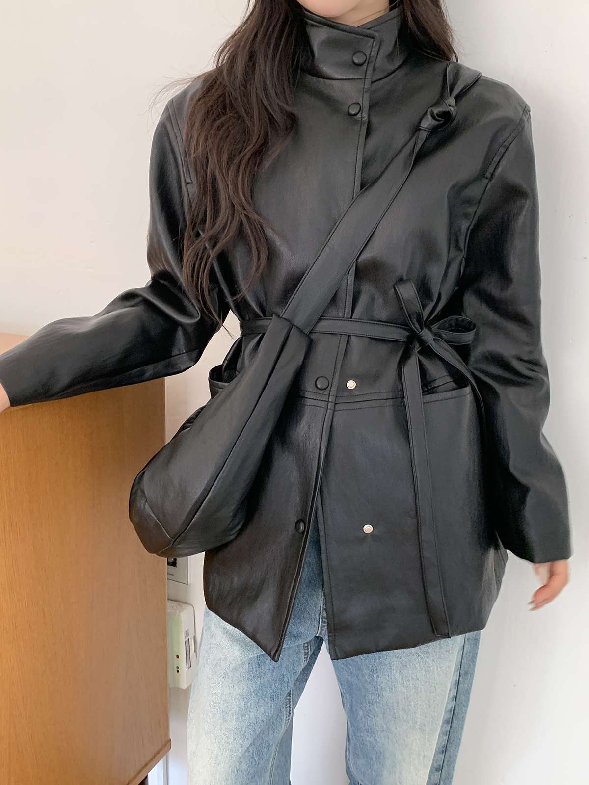 트렌디한 레더 소재의 자켓에 크로스백과 벨트가
