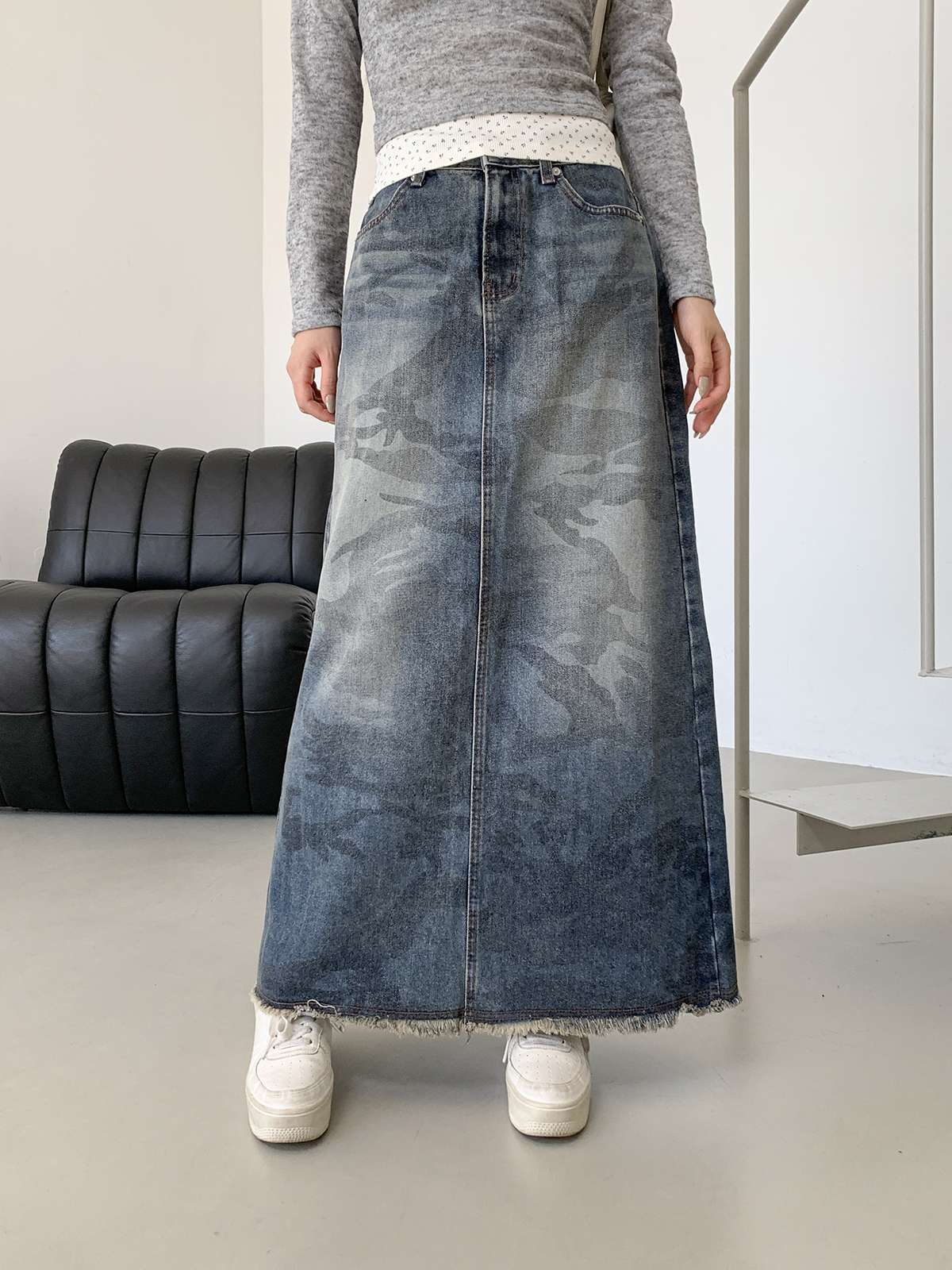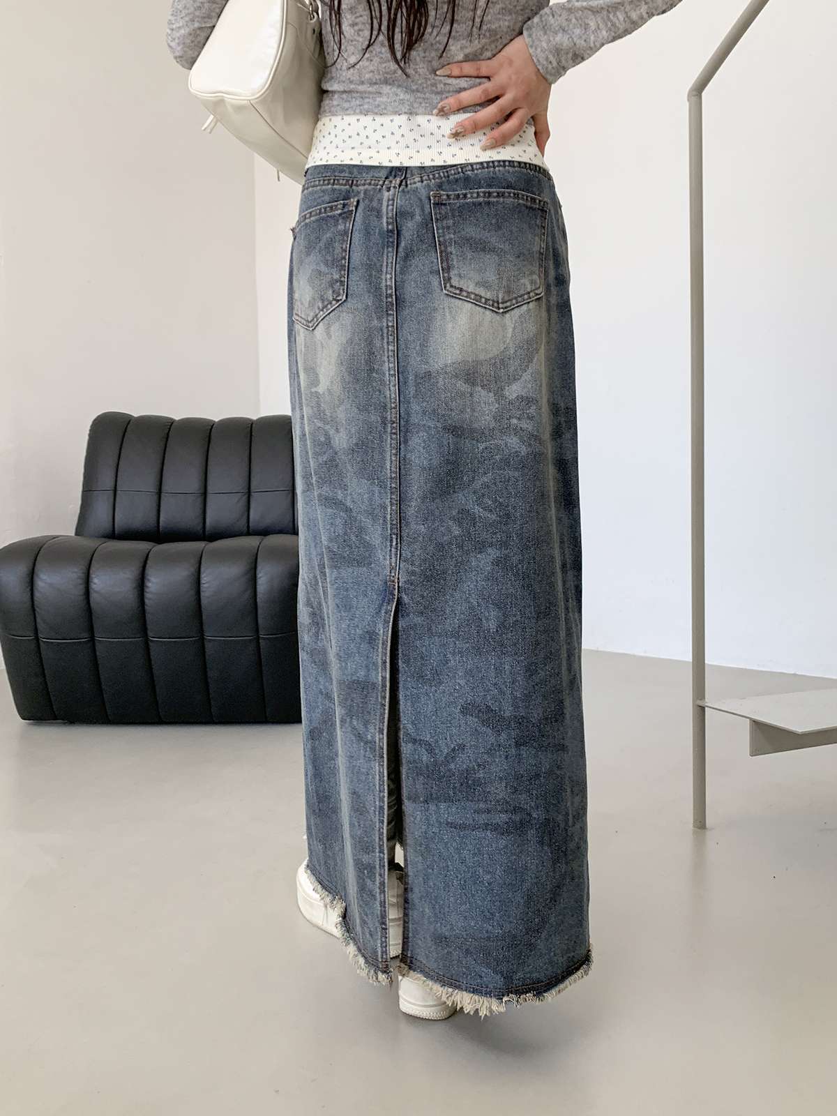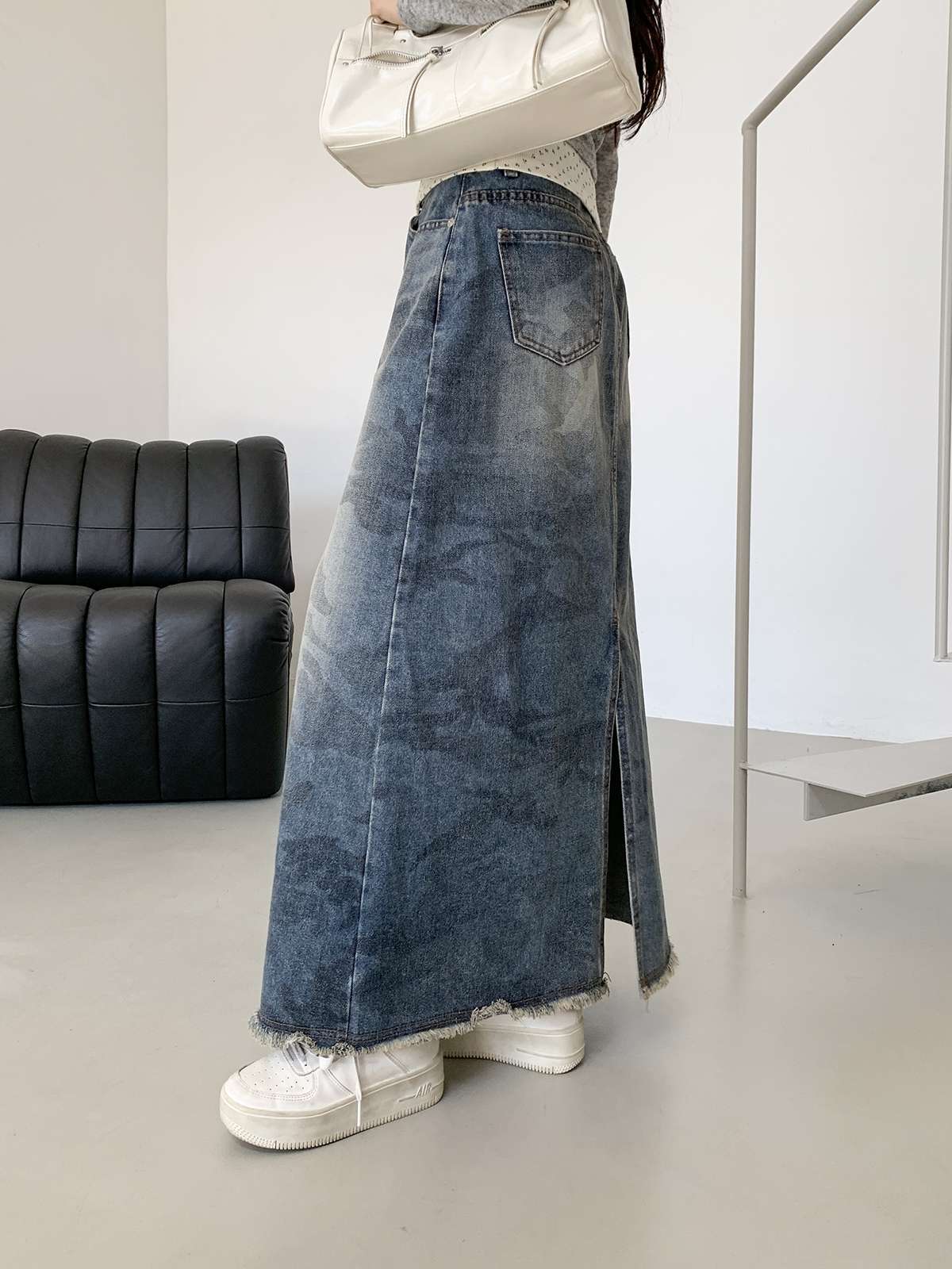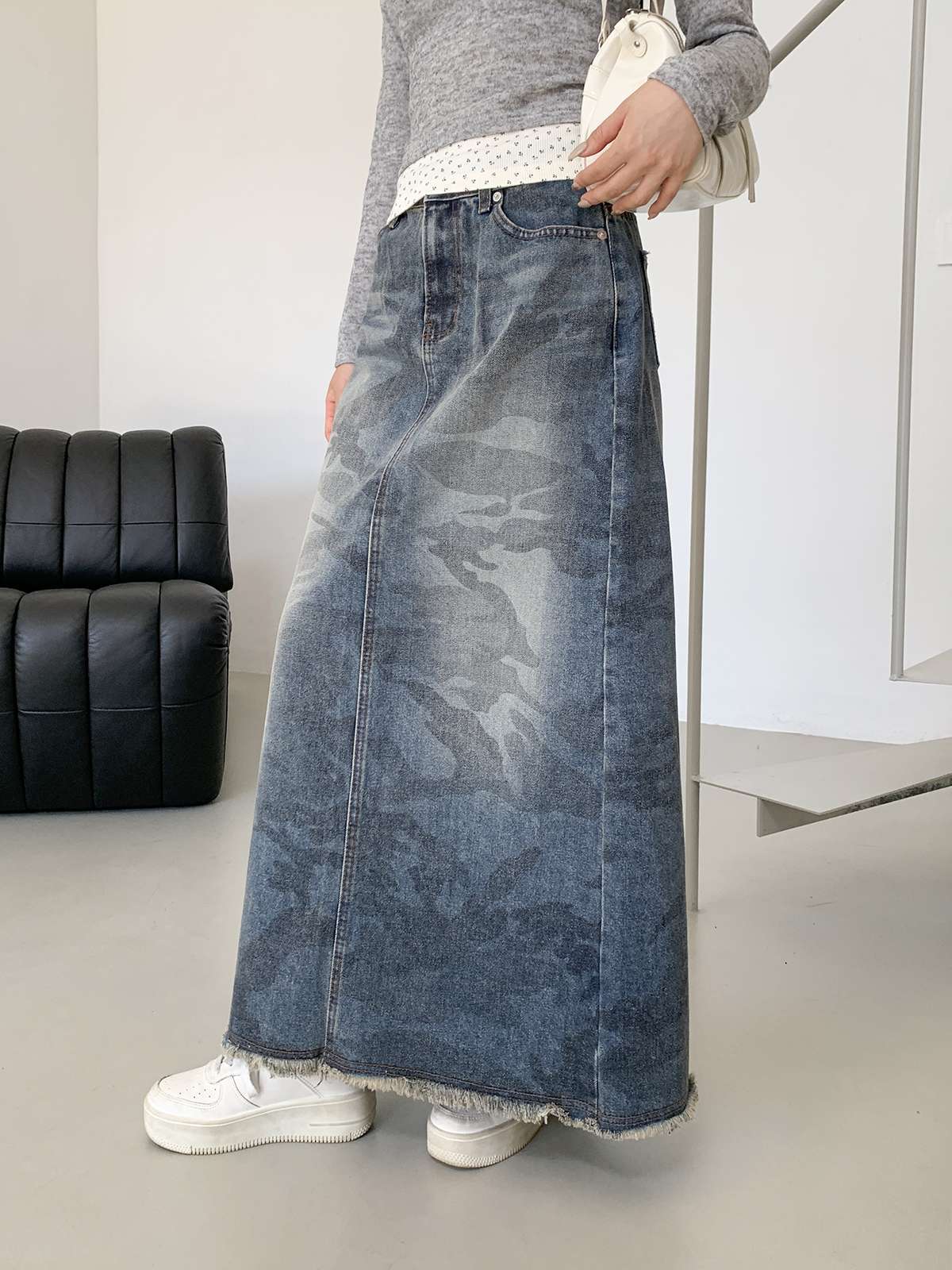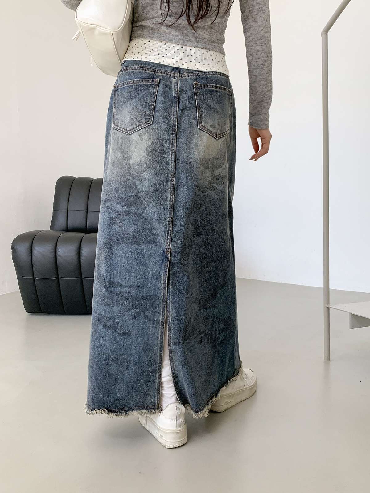 SK7414K59-페리얼 카모 워싱 빈티지 데님 롱 스커트