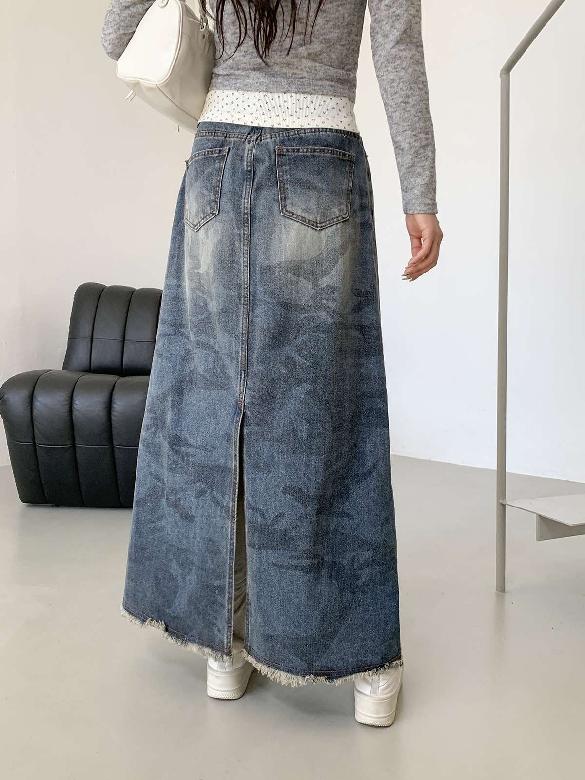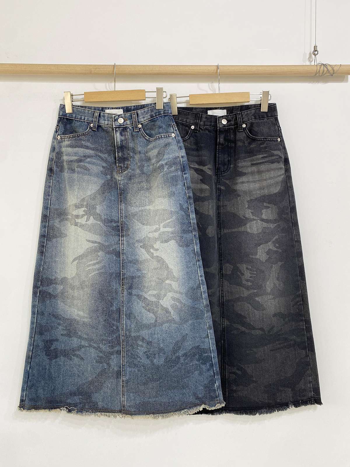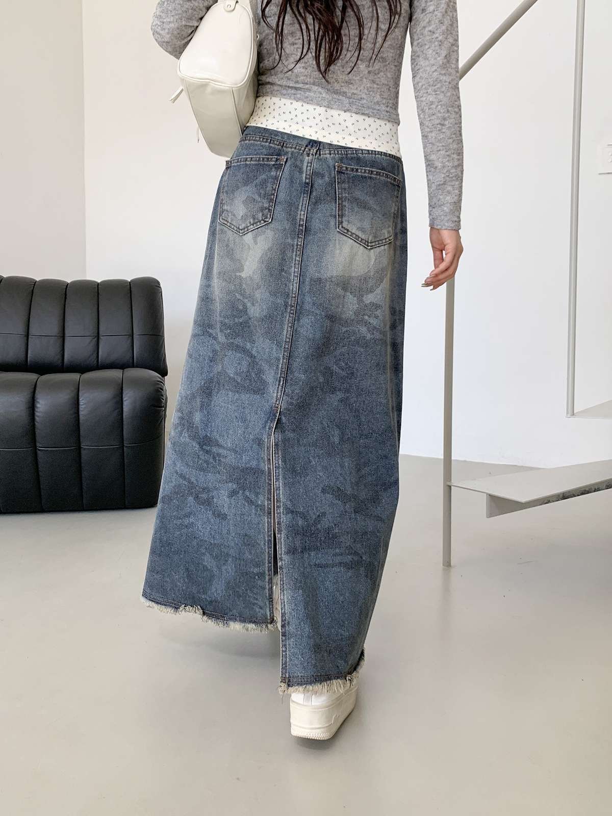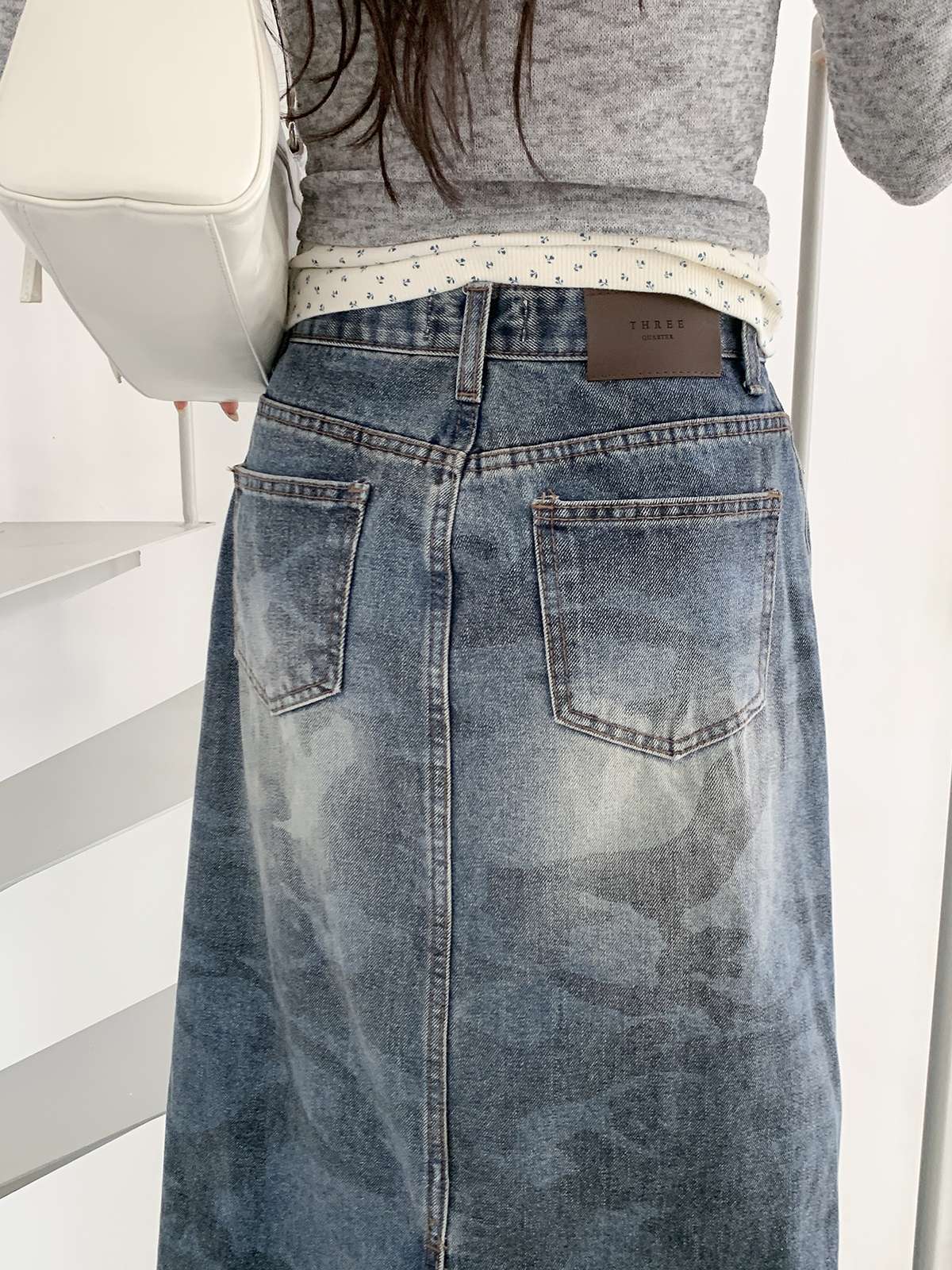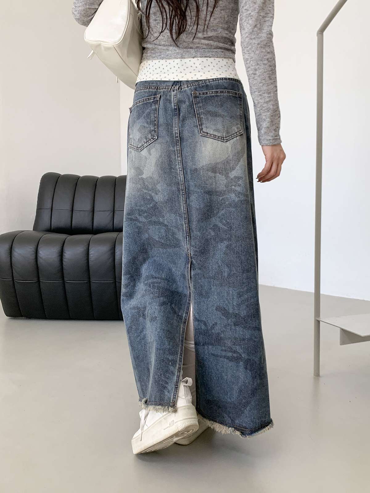 SK7414K59-페리얼 카모 워싱 빈티지 데님 롱 스커트