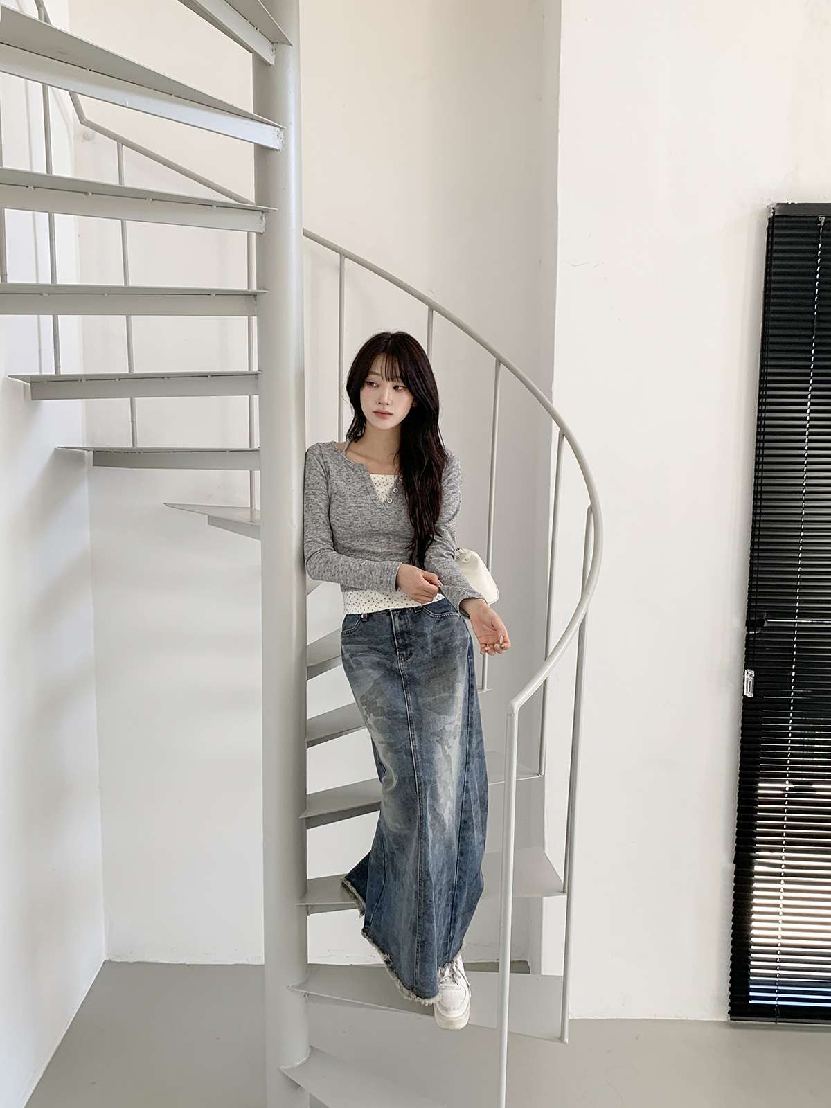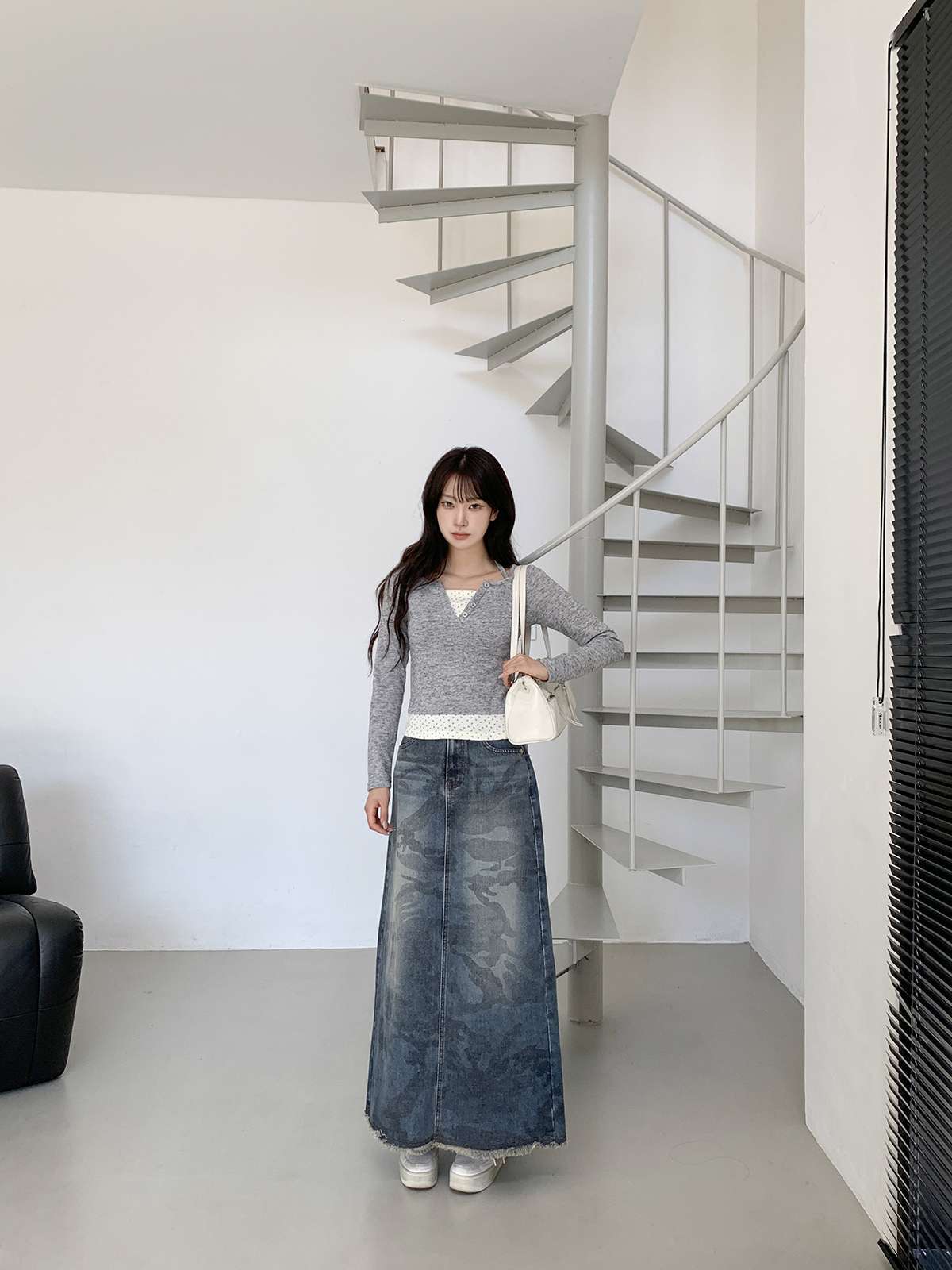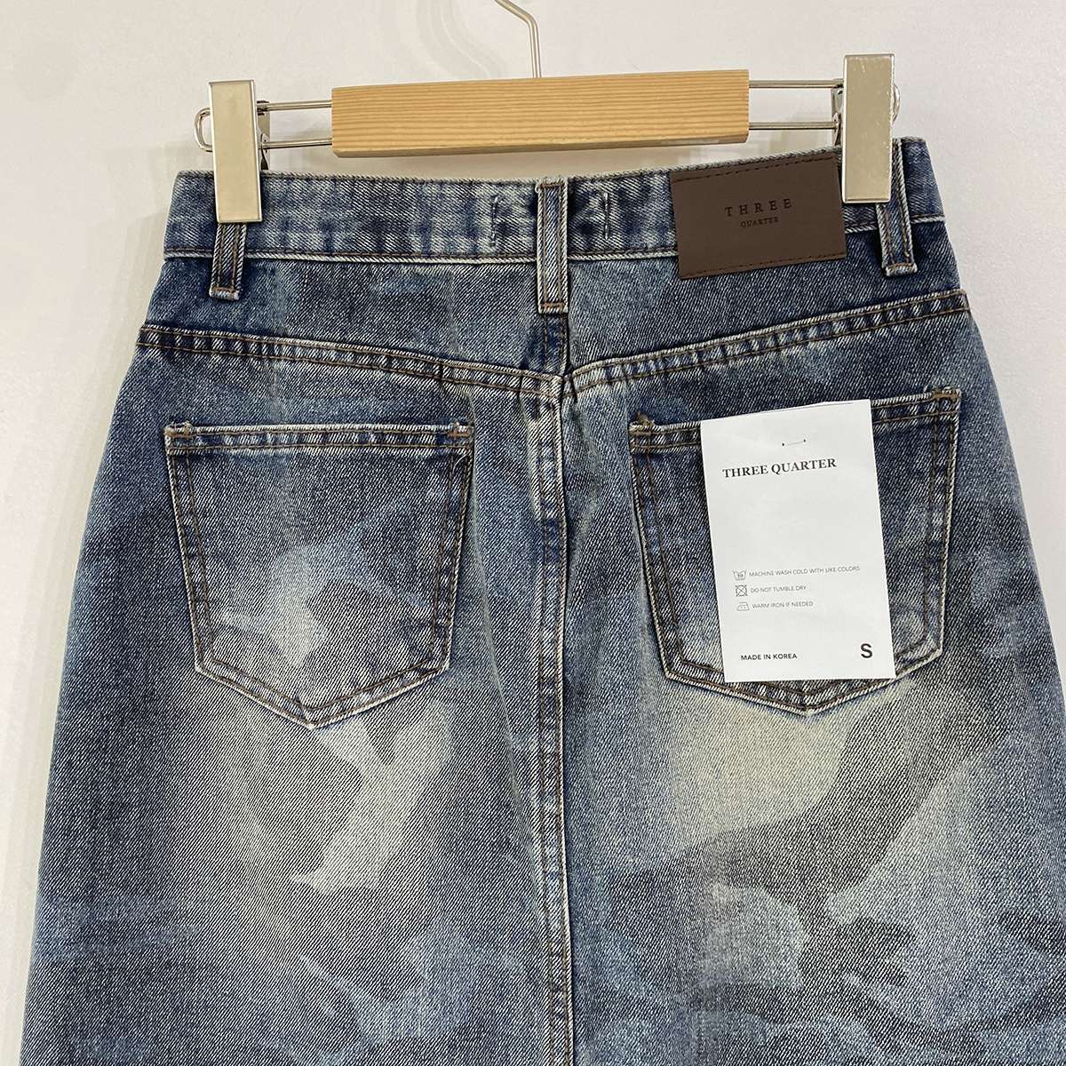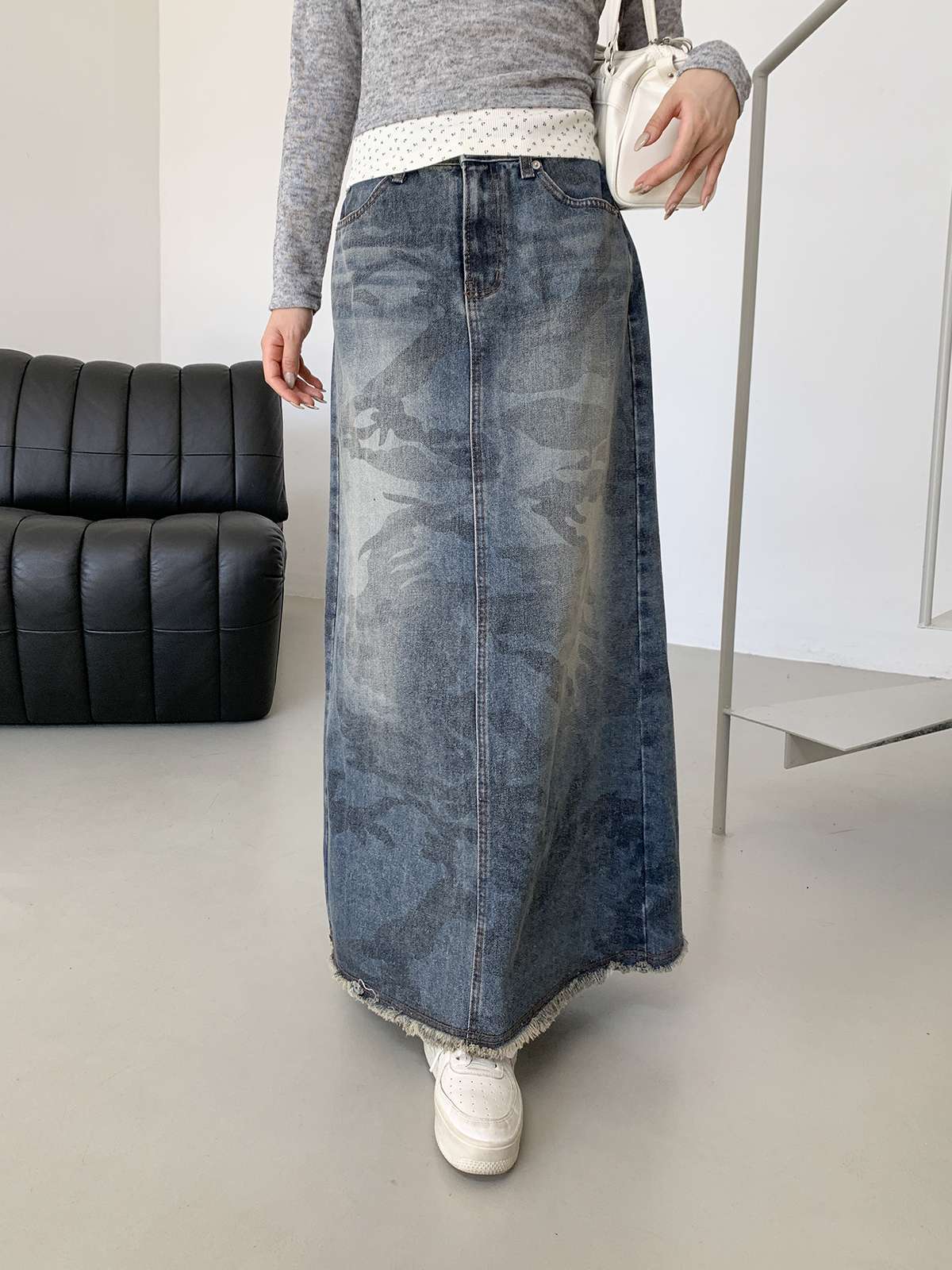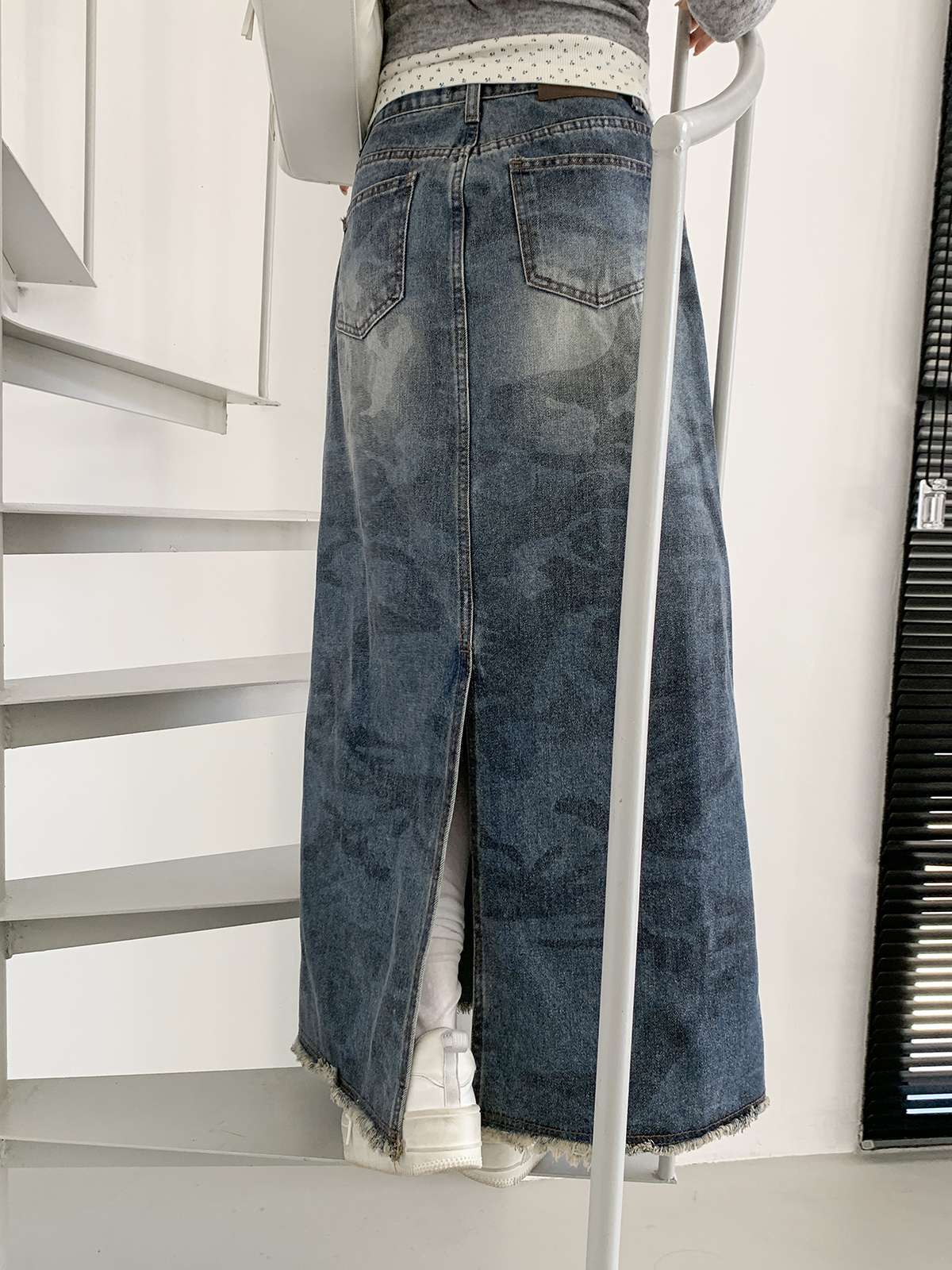 SK7414K59-페리얼 카모 워싱 빈티지 데님 롱 스커트