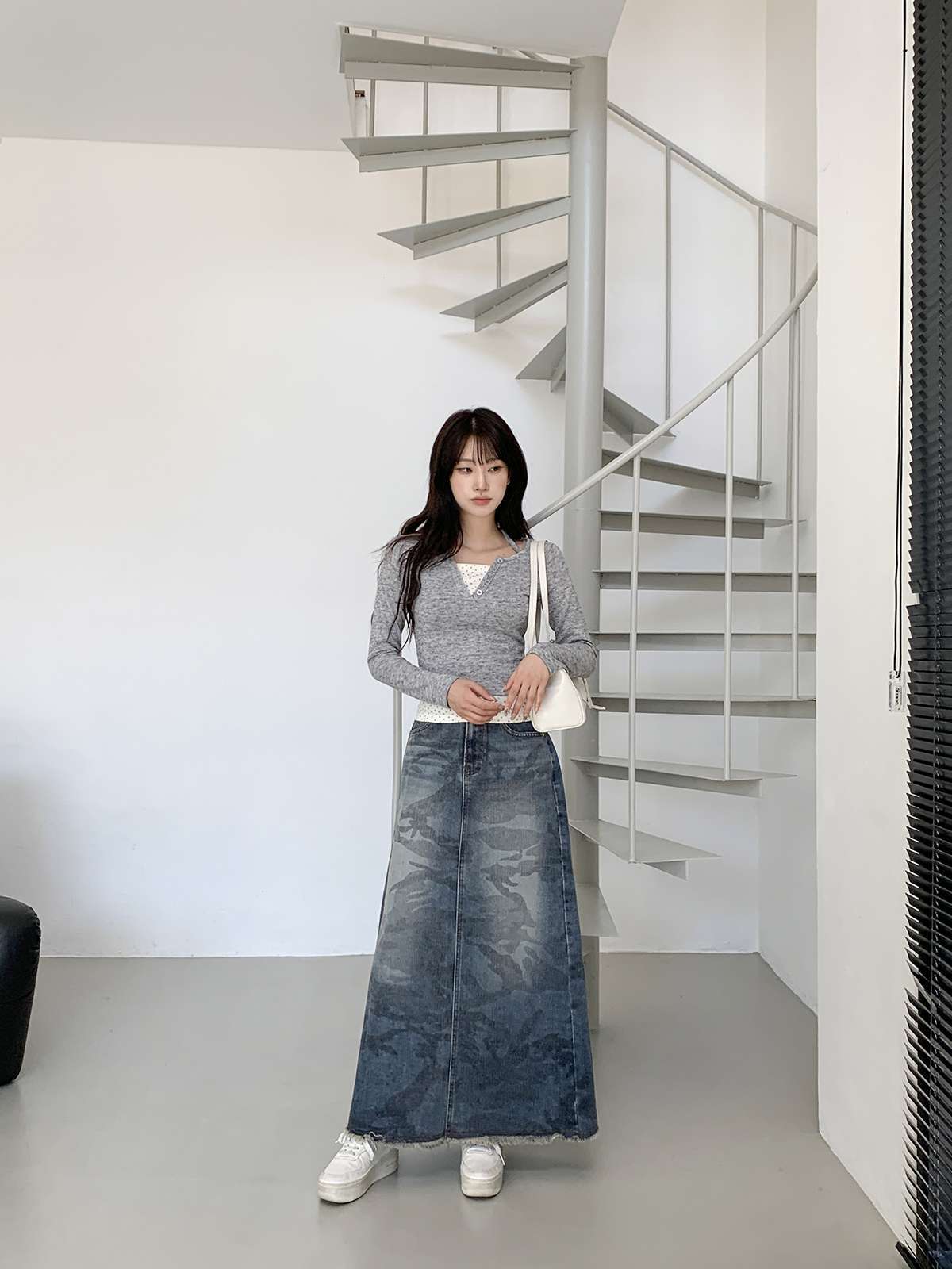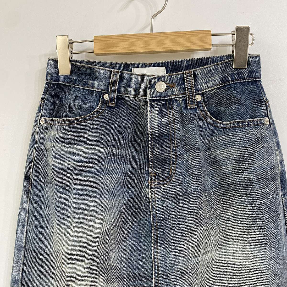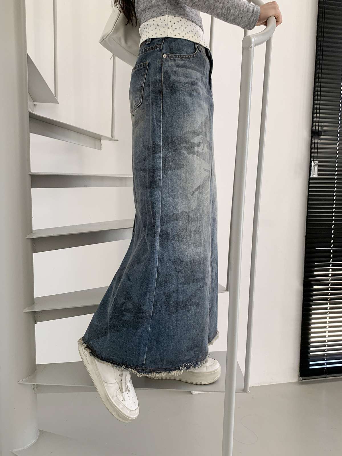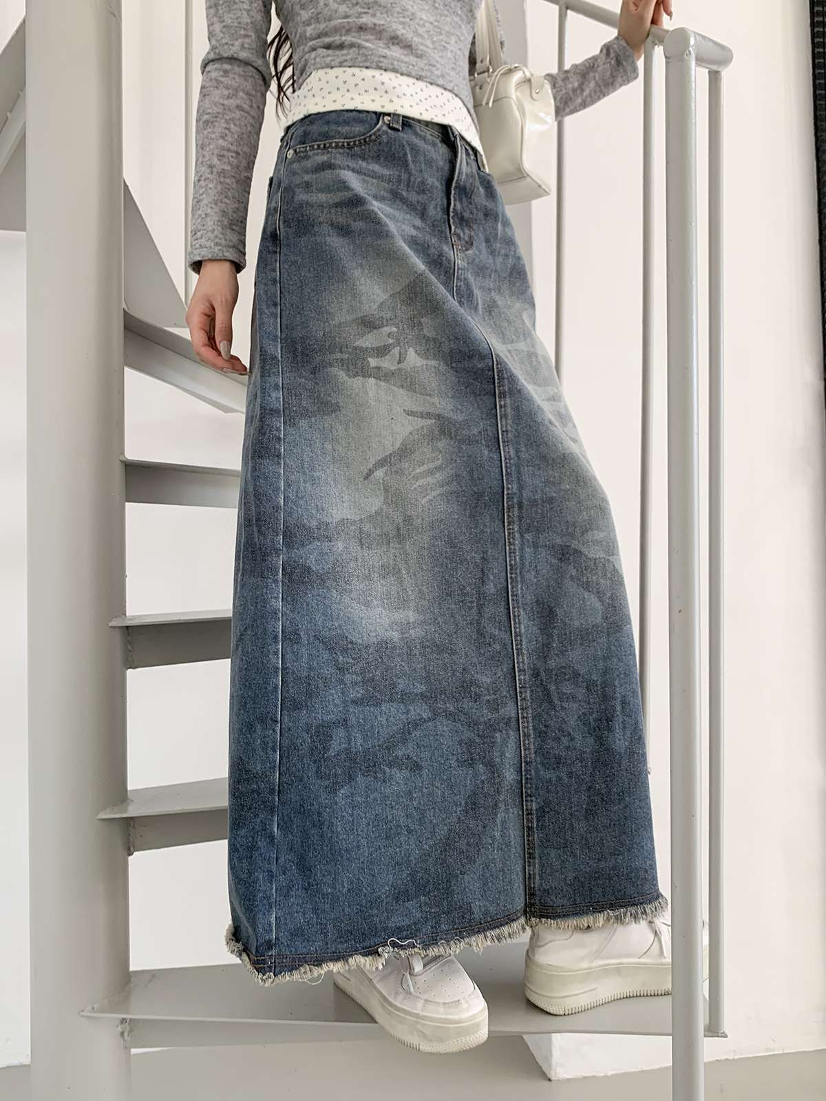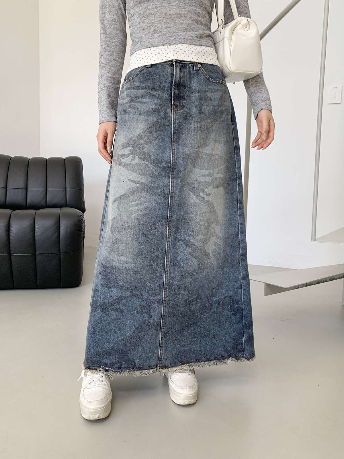 빈티지한 카모플라쥬 패턴 워싱이 유니크한 무드를 연출하는 데님 롱 스커트